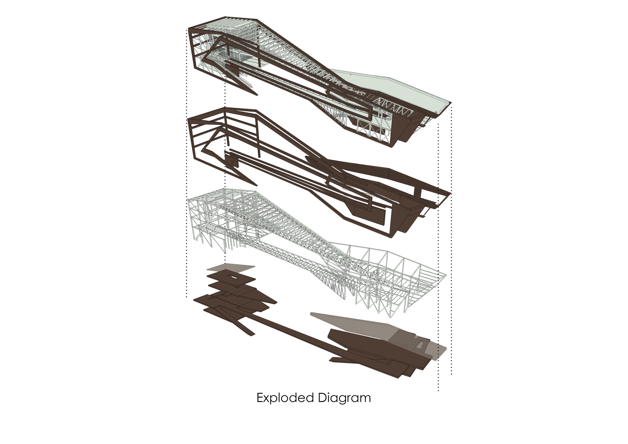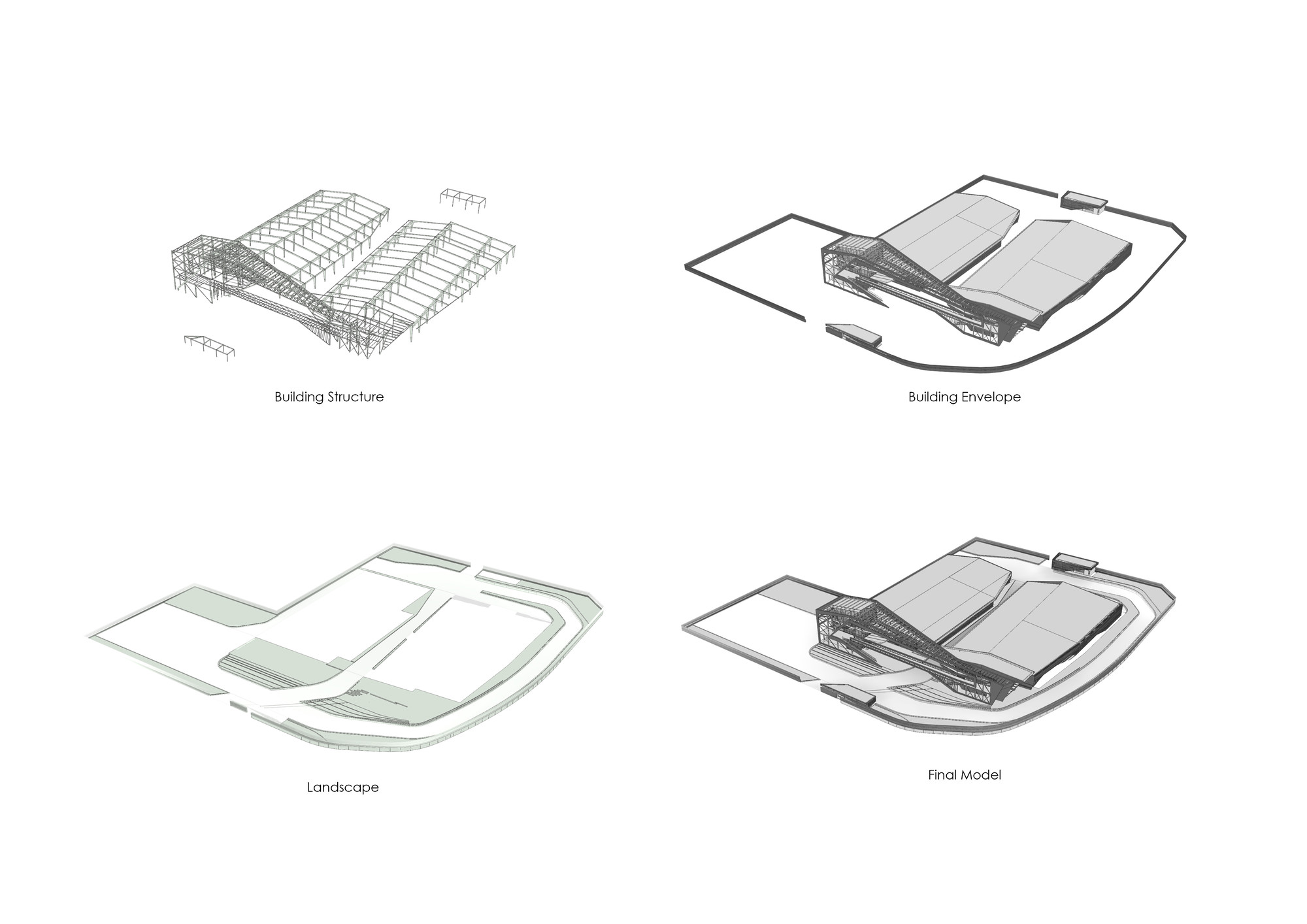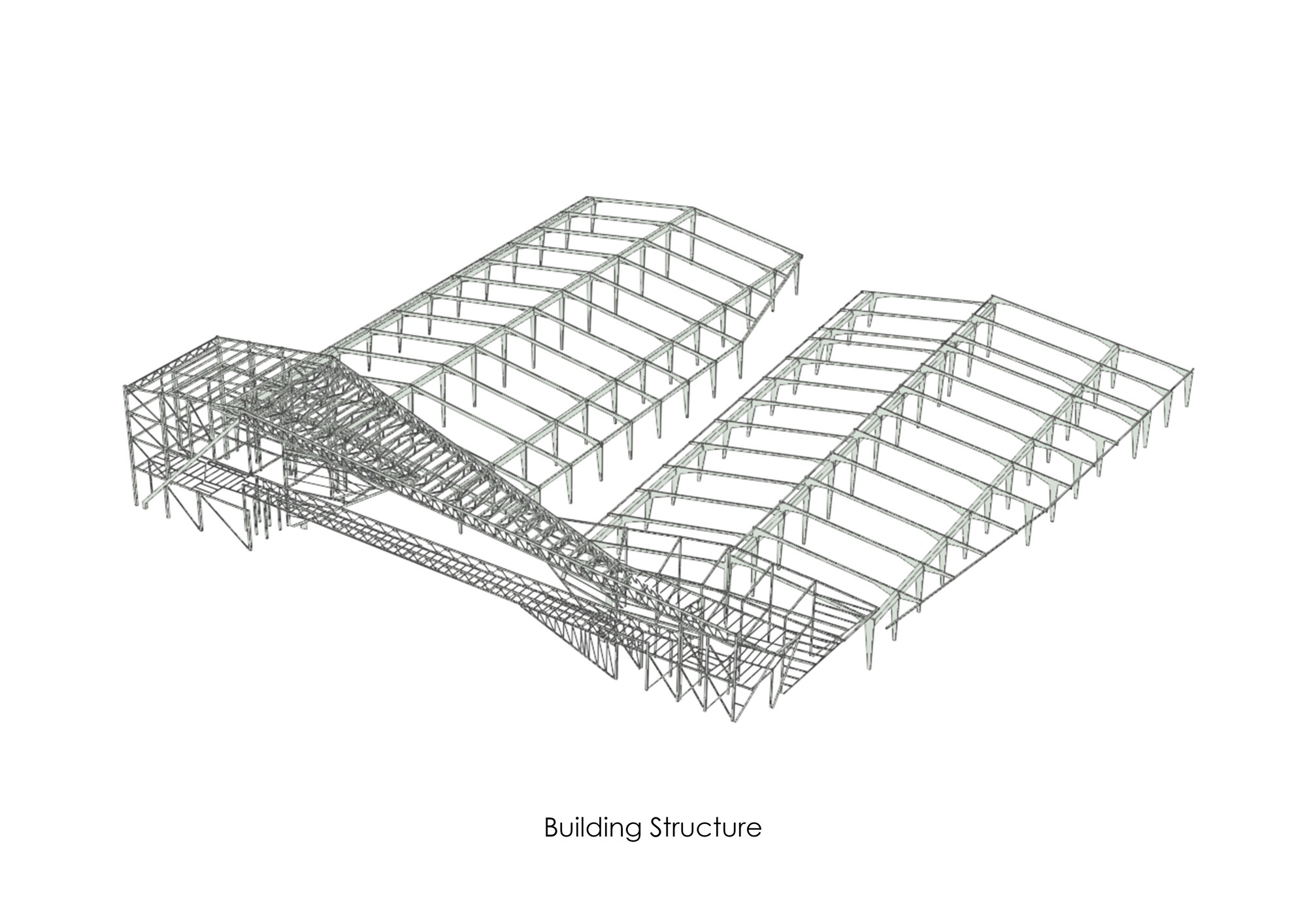 Ehsan Poud Textile Factory was to be built near the main square in the phase2 of the Shokouhieh Industrial Town near Qum City. Design Process: There was no special characteristic or iconic feature in the area which could inspire the design of this project. Therefore, a threefold analysis method was used to form a diagrammatic process defining the project: 1. Program Distribution The project included two production halls, administrative divisions, as well as residences. The design process was initiated determining the position of the two main production halls. The administrative section and the residences were then positioned at the front. The next attempt was to create a logical relationship between the building and the adjacent square by combining these elements into an integrated plan. 2. Spatial Organization The idea of an integrated model with various cores was the main design criterion in this project. The spatial diagrams of the project represent how these cores connect to each other to form powerful perspectives. While defining the main entrance of the building, the 70 m long suspended bridge is used to connect the two administrative and residential zones together. Circulation to all parts of the project takes place under this bridge. 3. Form The shape of the building was formed inspired by the spinning and weaving mechanisms which are the essence of the textile manufacturing. Lines and surfaces wrap around the spatial cores in different sections such as the production halls, the entrance, and the perimeter wall, to create a consistent architectural language throughout the building. To represent this idea in a pure form and to emphasize on the industrial identity of the project, steel and Travertine were the only materials used in this building. Structure The structure of the project consists of an exposed truss system which is partially covered with steel plates in some sections. Therefore, the structure itself becomes the main architectural element, forming the spaces. Ventilation and Mechanical Systems Considering the dry climate of Qum, an efficient mechanical system was essential to provide the 70% humidity requirement for a textile manufacturing environment. Therefore, two 60,000 ft/m3 air washers as well as a fan coil system were implemented providing heating, cooling, humidity, and fresh air circulation as desired.