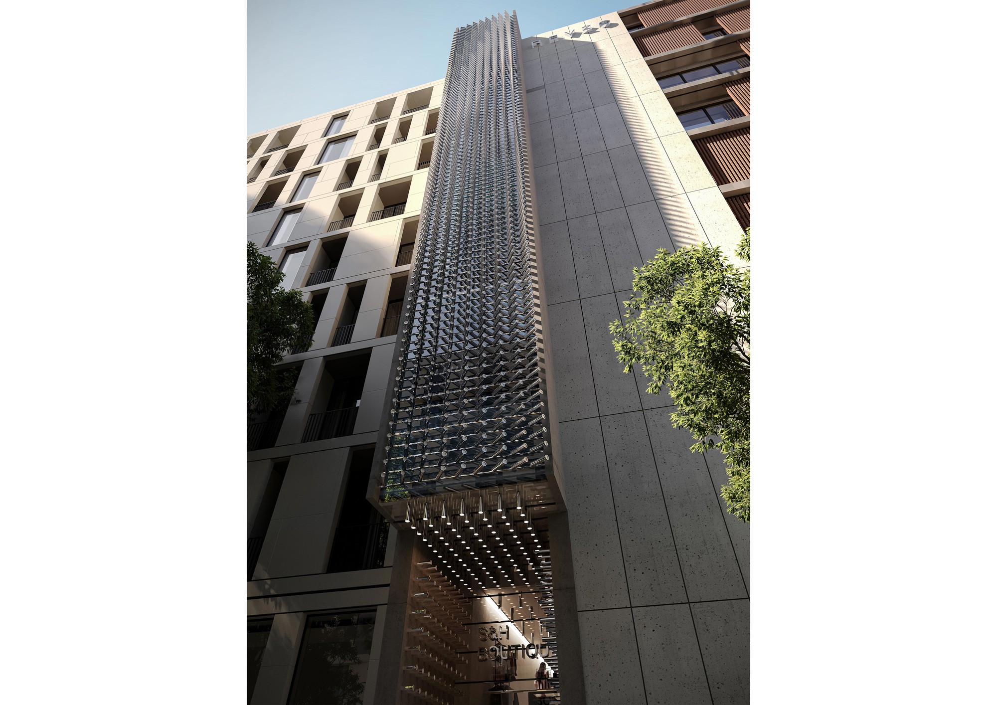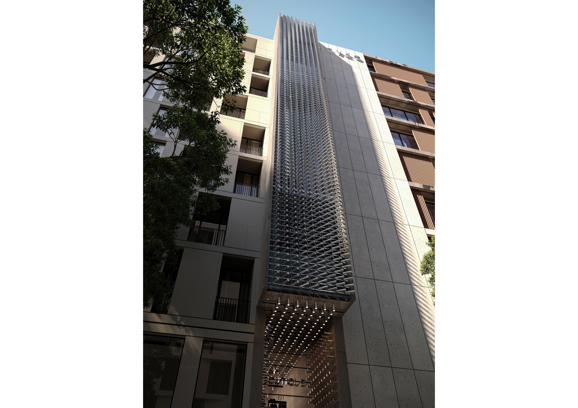 The main design challenge of this project was the unusual dimension of the site with a 4m width and a 30m depth. The main idea was to achieve a solution which not only forms the north and south facades but also helps in the design of the interior spaces. Considering the narrow width of the site, the primary question was how to circulate through the building. Therefore the internal organization of spaces was initiated by resolving this issue. The idea for the exterior surface was to create a dynamic façade which visually attracts both pedestrians and drivers. Inspired by the movement of fish clusters in oceans, a node system was used to form a dynamic façade in accordance with the movement of vehicles in two directions on the adjacent roadway. The nodes were made of steel bars with LED lights implemented on the edge, making them glow at night. On the south façade these nodes form window openings with varied opacity to control the south sunlight exposure.