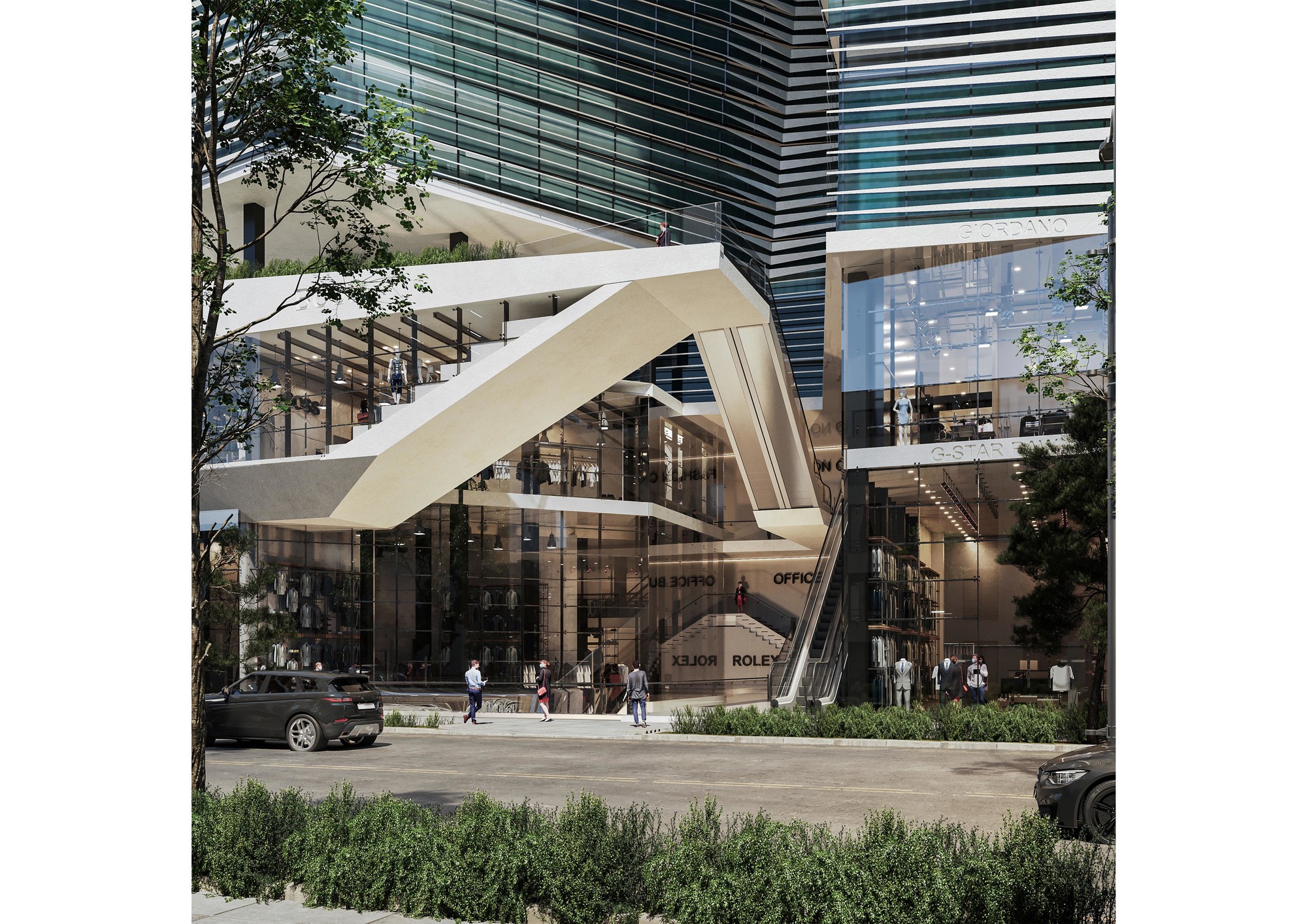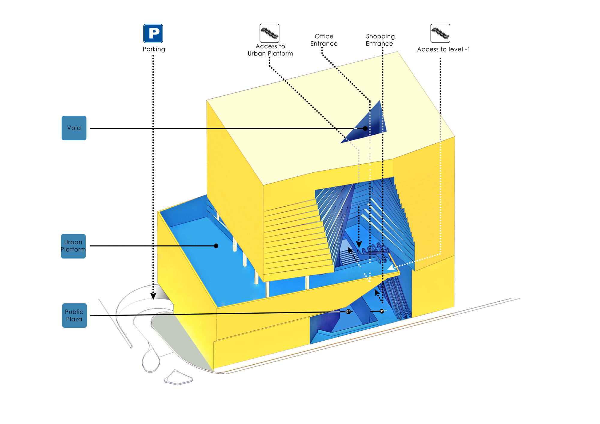 This project is located in Fereshteh Street, a relatively narrow street in Northern Tehran with a dense urban fabric. The volume of the building was formed by two major voids, one acting as an urban plaza and the other as an internal open space. The main idea of the project was to create an urban void which not only functions as a part of the building, but also as a part of the city and the surroundings. This void creates a connection between the building and the city through the common space of the building. The interior commercial space on the ground and underground levels are the continuation of the urban plaza. Through this platform, people could reach the roof area without entering other levels using a diagonal elevator.