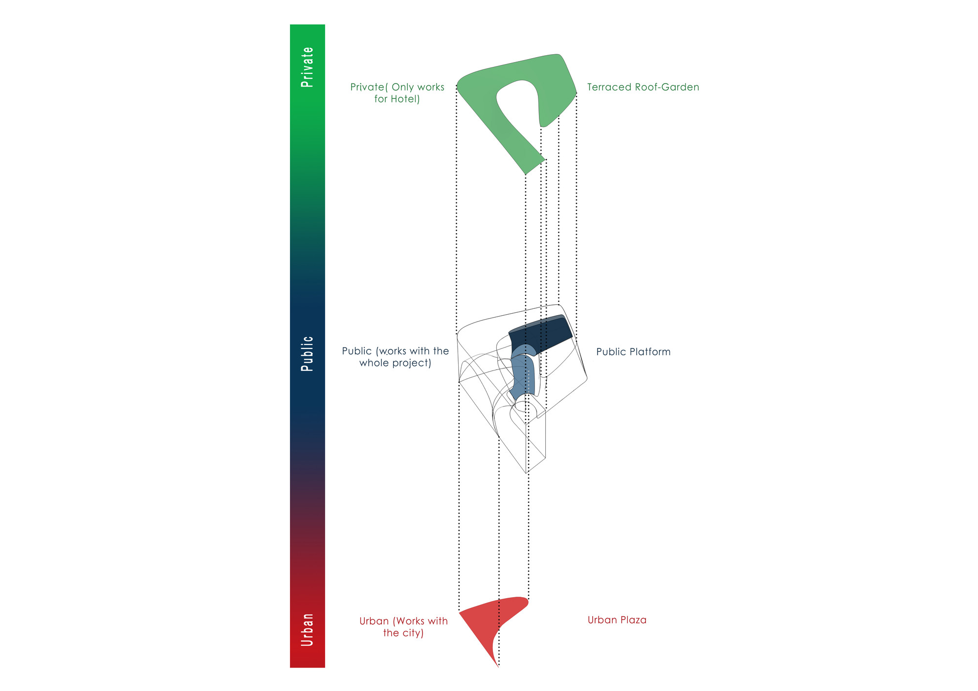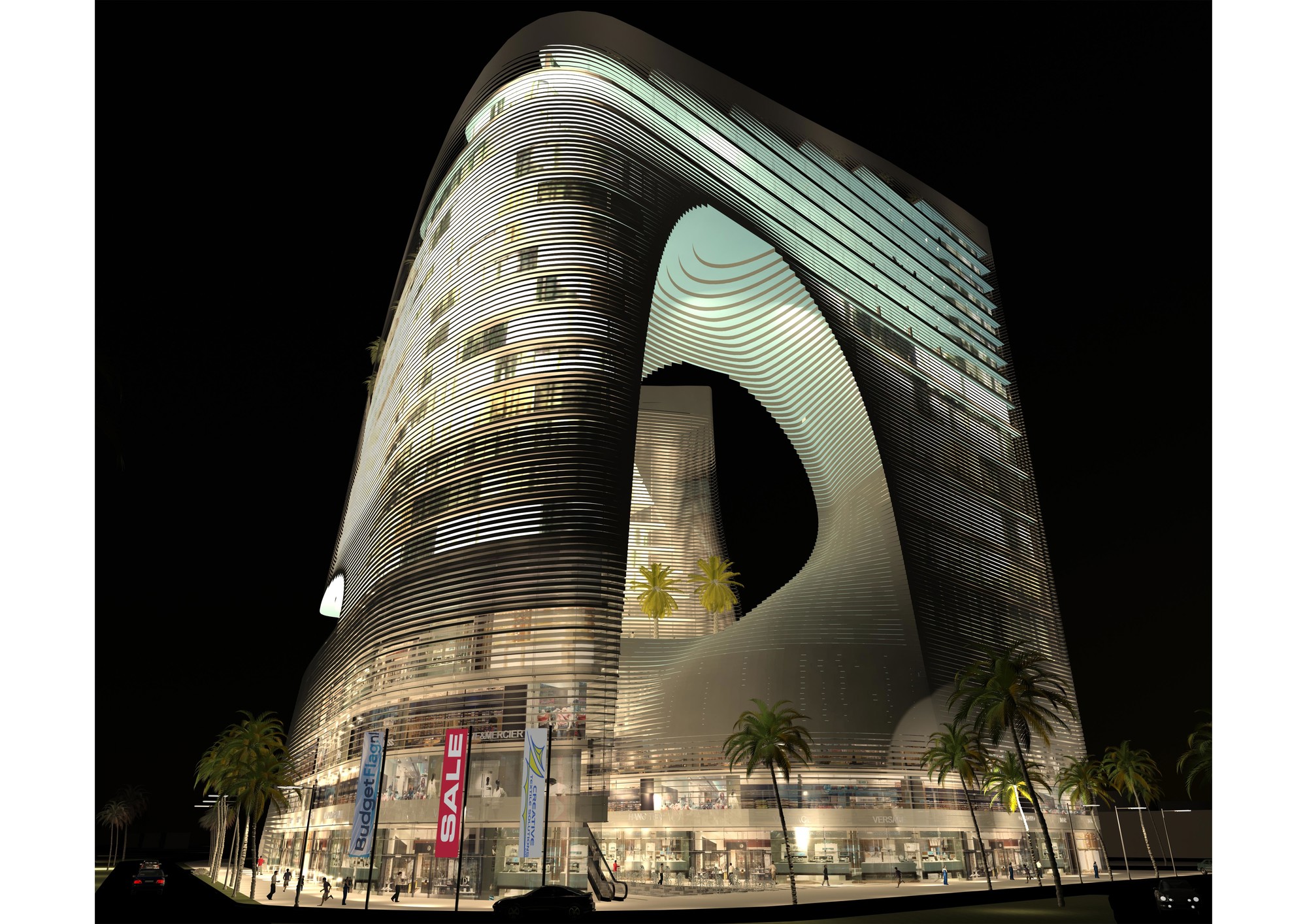 This project is located at the junction of two distinct regions of the Kish Island, the developed and the developing districts. The strategic position of the site gives the project a unique opportunity to become an iconic landmark of the city. Starting with a simple solid mass, the geometry of the building was formed by the intersection of two U shaped voids carved into the volume, one at the base and the other at the top. The intersection of these two voids formed a new open space, linking the building to the city. The voids were made closed on one side to maintain the required floor area and privacy. The final outcome of the project was influenced by a consistent grid network growing from the outer shell to the interior voids, as well as factors such as sunlight exposure, desired shading pattern, ventilation, view (for the hotel rooms), and visibility (for the commercial units).