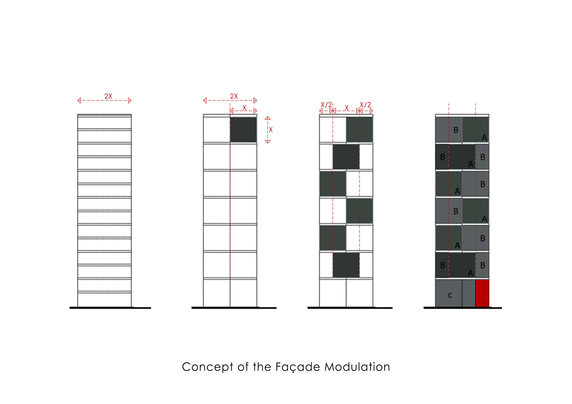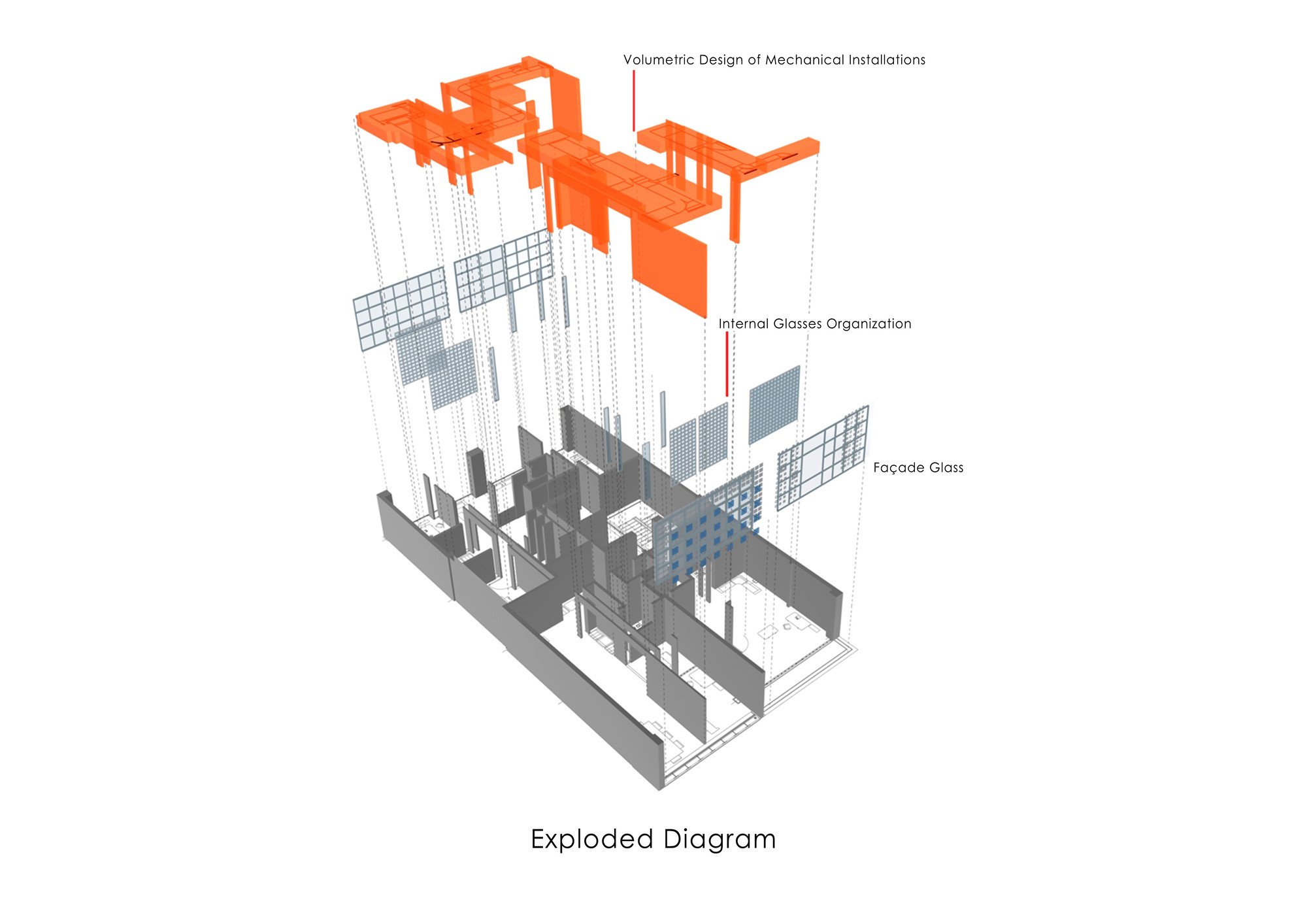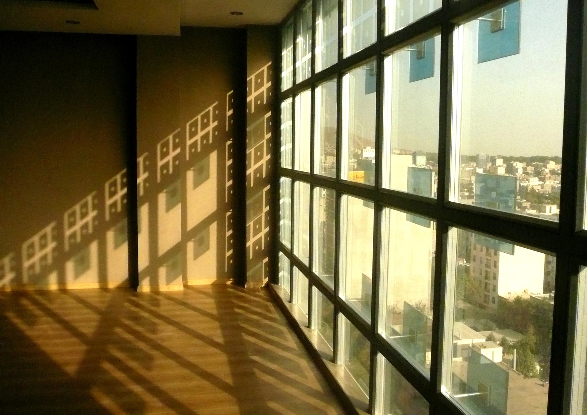 Shah-Karam project is a 16 storey office building with two underground floors dedicated to mechanical equipment, the ground and first floors forming the commercial units, and the upper 12 floors forming the office spaces. Considering the City regulations as well as the nearby public facilities, there was no parking requirement for this building. The client’s desire was to have a variety of office spaces with areas ranging from 50 to 250m2. This strategy divided each floor into 1 to 4 units. Considering the narrow width of the building relative to its height, the overall volume was divided into two sections both horizontally and vertically, defining the commercial and office sections of the building. One of the main design criteria was to maximize the amount of sunlight exposure to the inner part of the building from the main openings on the south and north sides. A series of transparent partitions were implemented parallel to the north-south facades in the form of glass blocks. This strategy not only unifies the exterior facade with the interior dividers, but also provides most of the required light by natural lighting. The main inspiration in the design of the window openings was the Orosi Windows in the Traditional Persian Architecture, in which stained glasses are used to form modular patterns. The glass openings on the facade were formed in two layers, one was the main window layer and the other consisted of blue rectangular glass modules of 30*30 cm connected to the main layer by steel rods. These modules not only control the amount of sunlight penetration but also create a beautiful light and shadow pattern in the interior spaces. In harmony with the glass modules, there is also a modular pattern used on the surface of the main glass layer using sandblast method. This pattern was formed based on the concept of “Expanding Geometry” in the Persian Architecture. Combination of the materials used on the facade reduces the amount of South heat gain up to %40.