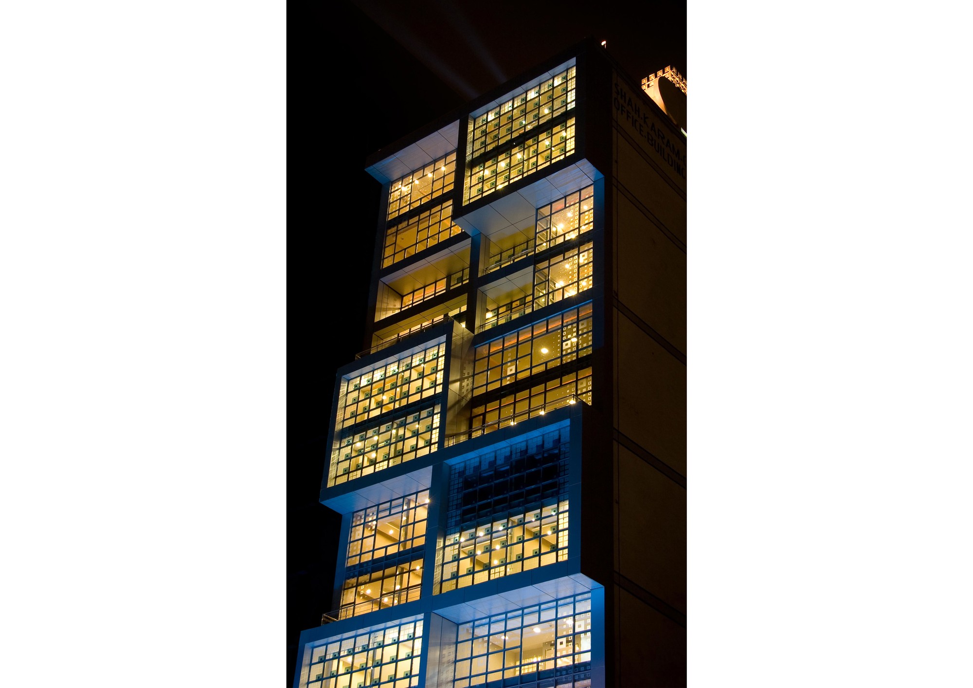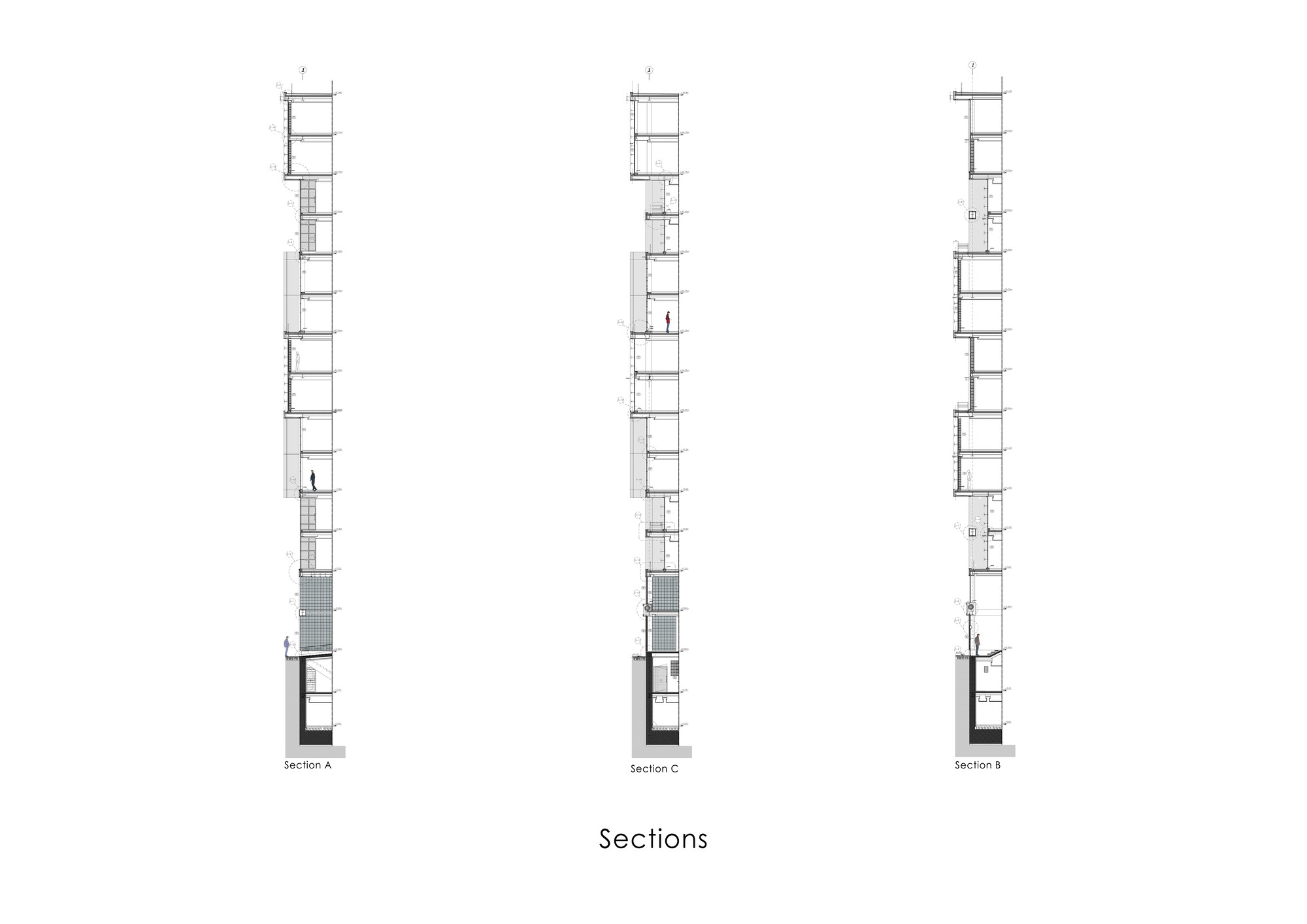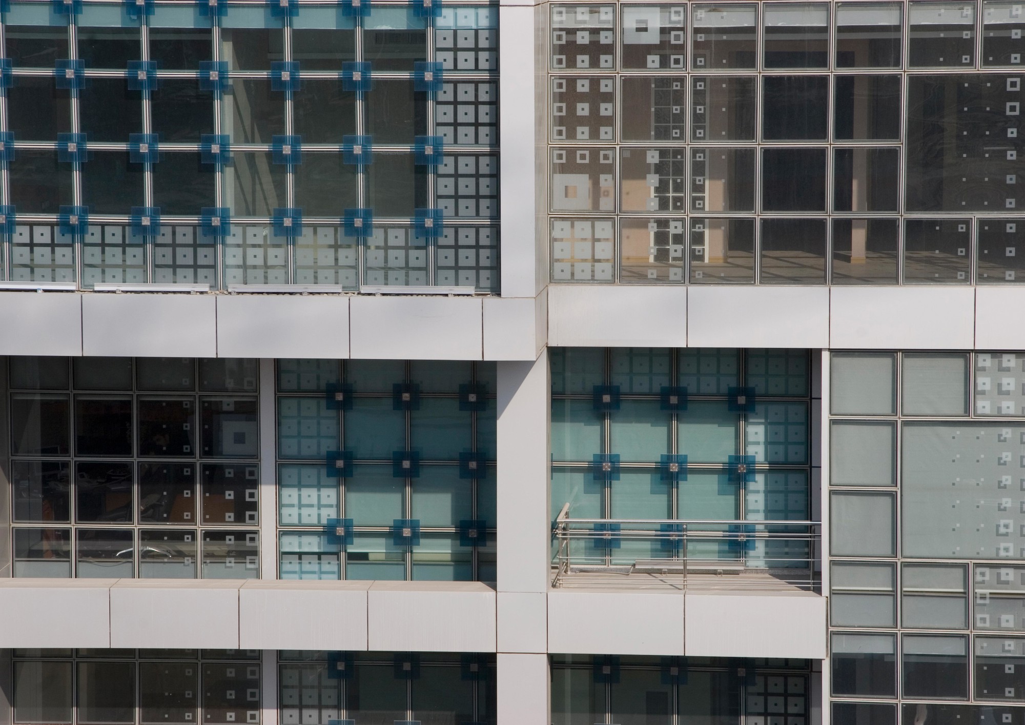 Shah-Karam project is a 16 storey office building with two underground floors dedicated to mechanical equipment, the ground and first floors forming the commercial units, and the upper 12 floors forming the office spaces. Considering the City regulations as well as the nearby public facilities, there was no parking requirement for this building. The client’s desire was to have a variety of office spaces with areas ranging from 50 to 250m2. This strategy divided each floor into 1 to 4 units. Considering the narrow width of the building relative to its height, the overall volume was divided into two sections both horizontally and vertically, defining the commercial and office sections of the building. One of the main design criteria was to maximize the amount of sunlight exposure to the inner part of the building from the main openings on the south and north sides. A series of transparent partitions were implemented parallel to the north-south facades in the form of glass blocks. This strategy not only unifies the exterior facade with the interior dividers, but also provides most of the required light by natural lighting. The main inspiration in the design of the window openings was the Orosi Windows in the Traditional Persian Architecture, in which stained glasses are used to form modular patterns. The glass openings on the facade were formed in two layers, one was the main window layer and the other consisted of blue rectangular glass modules of 30*30 cm connected to the main layer by steel rods. These modules not only control the amount of sunlight penetration but also create a beautiful light and shadow pattern in the interior spaces. In harmony with the glass modules, there is also a modular pattern used on the surface of the main glass layer using sandblast method. This pattern was formed based on the concept of “Expanding Geometry” in the Persian Architecture. Combination of the materials used on the facade reduces the amount of South heat gain up to %40.