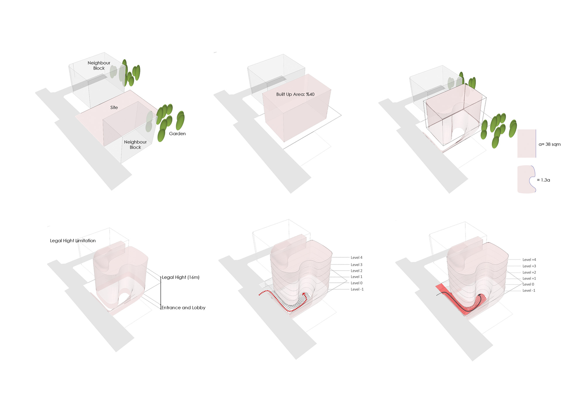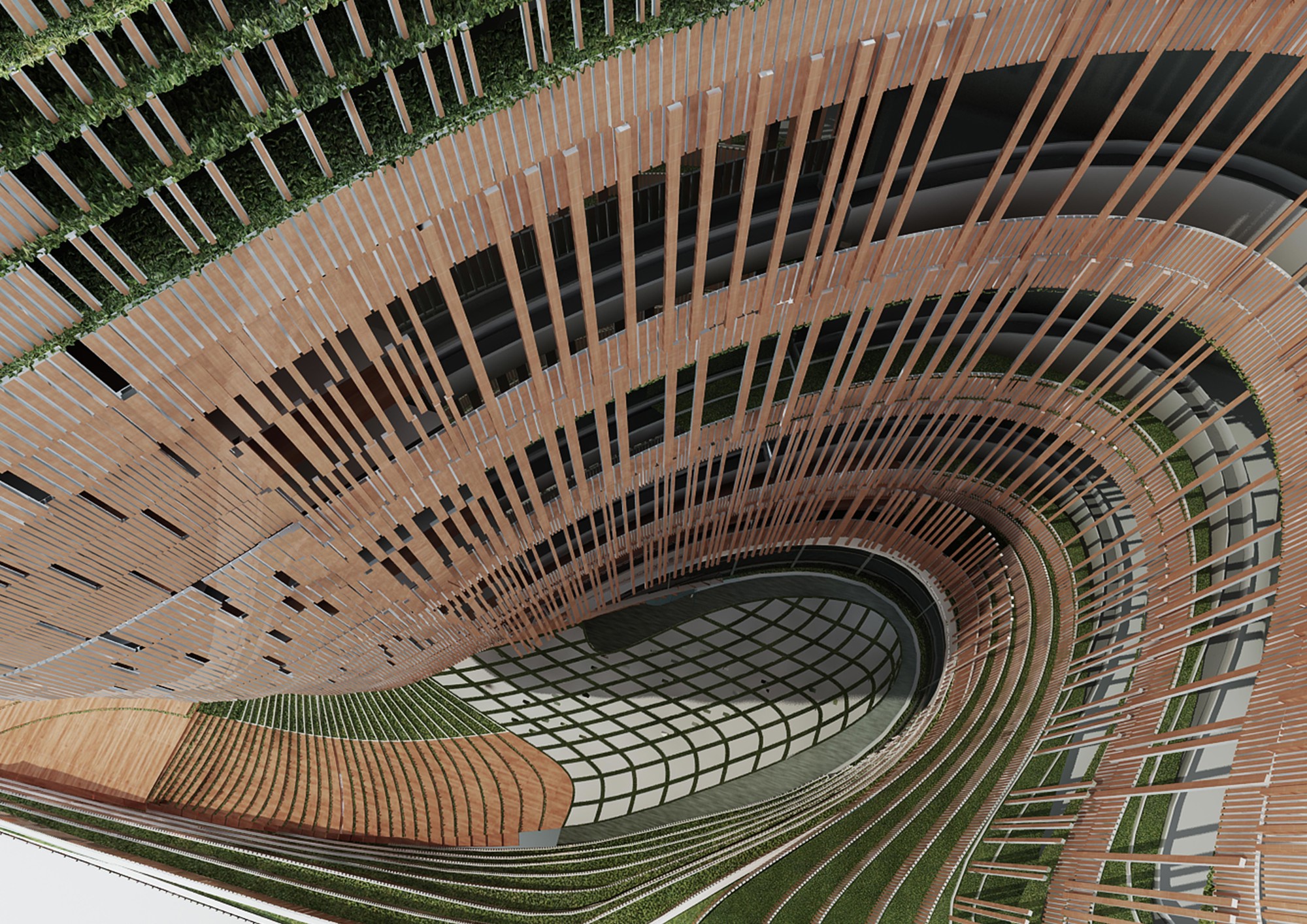 The building typology for this project was set to be a freestanding point tower on a podium. An important criterion here was to create a useful relation between the building and the surrounding landscape, while optimizing the amount of south sunlight exposure. The volumetric concept was initiated following a fluid motion starting from the perimeter of the site and revolving to form the volume of the building. The resulting geometry facilitates the natural ventilation of the units while optimizing the view and sunlight exposure. Following the same idea, the surrounding landscape revolves along the surface, creating a green layer wrapping the glazing behind the louvers on the façade. Vertical wooden louvers were implemented with a varying density to control view and the amount of sunlight exposure. Considering the building height limitations in the area, it was decided to place the lobby one level below ground. Shaped by the overall revolving volume, the entrance of the building invites people to the central open space and the lobby beneath the ground floor.