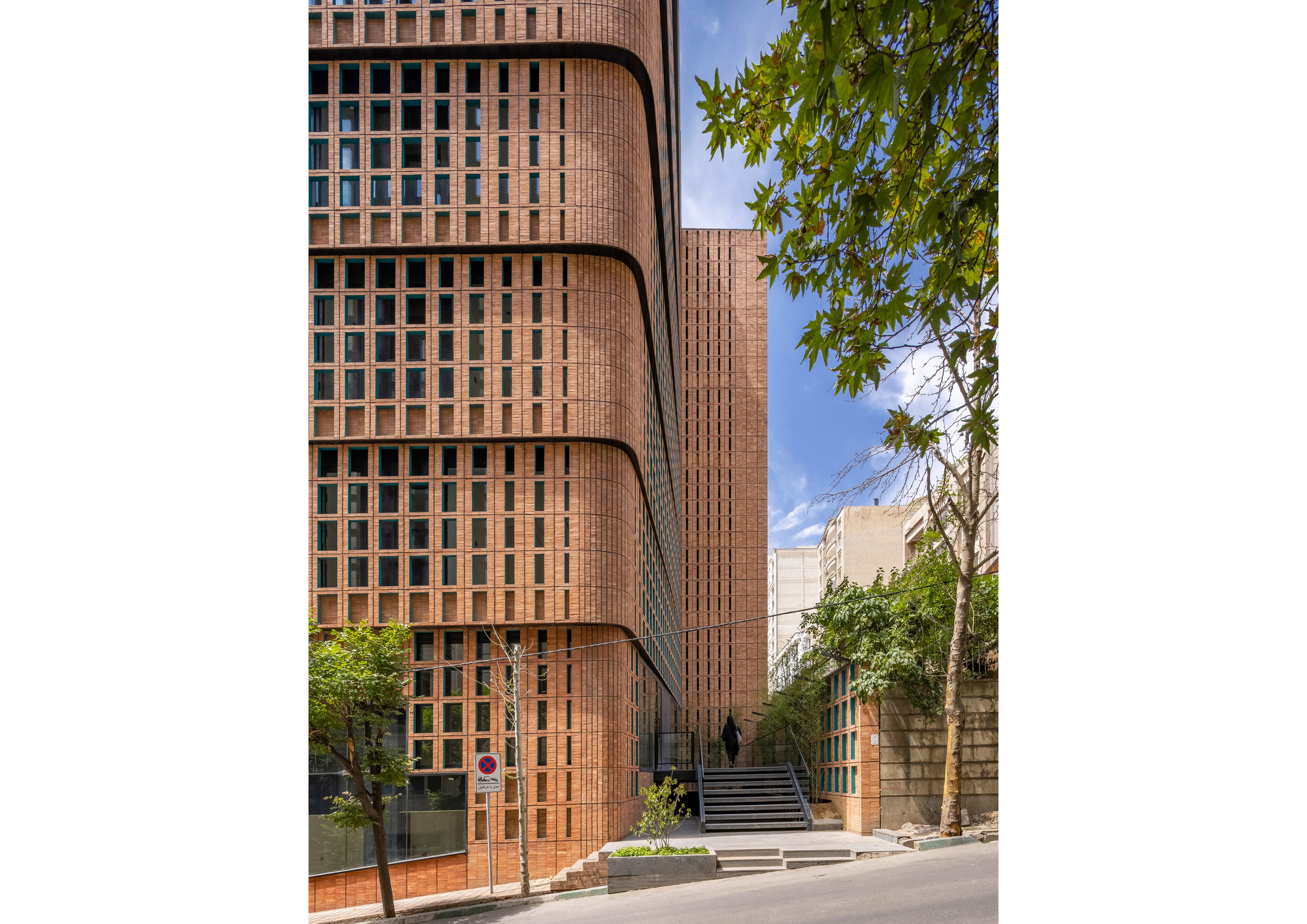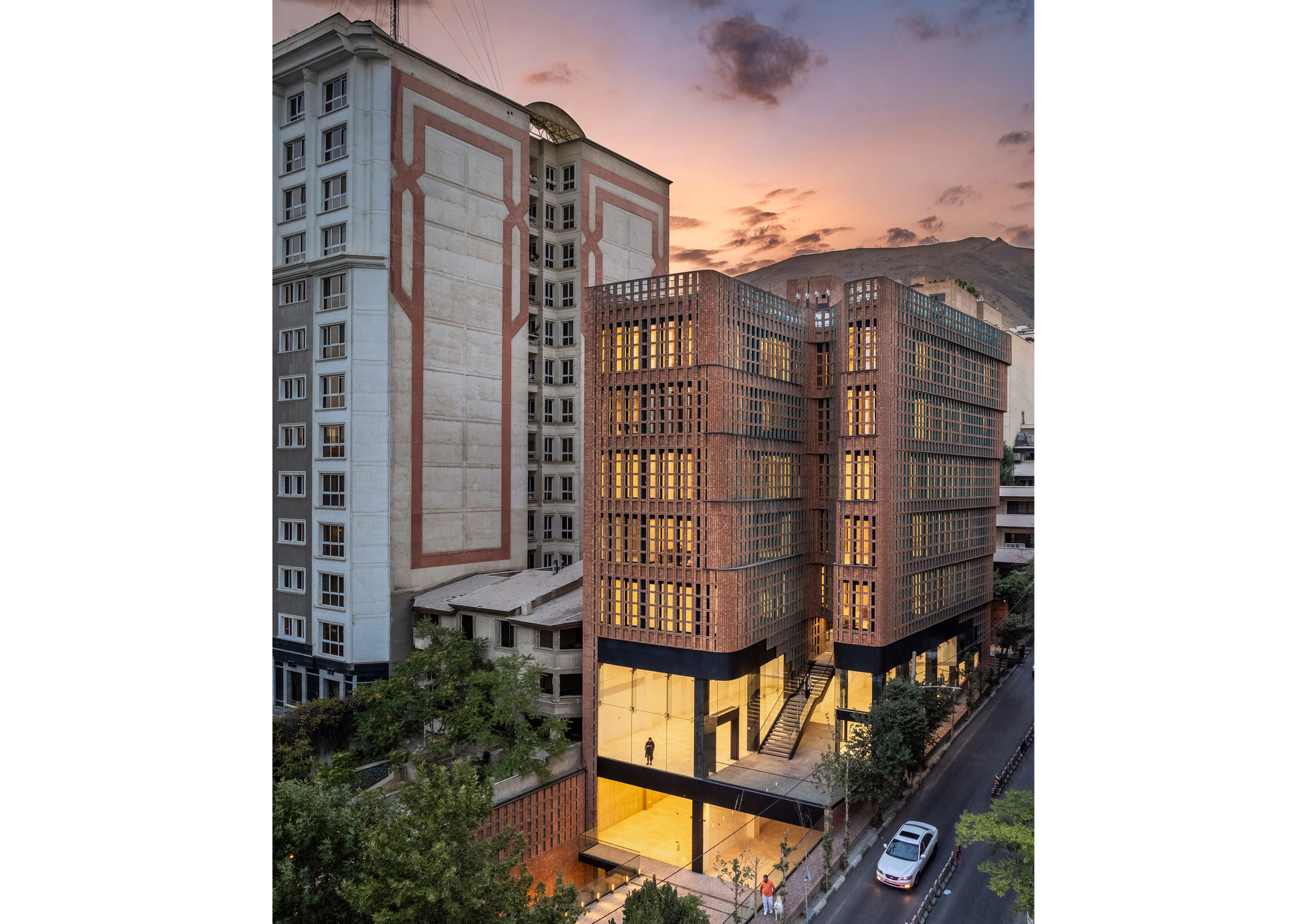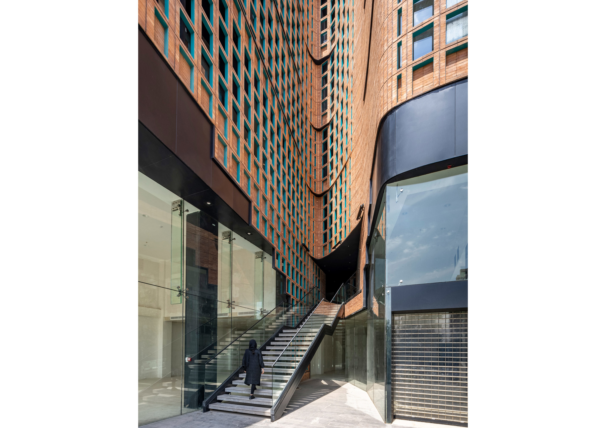 Hitra Commercial-Office Building is located at the intersection of two main streets in the Velenjak neighborhood of Tehran.The major criteria of this project were to reconsider the morphology of a typical office building to enhance the quality of lighting of the space and view without altering the optimum built area of the building.The regulation for office buildings in Tehran dictates that the occupation area of the building should not exceed 60% of the land, while 2 meters can be dedicated to a façade design. also to provide light to the central units it's common to have a vertical void in the central part of the building volume. Moreover, the allowable proportion of glass to other materials used on the façade is 40%.These two regulations were reassessed during the primary investigations of this project to optimize natural lighting and view.The primary volume of the project was formed by relocating the central void to the façade to not only form the main entrance but also provide light and view for the central units. By dedicating this void to the city, the interaction of people and the building has increased through the created welcoming entrance. Based on the before-mentioned regulation to only use 40% glass on the façade to create an integrated volume, the double-skin façade was created with the outer porous skin formed by brick arranged around torques metal frames. The combination of brick and metal frames formed modules creating a gradient opening on the façade. Based on this idea, a homogeneous mass was formed which creates a varying combination of brick and turquoise colors for the viewers based on their location and viewing angle. Moreover, the continuous glass windows on the inner layer of the double-skin allow for proper sunlight penetration to the office units.