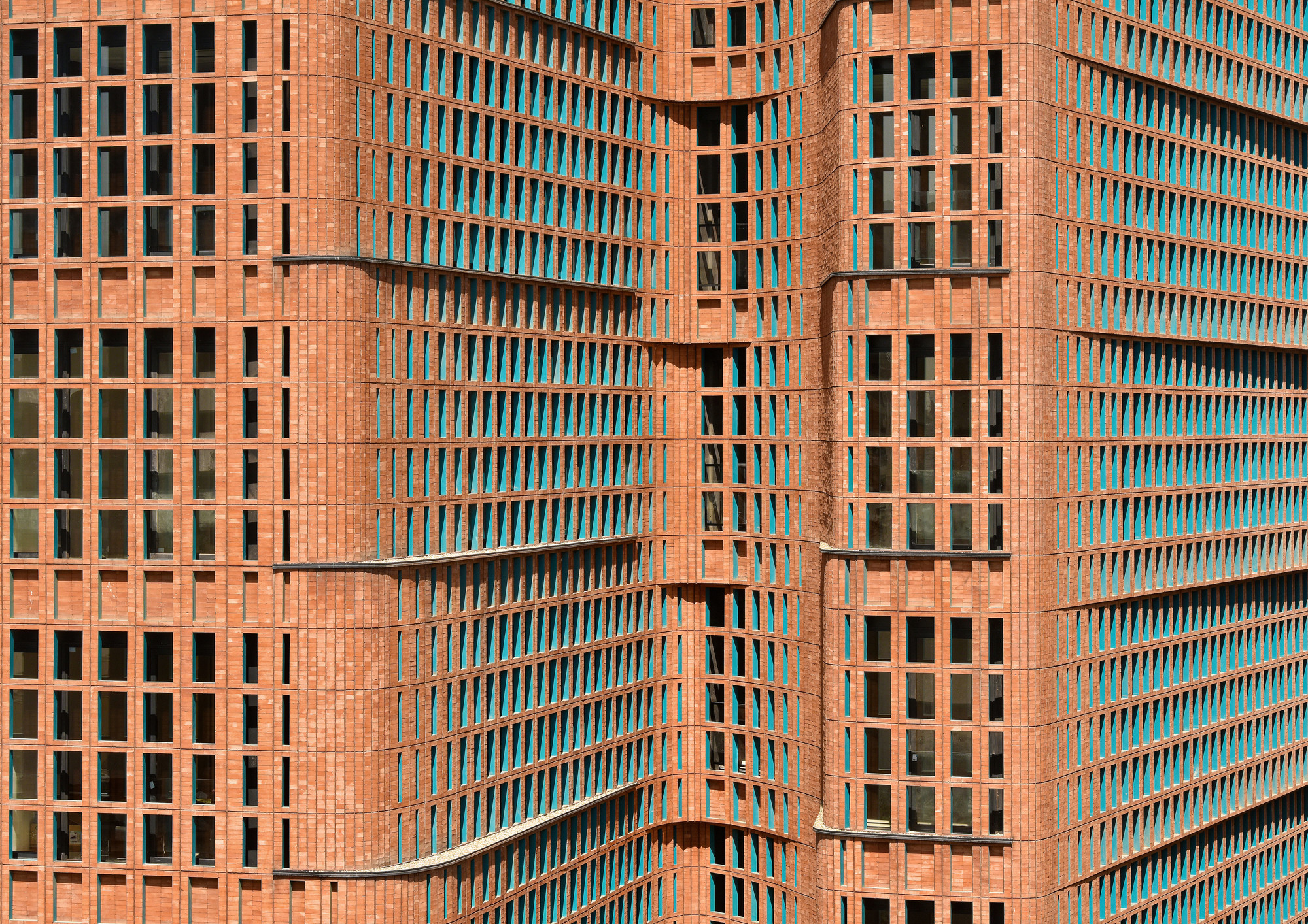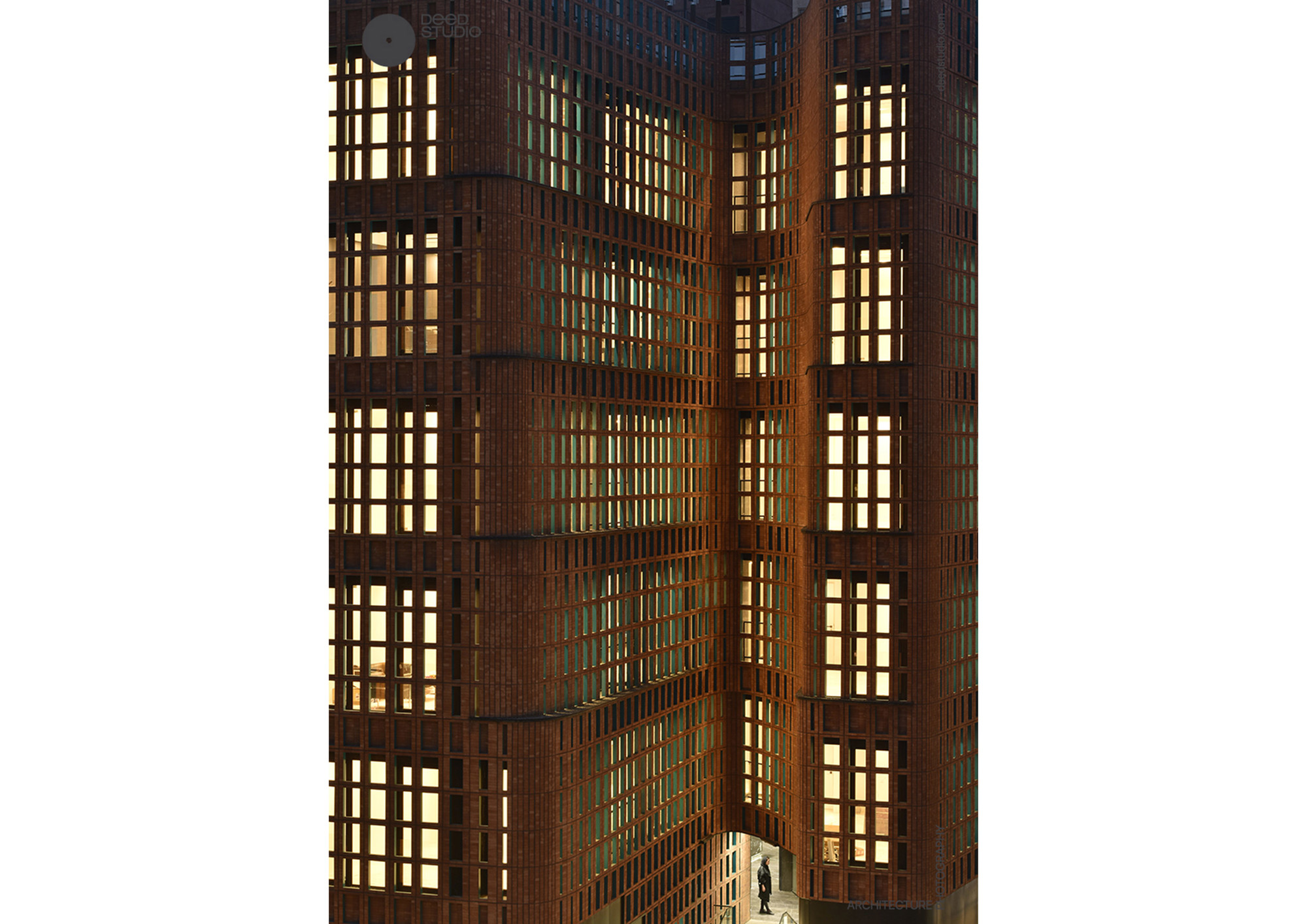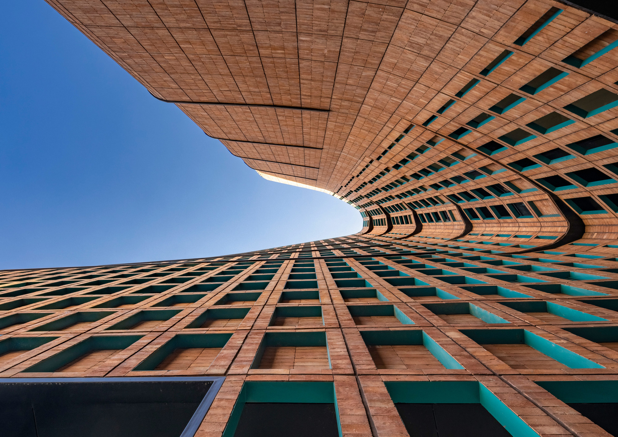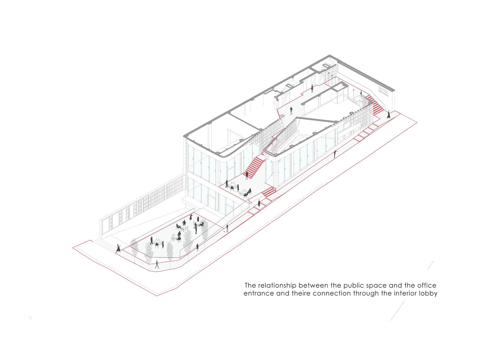 Hitra Commercial-Office Building is located at the intersection of two main streets in the Velenjak neighborhood of Tehran.The major criteria of this project were to reconsider the morphology of a typical office building to enhance the quality of lighting of the space and view without altering the optimum built area of the building.The regulation for office buildings in Tehran dictates that the occupation area of the building should not exceed 60% of the land, while 2 meters can be dedicated to a façade design. also to provide light to the central units it's common to have a vertical void in the central part of the building volume. Moreover, the allowable proportion of glass to other materials used on the façade is 40%.These two regulations were reassessed during the primary investigations of this project to optimize natural lighting and view.The primary volume of the project was formed by relocating the central void to the façade to not only form the main entrance but also provide light and view for the central units. By dedicating this void to the city, the interaction of people and the building has increased through the created welcoming entrance. Based on the before-mentioned regulation to only use 40% glass on the façade to create an integrated volume, the double-skin façade was created with the outer porous skin formed by brick arranged around torques metal frames. The combination of brick and metal frames formed modules creating a gradient opening on the façade. Based on this idea, a homogeneous mass was formed which creates a varying combination of brick and turquoise colors for the viewers based on their location and viewing angle. Moreover, the continuous glass windows on the inner layer of the double-skin allow for proper sunlight penetration to the office units.