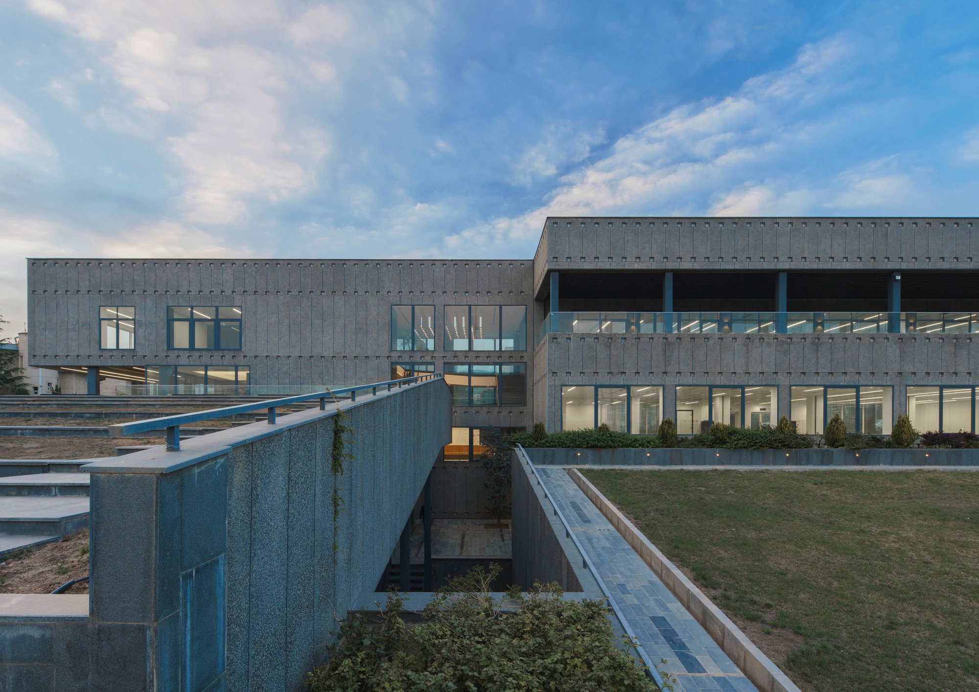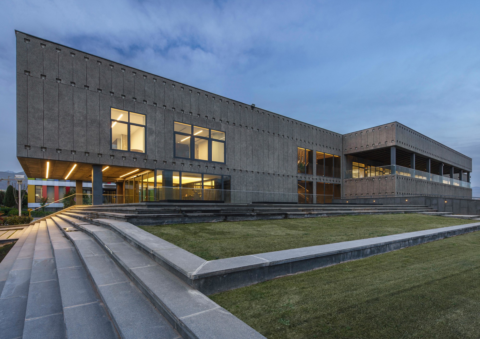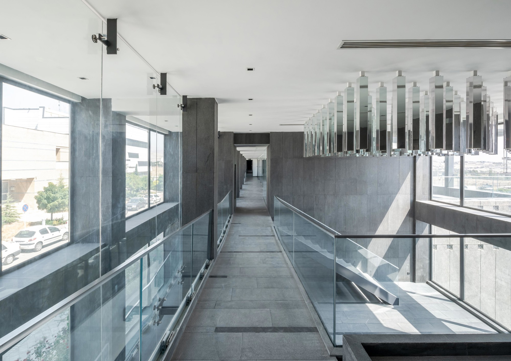 This project was initiated by the EBA[M] Office under the supervision of Mr. Arash Mozafari. Due to some technical issues EBA[M] was unable to continue the supervision of the construction process. Consequently, the built form departed significantly from the original design. HOOBA Team took on the project at this critical stage of the construction process. Considering factors such as: the non-consistent position of the windows, the need for controlling the amount of sunlight exposure, and the desire to form a volumetric consistency, it was decided to create a double layer enclosure for this building. Volcanic crushed stones were used in the form of Gabion panels to form the outer shell of the enclosure. Due to their porous texture, the volcanic stones of the Damavand region are significantly lighter than other stone types, making them an ideal choice for this project. The panels were implemented in different angles depending on weather there is a solid wall or an opening on the main facade. The sunlight penetration through the voids between the stones creates a pleasant atmosphere in the interior spaces. Same type of stone was used in the interior spaces to create harmony between the interior and the exterior of the project and a singular material was used to form the walls and the flooring. The main interior ramp is accompanied by a colored glass wall representing the organizational color of the company. The rest of the interior partitions are also made of opaque and transparent glasses to allow sunlight penetration inside the spaces. An adjoining volume was decided to be added to the building. This volume was formed underground providing the entire roof area available for satellite implementation. The surrounding landscape was integrated with the building to form a continuous whole and to maximize the viewing angles around the site. The assembly hall, the parking, and the storage are all parts of the underground space which is accessible using the lowered platforms called “Garden-Pit” in the Persian Architecture. These platforms also provide the required light and ventilation for the underground spaces.