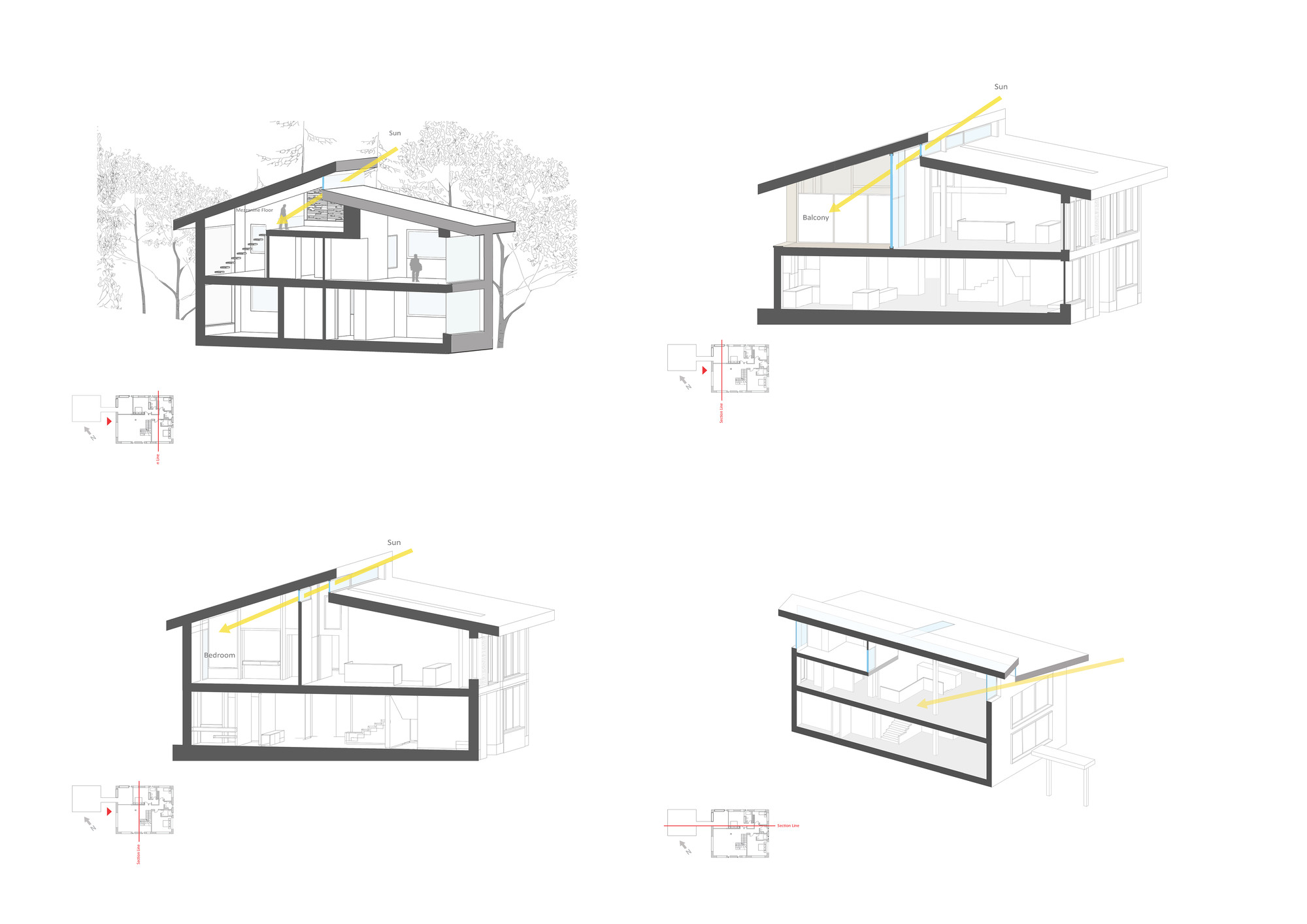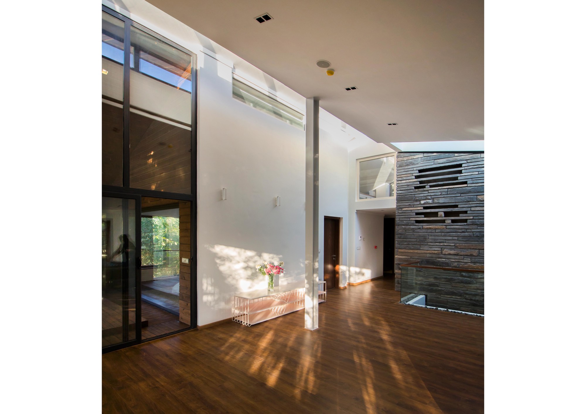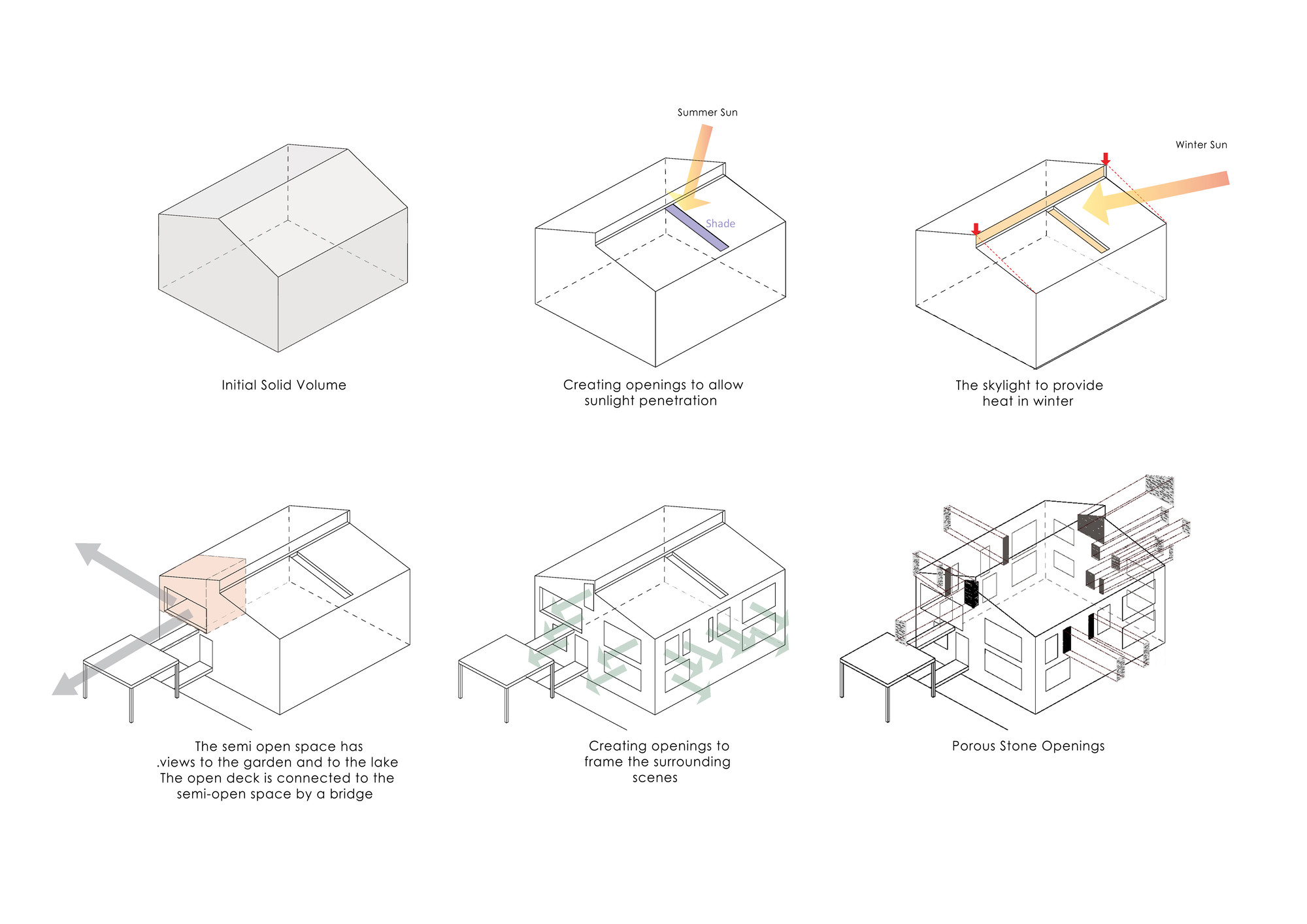 The Initial idea of this project was to design a 330 m2 villa in a 3 hectares private yard facing a lake. One of the main criteria was to create spaces that are closely engaged with the surrounding landscape, an uninterrupted connection between the interior and the exterior to form a structure which becomes a part of the site itself:A. A systematic organization of open and semi-open spaces was used to enhance the presence of nature in the interior spaces. The main semi-open space is a void on the first floor of the main cubical form. The strategic position of this void provides both physical connection to the private lounge and the master bedroom as well as visual connection to the lake. The semi-open space is also connected to the terrace on the lake side by the means of a bridge. This terrace is a perfect view point of the lake.B. The stones used on the façade are in harmony with the existing stones in the garden. These stones are used in their natural form but in a controlled horizontal pattern. The voids in the stone pattern provide a controlled overlook and a limited sunlight penetration to spaces such as washrooms and corridors which require less exterior exposure. Integration of the voids and solids not only creates a consistent exterior façade, but also provides the interior spaces with a view to the greenery. At nights these voids provide a lighter feeling of the solid exterior façade. These voids are also used to naturally ventilate the building as well as to implement the mechanical equipment.C. The existing trees between the open and semi open spaces were kept so that both spaces are surrounded by vegetation. The variation of sunlight penetration through the leafs during the day significantly enhances the quality of the atmosphere.One of the main criteria in the design process was to maximize the amount of sunlight exposure. Two sets of skylights were implemented, one over the main staircase and the other at the vertical gap between the two roofs. Moreover, transparent dividers implemented parallel to the vertical skylight increase sunlight penetration to spaces not directly connected to the skylight. The main function of the horizontal skylight over the main staircase was to provide natural winter heating. This skylight could be shaded in summer to prevent excess sunlight exposure. In section, these systems enable sunlight penetration in three directions: vertical, horizontal, as well as diagonal.