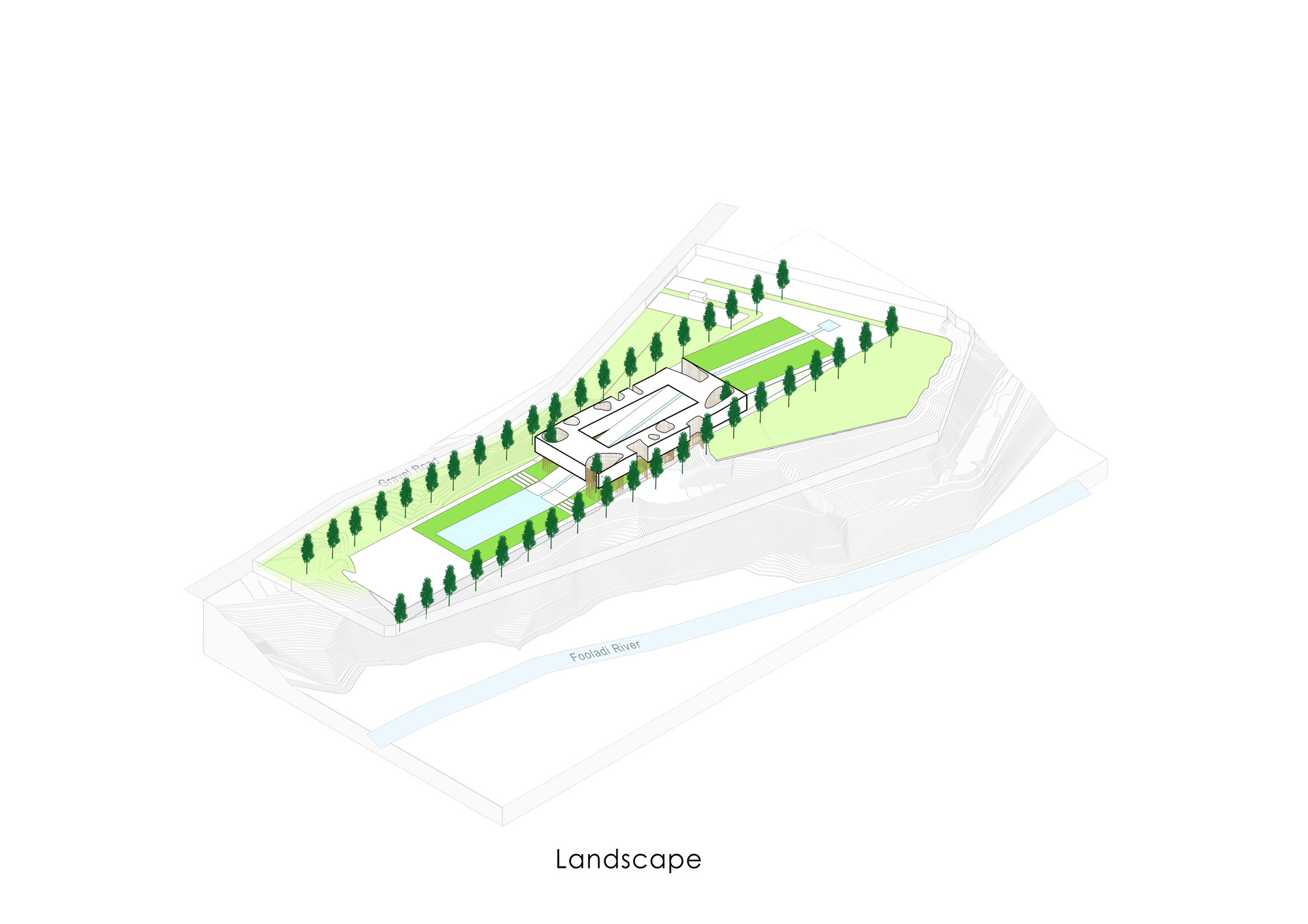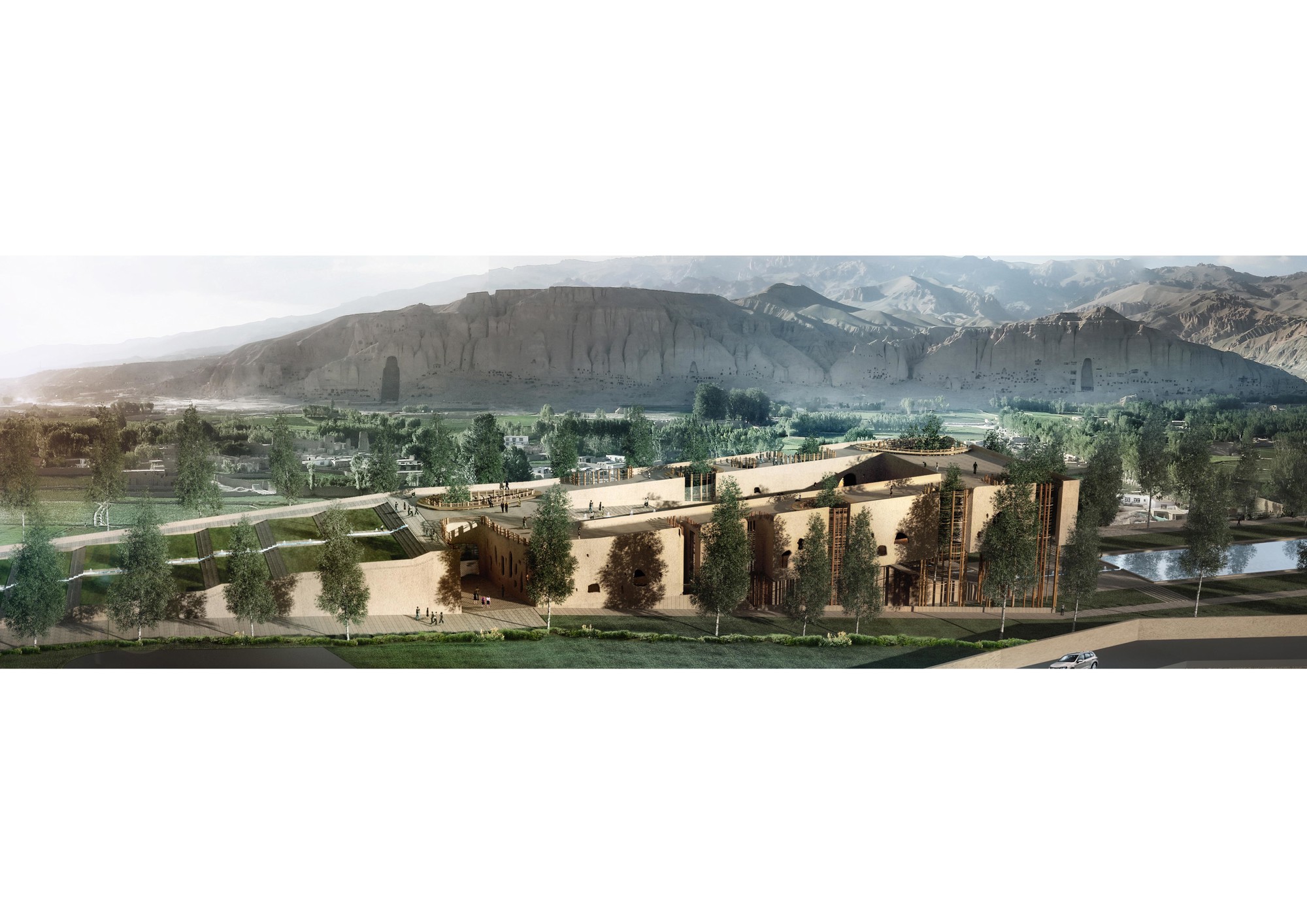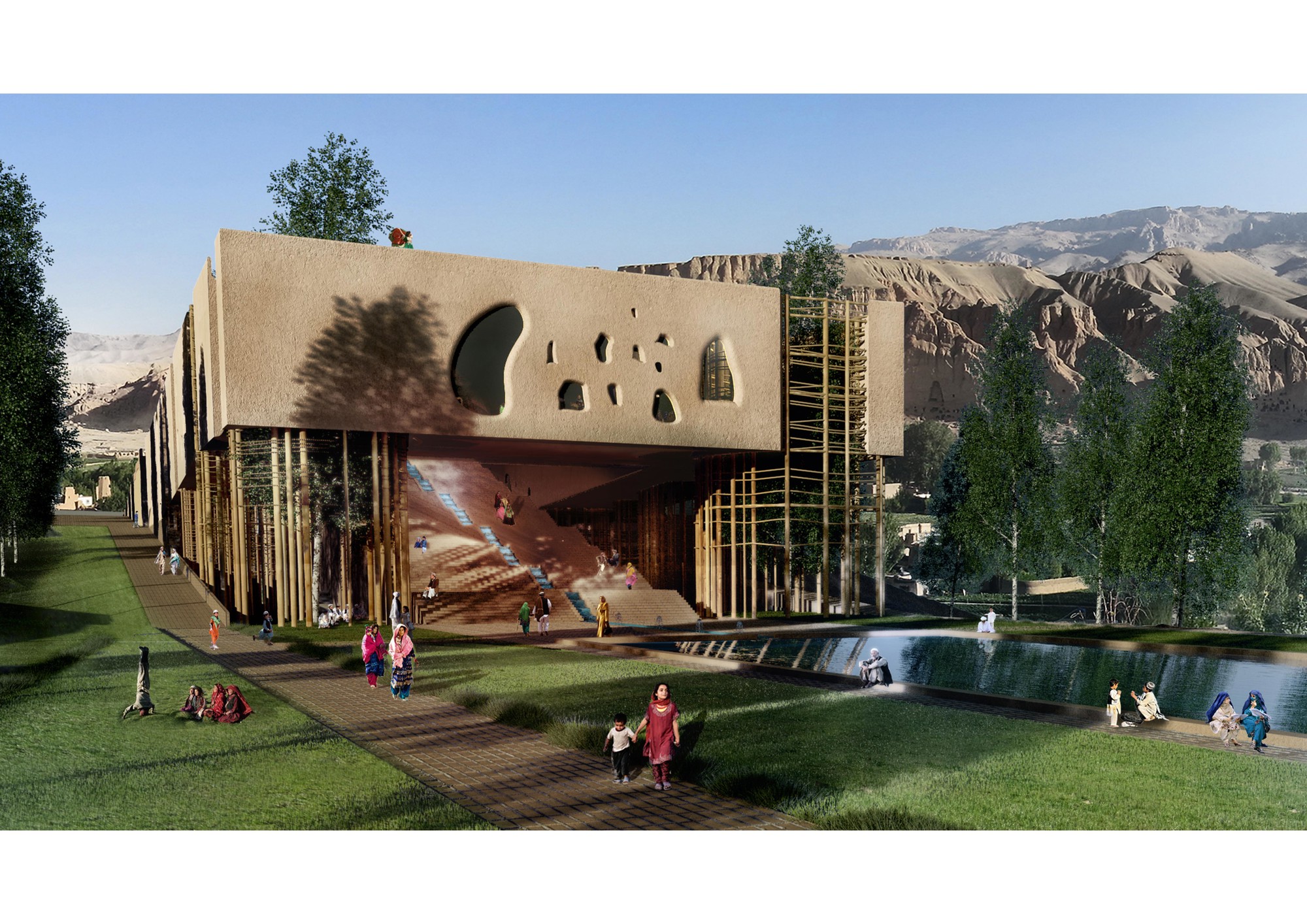 The aim of this project was to create a cultural-environmental platform to connect and unify people with the garden and the valley. In an attempt to bring hope to the people of Afghanistan, the main objective of this design was to create a Garden with a positive impact on the cultural context of the Bamiyan Valley. Project goals: 1. To respect the domestic cultural values and to introduce them at an international level 2. To respect the ecology of the Bamiyan Valley 3. To use local construction materials, technology and labour 4. To shape the design idea according to the functional and social requirements, considering local methods and climatic conditions 5. To promote cultural values and increase motivation and hope for Afghan people by creating a city garden Concept Idea Inspired by the form of the Babur Garden in Kabul, the project was formed along a linear diagram expanding from South-West to North-East (reminding of the ancient Silk Road), parallel to the Buddha Cliffs. This axis was integrated with a water path to form the interior and the exterior parts of the project. An introverted courtyard model was used to form the main building and to connect it to the ground. The amphitheatre at the centre of the complex rested on the existing topography to minimize the amount of required excavation. The roof of this section creates a platform for the outdoor amphitheatre. Another criterion was to integrate the building with the site. Inspired by the carvings of the Buddha Cliffs, the negative and positive spaces of this project were formed to: • Integrate the building with the green spaces • Create event spaces which organize interior and exterior spaces at the same time • Provide natural ventilation and lighting • Form the building structure The structural columns were designed to be flexible against earthquakes. These columns also play an important role in the formation of varying light and shadow patterns during the day. At night, this effect is reversed by the solid baked mud walls and the porous wooden frames. Functional Idea Interior spaces: There are 5 main zones creating the interior spaces of the project. These zones are connected through a central circulation path, providing a low cost barrier free access to the entire interior spaces of the project. One zone includes the lobby, the coffee room, and the office spaces, while another one contains the gallery spaces. This zone also acts as the divider of the two adjacent spaces. The third zone created the teaching spaces and the conference room, while the fourth zone included the research spaces, the studios, as well as the practice room. Last but not least, zone five forms the central amphitheatre with a main entrance, a barrier free access on the ground level, as well as an emergency exit at the below ground level. Site: The circulation diagram was established based on the garden axis, defining social activities in three sections: 1. The platform on the roof of the main building, providing 360o panoramic view of the site and the Bamiyan Valley. 2. The staircase on the roof of the interior amphitheatre creating an outdoor amphitheatre on top. This platform is also used as the vertical circulation path connecting the ground level to the underground. 3. The exterior gallery spaces enabling outdoor exhibitions and activities. Materials and Construction Techniques The structure of the building includes a combination of mud walls and double layers of woven wood bars to reduce heat convection to the exterior. These layers rest on top of a network of imported timbers connected to a core composed of local lumber and imported timbers which transfer the loads to the brick foundation of the building. An area on site was dedicated to the implementation of solar panels in order to provide the required electricity. Moreover, a row of high density local trees were planted on the main axis to reduce the amount of wind exposure. In conclusion, the idea of this project was to combine sustainable architecture with vernacular techniques considering the existing economical and climatic limitation.