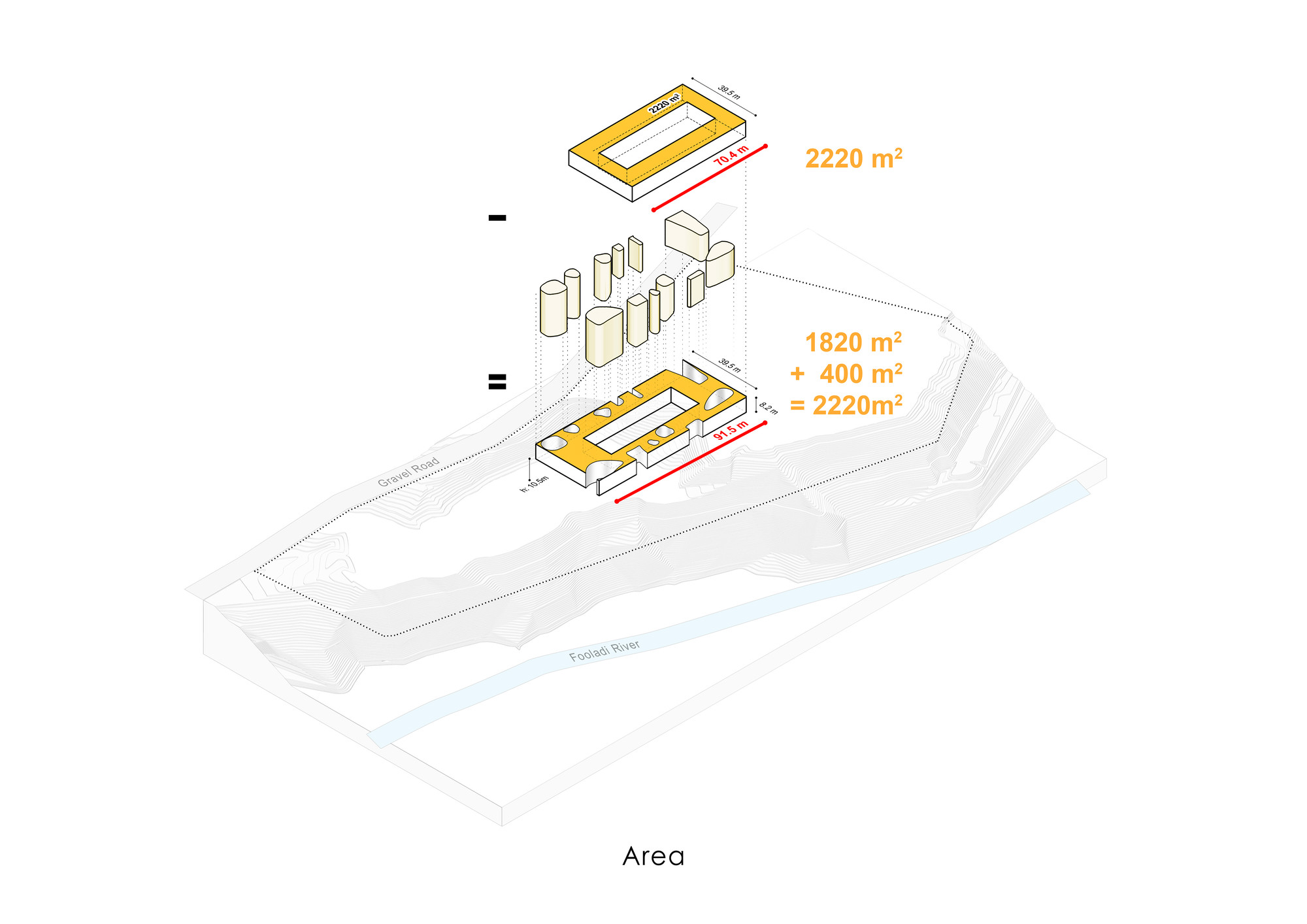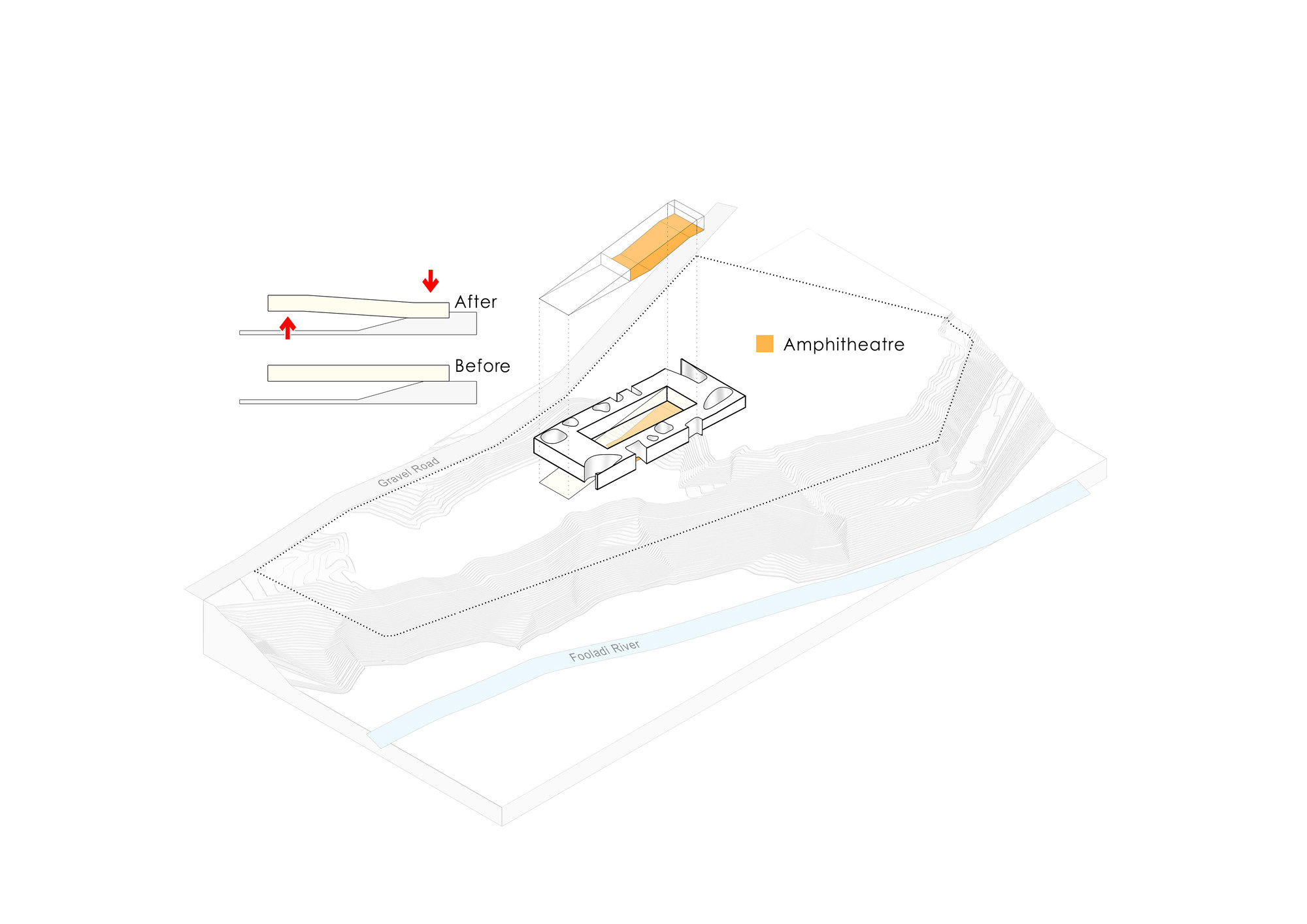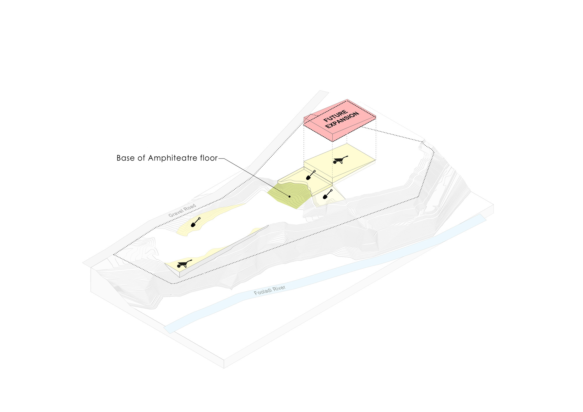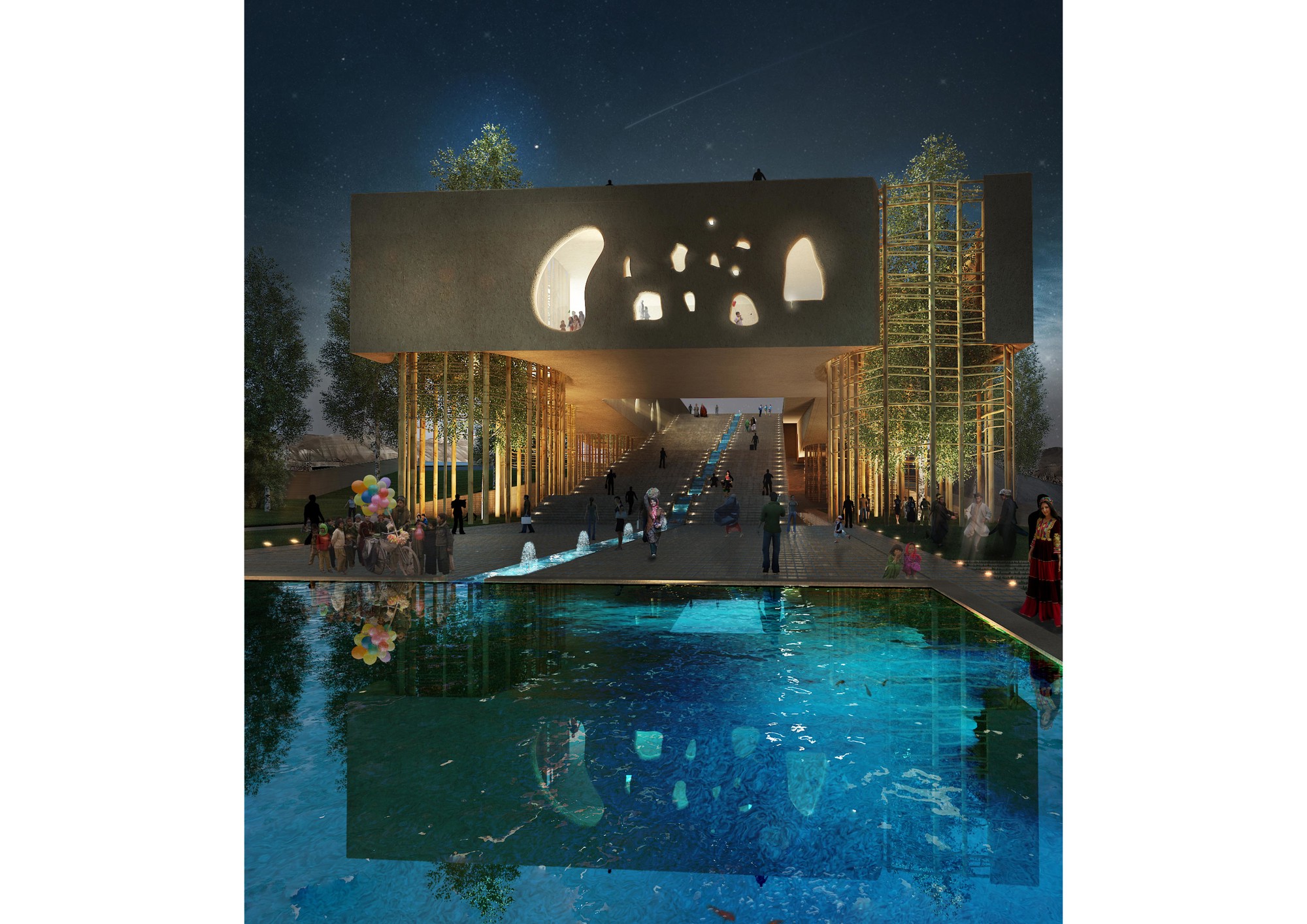 The aim of this project was to create a cultural-environmental platform to connect and unify people with the garden and the valley. In an attempt to bring hope to the people of Afghanistan, the main objective of this design was to create a Garden with a positive impact on the cultural context of the Bamiyan Valley. Project goals: 1. To respect the domestic cultural values and to introduce them at an international level 2. To respect the ecology of the Bamiyan Valley 3. To use local construction materials, technology and labour 4. To shape the design idea according to the functional and social requirements, considering local methods and climatic conditions 5. To promote cultural values and increase motivation and hope for Afghan people by creating a city garden Concept Idea Inspired by the form of the Babur Garden in Kabul, the project was formed along a linear diagram expanding from South-West to North-East (reminding of the ancient Silk Road), parallel to the Buddha Cliffs. This axis was integrated with a water path to form the interior and the exterior parts of the project. An introverted courtyard model was used to form the main building and to connect it to the ground. The amphitheatre at the centre of the complex rested on the existing topography to minimize the amount of required excavation. The roof of this section creates a platform for the outdoor amphitheatre. Another criterion was to integrate the building with the site. Inspired by the carvings of the Buddha Cliffs, the negative and positive spaces of this project were formed to: • Integrate the building with the green spaces • Create event spaces which organize interior and exterior spaces at the same time • Provide natural ventilation and lighting • Form the building structure The structural columns were designed to be flexible against earthquakes. These columns also play an important role in the formation of varying light and shadow patterns during the day. At night, this effect is reversed by the solid baked mud walls and the porous wooden frames. Functional Idea Interior spaces: There are 5 main zones creating the interior spaces of the project. These zones are connected through a central circulation path, providing a low cost barrier free access to the entire interior spaces of the project. One zone includes the lobby, the coffee room, and the office spaces, while another one contains the gallery spaces. This zone also acts as the divider of the two adjacent spaces. The third zone created the teaching spaces and the conference room, while the fourth zone included the research spaces, the studios, as well as the practice room. Last but not least, zone five forms the central amphitheatre with a main entrance, a barrier free access on the ground level, as well as an emergency exit at the below ground level. Site: The circulation diagram was established based on the garden axis, defining social activities in three sections: 1. The platform on the roof of the main building, providing 360o panoramic view of the site and the Bamiyan Valley. 2. The staircase on the roof of the interior amphitheatre creating an outdoor amphitheatre on top. This platform is also used as the vertical circulation path connecting the ground level to the underground. 3. The exterior gallery spaces enabling outdoor exhibitions and activities. Materials and Construction Techniques The structure of the building includes a combination of mud walls and double layers of woven wood bars to reduce heat convection to the exterior. These layers rest on top of a network of imported timbers connected to a core composed of local lumber and imported timbers which transfer the loads to the brick foundation of the building. An area on site was dedicated to the implementation of solar panels in order to provide the required electricity. Moreover, a row of high density local trees were planted on the main axis to reduce the amount of wind exposure. In conclusion, the idea of this project was to combine sustainable architecture with vernacular techniques considering the existing economical and climatic limitation.