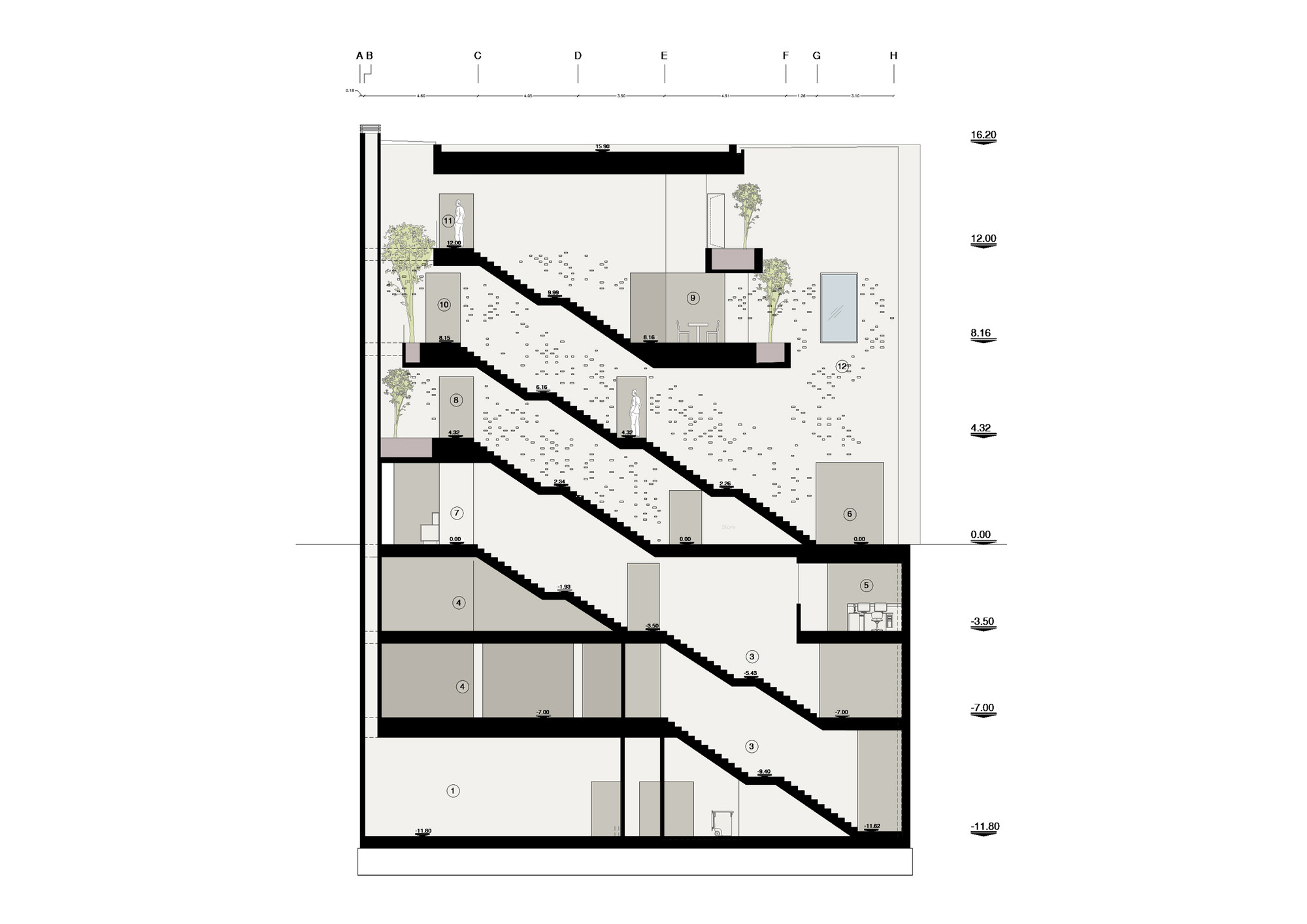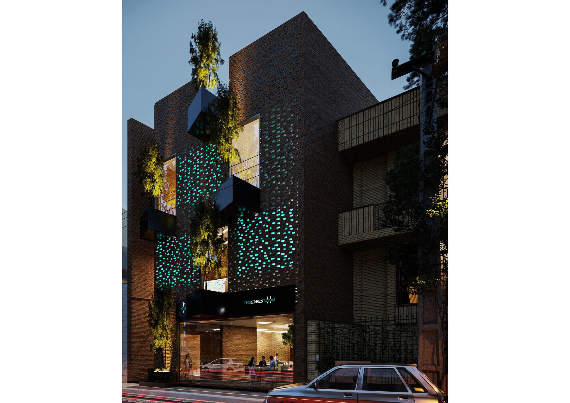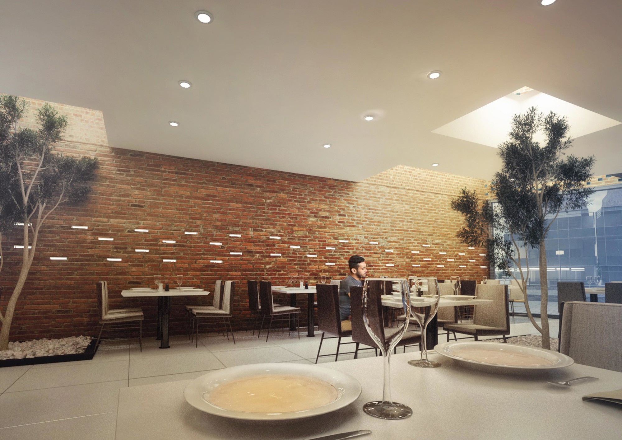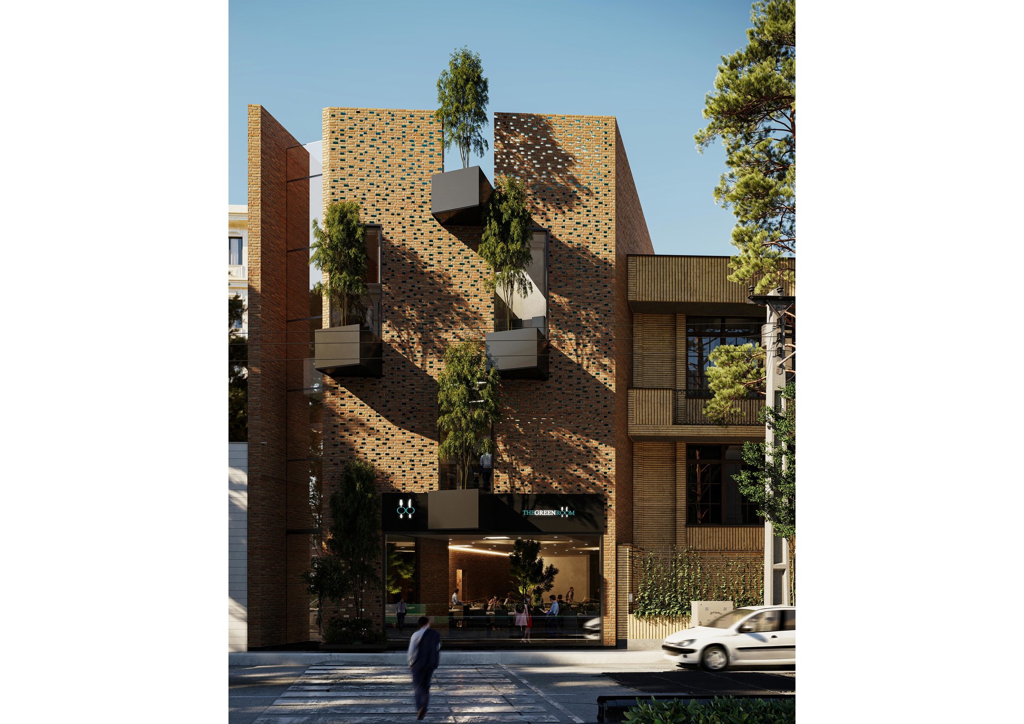 Situated in one of the social hubs of Qom city, this project serves as a restaurant complex with two stories dedicated to fast food and two stories dedicated to a fine dining. Taking into account the function of the building and the narrow width of the site, the idea was to create a spatial division which forms both the interior and the exterior of the project while provides access, seating area, as well as green spaces. The main criteria was to design spaces for people to dine surrounded by greenery and to create a joyful atmosphere full of green space and a pleasant presence of natural light. Working in sections and plans simultaneously, a series of voids were implemented to allow sunlight penetration in different interior spaces and to create dining areas in between green zones. Regular modules define different functions throughout the building, such as the main staircase which occupies one module. These modules define not only the seating areas but also the green spaces which contain trees at the exterior section. This project attempts to create identity in the social culture of the city by using the garden productions in the recipe used in the restaurants. These trees create a vertical garden on the façade, providing a pleasant view for the customers in the restaurants. A combination of brick and glass was used to form both the exterior and the interior enclosures. Bricks were organized in patterns with small gaps in some sections to allow sunlight penetration into the building. The artificial lighting of the project was also designed based on this pattern. In section, the created voids enable view from the sidewalk to different floors of the building. The roof top of the building is also a semi open space which could be closed by a folding fabric roof during the hot hours of the day.