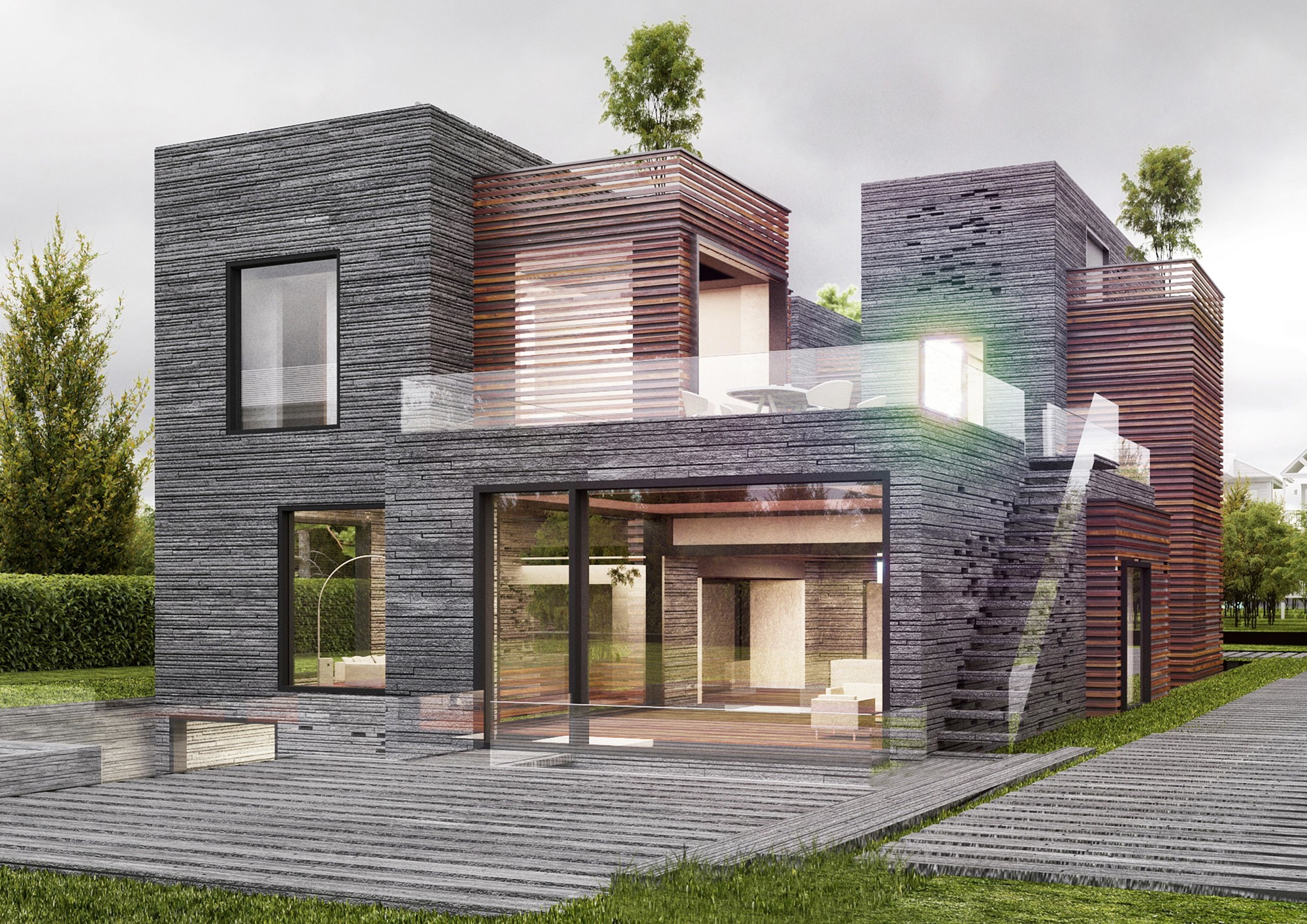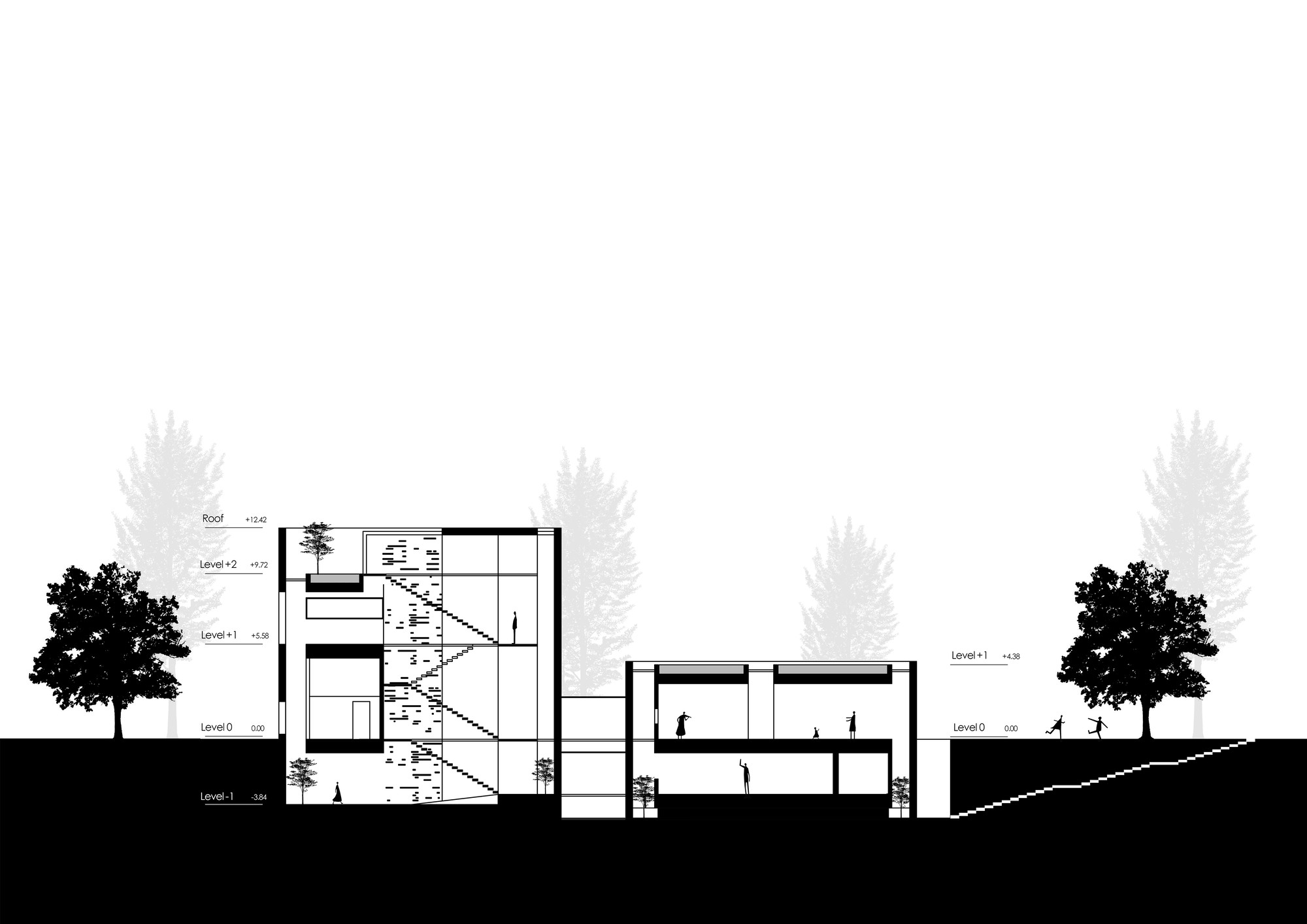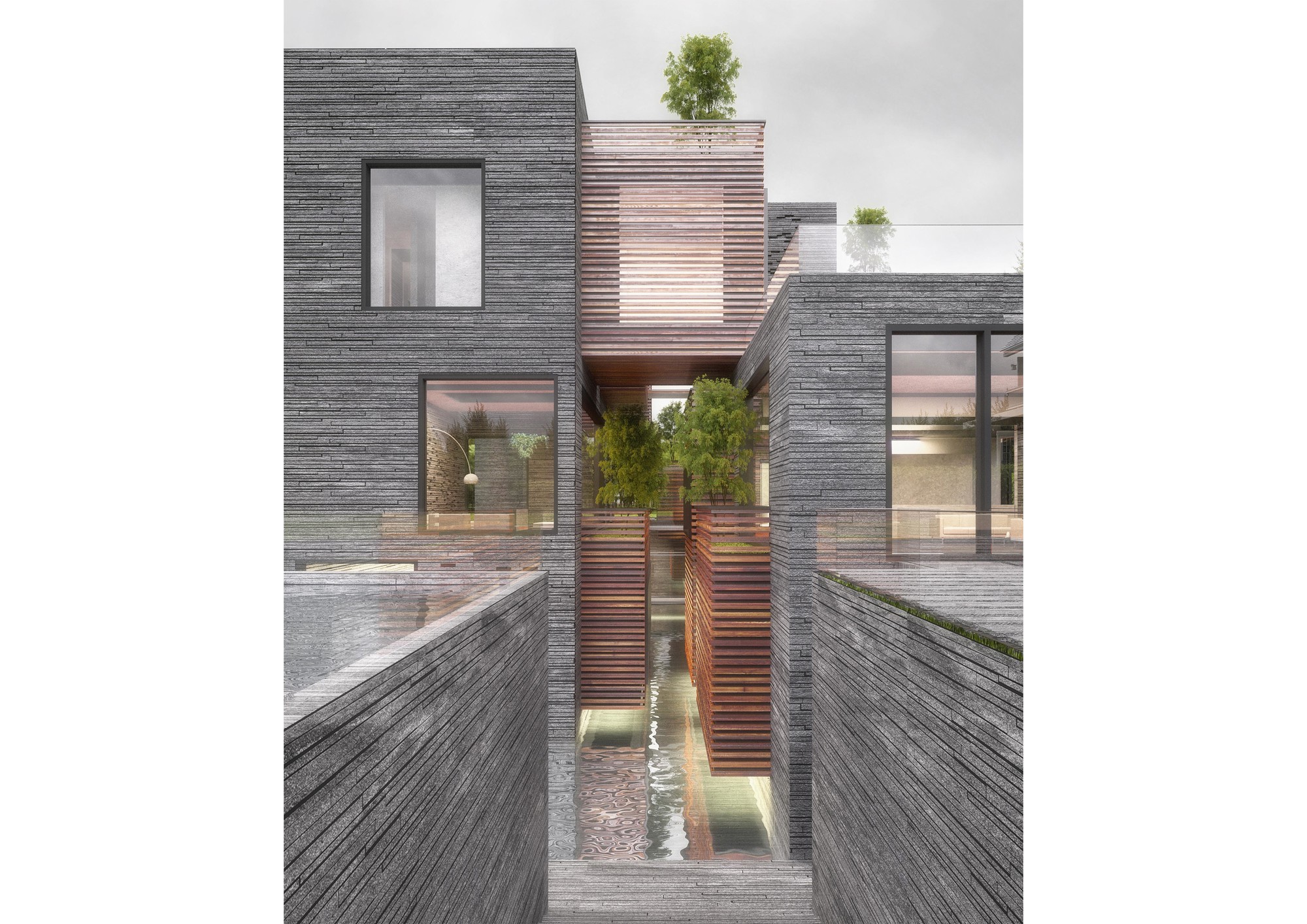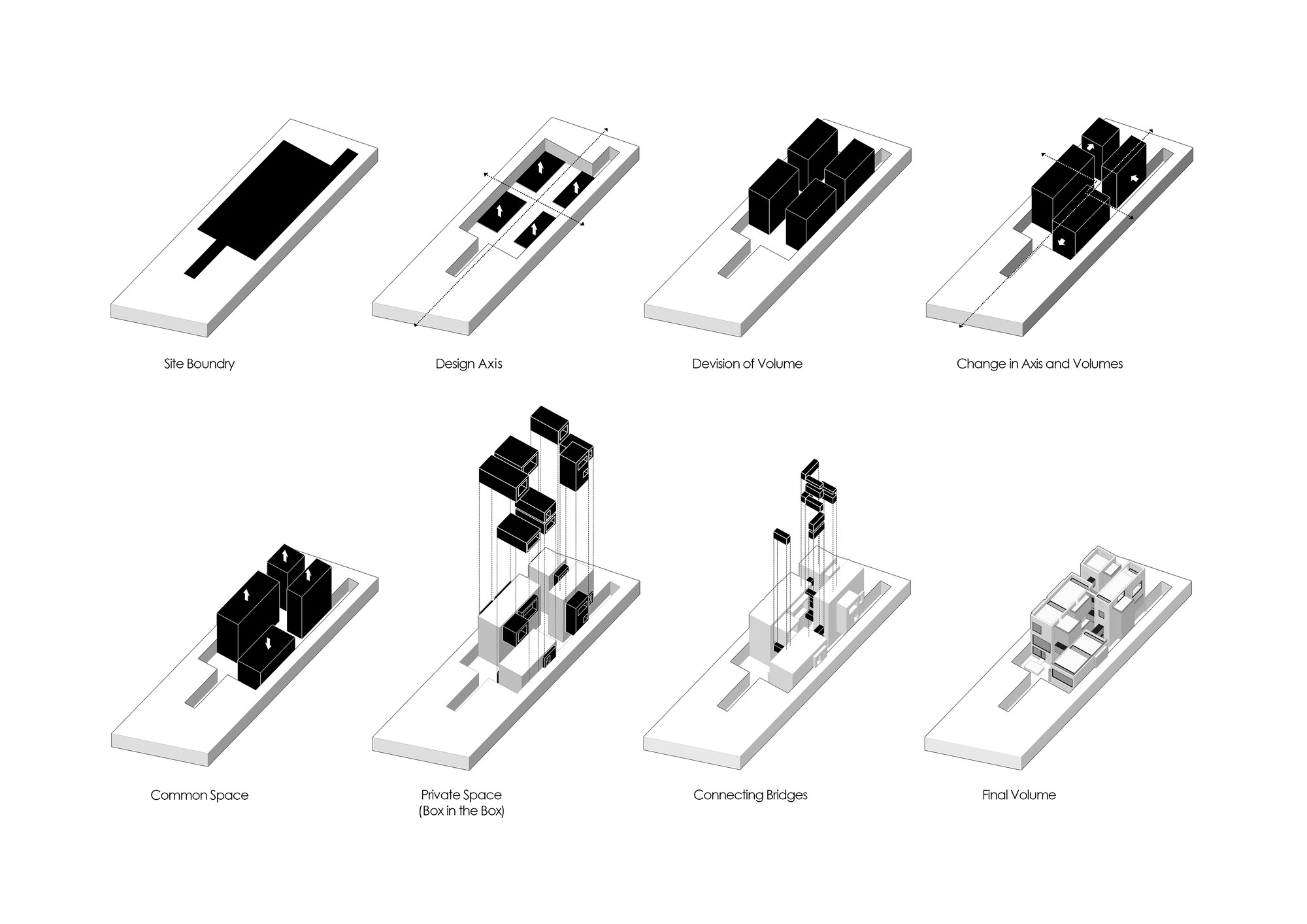 Designing a villa is a great opportunity for each architect to explore personal ideologies in architecture. In this project the investigations included combination of dual qualities such as: structure and the façade, private and public spaces, as well as open and closed spaces. This villa was part of a bigger project consisting of four villas in Lavasan, Iran. Therefore, it was decided to follow a singular strategy for all four villas, which was to use the “Three squares and four spaces” geometry. Four volumetric spaces were defined as the main structure and space organizer. These four volumes were shifted over each other to maximize view and integration with greenspaces. These volumes form the public spaces of the villa. In addition to the main volumes, there are some cubical boxes floating inside the spaces, defining the private spaces of the house. The main volumes include openings on the surface to create connection to the exterior greenspaces. This villa was designed on three levels, basement, ground floor, as well as first floor. Different levels of the building were organized to have maximum connection to each other. On the basement level, there is an in-ground garden with a water pool with visual connection to the interior space of the house. Moreover, at the ground and first floors, there is a volumetric connection between the public, the private, and the landscape of the project. Here the organization of the interior and the exterior was established by the surface openings and the created spaces in between the volumes.