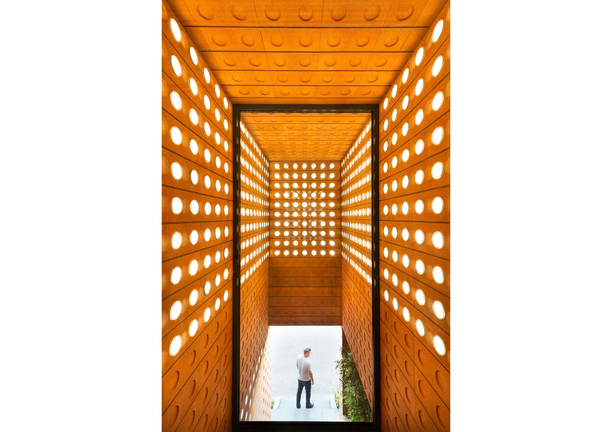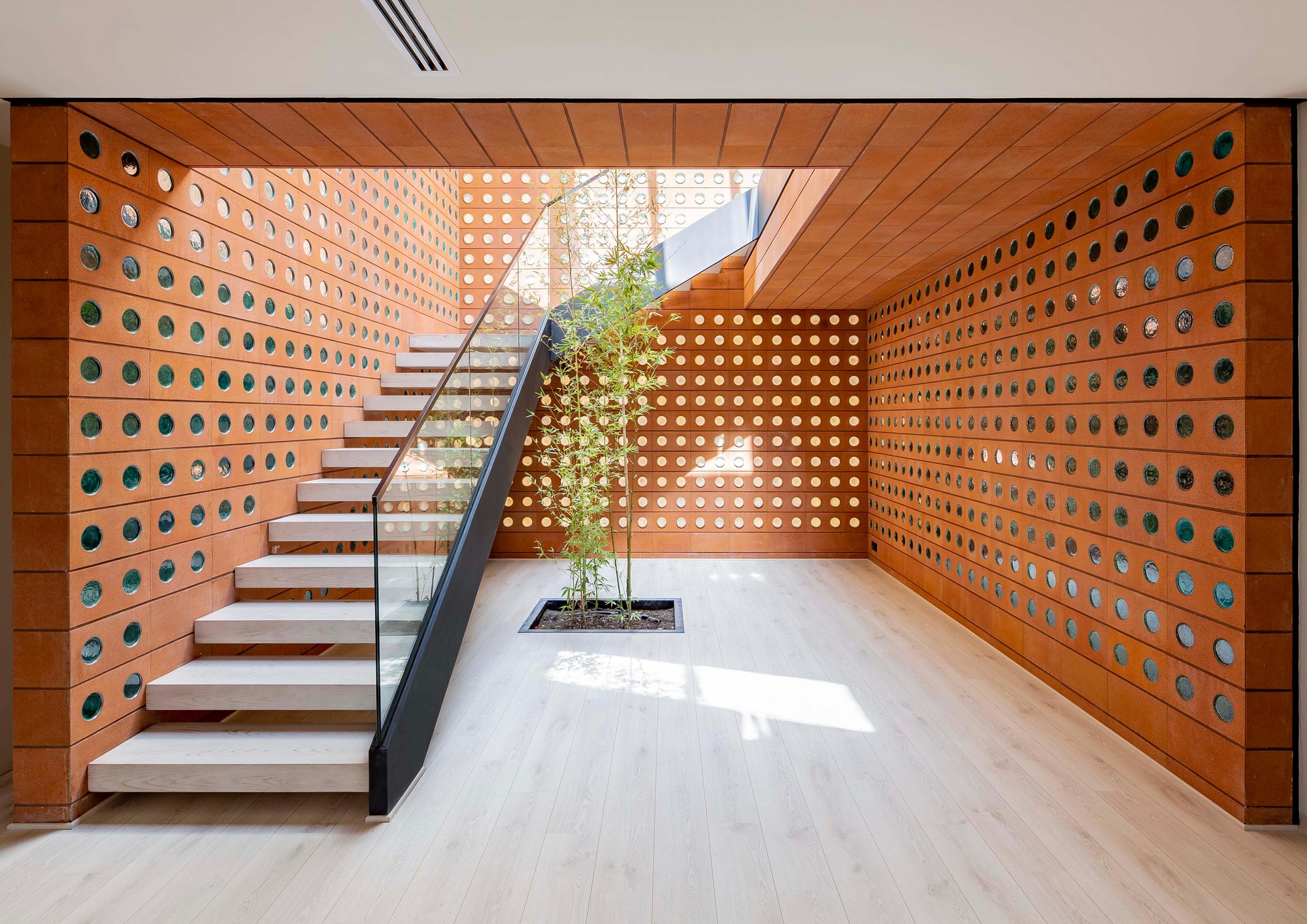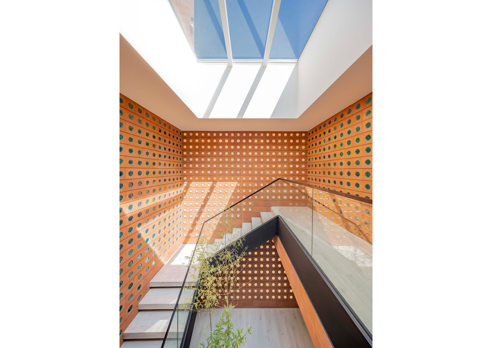 Is it possible to unify the urban scenery by minimizing the formic expression of buildings as singular objects and emphasizing on the city as a whole? Unitizing different elements of the building including walls, windows, doors, etc., as well as reducing the variety of building materials could somehow address the so called issues. The project was designed as the headquarters for Kohan Ceram Brick Manufacturing Company. Preserving the existing concrete structure, it was decided to Design a special brick (by architect) to represent the factory. Now the question is, could this well-known building material move beyond its simple role and help changing the perceptions towards a complicated building and to combine different building elements to reach a new phenomenon? How could we reduce the visual disturbance in the urban scenery by introducing weak forms as building objects? The story of Kohan Ceram building was started when a new modular creature was formed called the “Spectacled Brick”. This little guy had transparency and solidity in one piece and could see the city from within. It worked as the masonry, the finishing, and the insulation at the same time but still wanted to be more than that. The Spectacled Brick not only formed the exterior façade, but also transformed from a surface into a volume which extended into the building in the form of modular greenspaces. Replacing ordinary walls and windows, these modules defined different spaces in the building. Therefore, the interior walls were formed by the extension of the exterior walls, following the main design criteria which was to merge dual qualities. Bringing the natural lighting inside spaces in a mysterious way, the Spectacled Brick delayed the perceptions towards the building. It made the building both introverted and extroverted during day and night. It strictly banned other materials to take part in the making of the building and always kept loyal to its geometry. Penetration was the favorite notion for the Spectacled Brick. Making use of its semi-transparent nature, it merged the exterior with the interior to fade the boundary between the two. The spectacled brick was aware of the ventilation and light exposure benefits caused by the penetration of exterior to interior and used this technique to organize spaces inside the building. The spectacled brick integrated building qualities such as interior and exterior, introversion and extroversion, façade and space, transparency and solidity, natural and artificial lighting, to create a new phenomenon which not only carries features form both components, but also introduces new values to the system. Therefore, design challenges were resolved by merging these dual components into unique elements. It also used this homogeneity to address the programmatic requirement of the project which included both commercial and residential spaces. It tried to expand the commercial aspect of the brick showroom to the exterior and eventually to the city. Therefore, the transitional role of the building as a complex of spaces in the building scale and a commercial object in the urban scale was formed. Net Zero Operation CarbonRadiation and solar heat gain is controlled by a passive system, using operable brick louvers. Users can control daylighting and temperature by adjusting the shades. With a 60cm gap from the first layer, the second layer of the façade contains the main window openings for natural ventilation. This system significantly reduces building energy demand. The lighting system in this building is equipped with motion sensors. Moreover, the cooling/ heating system consists of ceiling fan coils with separate operational systems in each zone, equipped with sensors detecting the human presence to turn on or off. All of these systems have a great impact on reducing energy consumption in the building. Good Health and WellbeingIn some parts of the building the façade has been extended to the interior spaces, forming deep voids (up to 5m) inside the spaces to bring in natural light and ventilation. The air entering these voids gets filtered by the vegetation in the flower boxes along the void length to become fresh and less polluted. Approximately 70 m2 of total floor area of the building has been dedicated to greenspaces. These greenspaces significantly affect the quality of life by filtering and moistening the air in the dry and polluted climate of Tehran. On the south and west facades where sunlight exposure is higher than normal, the brick-glass modules capture the excess sun energy and allows an optimized amount of light and heat to enter the building. Statistics show that 67% of the total building area is within the Useful Daylight illuminance (UDI) range. The brick used in this project is recyclable, has minimum effect on the ecosystem, and is cheaper to maintain in the climatic condition of Tehran. Some of the interior spaces have been separated by glass partitions to create visual connection and to allow better sunlight penetration.