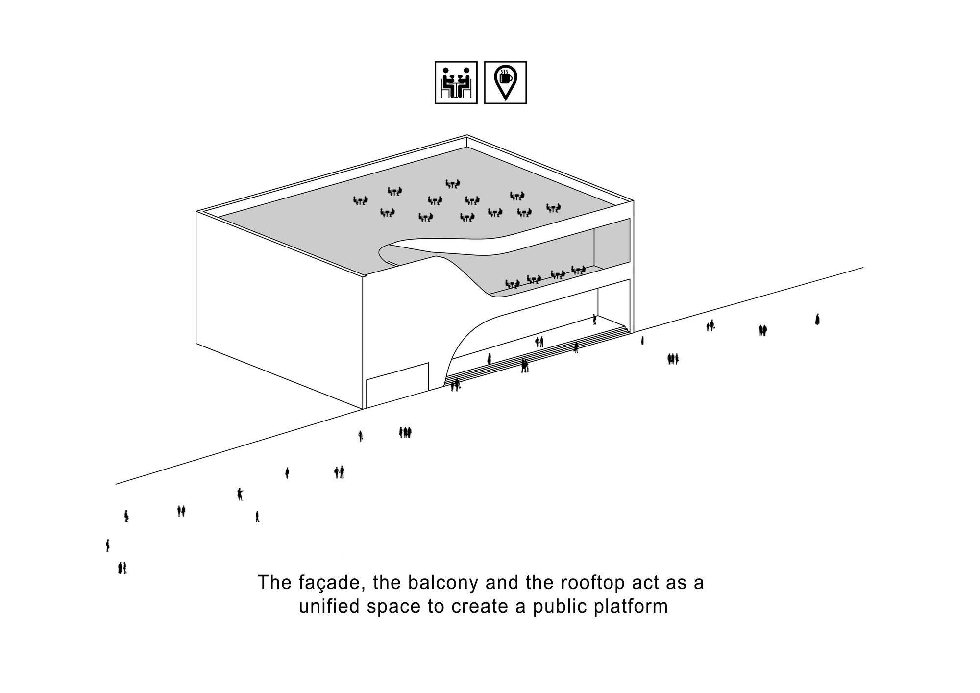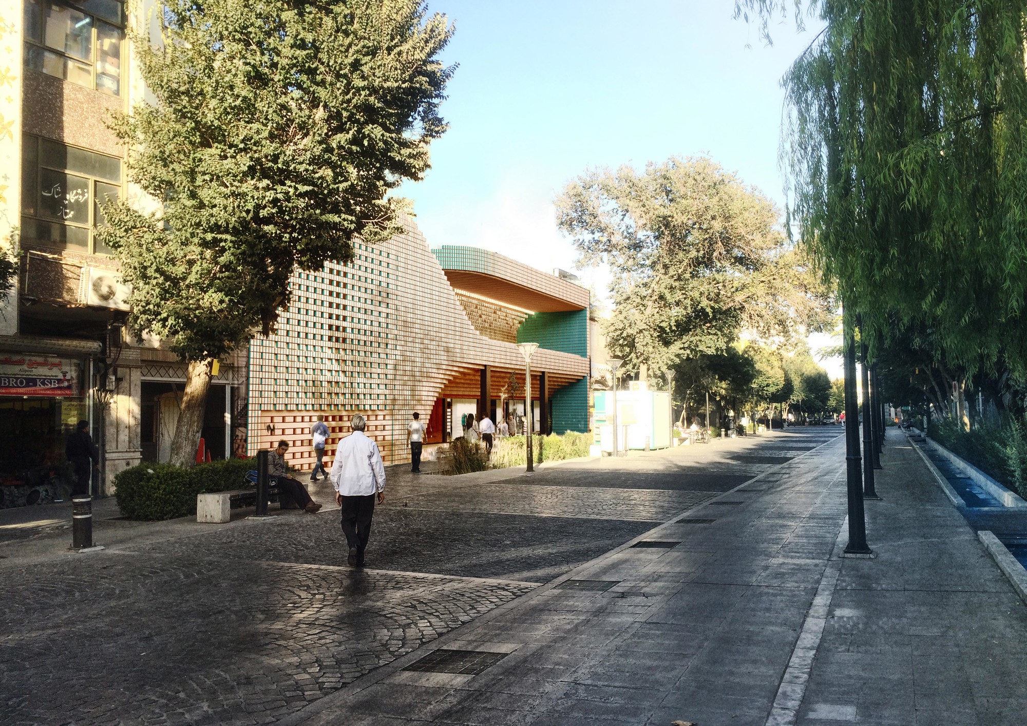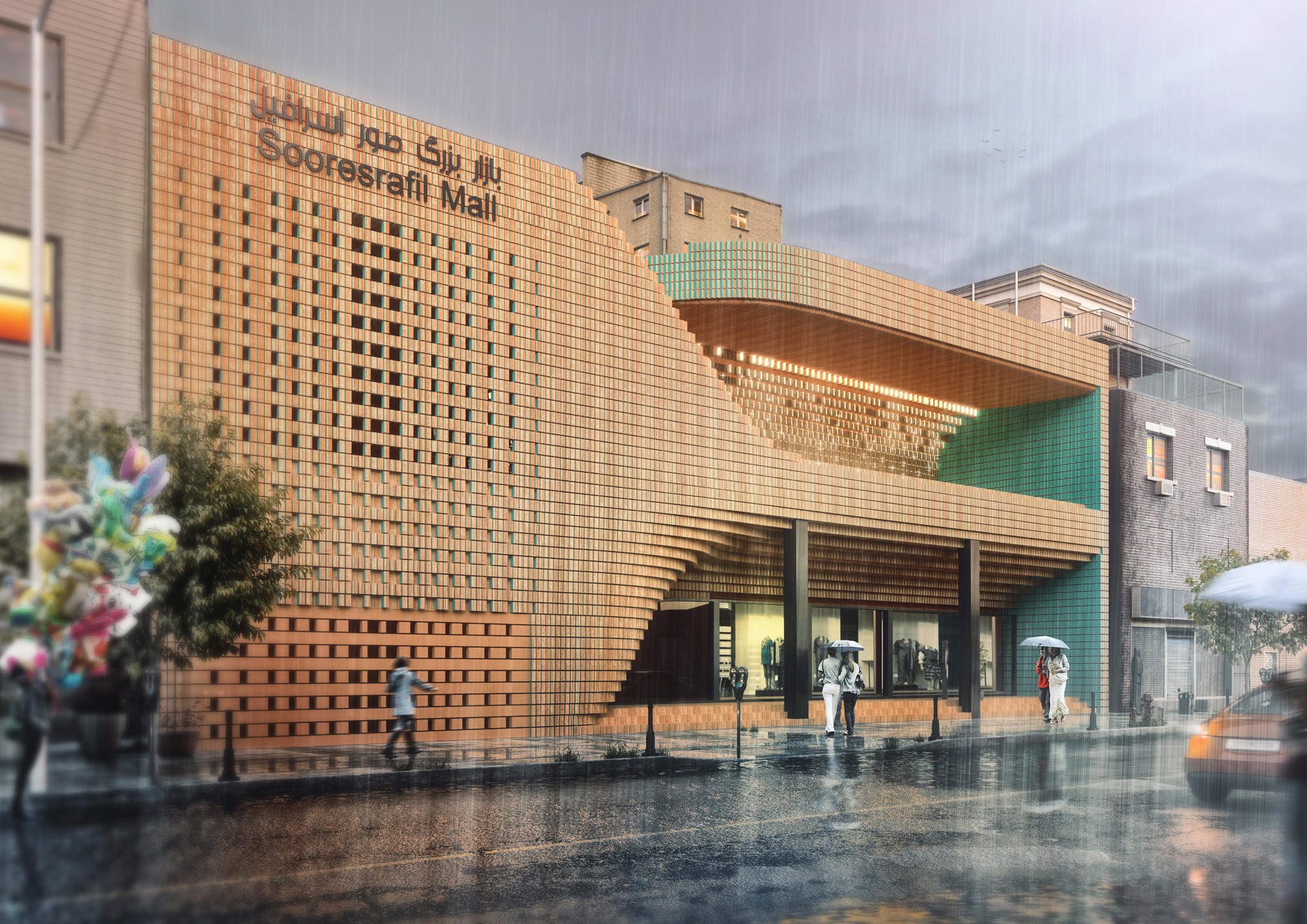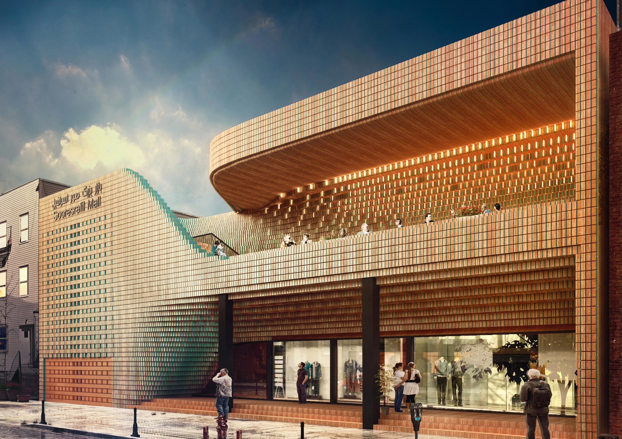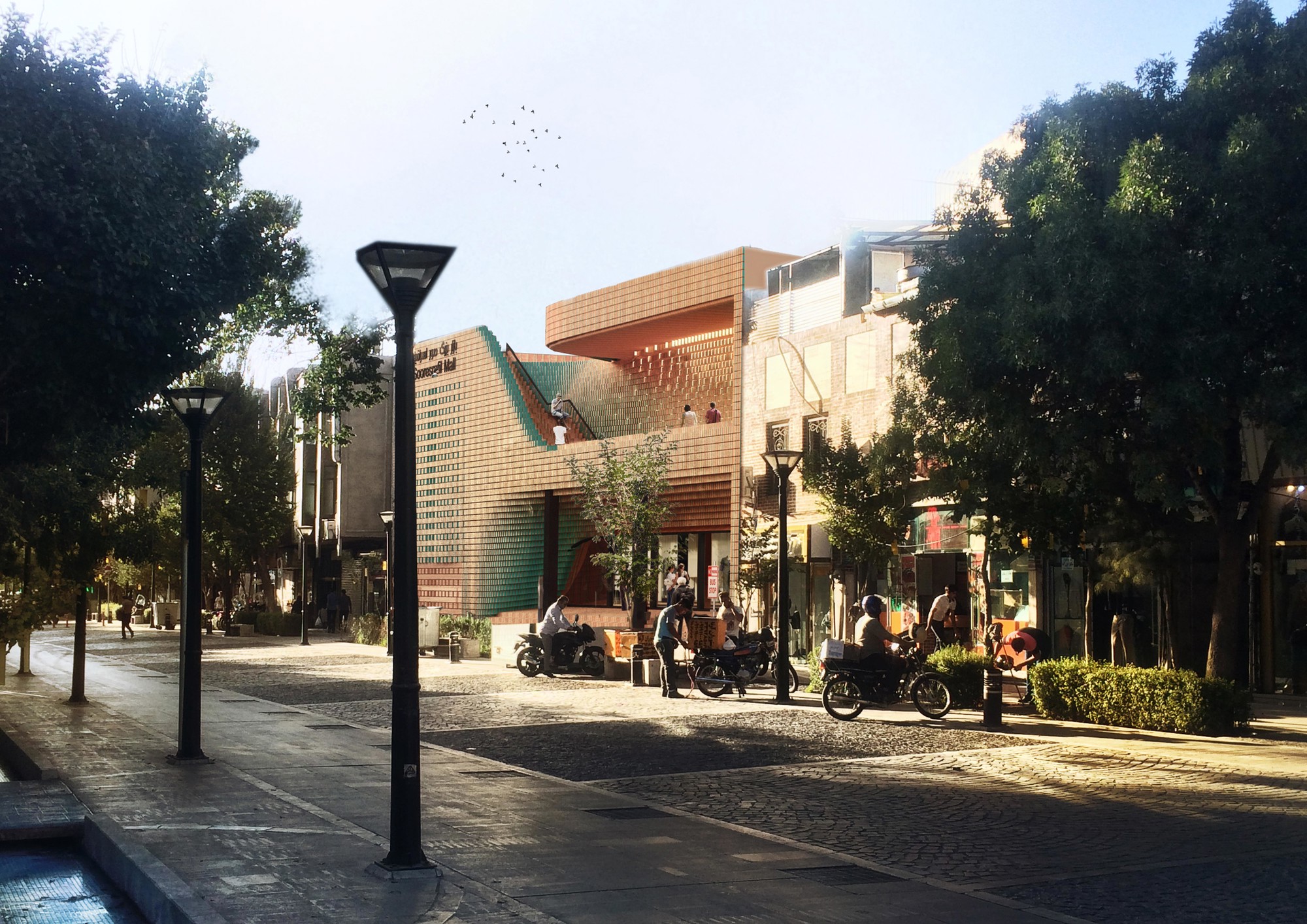 This project consisted of the façade retrofit of Sour Esrafil Shopping Centre in Tehran with the aim of revitalizing the performance of the center. The design idea was to move beyond creating a two dimensional façade and to create connection between the internal activities of the Shopping center and Sour Esrafill Road. Following this idea, a social platform was created in the form of a balcony on the façade. This balcony is a place for people to stay and hang out, and is accessible from inside the shopping center to boost the popularity of the commercial units. As part of the overall concept, the rooftop of the building was connected to the balcony as the continuation of the social platform. The brick and torques ceramics used in this project were selected based on the common materials used in the traditional fabric of the surrounding context.