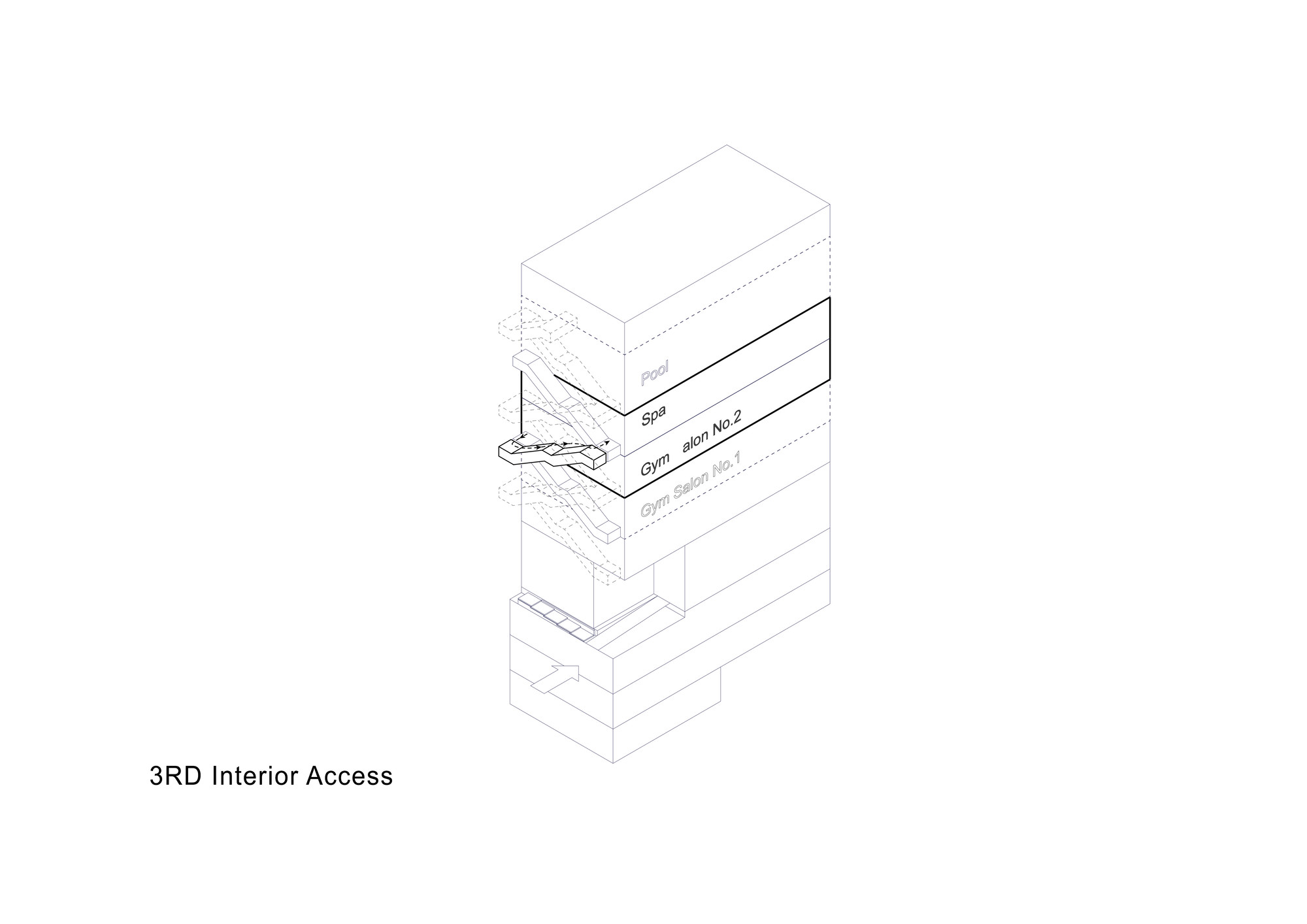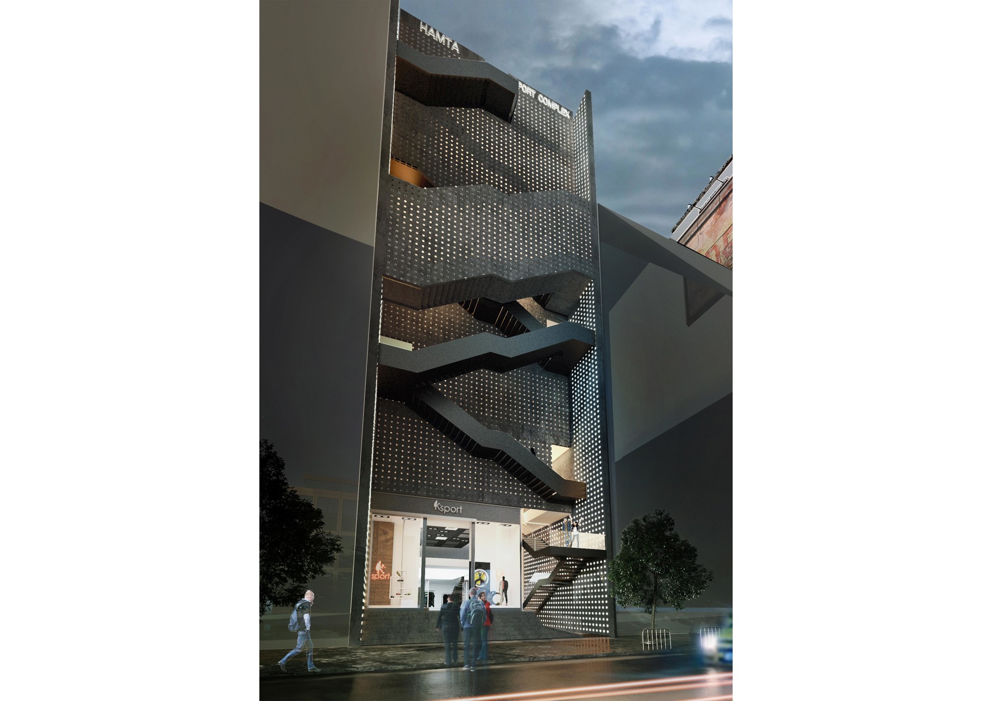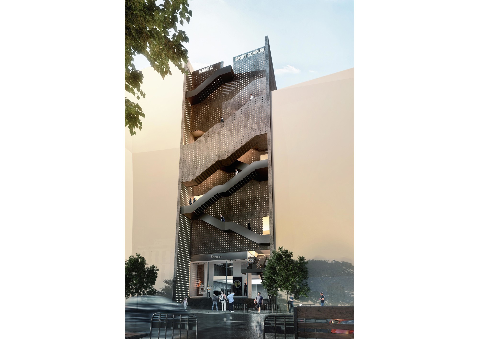 Hamta Sport Complex is located in Kaaj Boulevard in one of the commercial-office zones of Karaj. This complex includes a commercial unit as well as various sport fields. Taking into account the function of the building, it was important to provide natural lighting without creating overlook to the interior. The entire width of the site had to be used in order to meet the standard requirements of sport fields.Two sets of staircases had to be implemented throughout the building, one as the main vertical circulation between the sport fields and the other as the emergency exit which connects the roof top to the ground floor. During the design process, it was decided to combine these two staircases to form two interwoven rings on the façade, leaving the entire width of the building available for the sport fields. These two rings function separately without interference. Movement of people and south sunlight on the three flat layers created by this system was inspired by the traditional Persian miniature painting. The façade layers are formed using traditional handmade glasses implemented in the concrete shear walls of the structure. The semi-transparent surface of these layers improves the quality of the atmosphere by providing natural light and by reflecting the movements of people in other layers, without causing overlook to the sport fields. Skylights on the roof brings sunlight to the swimming pool area on the top floor. This light is then transferred to the lower floors through transparent layers at the bottom of the pool, connecting the water sport zone to the spa.