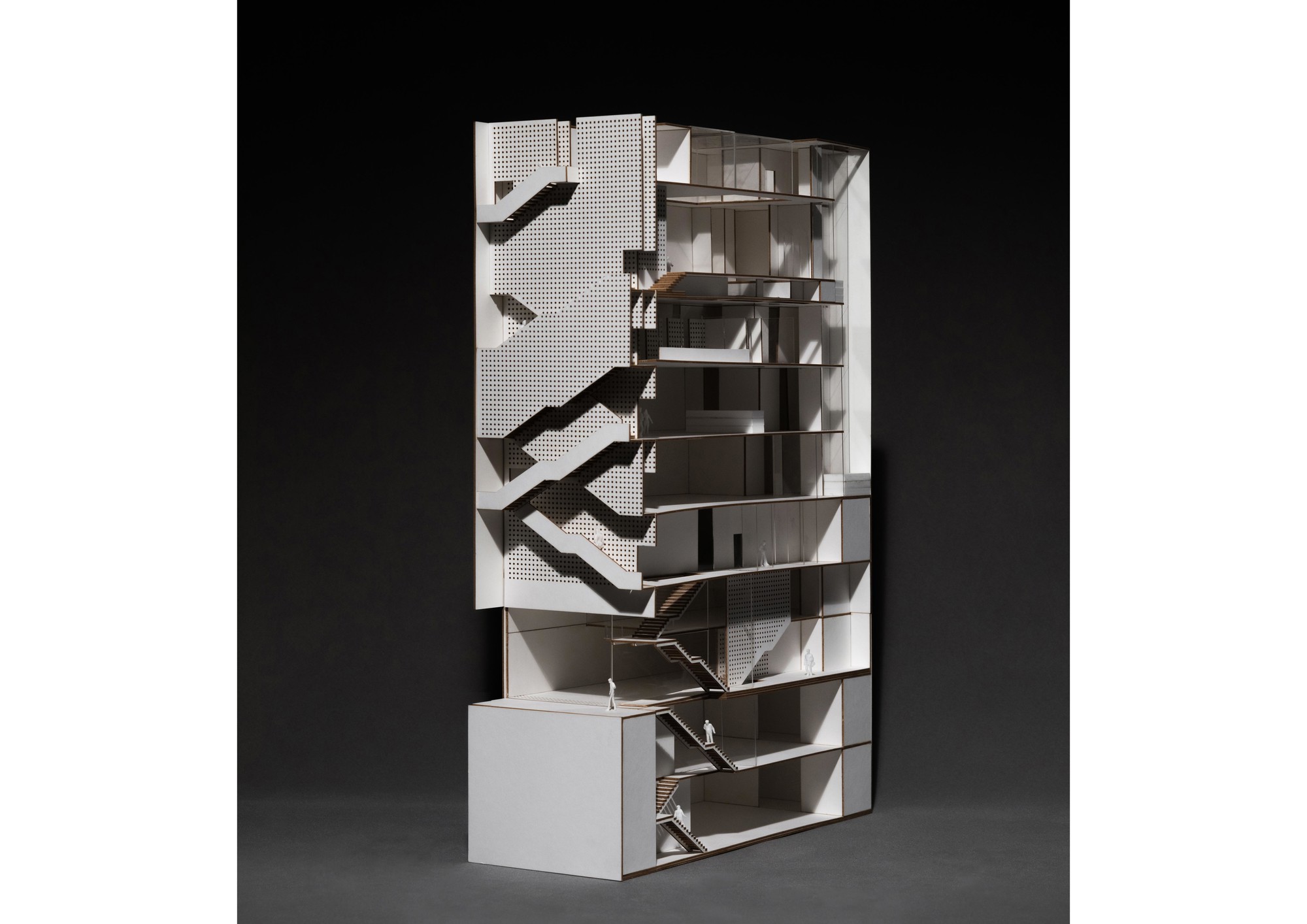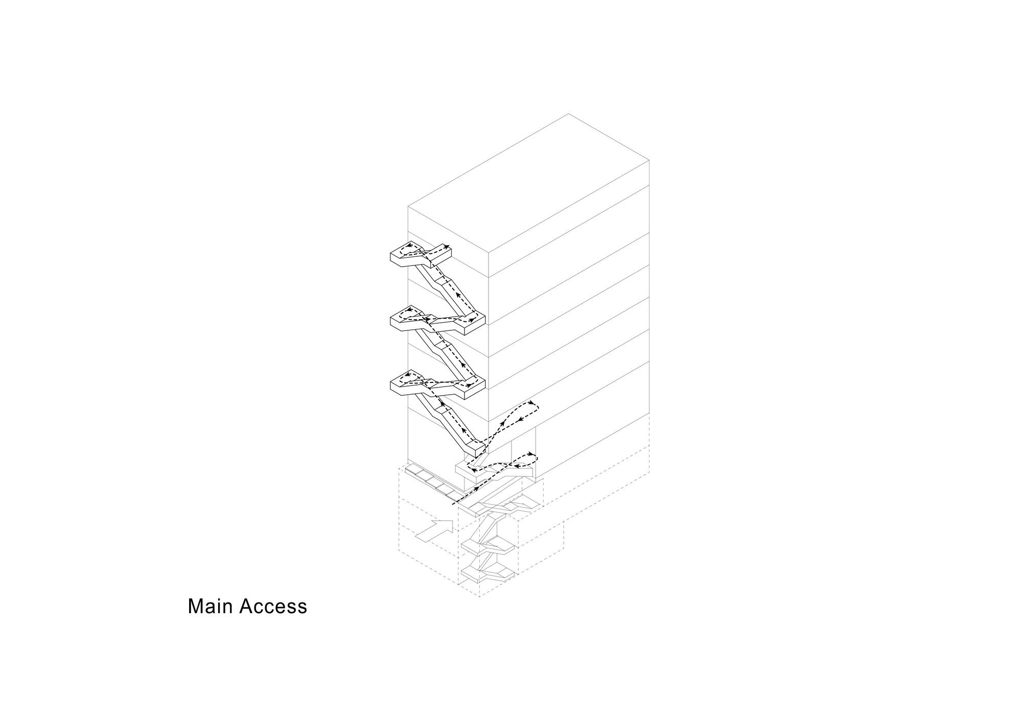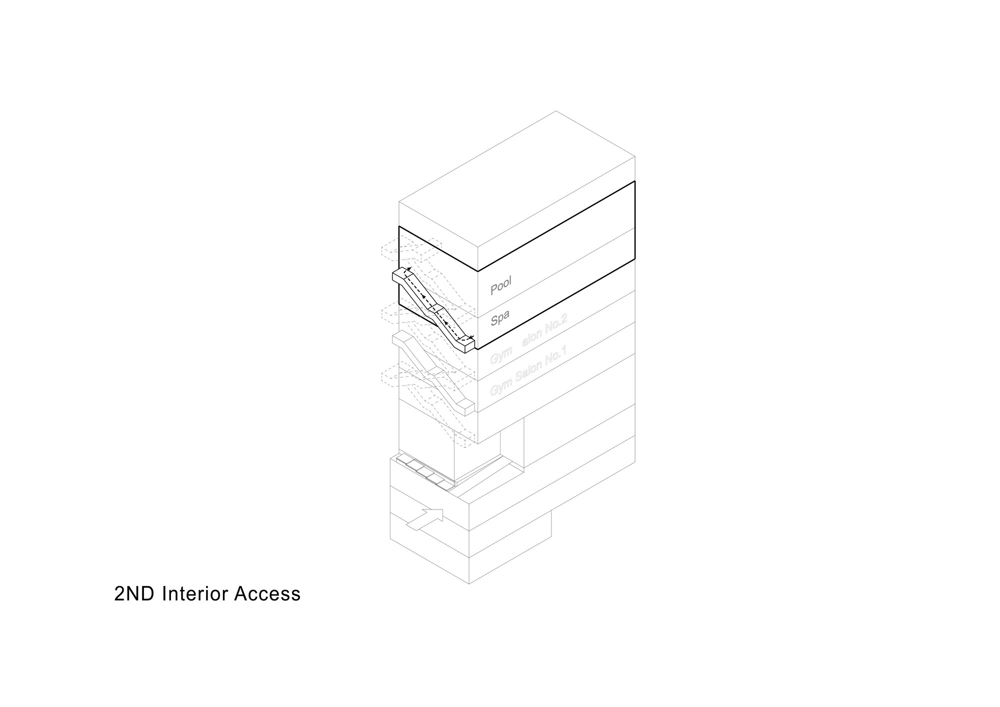 Hamta Sport Complex is located in Kaaj Boulevard in one of the commercial-office zones of Karaj. This complex includes a commercial unit as well as various sport fields. Taking into account the function of the building, it was important to provide natural lighting without creating overlook to the interior. The entire width of the site had to be used in order to meet the standard requirements of sport fields.Two sets of staircases had to be implemented throughout the building, one as the main vertical circulation between the sport fields and the other as the emergency exit which connects the roof top to the ground floor. During the design process, it was decided to combine these two staircases to form two interwoven rings on the façade, leaving the entire width of the building available for the sport fields. These two rings function separately without interference. Movement of people and south sunlight on the three flat layers created by this system was inspired by the traditional Persian miniature painting. The façade layers are formed using traditional handmade glasses implemented in the concrete shear walls of the structure. The semi-transparent surface of these layers improves the quality of the atmosphere by providing natural light and by reflecting the movements of people in other layers, without causing overlook to the sport fields. Skylights on the roof brings sunlight to the swimming pool area on the top floor. This light is then transferred to the lower floors through transparent layers at the bottom of the pool, connecting the water sport zone to the spa.
