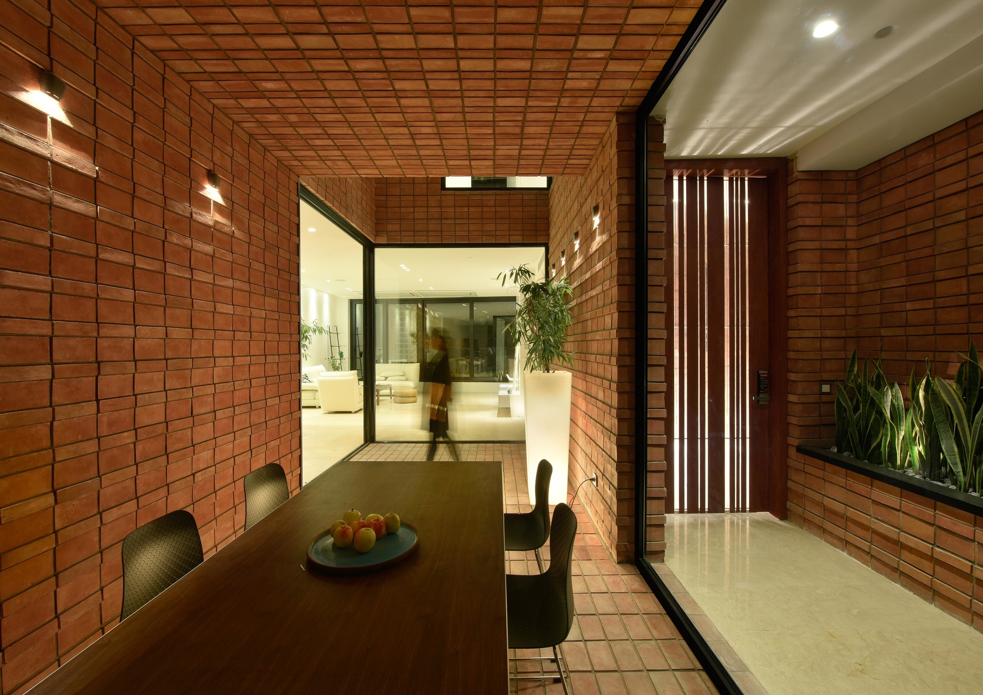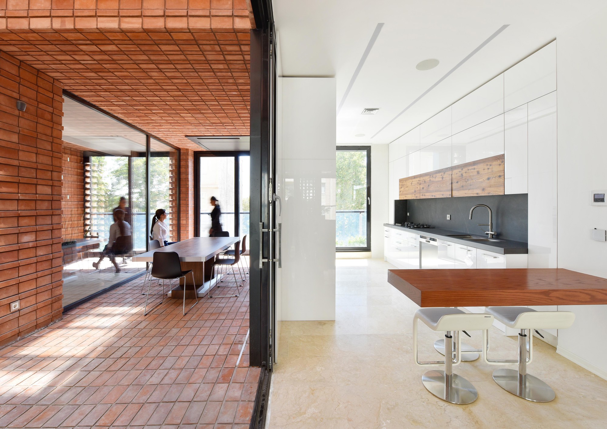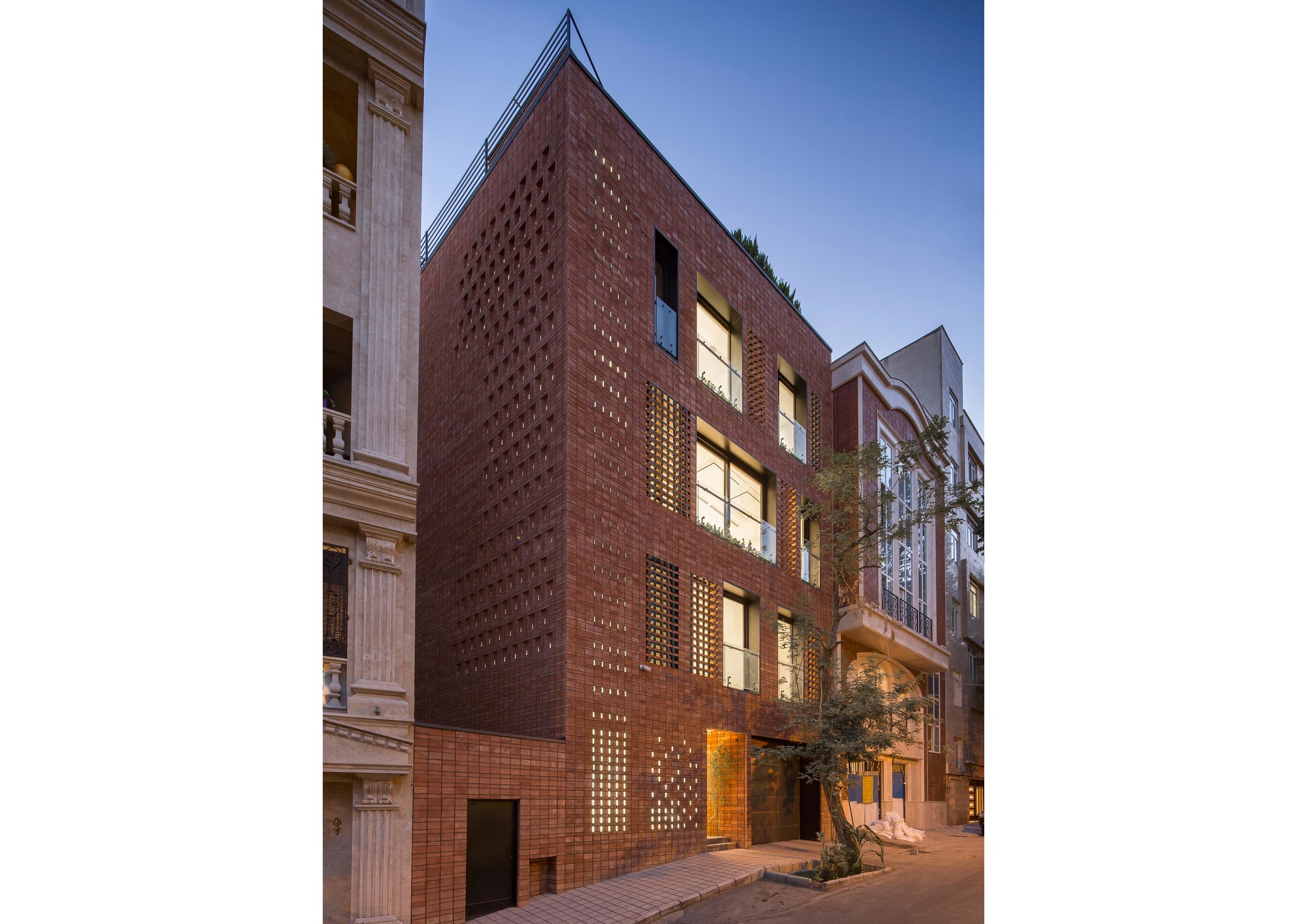 Ozgol Residential BuildingThe new urban development of Tehran in the recent decades has imposed alterations to the ratio of open and semi-open spaces to the closed spaces in residential units. These changes has enormously affected the lifestyle of Tehranians in the recent years to such and extend that smaller apartment units have minimum access to open or semi-open spaces. The research focus of this project was to explore the urgent need for new residential models in Tehran.Located in the Ozgol neighborhood of Tehran, the site of the project was a 10*22m plot, next to an unbuildable piece of land. Therefore, the building could have facades on three sides (North, South, and East). Consisting of a duplex (2nd and 3rd floors) and a guest unit (1st floor), the three storey residential building was designed for a single family.The aim of the project was to transform the common “Infill” residential typology by extending open and semi-open spaces into the building. Providing natural ventilation and lighting as well as maximizing the engagement of green spaces with different functions of the house were all considered during the design process.The narrow width of the site imposed restrictions on the interior planning. These restrictions motivated the design team to rethink the typology of the vertical circulation through the building and to rearrange it into a longitudinal semi-open staircase along one side of the building. This staircase connects the backyard to the open-to-sky void on the front side of the building, providing fresh air circulation in every floor. This space acts as a corridor, providing visual connection between the backyard, the sky, and the city.Another important design element was to provide functional flexibility to the main balcony in relation to the exterior and the interior. This was achieved by creating a space that could be transformed to open, semi open, and closed spaces in different weather conditions.During the winter, this space becomes a part of the enclosed interior. During the summer, on the other hand, it could become a semi open balcony. This space is covered by an automated operable roof on top and is separated from the exterior and the interior of the building through operable glass openings.Spatial Organization:The width of the building was divided into 3 sections, organizing the interior spaces. The semi open balcony is located in the middle division in both plan and section, and all the vertical circulations are placed in one division to optimize space utilization throughout the building.Material Palette:Traditional Brick was used both as the base and as the finishing of the exterior facades, the circulation corridors, as well as the voids throughout the building. Rotated brick blocks were implemented on some parts of the façade to allow sunlight penetration and view to the exterior, while minimizing overlook to the building. Sunlight variations during the day creates a variety of light and shadow patterns. The intention here was to emphasize on the importance of sunlight variations during different seasons of the year.