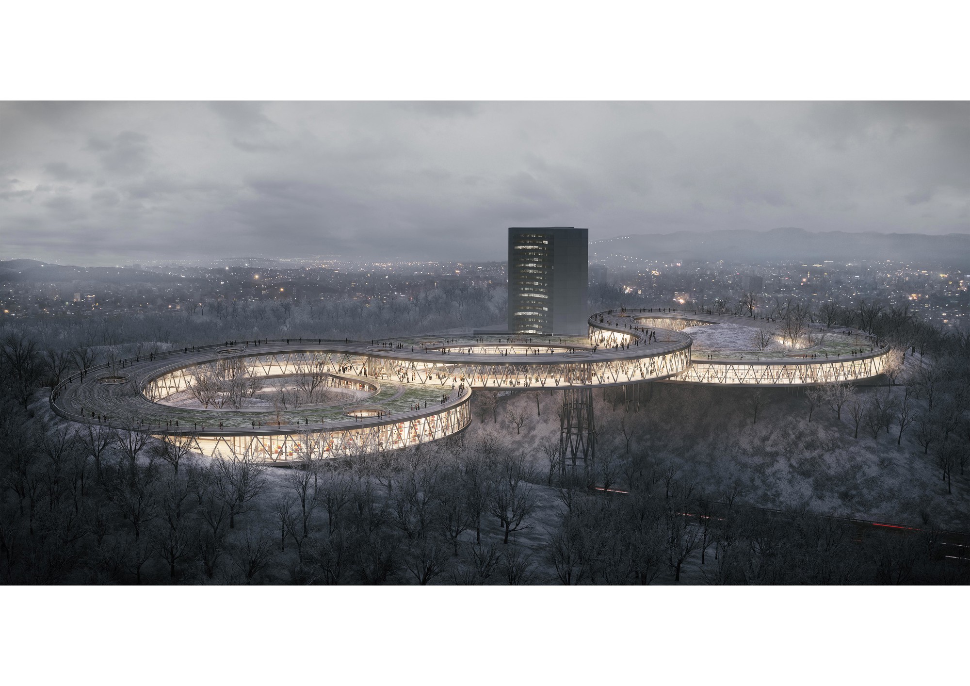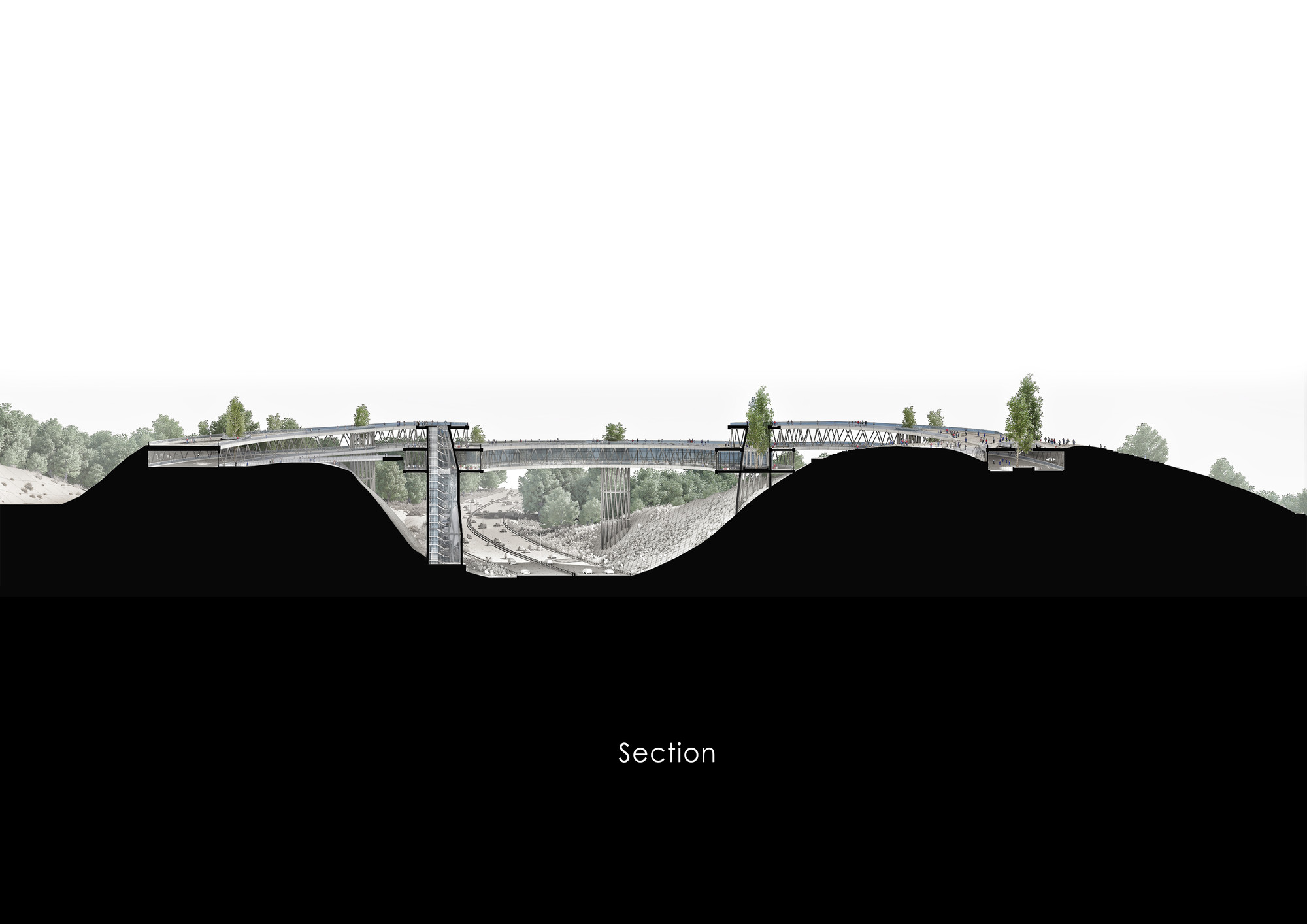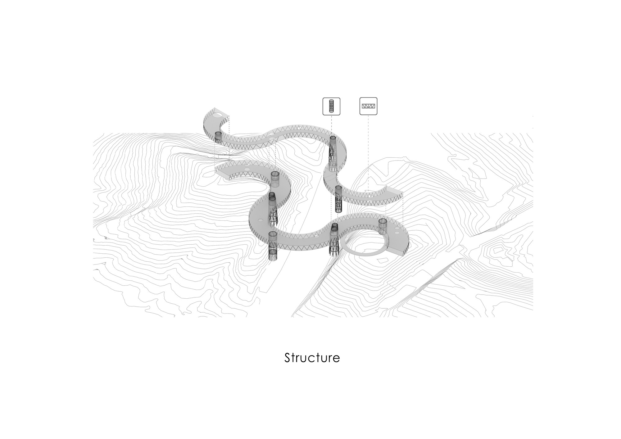 The El Goli Bridge addresses the challenge of creating an urban space in Tabriz that accommodates diverse activities across all seasons and weather conditions. The design integrates urban behaviors, functioning independently while fostering social and environmental interactions. The bridge serves as a multi-functional urban platform connecting two major tourist attractions in Tabriz. It is designed to support various activities, including: • Rest and relaxation • Movement and sports • Social interactions • Engagement with nature The design creates three interconnected layers, geometrically defined as interwoven loops that provide optimal views of the surrounding environment. The bridge offers three distinct spatial qualities: open, semi-enclosed, and enclosed—across its levels, supporting a variety of activities: 1. Open Levels: • Dedicated to activities like cycling, running, and outdoor sports. 2. Semi-Enclosed Levels: • Designed for social activities, walking, and sitting in open-air spaces, integrated with green areas at each segment. 3. Enclosed Levels: • Accommodates restaurants, cafés, and galleries with semi-open spaces, offering seating areas and social engagement zones. These spaces function independently yet remain interconnected, ensuring the project remains lively and active during different times and weather conditions. Structural Design: The bridge employs tubular columns, connected to horizontal truss systems. These tubular elements also house escape stairs and elevators, optimizing space usage and functionality. The tubular columns are strategically positioned to minimize the number of supports, ensuring structural efficiency while maintaining visual and spatial openness. The El Goli Bridge is not just a connection but a vibrant urban destination, enabling continuous activity, interaction, and engagement with the environment, while adapting to the unique climate and urban context of Tabriz.