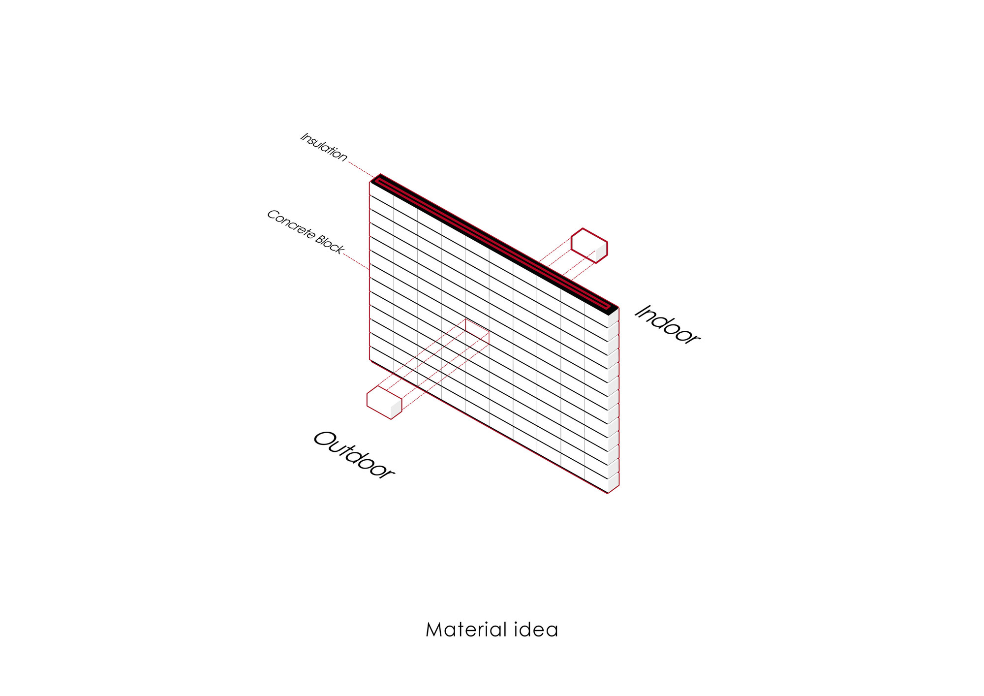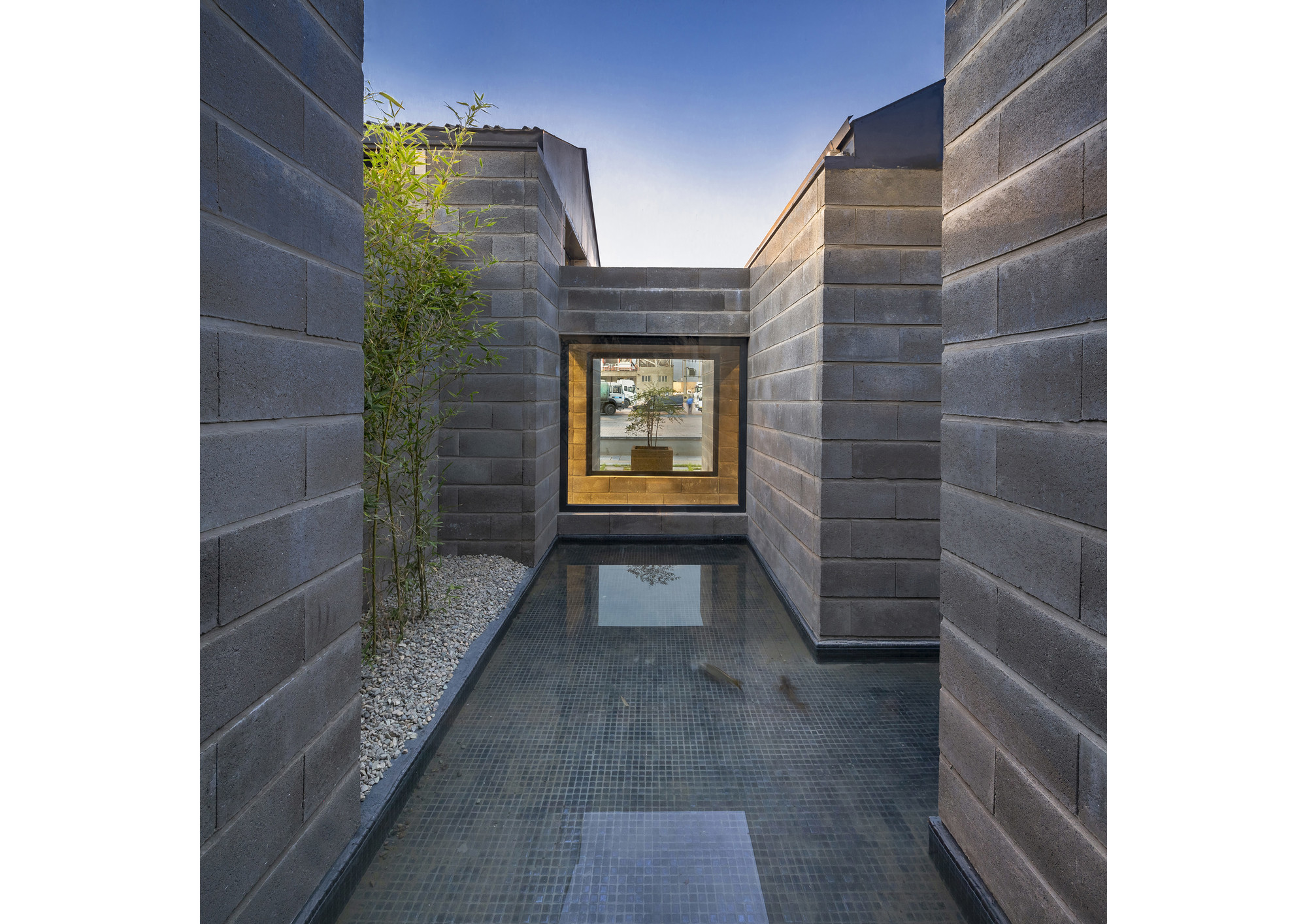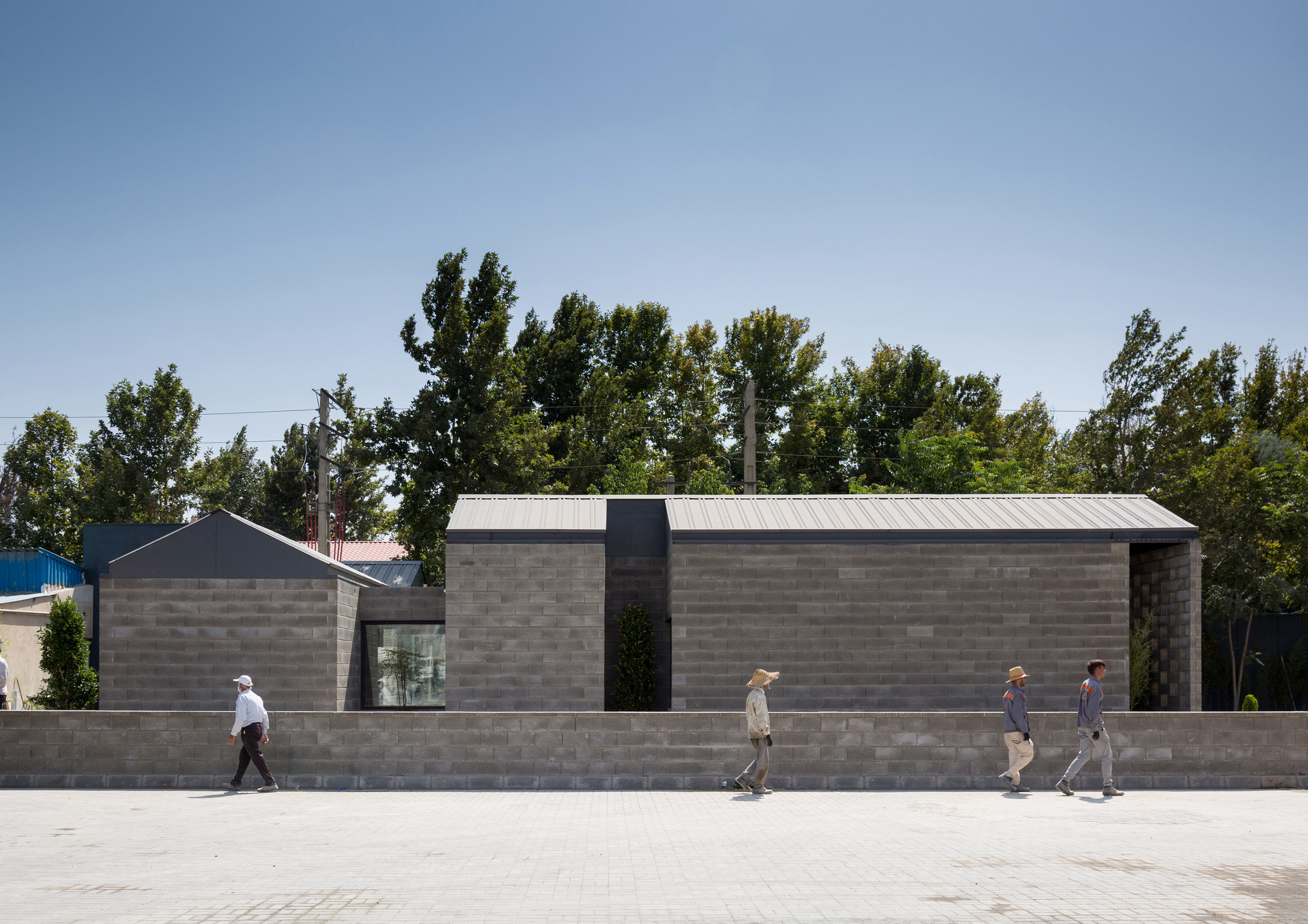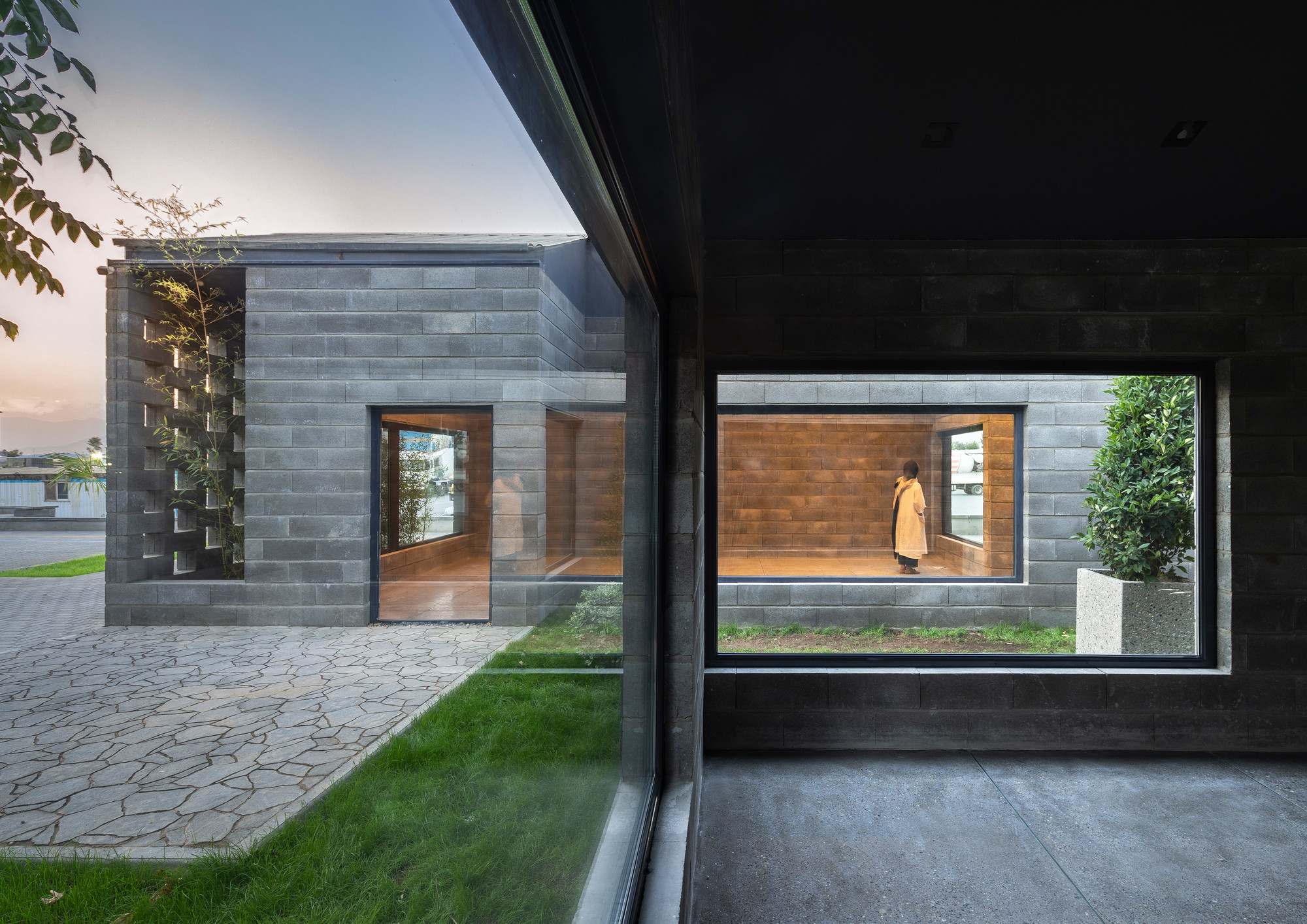 The project brief consisted of an indoor-outdoor showroom, as well as administrative department of Aptus Concrete Block Manufacturing Factory in the suburbs of Karaj. The design process was initiated by considering the everlasting battle between different construction typologies in the suburbs; mainly industrial, agricultural, and inferior residential fabrics. The winner of such combat is usually the low-grade residential development and the losers are landscapes and agricultural fields which are demolished to be replaced by dense and low quality buildings. The design criteria was to create a win-win pattern between greenery and the built environment. Another issue regarding outskirt developments is to provide cost efficient construction solutions which are also aligned with the latest standards. Considering the urge for cost efficiency, it was decided to eliminate finishing layers on the entire interior and exterior of the building and to use company’s concrete blocks as the single material forming the entirety of the building envelope. Based on the initial design criteria, the created building volume forms the exterior and the interior landscape at the same time. Instead of creating a huge “box” surrounded by greenery, it was decided to break the volume into smaller boxes which are independent and characterized based on their function. The created voids between the boxes form greenspaces penetrating into the building. A layered relationship between interior and exterior was formed through transparencies between the boxes. Limiting building materials to a single block enhances the perception of the exterior atmosphere and creates a varying quality of natural light during the day. There are a number of other concrete block manufacturers in the neighborhood of Aptus factory. This project could define a simple pattern for this urban fabric which is not only cost efficient, but also enhances the relationship between the built environment and the greenspace.