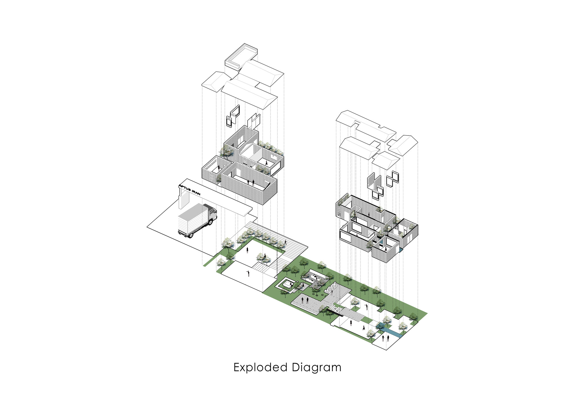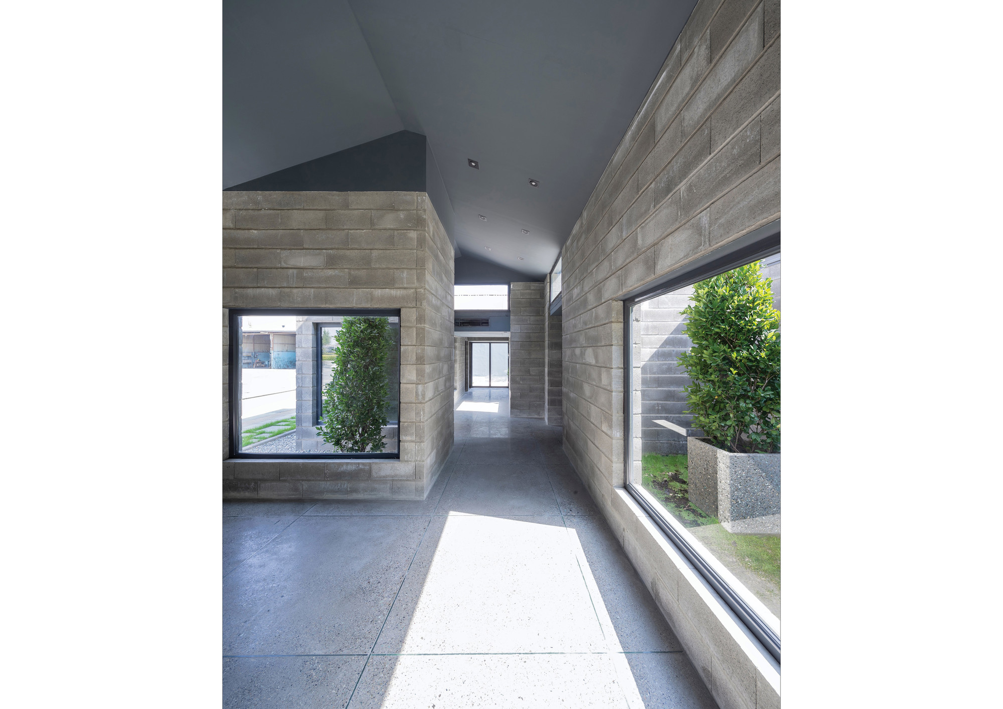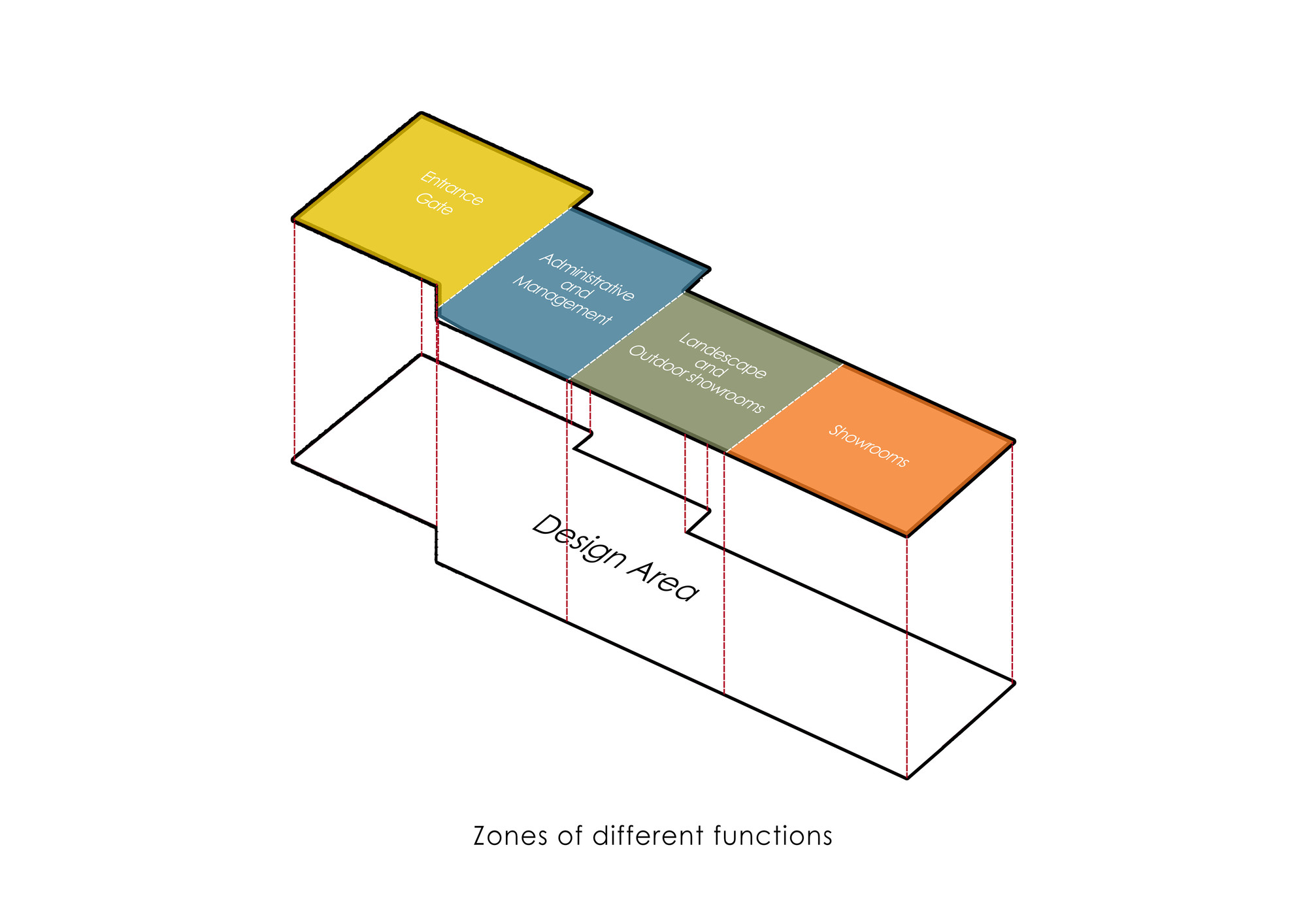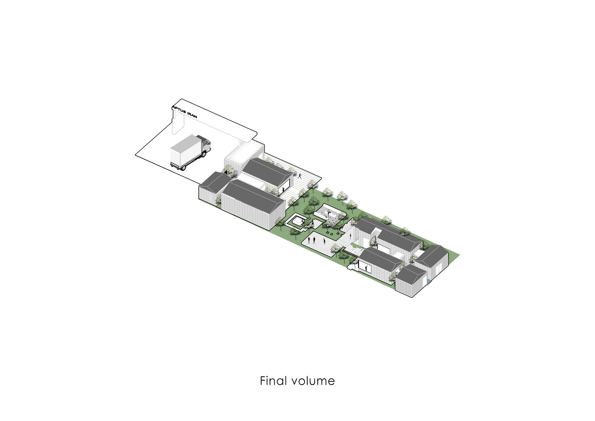 The project brief consisted of an indoor-outdoor showroom, as well as administrative department of Aptus Concrete Block Manufacturing Factory in the suburbs of Karaj. The design process was initiated by considering the everlasting battle between different construction typologies in the suburbs; mainly industrial, agricultural, and inferior residential fabrics. The winner of such combat is usually the low-grade residential development and the losers are landscapes and agricultural fields which are demolished to be replaced by dense and low quality buildings. The design criteria was to create a win-win pattern between greenery and the built environment. Another issue regarding outskirt developments is to provide cost efficient construction solutions which are also aligned with the latest standards. Considering the urge for cost efficiency, it was decided to eliminate finishing layers on the entire interior and exterior of the building and to use company’s concrete blocks as the single material forming the entirety of the building envelope. Based on the initial design criteria, the created building volume forms the exterior and the interior landscape at the same time. Instead of creating a huge “box” surrounded by greenery, it was decided to break the volume into smaller boxes which are independent and characterized based on their function. The created voids between the boxes form greenspaces penetrating into the building. A layered relationship between interior and exterior was formed through transparencies between the boxes. Limiting building materials to a single block enhances the perception of the exterior atmosphere and creates a varying quality of natural light during the day. There are a number of other concrete block manufacturers in the neighborhood of Aptus factory. This project could define a simple pattern for this urban fabric which is not only cost efficient, but also enhances the relationship between the built environment and the greenspace.