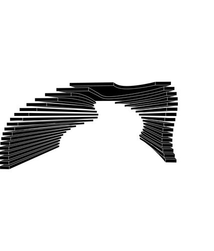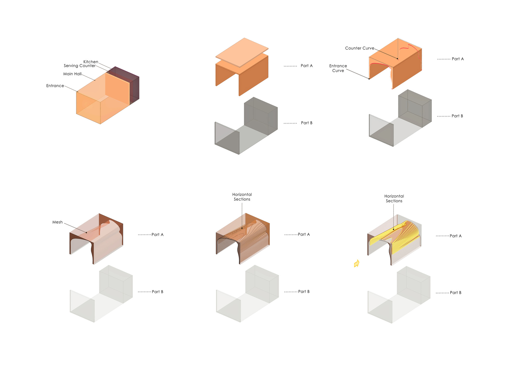 Coffee shop culture is an emerging trend among young Iranians. Most of the youth consider at least one or two of these places as their favourite cozy and comfortable corner to escape from the chaotic city life. With an area of 52 m2, the site of this project was located at the second floor of a two storey shopping mall in Tehran. The primary concern of the client was to have a unique design while keeping the cost at a reasonable range. Having that in mind, the design attempt was to create a distinct character for the coffee shop through a simple and consistent design. Design Criteria: • The primary challenge here was to control the amount of reverberation in the limited volume of the space (4.5m in Height). • The second consideration was to create a dynamic space which provides the customers with a unique experience in every perspective. • Another important design factor was to preserve uniformity in design and to create an integrated space in terms of form and material. • Finally, it was essential to keep the construction process simple and easy to conduct and to choose reasonably priced and easily available construction materials. In terms of function, the project could be divided into two main parts, the kitchen and the main hall. In terms of the architectural elements, on the other hand, the two categories are: A. The north-south wall, and the ceiling B. The east-west wall, the back wall, the entrance, and the flooring In part A, the intention was to integrate the walls, the ceiling, and the lighting system into a consistent form created by the morphing of two curves. The resulting 3-Dimensional surface was then transformed into cross sectional layers. This transition not only makes the implementation easier, but also increases the noise absorption by multiplying the surface area. LED strip lights were then implemented within the layers, creating a calming indirect lighting for the dining area. In order to reduce the construction cost, all the cross sections were plotted one to one. The aluminum frames were then bended accordingly, covered with a layer of plaster, and coated with acrylic paint. The final cost of the material and the construction of the ceiling and wall layers turned out much less than most of the common construction methods. For part B the material selection was limited to the dark brown wood and leather used to form most of the interior elements including the entrance wall, the floor, the furniture, the counter, and the kitchen area. The shape of the entrance and the counter wall was formed by the two curves of part A. Parts A and B complement each other to form the cubical space of the project. The material and color palettes were kept simple to better highlight the main idea and the lighting quality of the project.