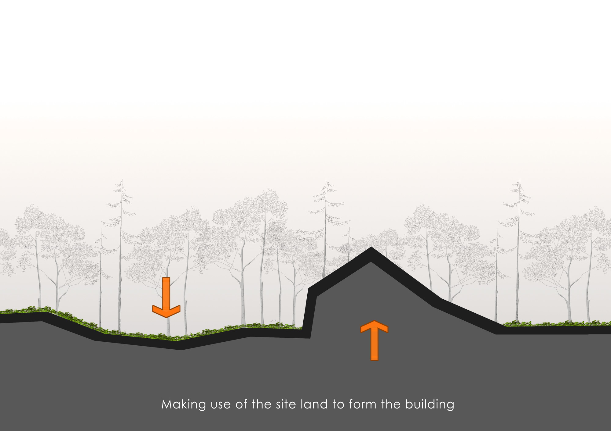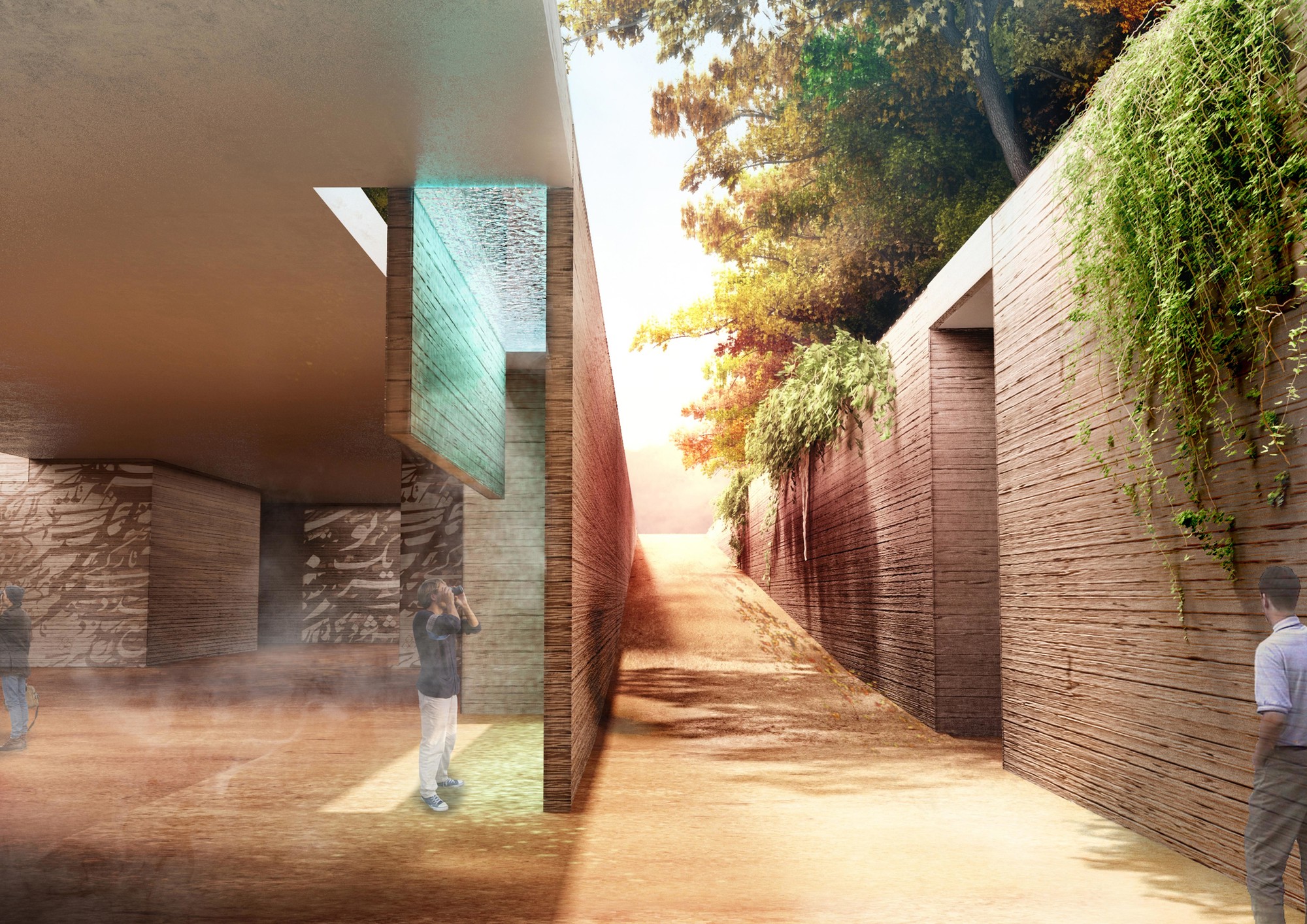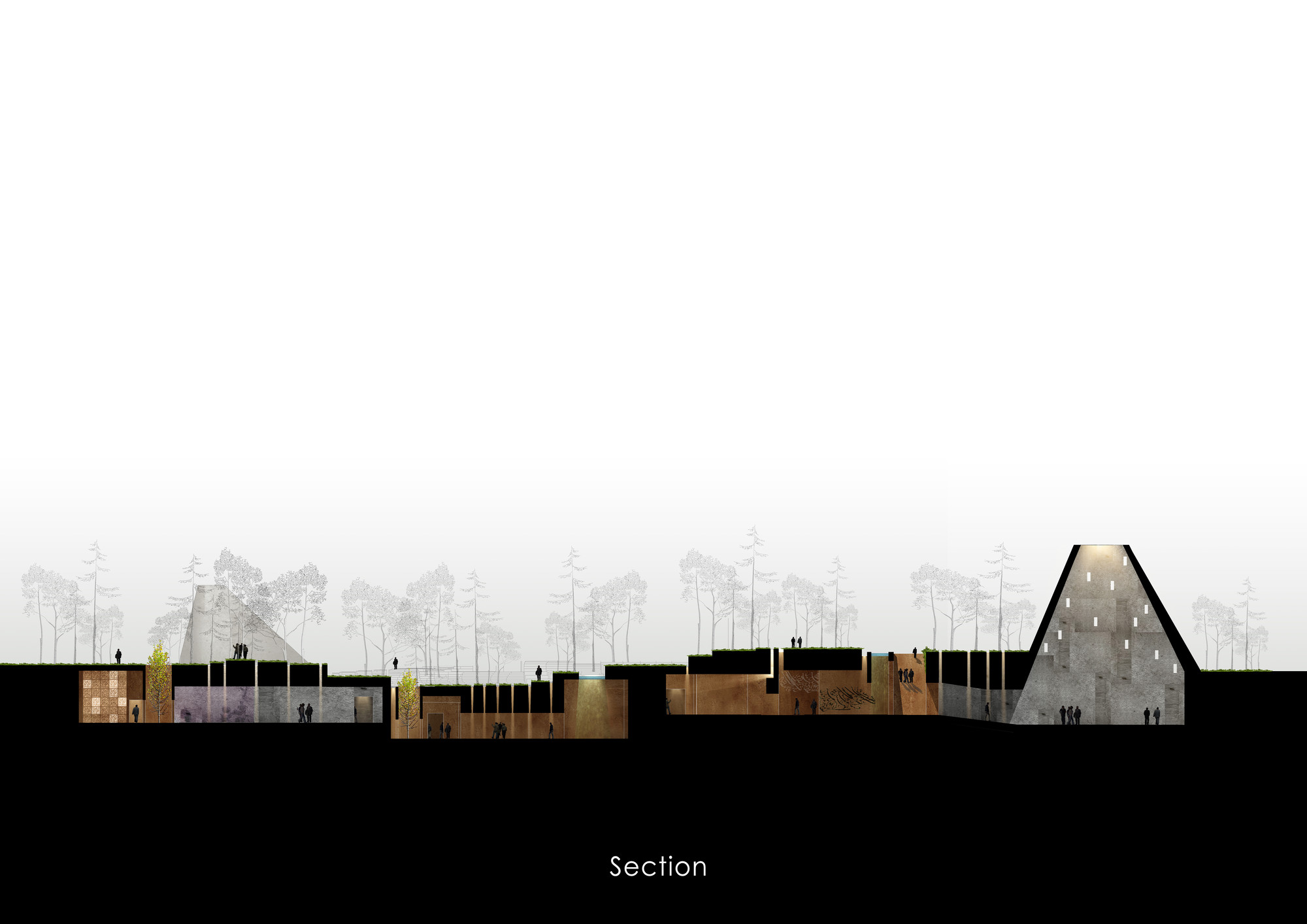 The first step in the design process was to investigate the morphological network of Behesht-E-Zahra Cemetery and Imam Khomeini Shrine. This network was depicted to form the geometry of the site and its components. One of the main design criteria was to create a modest building in relation to the Shrine. Therefore, it was decided to keep the ground as the dominant design element. The entire building spaces were taken underground with only some elements above the ground surface to represent the building. The underground spaces are in 3 categories: • Main underground spaces: spaces with high ceilings and vast areas used as platforms for social and group activities. The open plan design of these spaces enables users to perform a wide range of activities. These spaces were designed for experimental and group activities. • Secondary underground spaces: smaller spaces with lower ceilings relative to the main spaces to be used for administrative and service purposes. Moreover, these spaces could be used as workshops for production of what is going to be showcase in the galleries. These spaces were designed as a platform for discussion and research. • Connecting paths: these spaces are narrow and lengthy and could be used to showcase artworks. The art pieces produced by the artists in the workshops could be presented in these spaces. This category of spaces were designed as a platform for production and representation. The design vision in this project gone beyond designing within the site boundary and extended to the adjacent local fabric to form an open museum in the political-historical context of Jamaran area. The proposed physical program includes a pathway which passes through focal points of the cemetery and introduces the visitors to the historical and political importance of this significant landmark of Tehran. There are guidelines implemented along this path to provide important information about the site. This pathway eventually reaches the interior pathway of the museum.