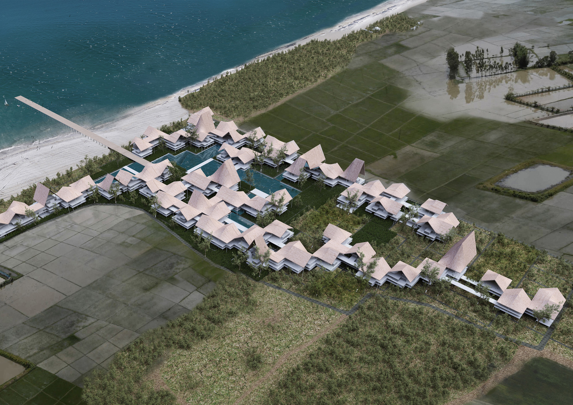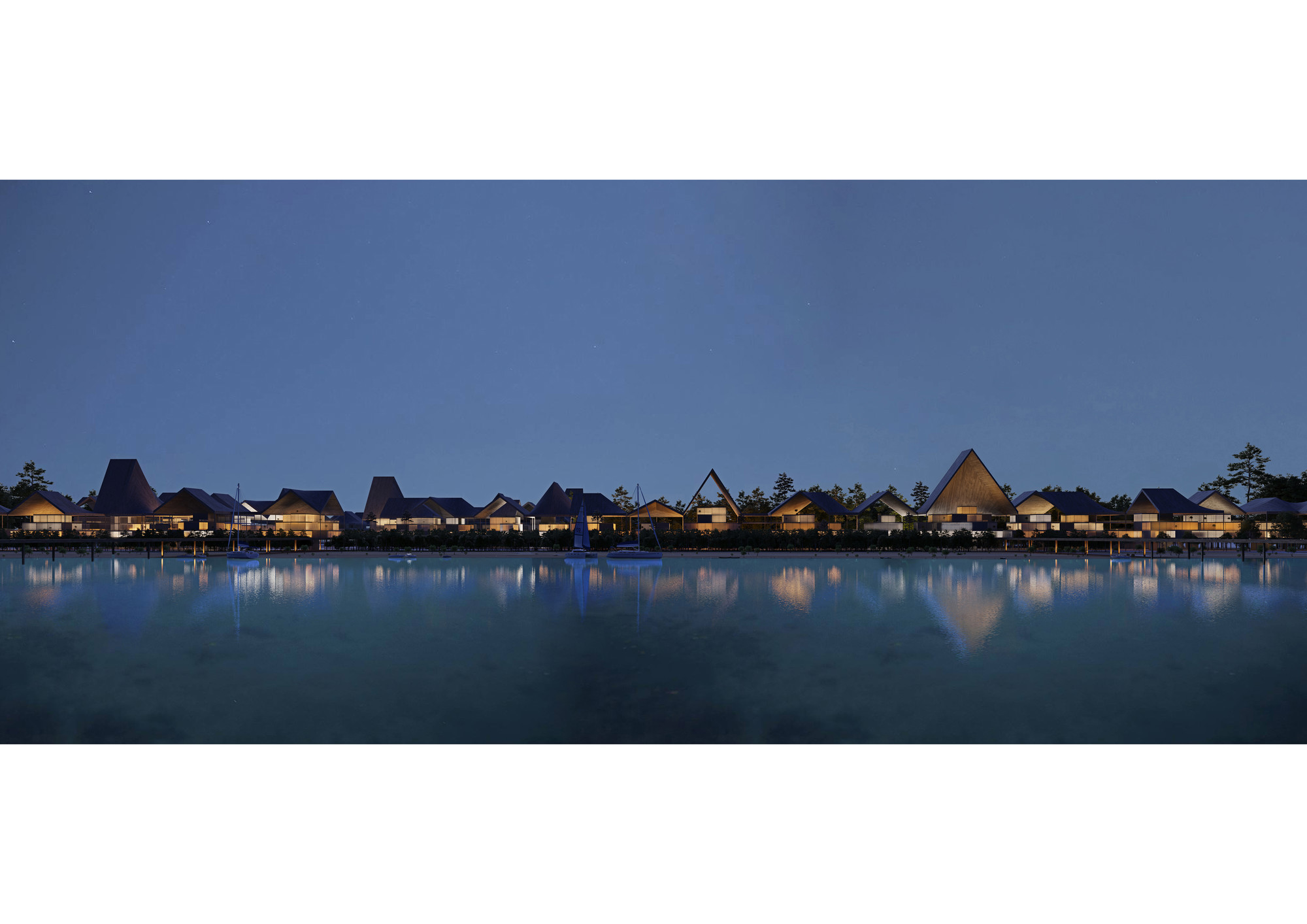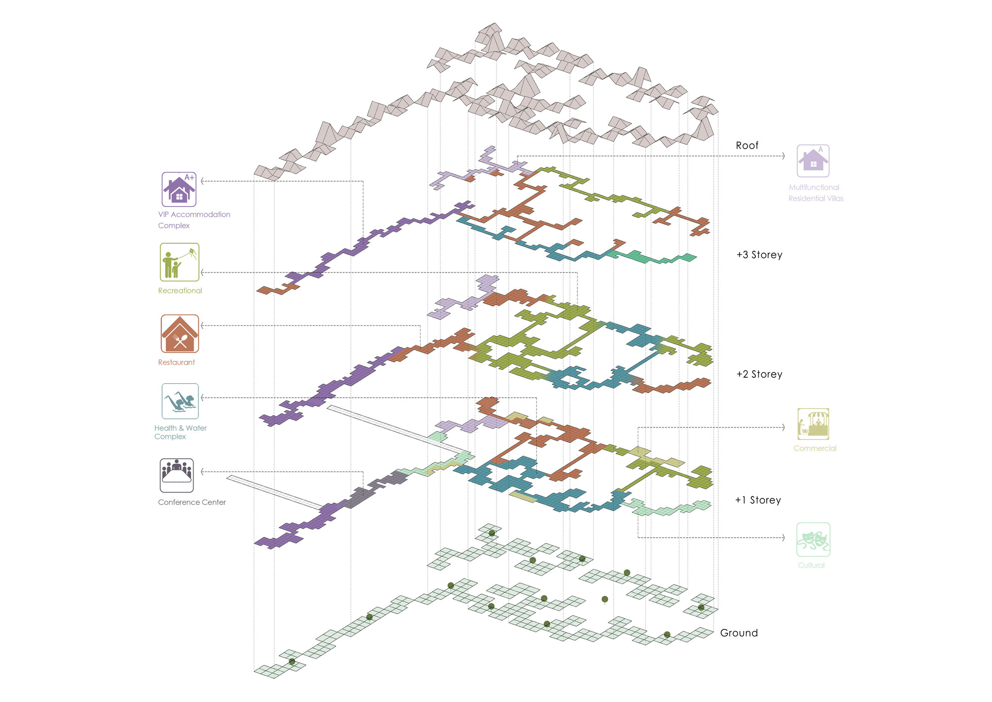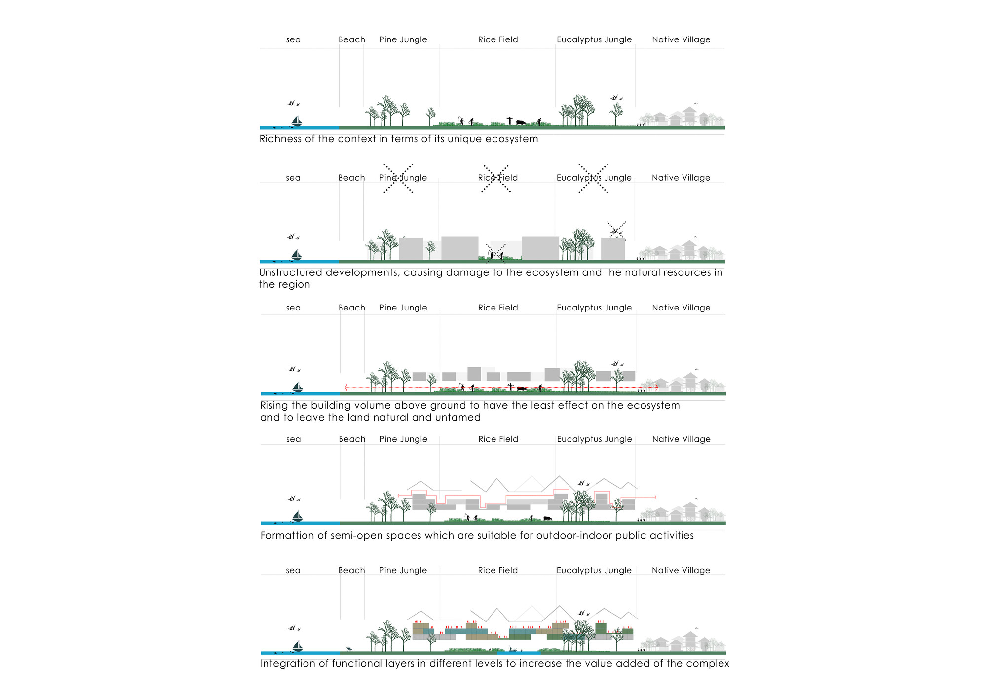 Rapid growth of the tourism industry in the north of Iran has resulted in unstructured developments, causing damages to the ecosystem and the natural resources in the region. The site of this project was one of the few remaining untamed coastal lands of the Caspian Sea. The design intention was to protect the ecological values of the area and to create an appropriate typology model for an ecotourism village in the entire region. The complex consists of hotels and restaurants, along with shopping malls and recreational facilities. Inspired by the traditional method of housing in the region, the project volume was raised above the ground, leaving the land natural and untamed. All the functional activities happen on levels raised above ground and under a continuous roof. The continuous roof over the entire volume creates semi open spaces which are suitable for outdoor-indoor public activities. The overall shape of the complex was formed in a way to fade the border between the building and nature.