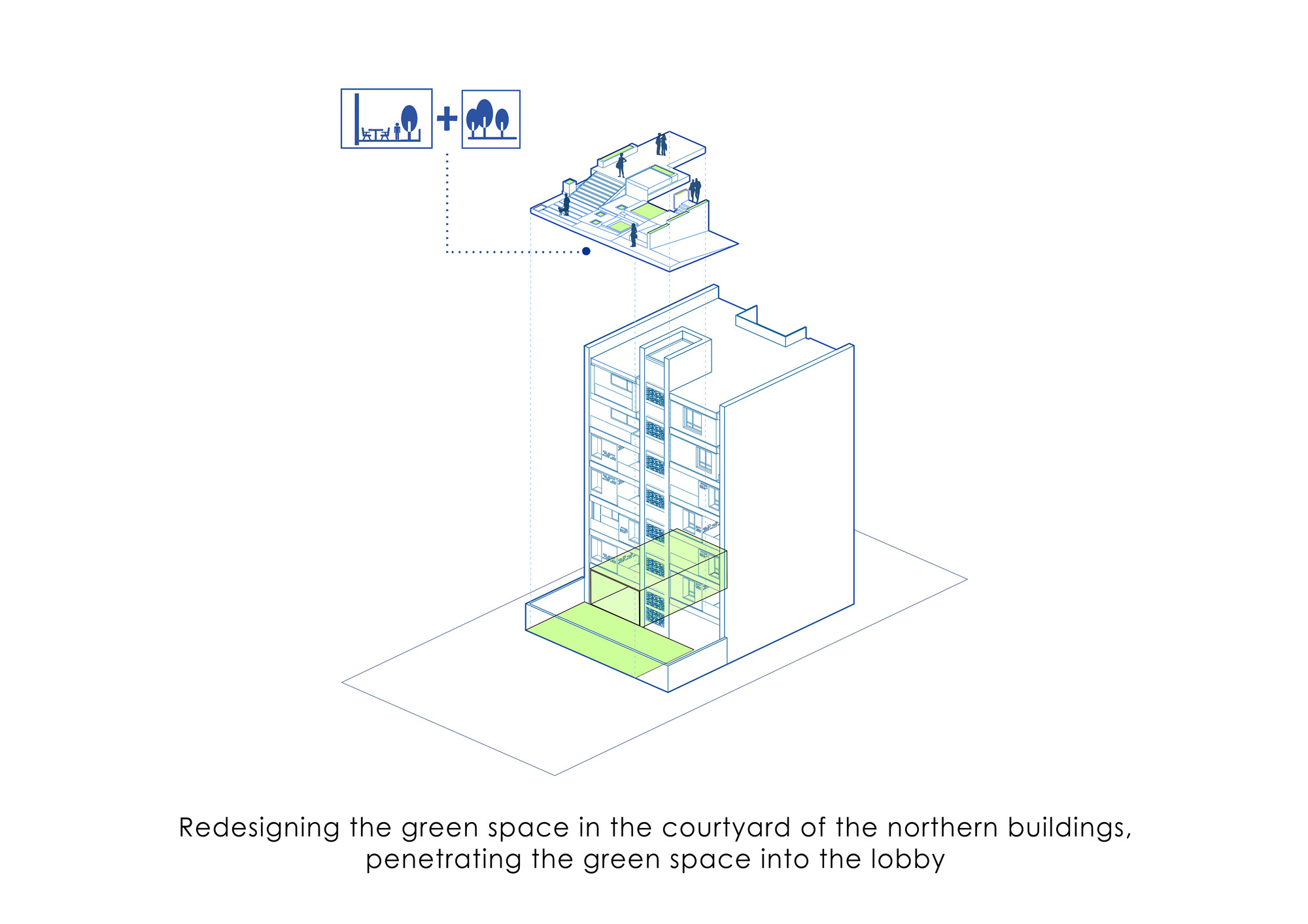 Moj residential building was introduced to our office when the structure was partially built. One of the most important aims for us was to create and develop a new “infield” building typology which is also applicable to other projects in the city. One of the main issues in typical apartments in Tehran is that the front yard in the northern blocks is underused and is not suitable for seating and gathering, because these spaces are mostly used to provide access to the parking. On the ground floor of this project, the space between the two walls was turned into a semi-open space for the residents to relax and enjoy the view of the adjacent yard. This space could act as a substitute for the front yard. On the 5th and 6th floors, the project volume deviates from the walls to enable vertical light wells on the exterior and interior volume of the building in the form of green spatial voids. This act improves the living quality of the units as the penthouses of the building. The material palette of the project was formed based on 3 components: 1. The vertical walls, embracing the structural columns, made of white crystal stone 2. The volumetric mass, covered with dark colored glazed brick, with glass blocks in between bricks wherever possible. The penetrating voids inside the spaces are also taken into consideration as masses and the same material was used to cover them. The material idea on this part was formed to reflect the light from the environment and the surrounding colors. 3. Black metal sheet, defining floor slabs (horizontal lines defining the floors).