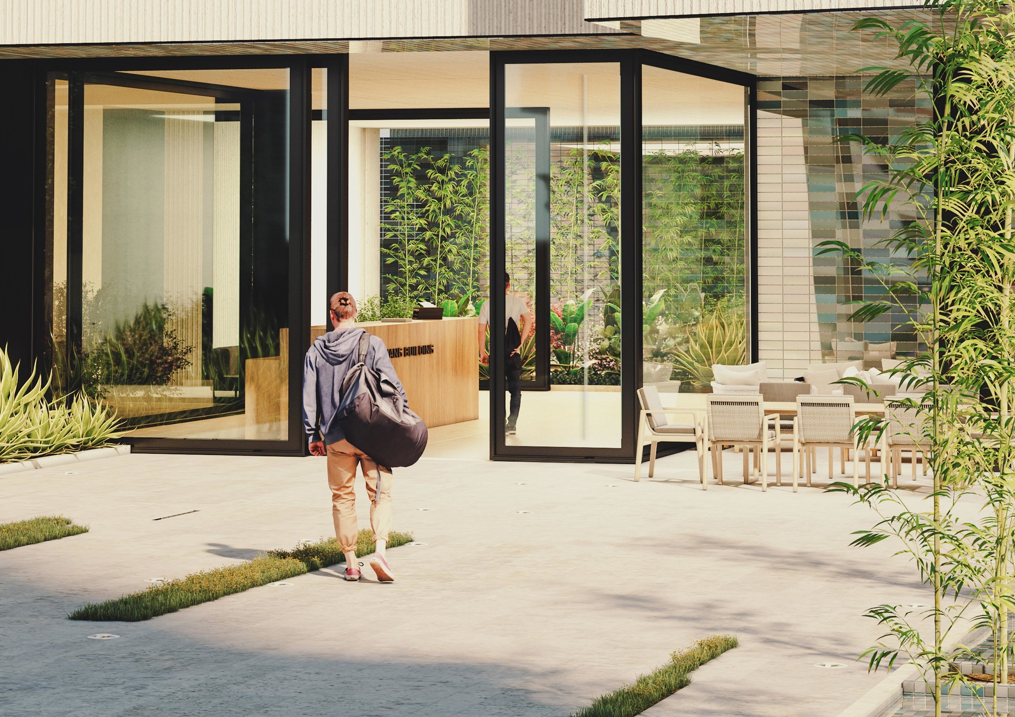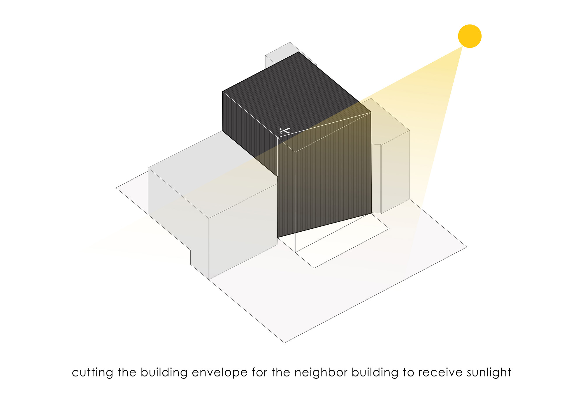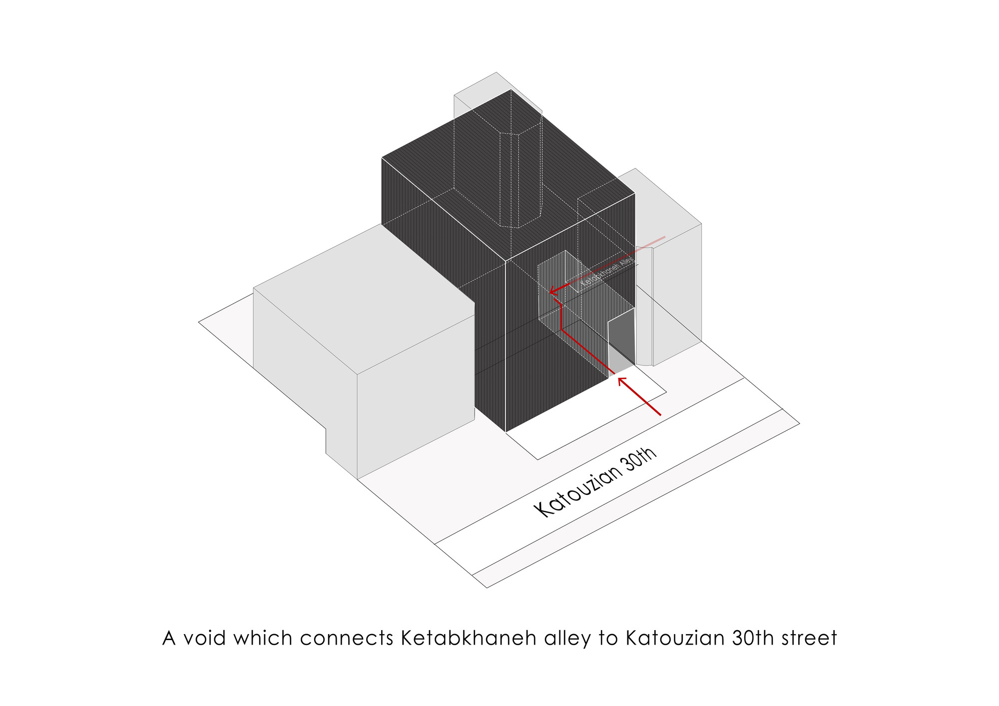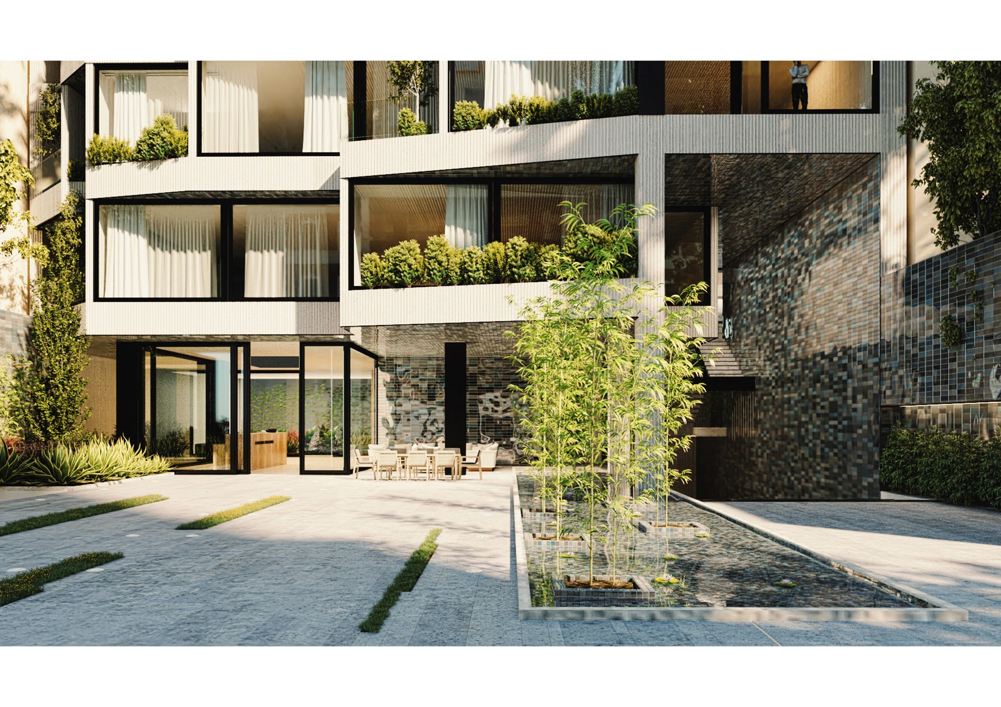 Farhang Residential Building is an infill project located in Tehran. Over the years, HOOBA Design Office has focused on developing adaptable apartment patterns that address various urban regulations, materials, modern living patterns, sustainability, and other relevant issues. Projects are shaped by their site-specific conditions, transforming these factors into parameters for rethinking and innovating conventional apartment design patterns. These parameters act both as opportunities and constraints within the project. The primary challenge in such projects lies in revisiting standard methods in urban apartment design. We believe that redefining infill housing patterns, which constitute a significant portion of the country’s construction volume, is a critical architectural endeavor. In the context of modern urban development, the top-down approach of Iran’s urban master plans has led to suboptimal architectural patterns for residential apartments. Many municipal regulations require architects to critically review and adapt them to foster growth in residential housing design. Farhang project’s location and accessibility offered unique opportunities for rethinking design patterns in this apartment typology. The site is bordered by a dead-end alley on its northern side and a 12-meter-wide street on the other. Along the main façade (facing the 12-meter street), the neighboring buildings were not aligned due to the street’s geometry. Considering municipal regulations (60% building footprint plus a 2-meter) the first challenge was to develop a building mass geometry that simultaneously addressed density requirements and contributed to the architectural layout. This geometry also influenced the distribution of units and the articulation of solid and void elements in the façade. The resulting geometry not only organized the open, semi-open, and closed spaces of the project but also enhanced the quality of residential spaces. For example, terraces in the building are designed with tall green spaces, ensuring most units benefit from these features. One of the project’s key potentials was the connection between the courtyard and landscape with the dead-end on the eastern side. This connection created a dynamic interaction between the urban fabric and the project’s landscape. From a volumetric perspective, the project emphasized the observer’s perspective and prioritized this aspect in its design. This focus influenced the materiality of the project, where reflective silver-glazed bricks were used on fragmented volumetric edges. These materials enhanced the perception of the building from the observer’s viewpoint. In urban projects, flat two-dimensional façades lack depth and meaning. By incorporating reflective materials, the relationship between the observer and the building is amplified. Additionally, this approach enhances the quality of open and semi-open spaces within the apartment design, creating a more engaging and dynamic architectural language.