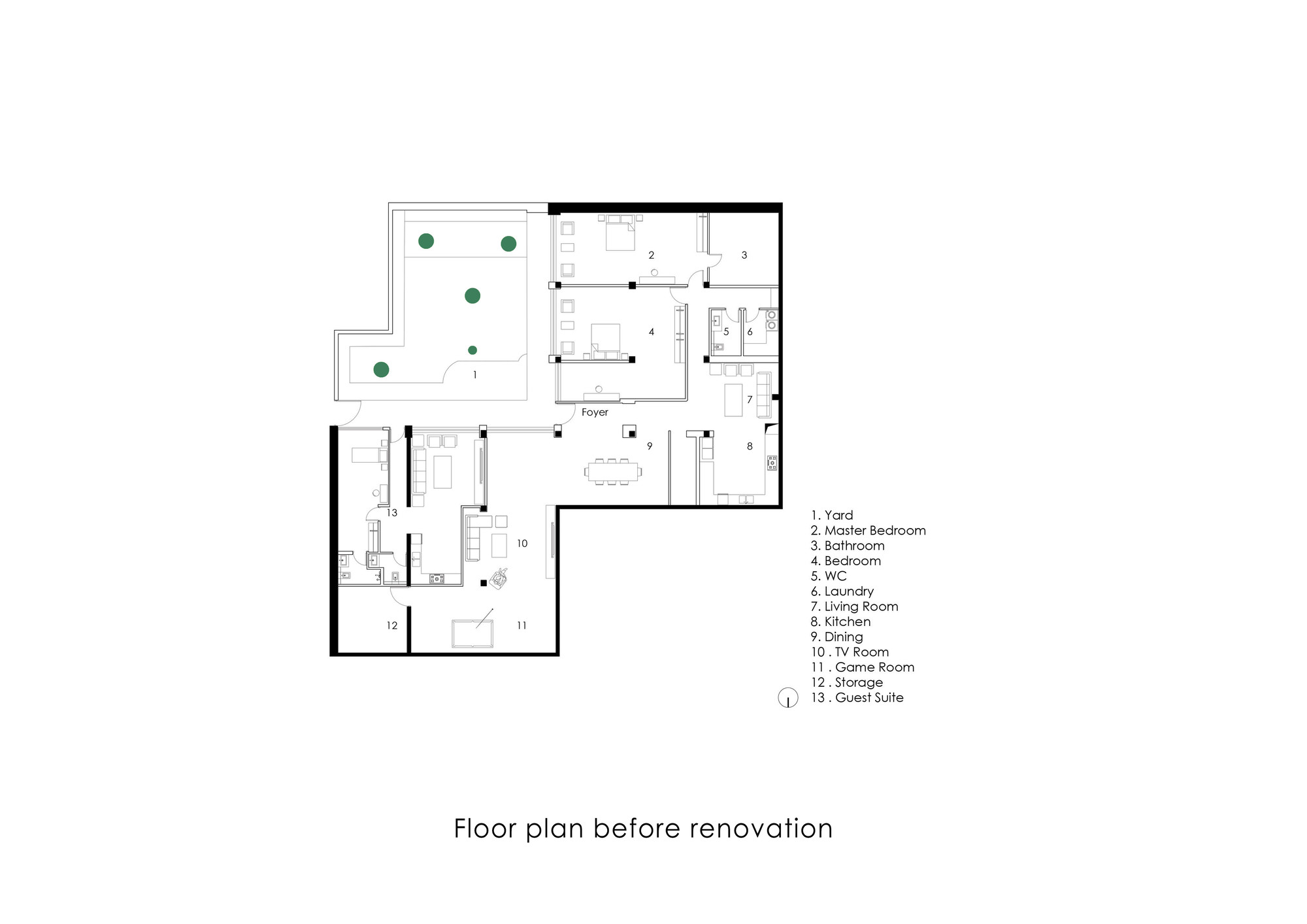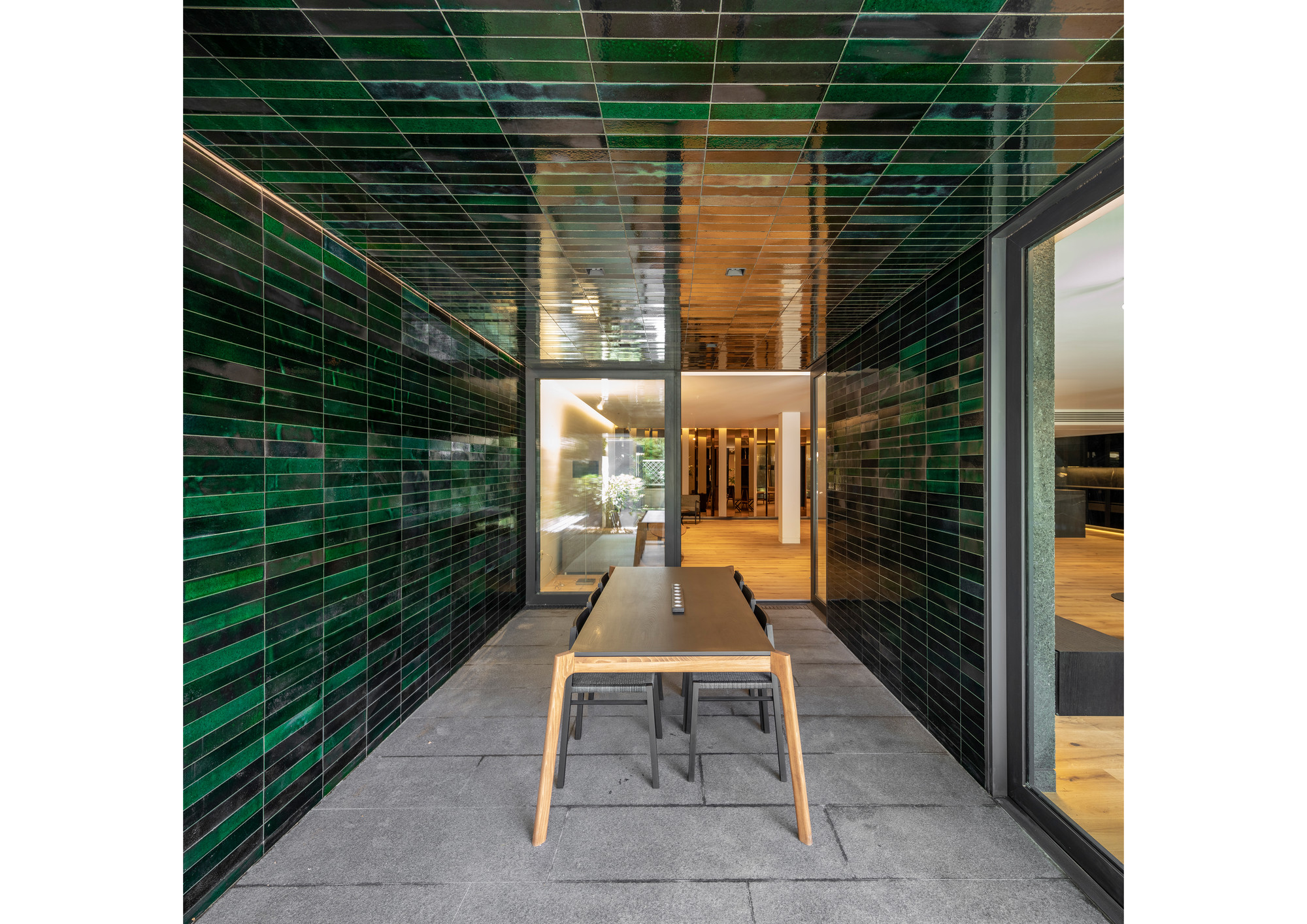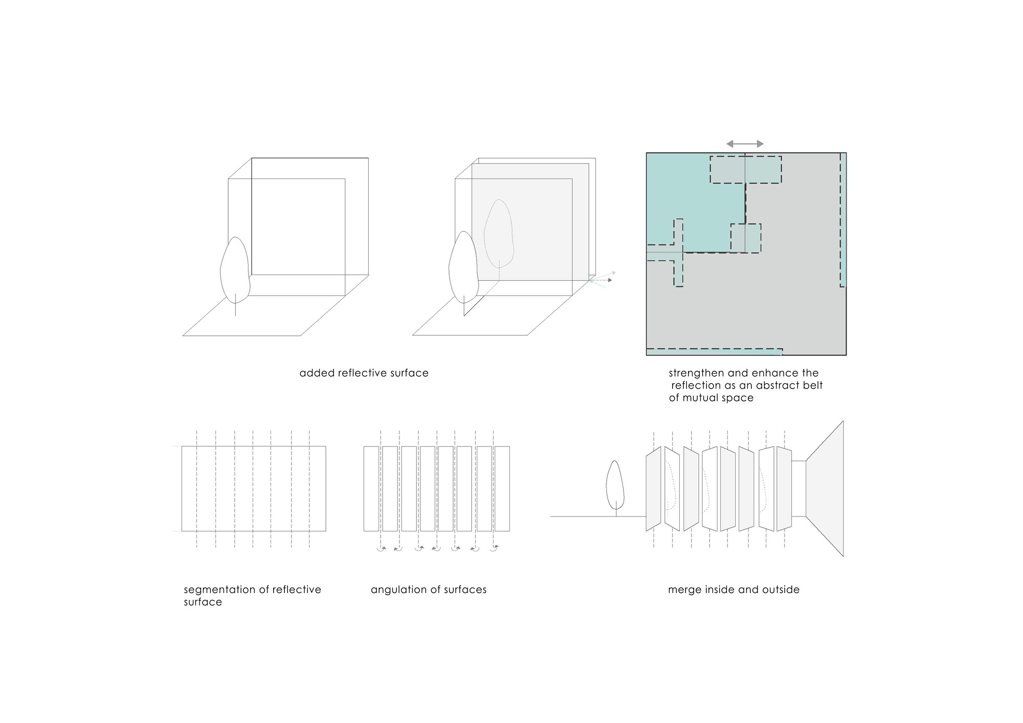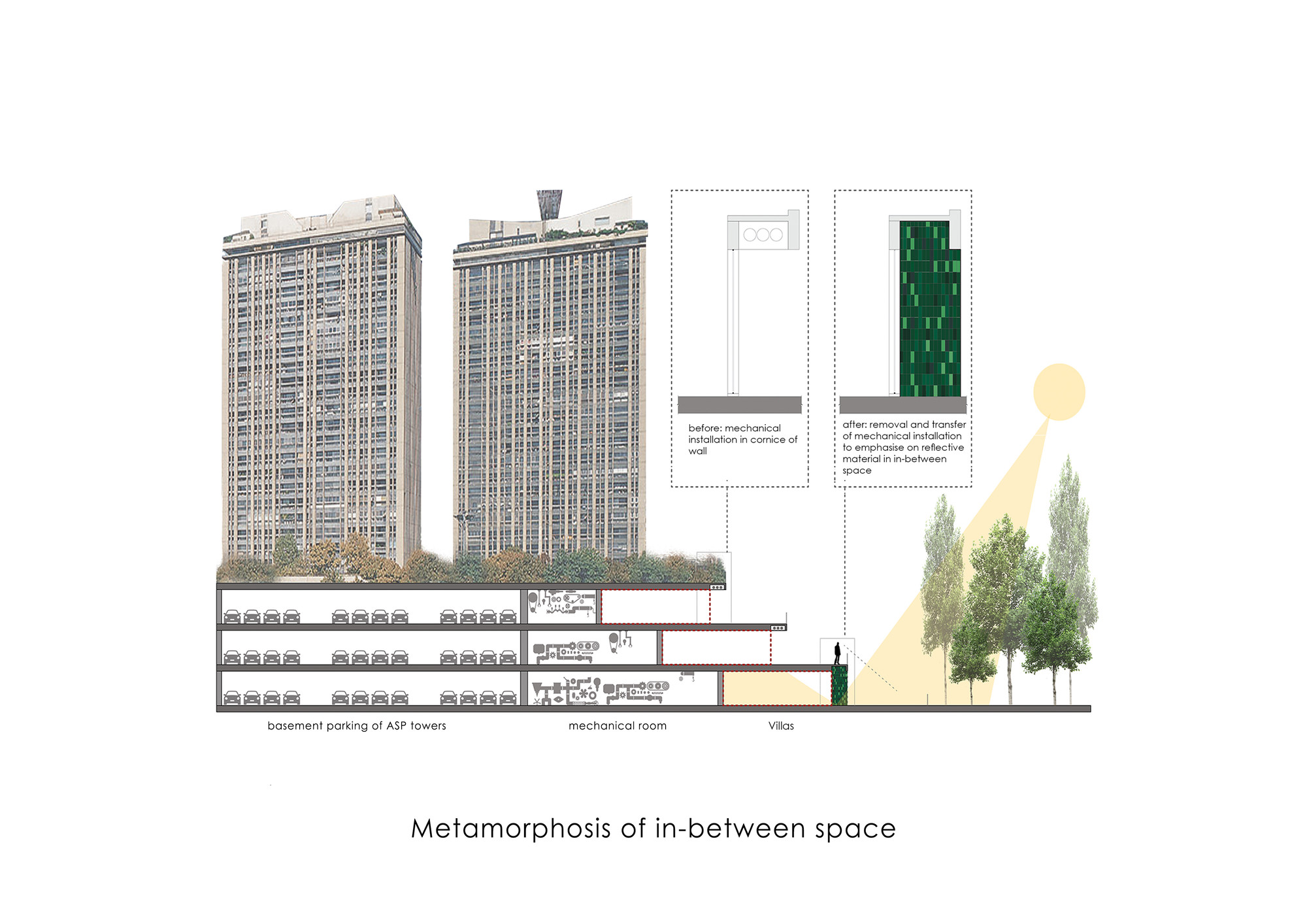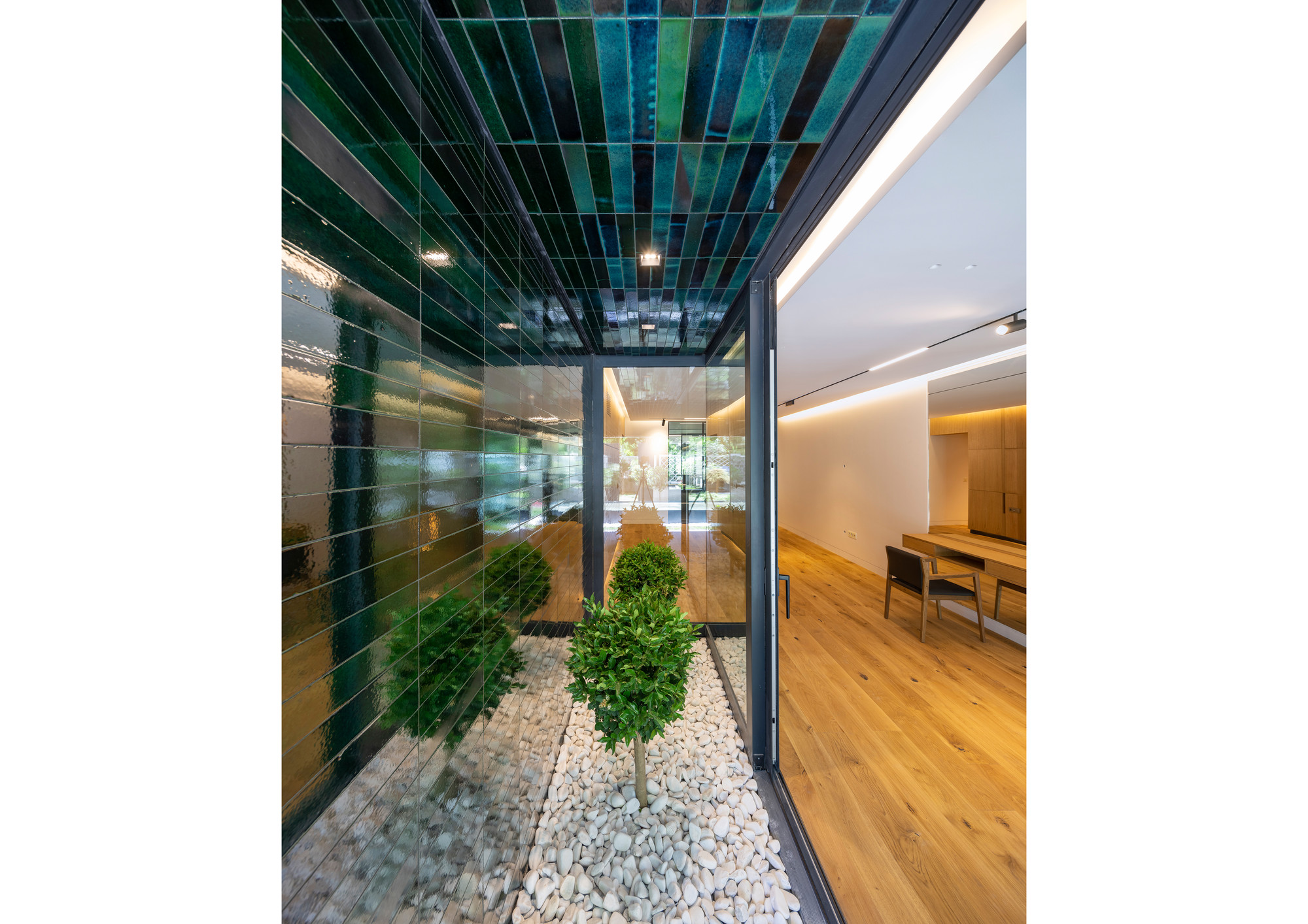 Renovation of Villa Unit 103 in ASP Towers The villa units within ASP Towers are considered one of the few successful architectural models built in Iran, where residents rarely intend to leave and strive to maintain these villas whenever possible. Given the current limitations of Tehran, villa-like qualities are rarely found in urban complexes or within the city’s fabric. ASP Towers, as one of the city’s historic urban spaces, hold a significant place in Tehran’s collective memory. Over time, many villa units within this complex have undergone renovation due to aging. The unique lifestyle offered by these villa units, combined with their diverse amenities, has created an exceptional living experience. Project Statement The project idea originated from the connection between the courtyard (outside) and the house (inside), with a strategy focused on expanding the interaction between the limited courtyard and the lightwell boundary. Consequently, the main question posed was: How can a rigid boundary be transformed into a dynamic and multidimensional space? Additionally, how can the courtyard space be separated from the house while turning the boundary into an intermediate (mediating) space? Mediating Space The intermediate space can play a developmental and mediating role in enhancing the relationship between the interior and exterior, addressing the diminished quality of such spaces. This space acts as a reflective yet abstract representation of the qualities of its adjacent areas. Functionally, the intermediate space serves as a green area, a semi-open zone, and a defining feature for the entryways. It establishes the connection between the outside and inside of the project. By analyzing the existing plan and addressing identified needs, the renovation sought to resolve several weaknesses, including: • Limited interaction between indoor and outdoor spaces. • Insufficient light penetration into deeper areas of the villa. • Lack of privacy for the courtyard space from upper apartments. • Poor cohesion between public, private, and courtyard spaces. The interior spaces were reorganized into three zones: courtyard, intermediate space, and interior. This organization was achieved through the mediating space. The interior design emphasized reflecting the exterior in areas where indoor spaces terminate, using reflective surfaces such as angled mirrors in some sections. In other areas, glass partitions were used to separate and define spaces while maintaining visual continuity. Material Concept The material selection reflects the unique identity of the glazed green-blue tiles characteristic of ASP Towers. These tiles, a distinctive and shared feature of the common areas and villa units, were used as a primary design element. Additionally, efforts were made to enhance the reflective quality of the space by incorporating the green-blue color palette in glazed materials, reinforcing the abstract interaction and merging of interior and exterior spaces.