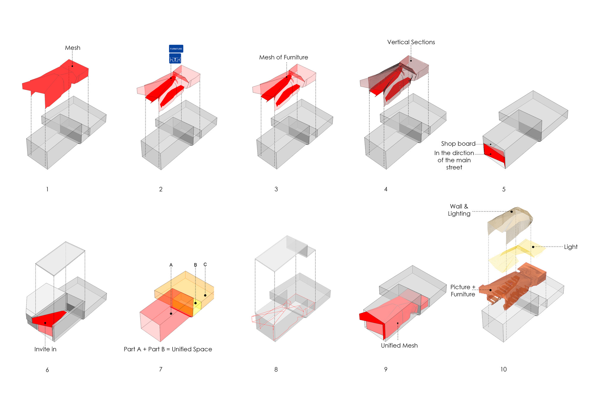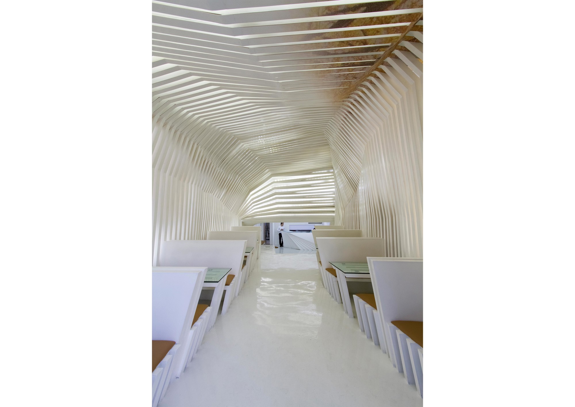 The aim of this project was to retrofit an old electric shop into a new restaurant. In an attempt to establish a new definition of the interior and the exterior elements, all the typical elements commonly used in a restaurant space were eliminated in the design process. The main design criterion was to create an integrated system starting from the exterior façade and extending to the interior space to form not only the architectural surfaces (façade, walls, ceiling, etc.), but also all the fundamental interior elements of the restaurant such as, tables, chairs, decorations, electrical and mechanical equipment, as well as lighting. Another important design consideration was to create a variety of aesthetic experiences by modifying lights, colors, and spatial qualities inside and outside the restaurant.