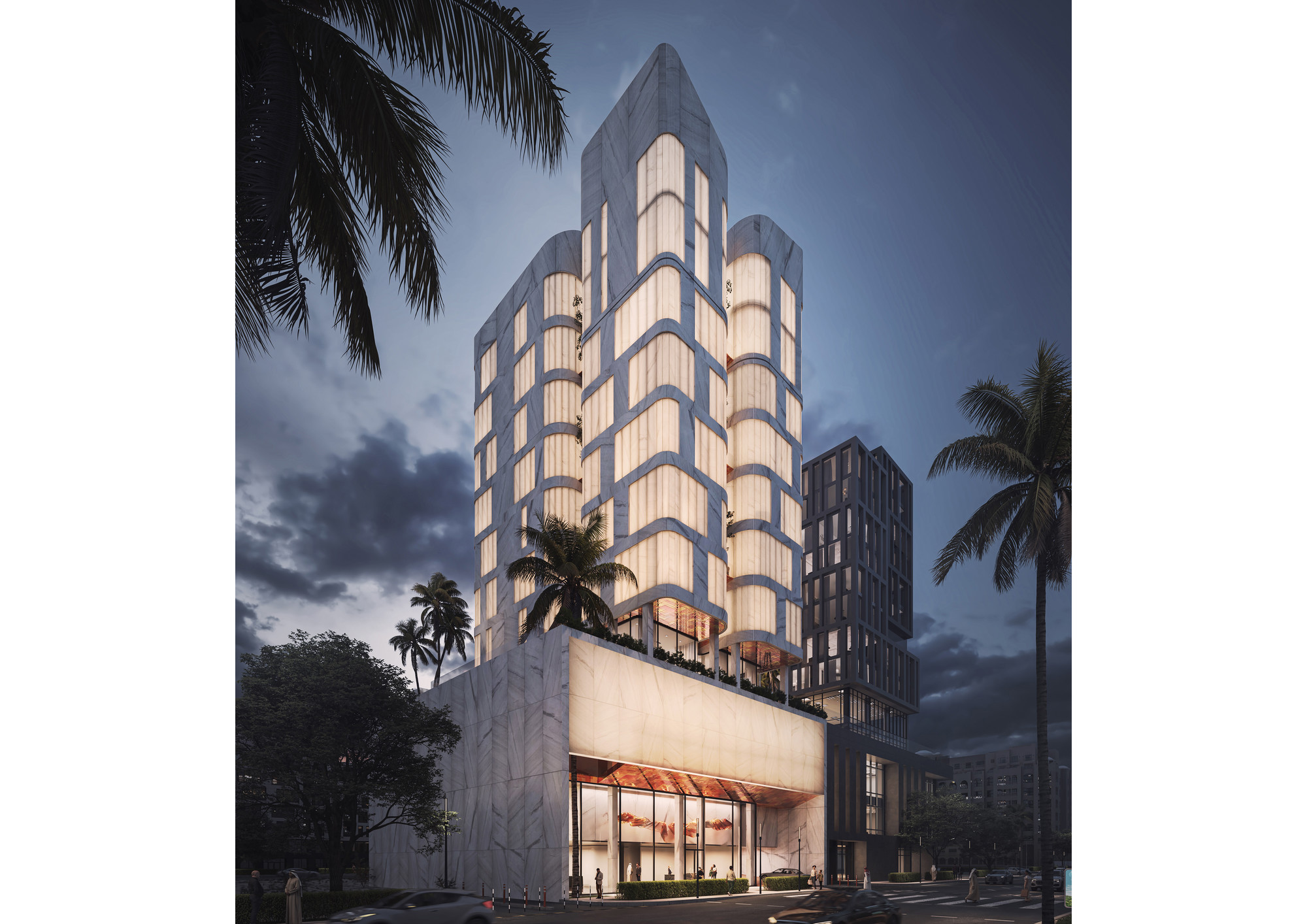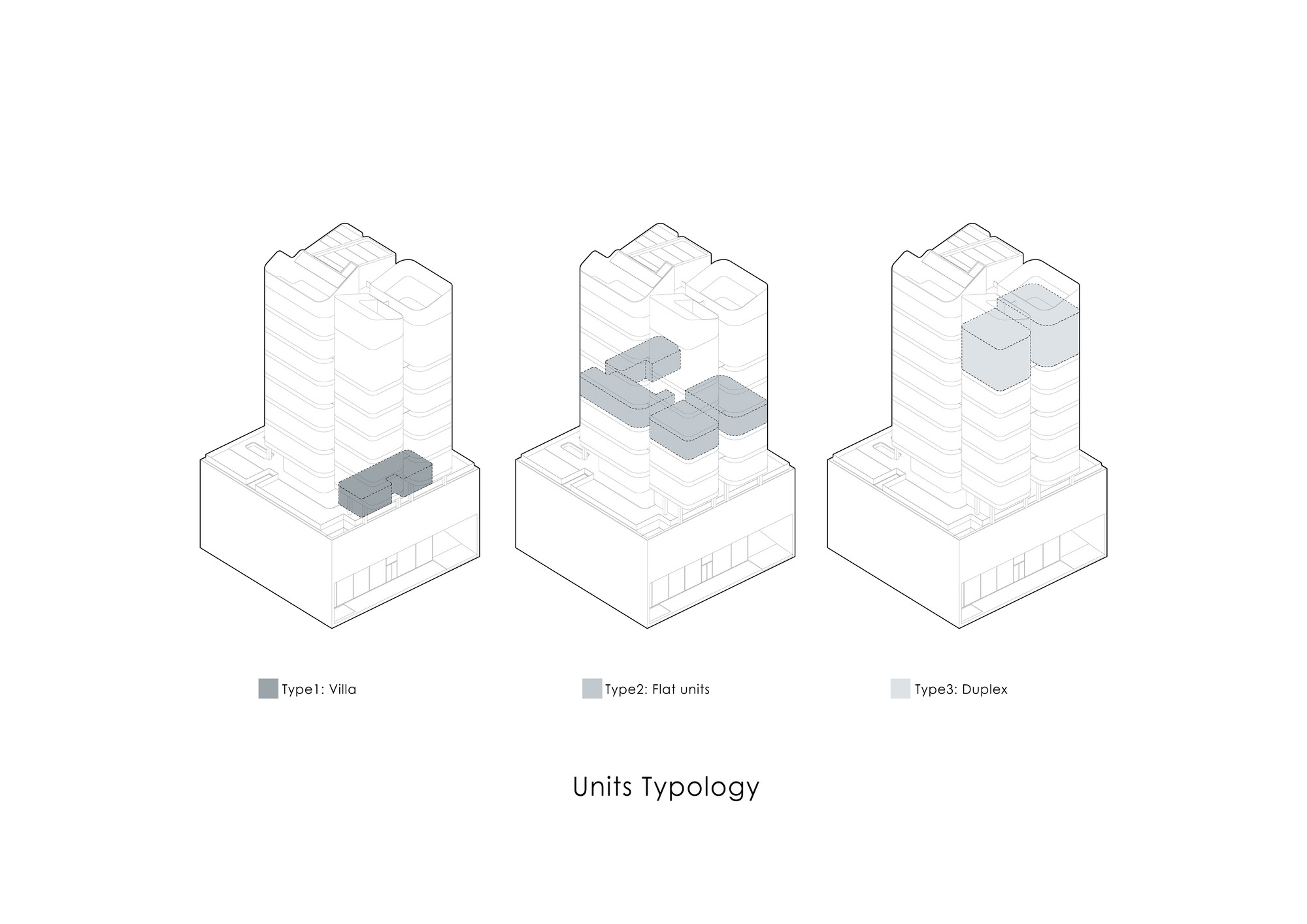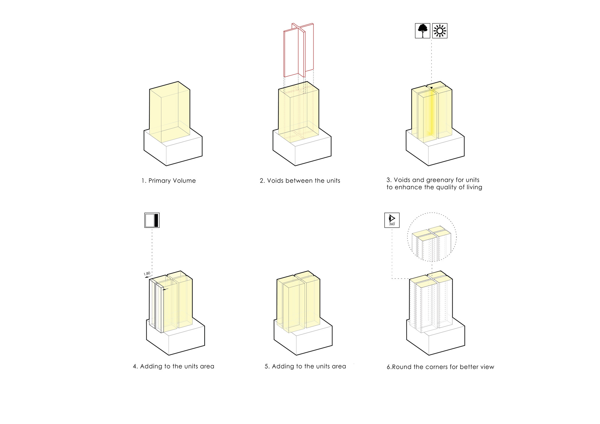 Residential Apartment Project in Jumeirah Garden This project aims to align with Dubai’s geography by offering a model of small-scale apartments combined with high-quality semi-open and open living spaces. The design integrates compact residential layouts with open spaces, responding to local climatic and urban conditions, and Dubai’s zoning regulations. Key Design Strategies: • Semi-Open Spaces: Shared walls between units are replaced with semi-open spaces, providing each unit with an independent semi-open terrace. These shaded terraces connect to the living areas via large openings, enhancing indoor-outdoor integration. • Shaded and Semi-Open Living: These spaces improve residential quality, especially in small-scale apartments, offering natural ventilation, indirect lighting, and enhanced livability. • Unit Geometry: Each residential unit is divided into four distinct sections, with semi-open terraces breaking shared boundaries. These voids allow indirect light into corridors and facilitate cross-ventilation when needed. • Corridor Lighting and Ventilation: This spatial organization not only enhances unit quality but also improves natural lighting and airflow in communal hallways. Ground Floor Design: The ground floor includes a lobby and community hall. Skylights in the podium roof illuminate parking areas and lobby spaces, while circulation design (e.g., parking ramps) allows for a double-height lobby, creating an open and inviting atmosphere. Architectural Form and Materials: • Curved Edges: Each residential unit is treated as an independent volume with curved corners, maximizing views of Sheikh Zayed Road and the coastal front. • Double Layer Facades: The façade employs materials balancing transparency and solidity. Thin marble laminated with glass creates semi-transparent panels, functioning as thermal and light regulators. These panels provide soft lighting when closed and can open (sliding or accordion-style) for clear city views. At night, the semi-transparent façade glows softly. • Material Flexibility: Panels can be operated manually or via smart systems. Cost-effective alternatives like translucent concrete (a blend of concrete and glass) can also be implemented if budget constraints arise. Amenities and Layout: • Podium Landscape: The rooftop of the parking structure is landscaped, featuring an outdoor pool, jacuzzi, gym, café, and changing rooms. • Villa and Duplex Units: The northern side includes a private villa with a dedicated courtyard, while the 7th and 8th floors feature two duplex units. These duplexes include private rooftop courtyards with jacuzzis, ensuring complete privacy. Internal elevators connect these units directly to the rooftop. • Residential Units: The project comprises 24 independent apartments, two duplexes, and one villa with a private courtyard. This project redefines compact living by integrating semi-open spaces, innovative materials, and high-quality amenities, creating a unique residential experience tailored to Dubai’s environment and urban lifestyle.