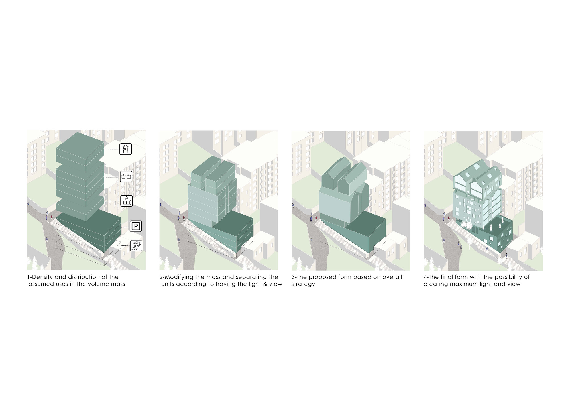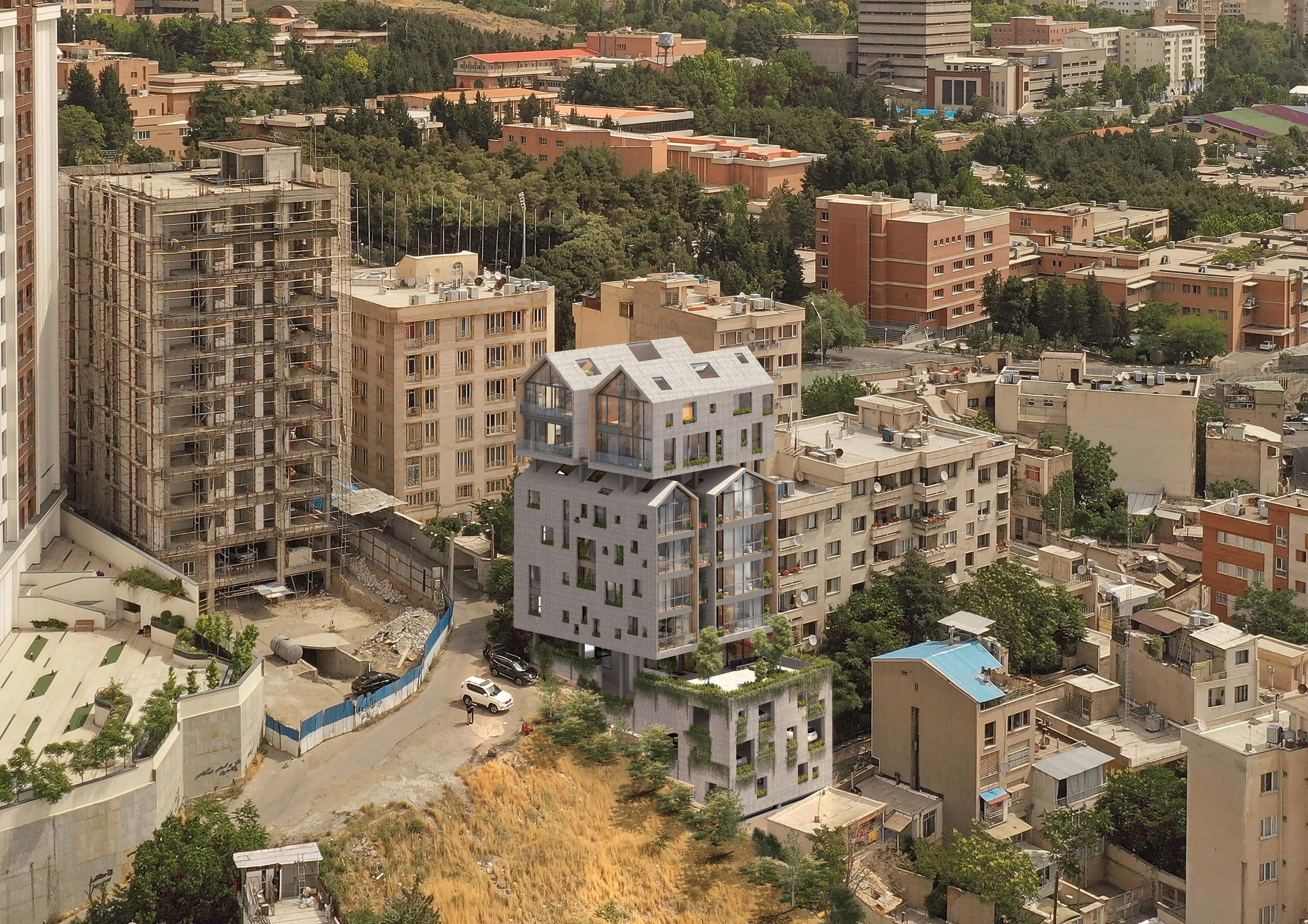 The Evin area in northern Tehran was traditionally known for its villa projects. However, in recent years, the landscape has changed from villas to mid-scale apartments, and now to high-rise apartments. It's important to define the architectural quality of these new buildings and establish a suitable pattern for the area that benefits investors. The apartment design is based on the concept of mimicking a villa apartment from the initial proposed plan, complete with a yard of about ten square meters. The units are separated by semi-open spaces and half-play yards instead of common walls. These semi-open spaces serve as entrance courtyards connected to the living space, and are reflected in the design plans. The external volume of the project is structured with two units on four floors, and two separate volume masses for the duplex units on the fifth and sixth floors. The design prioritizes the integration of green space and openings in the majority of the outer wall's thickness, rather than focusing on the composition of balconies or windows. Emphasis is placed on the volumetric mass and the spaces between them, taking into account the scale of the project. The lower levels of the building, especially below ground, are designed to control light and security while also creating green spaces for service areas. Another defining feature of the building design is the use of sloping roofs, which allows natural light to enter the building and gives a unique quality to the units. This design choice also focuses on using a minimal color palette for the exterior walls and highlighting the building's green features. To achieve this, the vertical grooved stone material is used for the units, while copper enamel materials are used in between them. It's important to emphasize the volumetric grooves in the project.