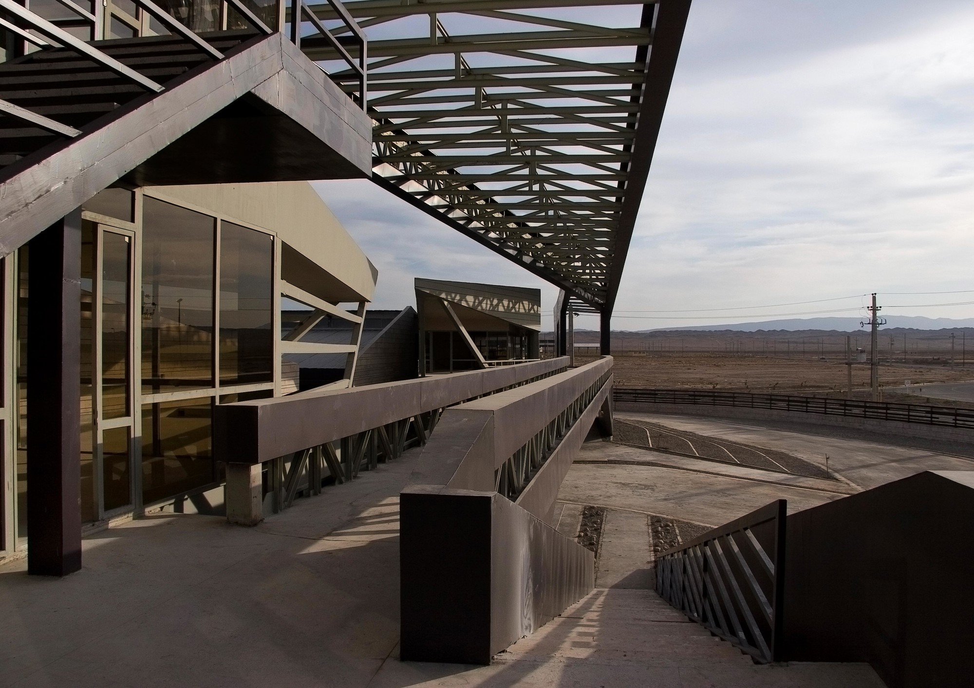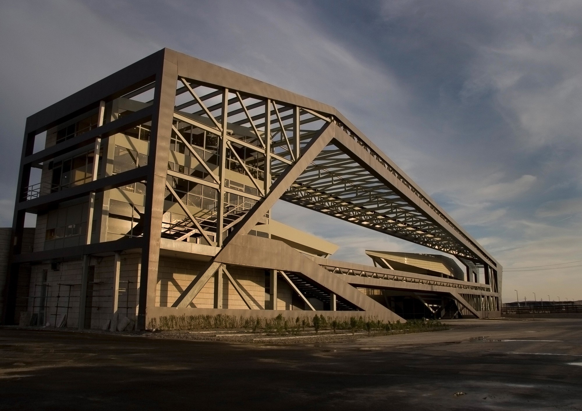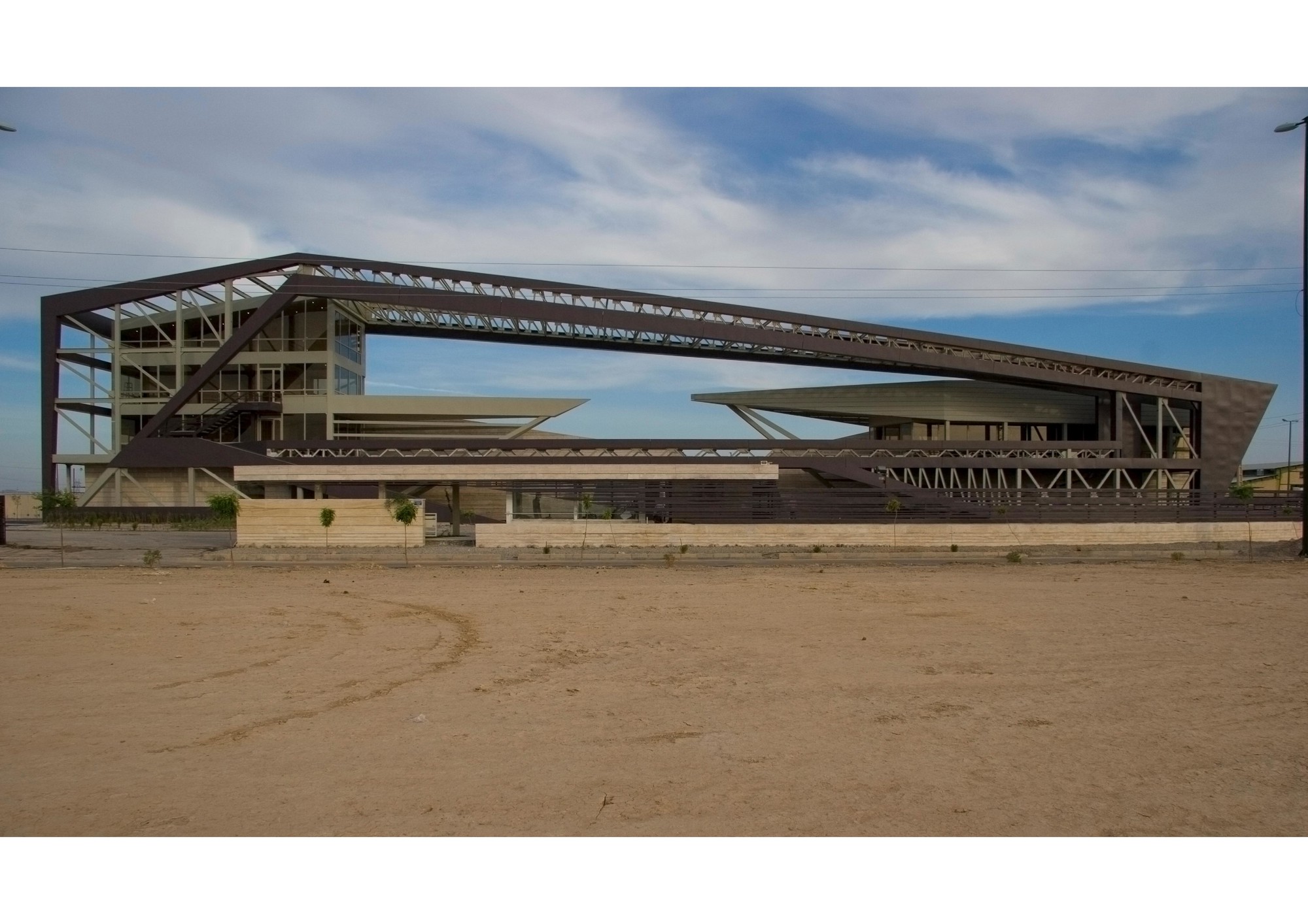 Ehsan Poud Textile Factory was to be built near the main square in the phase2 of the Shokouhieh Industrial Town near Qum City. Design Process: There was no special characteristic or iconic feature in the area which could inspire the design of this project. Therefore, a threefold analysis method was used to form a diagrammatic process defining the project: 1. Program Distribution The project included two production halls, administrative divisions, as well as residences. The design process was initiated determining the position of the two main production halls. The administrative section and the residences were then positioned at the front. The next attempt was to create a logical relationship between the building and the adjacent square by combining these elements into an integrated plan. 2. Spatial Organization The idea of an integrated model with various cores was the main design criterion in this project. The spatial diagrams of the project represent how these cores connect to each other to form powerful perspectives. While defining the main entrance of the building, the 70 m long suspended bridge is used to connect the two administrative and residential zones together. Circulation to all parts of the project takes place under this bridge. 3. Form The shape of the building was formed inspired by the spinning and weaving mechanisms which are the essence of the textile manufacturing. Lines and surfaces wrap around the spatial cores in different sections such as the production halls, the entrance, and the perimeter wall, to create a consistent architectural language throughout the building. To represent this idea in a pure form and to emphasize on the industrial identity of the project, steel and Travertine were the only materials used in this building. Structure The structure of the project consists of an exposed truss system which is partially covered with steel plates in some sections. Therefore, the structure itself becomes the main architectural element, forming the spaces. Ventilation and Mechanical Systems Considering the dry climate of Qum, an efficient mechanical system was essential to provide the 70% humidity requirement for a textile manufacturing environment. Therefore, two 60,000 ft/m3 air washers as well as a fan coil system were implemented providing heating, cooling, humidity, and fresh air circulation as desired.