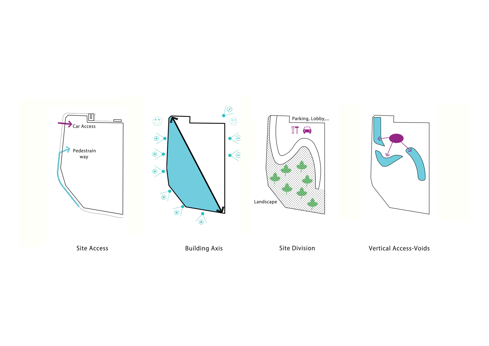 This project consisted of designing a residential tower near the beach in the hot and dry climate of Kish Island. The main design criteria were as follows: • To achieve a model flexible enough to define a variety of unit areas • To provide beach view for every unit • To provide proper shading as well as natural ventilation for the units • To create consistency between different design elements The design procedure was initiated by determining the position of the building relative to the site in order to optimize the beach view. The second design attempt was to create two major voids dividing the initial solid volume into three volumetric masses. This division defines unit boundaries and creates private access to each unit. Moreover, these voids significantly improve natural ventilation through the building. Taking into account the climatic condition of the site, controlling sunlight penetration was an important design factor. Density variations in the façade louvres helped addressing this issue by controlling the amount of sunlight penetration according to the position and function of each space. In some sections, this system converts to a solid surface with small window openings to minimize the amount of generated heat. The entrance is created as a continuation of one of the main voids and is surrounded by two building masses which provide all year long shading for this area.