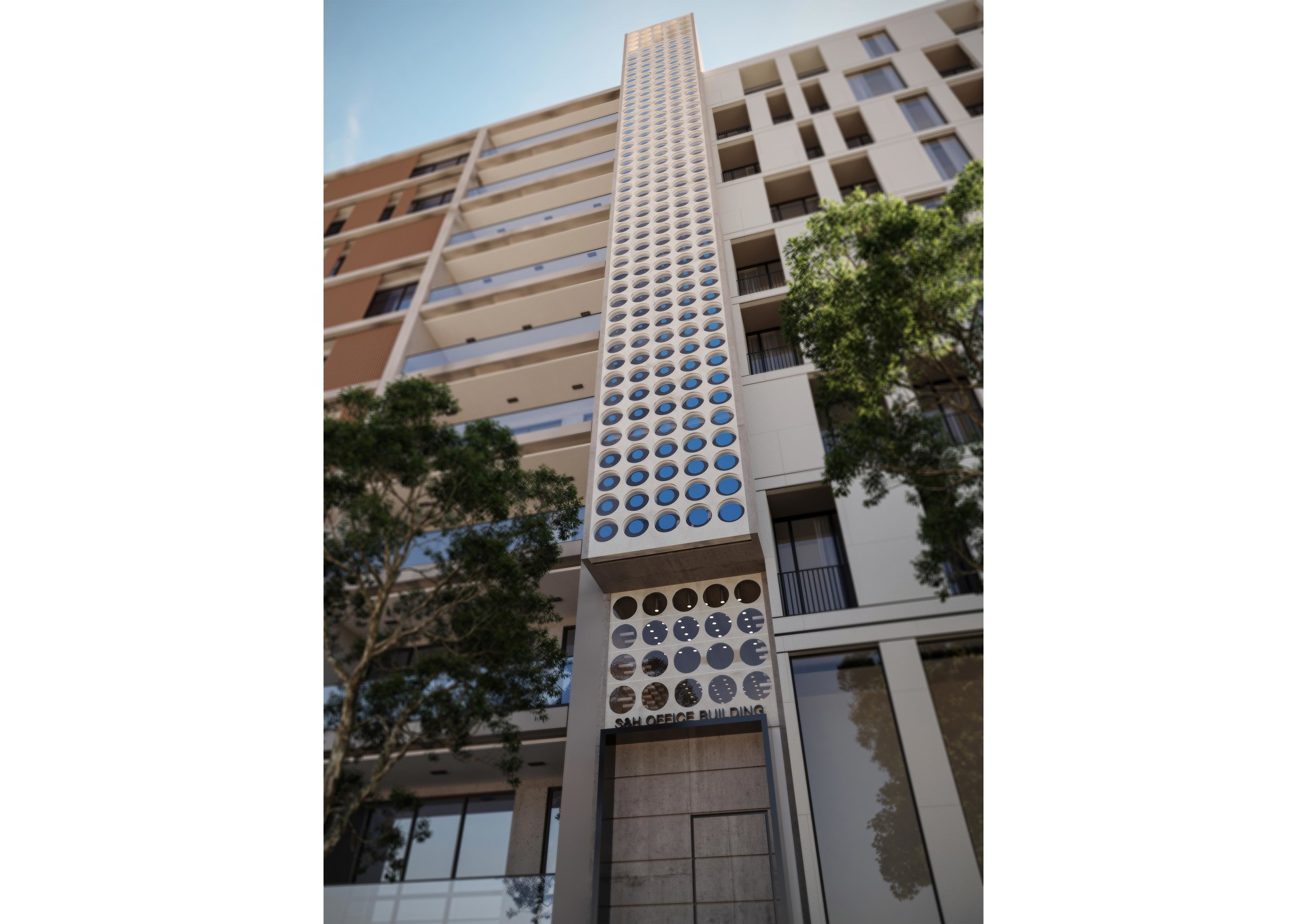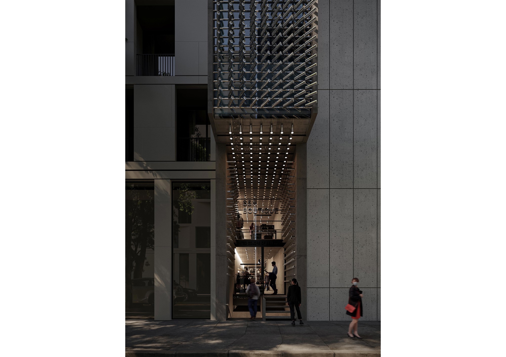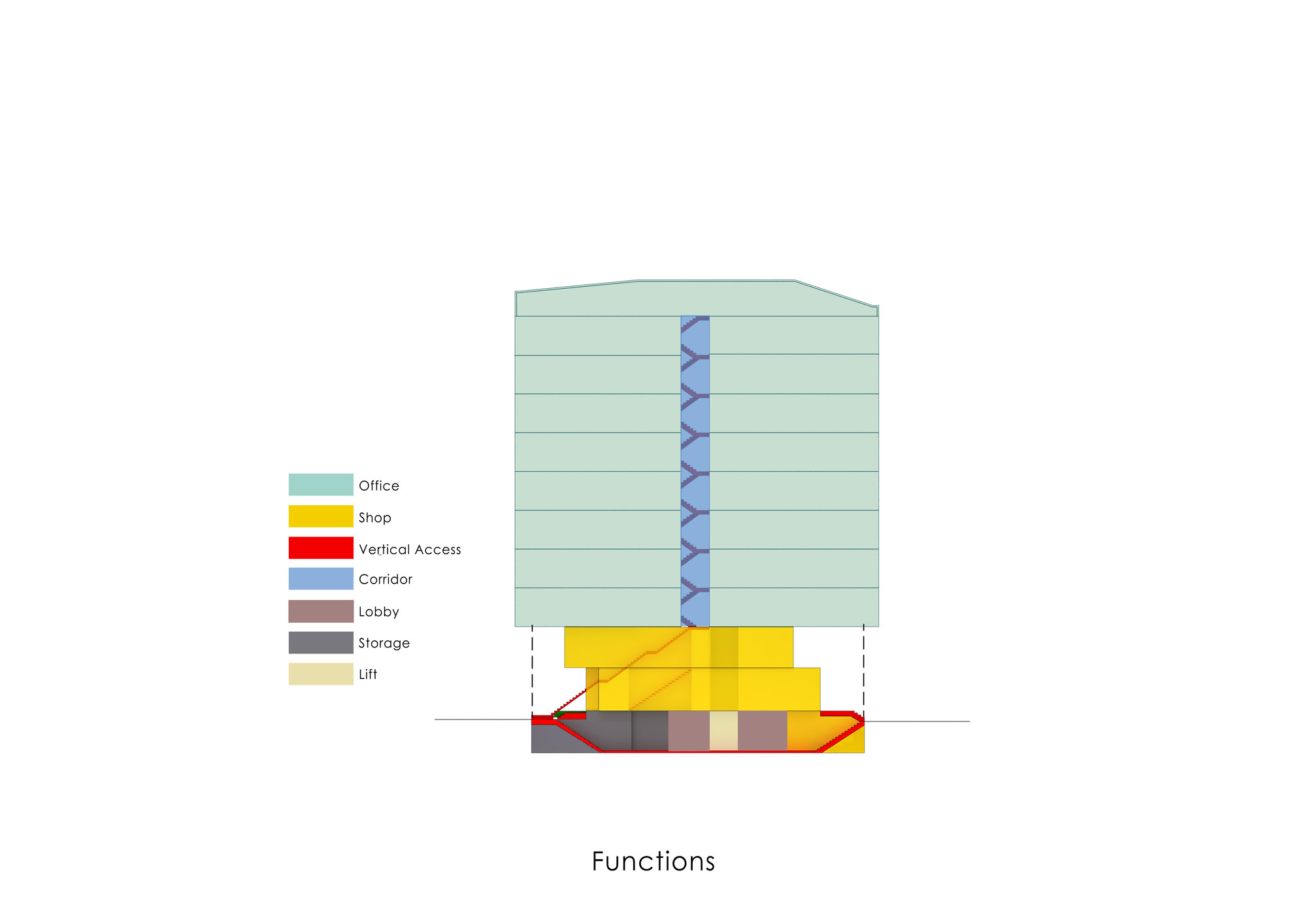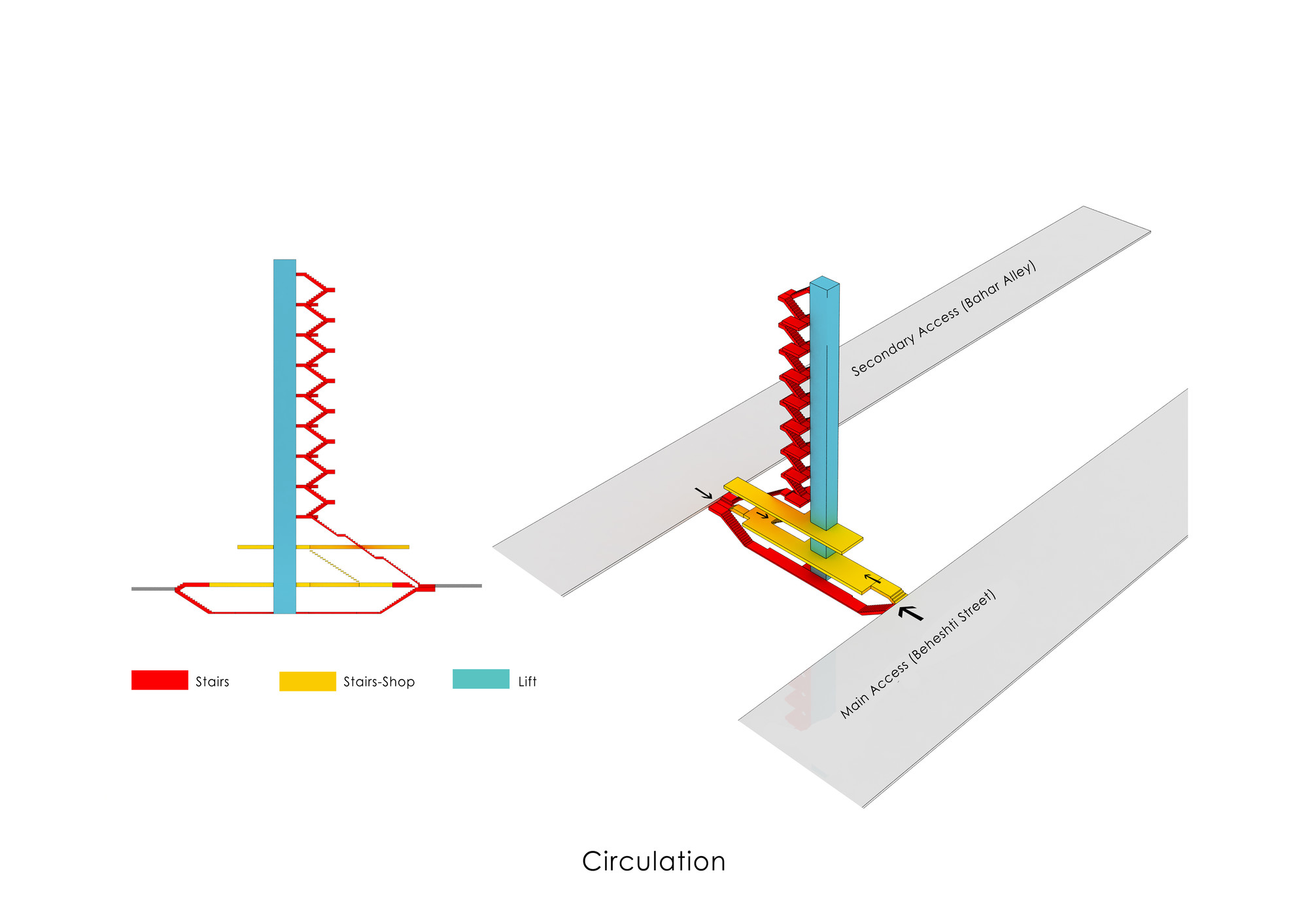 The main design challenge of this project was the unusual dimension of the site with a 4m width and a 30m depth. The main idea was to achieve a solution which not only forms the north and south facades but also helps in the design of the interior spaces. Considering the narrow width of the site, the primary question was how to circulate through the building. Therefore the internal organization of spaces was initiated by resolving this issue. The idea for the exterior surface was to create a dynamic façade which visually attracts both pedestrians and drivers. Inspired by the movement of fish clusters in oceans, a node system was used to form a dynamic façade in accordance with the movement of vehicles in two directions on the adjacent roadway. The nodes were made of steel bars with LED lights implemented on the edge, making them glow at night. On the south façade these nodes form window openings with varied opacity to control the south sunlight exposure.