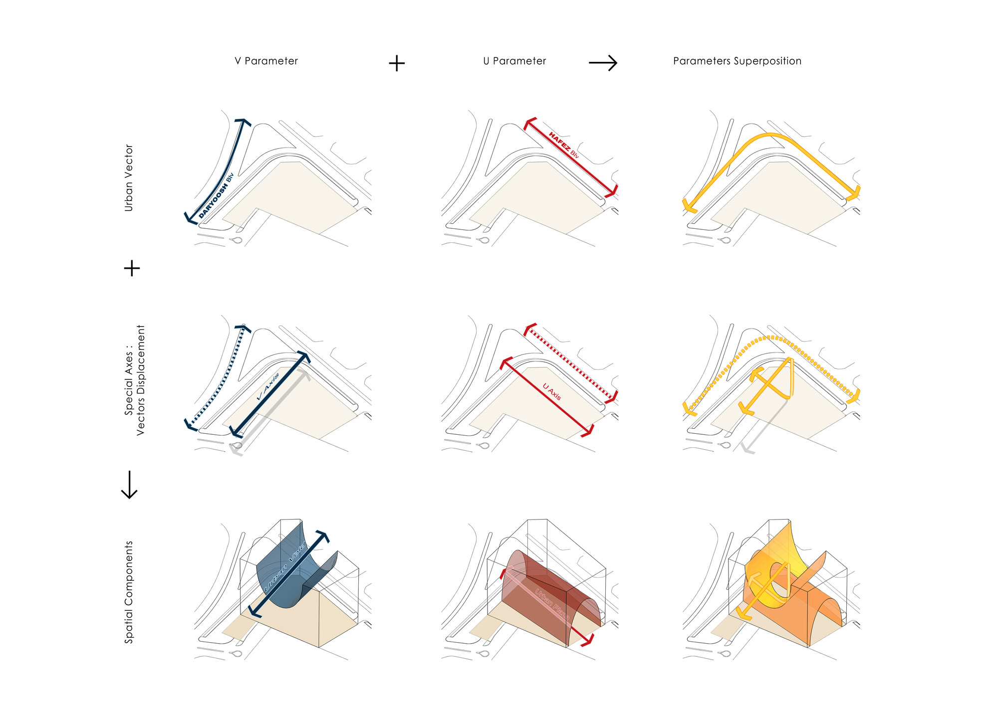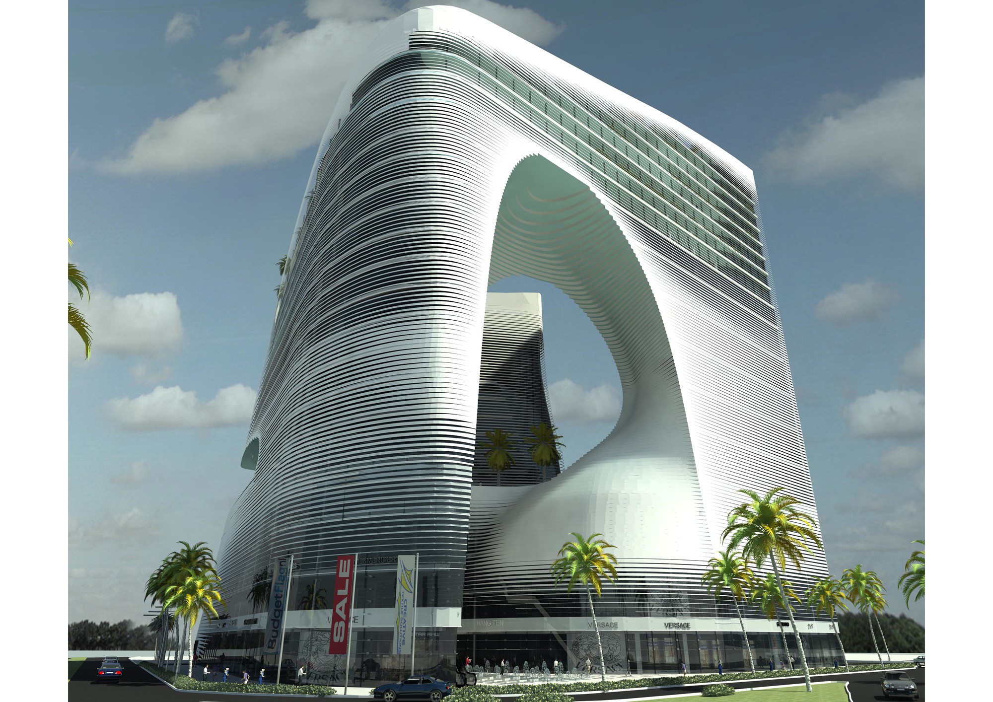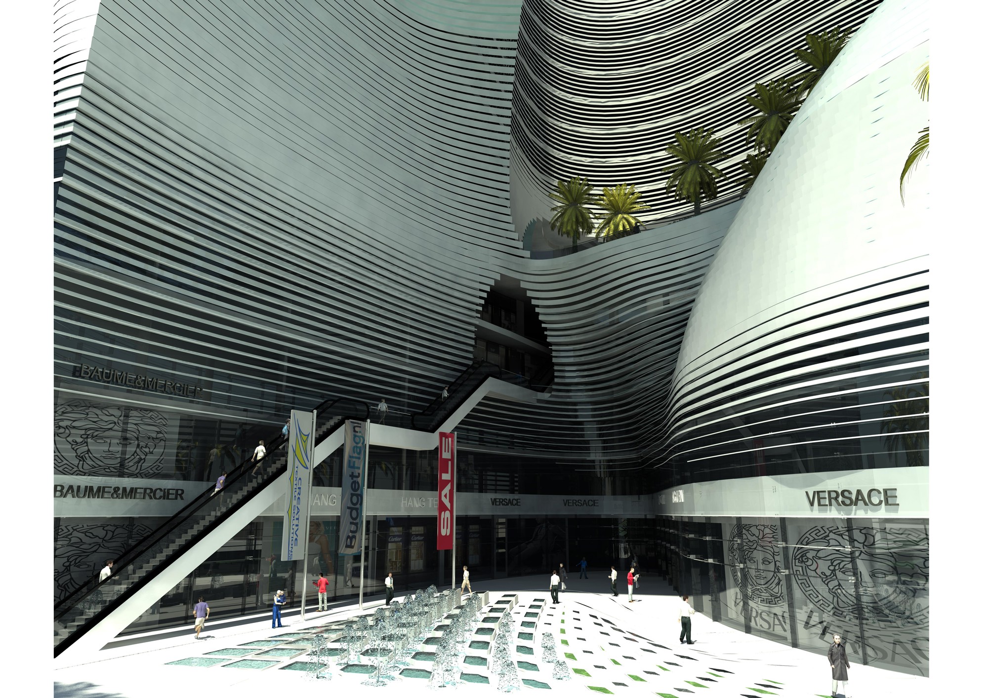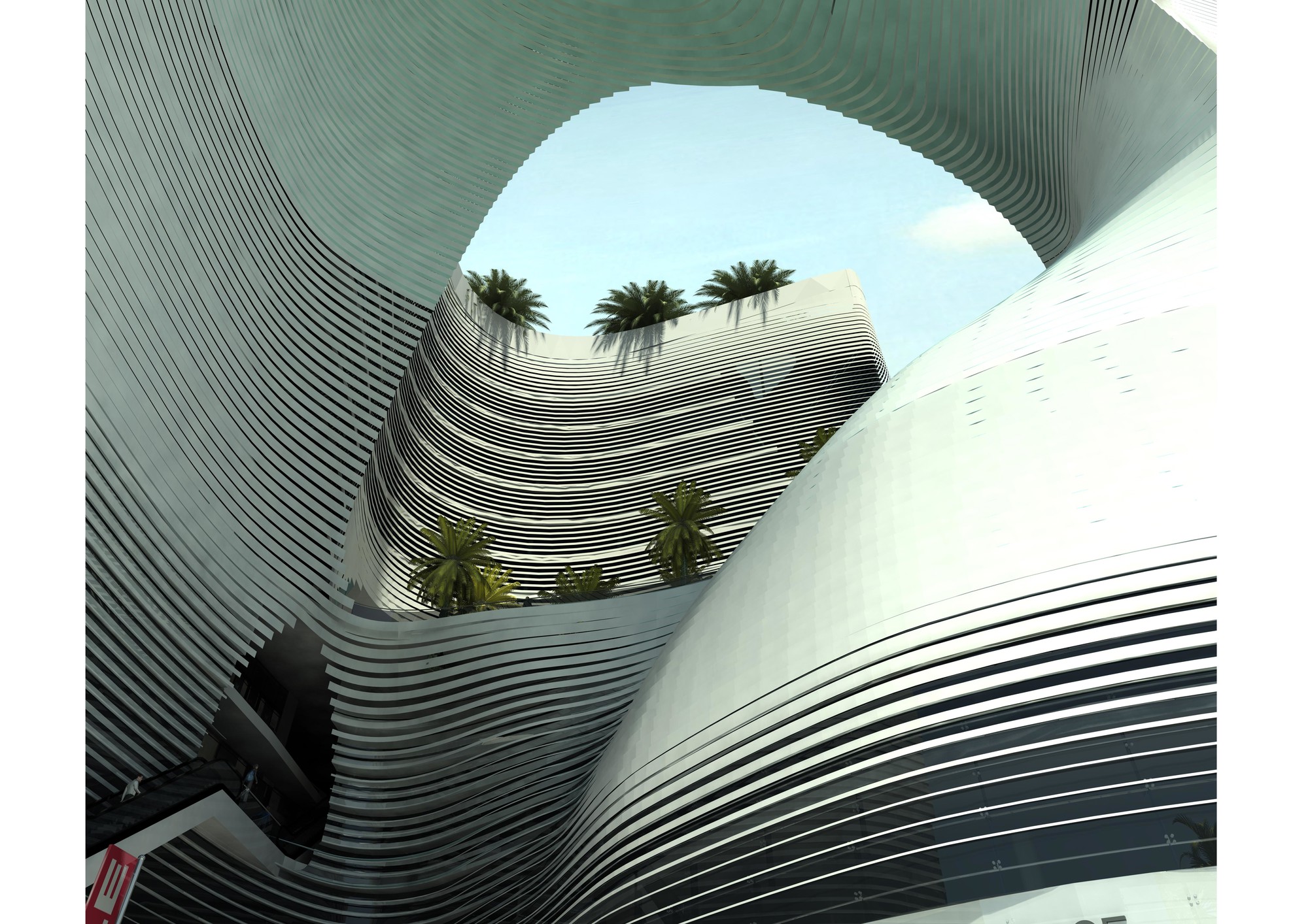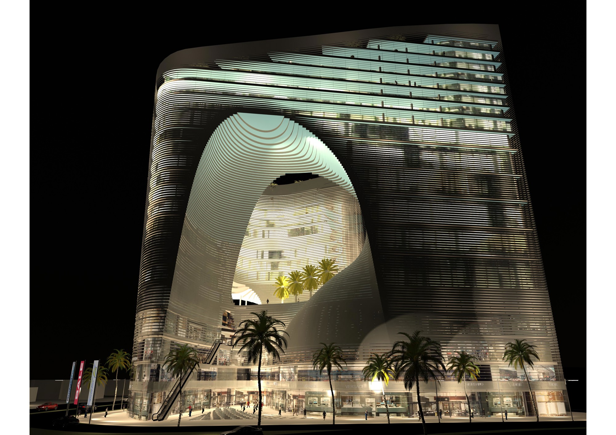 This project is located at the junction of two distinct regions of the Kish Island, the developed and the developing districts. The strategic position of the site gives the project a unique opportunity to become an iconic landmark of the city. Starting with a simple solid mass, the geometry of the building was formed by the intersection of two U shaped voids carved into the volume, one at the base and the other at the top. The intersection of these two voids formed a new open space, linking the building to the city. The voids were made closed on one side to maintain the required floor area and privacy. The final outcome of the project was influenced by a consistent grid network growing from the outer shell to the interior voids, as well as factors such as sunlight exposure, desired shading pattern, ventilation, view (for the hotel rooms), and visibility (for the commercial units).