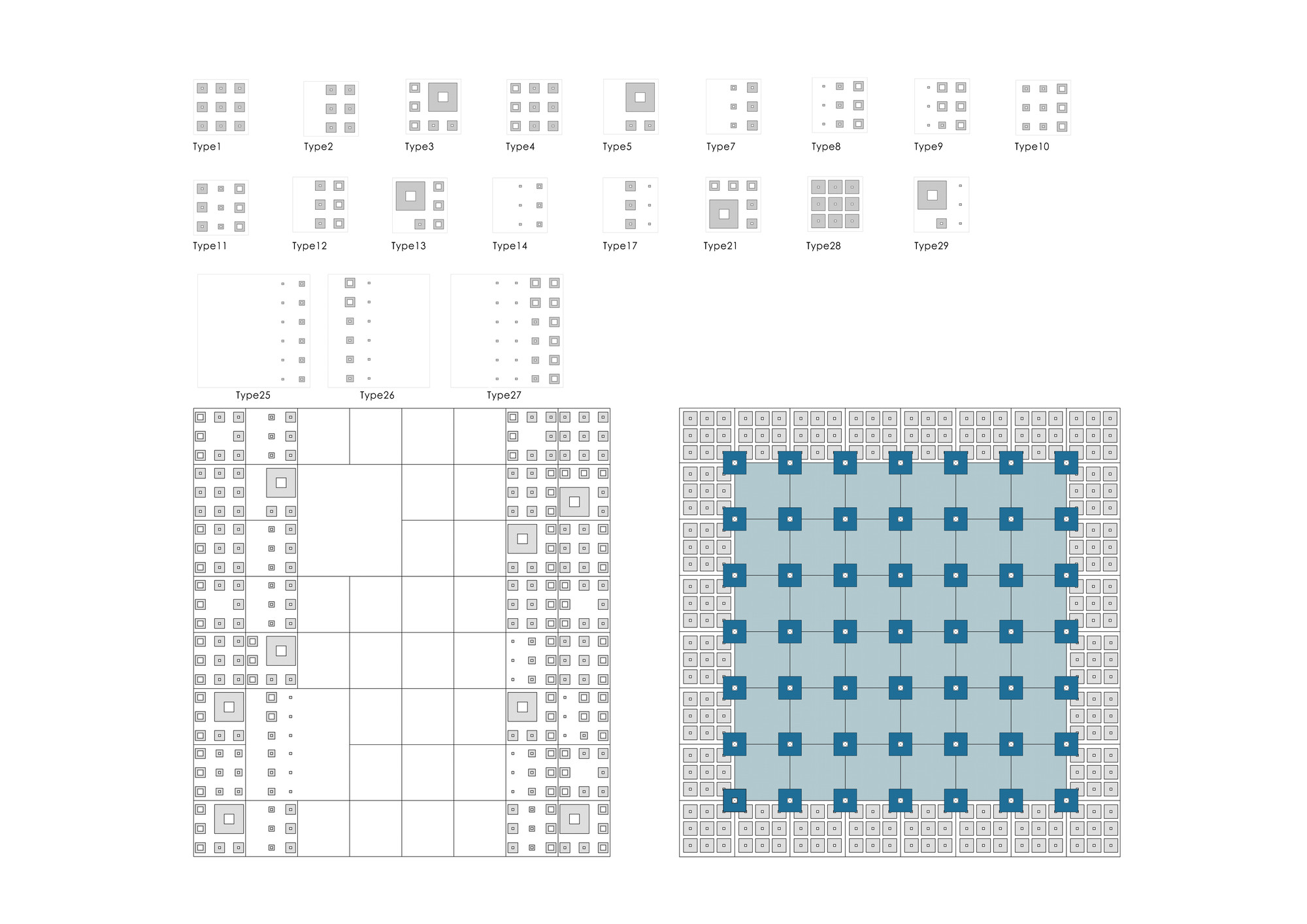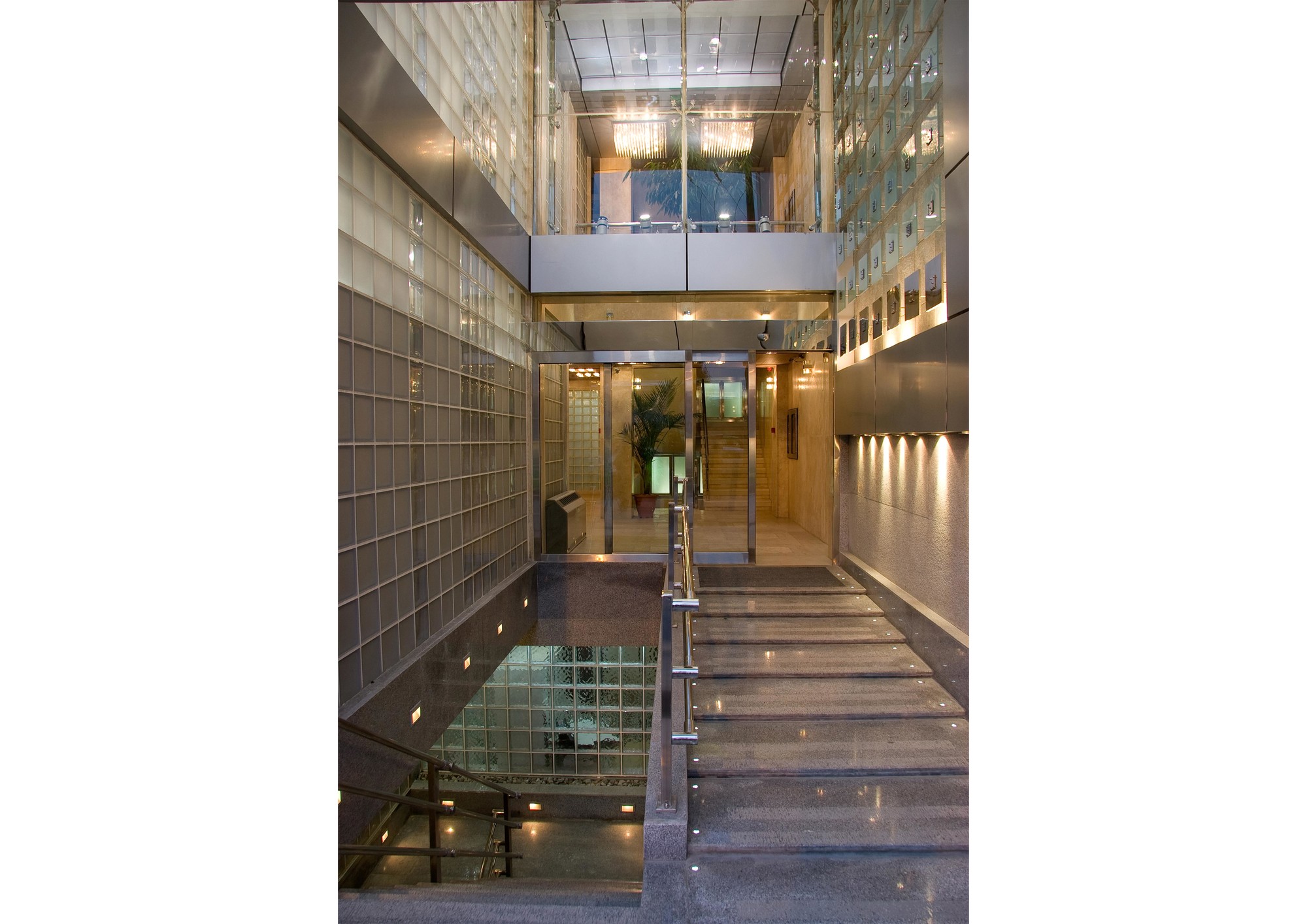 Shah-Karam project is a 16 storey office building with two underground floors dedicated to mechanical equipment, the ground and first floors forming the commercial units, and the upper 12 floors forming the office spaces. Considering the City regulations as well as the nearby public facilities, there was no parking requirement for this building. The client’s desire was to have a variety of office spaces with areas ranging from 50 to 250m2. This strategy divided each floor into 1 to 4 units. Considering the narrow width of the building relative to its height, the overall volume was divided into two sections both horizontally and vertically, defining the commercial and office sections of the building. One of the main design criteria was to maximize the amount of sunlight exposure to the inner part of the building from the main openings on the south and north sides. A series of transparent partitions were implemented parallel to the north-south facades in the form of glass blocks. This strategy not only unifies the exterior facade with the interior dividers, but also provides most of the required light by natural lighting. The main inspiration in the design of the window openings was the Orosi Windows in the Traditional Persian Architecture, in which stained glasses are used to form modular patterns. The glass openings on the facade were formed in two layers, one was the main window layer and the other consisted of blue rectangular glass modules of 30*30 cm connected to the main layer by steel rods. These modules not only control the amount of sunlight penetration but also create a beautiful light and shadow pattern in the interior spaces. In harmony with the glass modules, there is also a modular pattern used on the surface of the main glass layer using sandblast method. This pattern was formed based on the concept of “Expanding Geometry” in the Persian Architecture. Combination of the materials used on the facade reduces the amount of South heat gain up to %40.