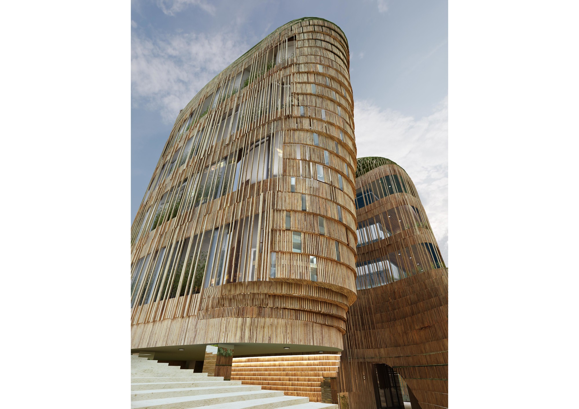 The building typology for this project was set to be a freestanding point tower on a podium. An important criterion here was to create a useful relation between the building and the surrounding landscape, while optimizing the amount of south sunlight exposure. The volumetric concept was initiated following a fluid motion starting from the perimeter of the site and revolving to form the volume of the building. The resulting geometry facilitates the natural ventilation of the units while optimizing the view and sunlight exposure. Following the same idea, the surrounding landscape revolves along the surface, creating a green layer wrapping the glazing behind the louvers on the façade. Vertical wooden louvers were implemented with a varying density to control view and the amount of sunlight exposure. Considering the building height limitations in the area, it was decided to place the lobby one level below ground. Shaped by the overall revolving volume, the entrance of the building invites people to the central open space and the lobby beneath the ground floor.