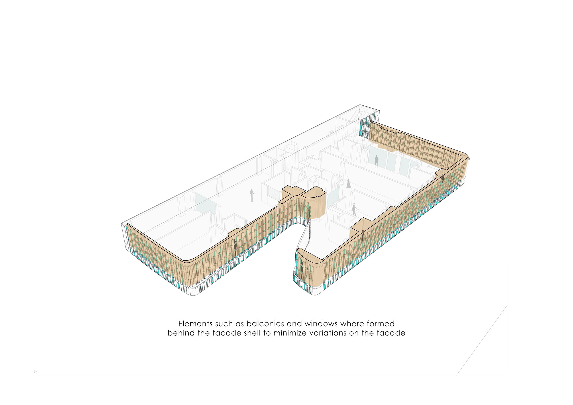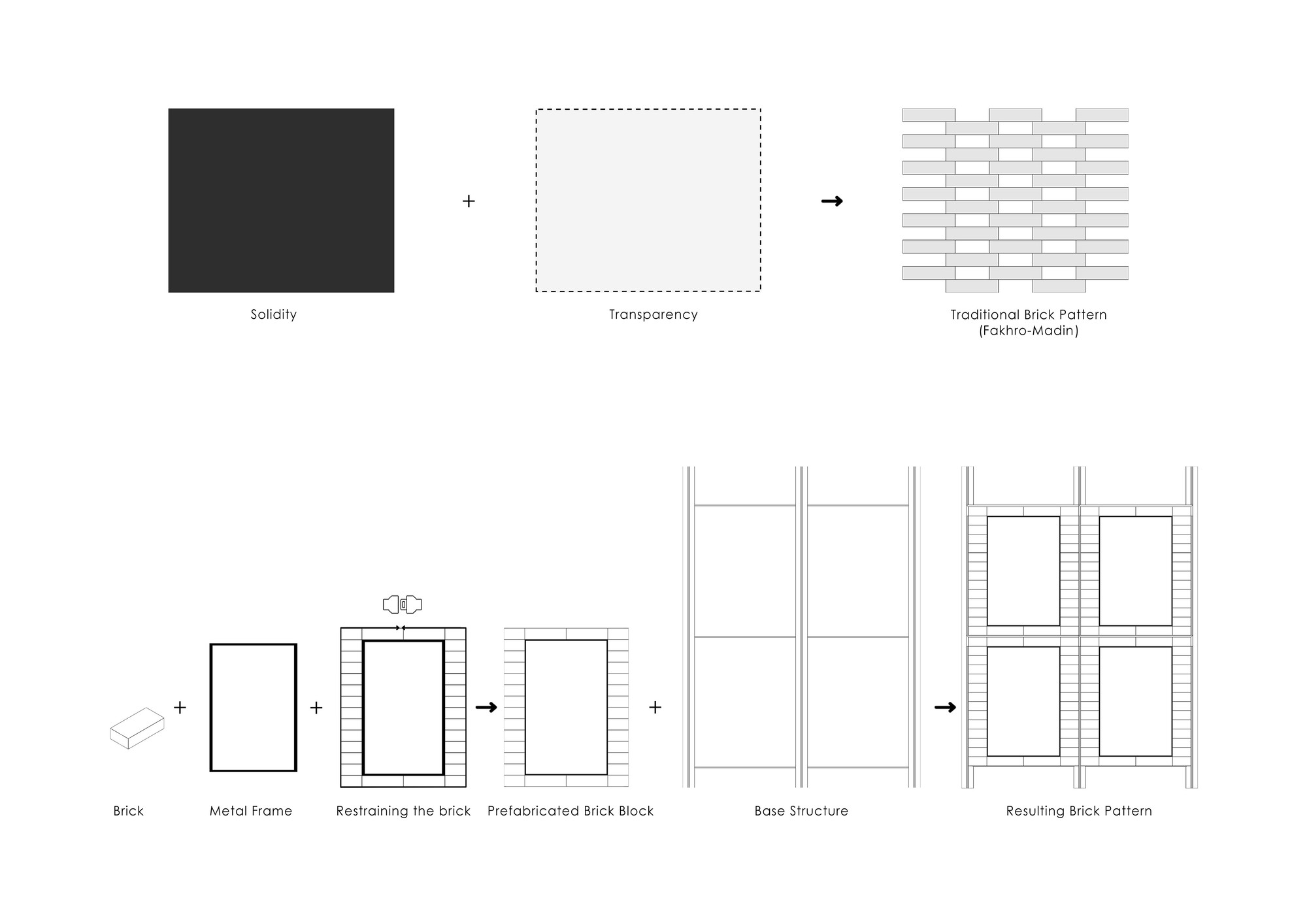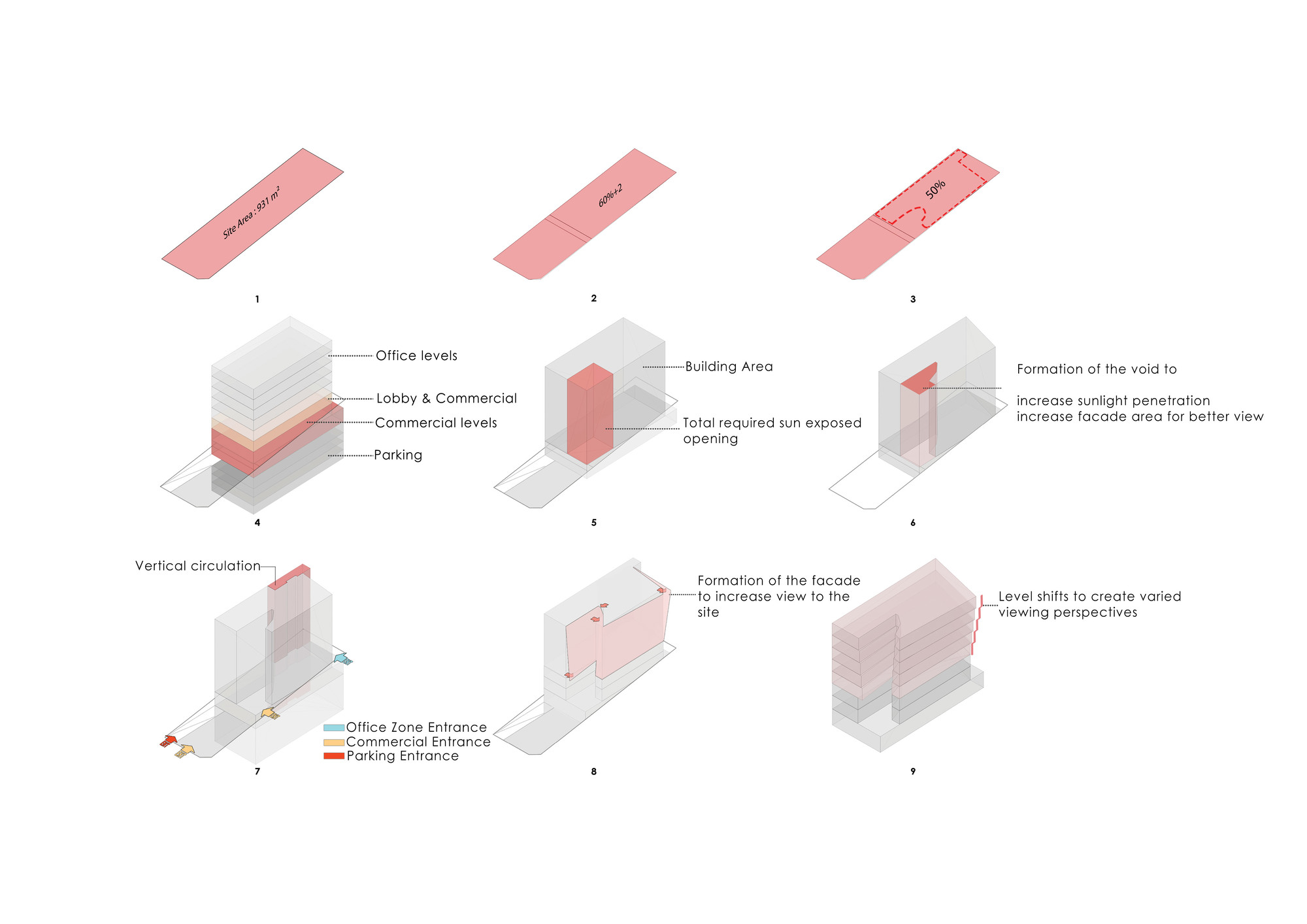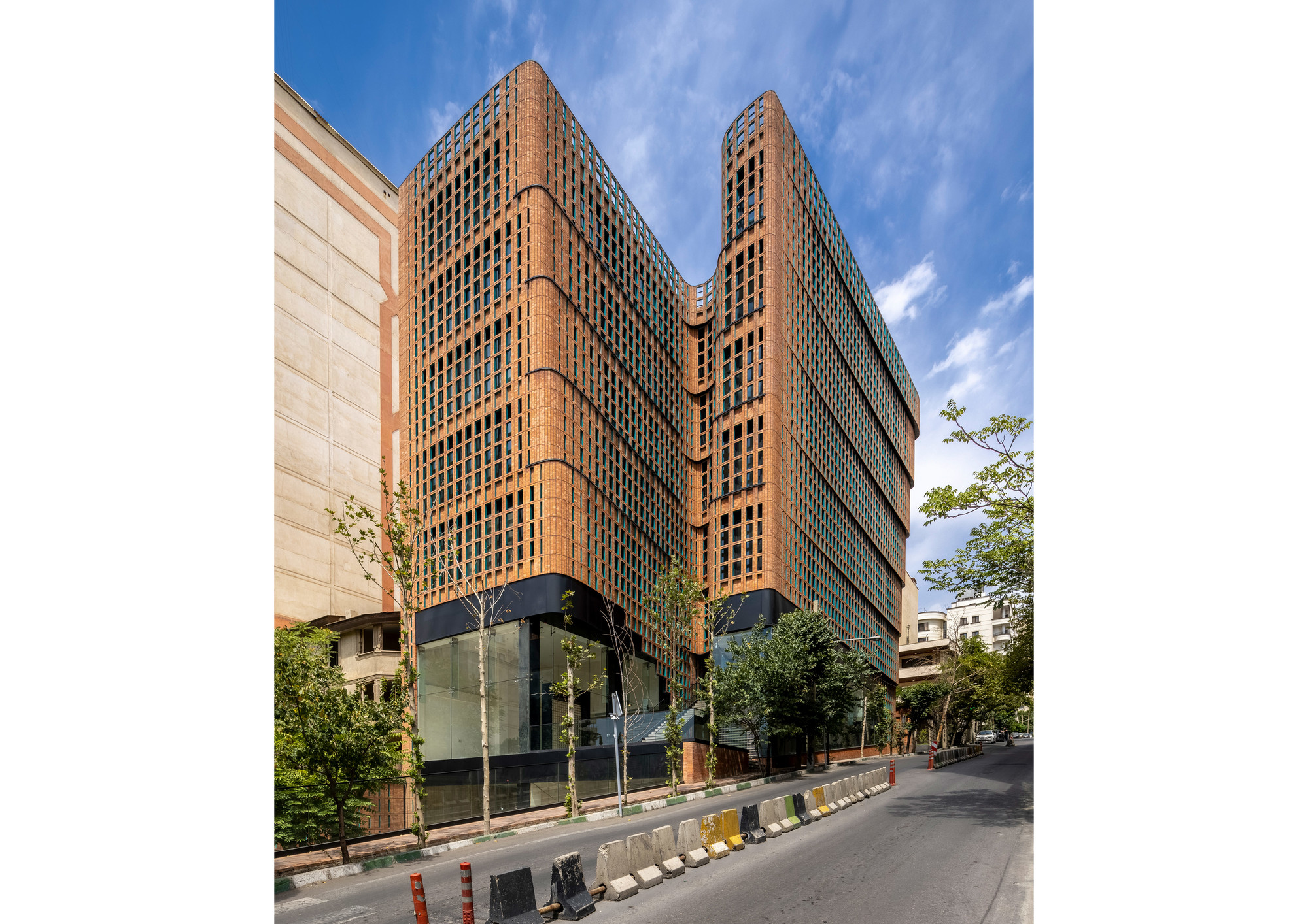 Hitra Commercial-Office Building is located at the intersection of two main streets in the Velenjak neighborhood of Tehran.The major criteria of this project were to reconsider the morphology of a typical office building to enhance the quality of lighting of the space and view without altering the optimum built area of the building.The regulation for office buildings in Tehran dictates that the occupation area of the building should not exceed 60% of the land, while 2 meters can be dedicated to a façade design. also to provide light to the central units it's common to have a vertical void in the central part of the building volume. Moreover, the allowable proportion of glass to other materials used on the façade is 40%.These two regulations were reassessed during the primary investigations of this project to optimize natural lighting and view.The primary volume of the project was formed by relocating the central void to the façade to not only form the main entrance but also provide light and view for the central units. By dedicating this void to the city, the interaction of people and the building has increased through the created welcoming entrance. Based on the before-mentioned regulation to only use 40% glass on the façade to create an integrated volume, the double-skin façade was created with the outer porous skin formed by brick arranged around torques metal frames. The combination of brick and metal frames formed modules creating a gradient opening on the façade. Based on this idea, a homogeneous mass was formed which creates a varying combination of brick and turquoise colors for the viewers based on their location and viewing angle. Moreover, the continuous glass windows on the inner layer of the double-skin allow for proper sunlight penetration to the office units.