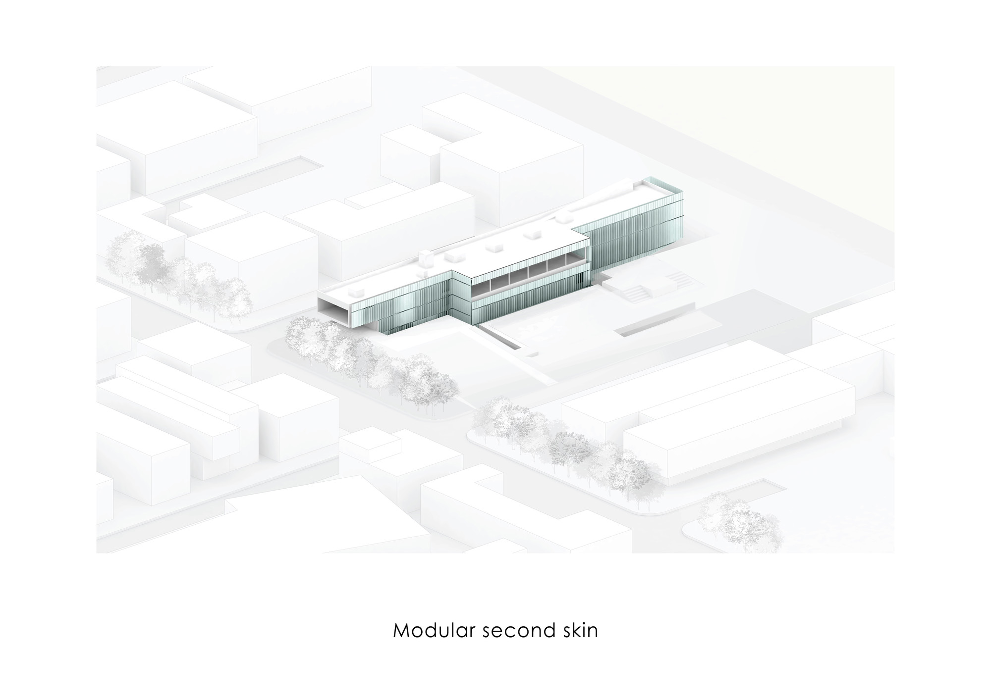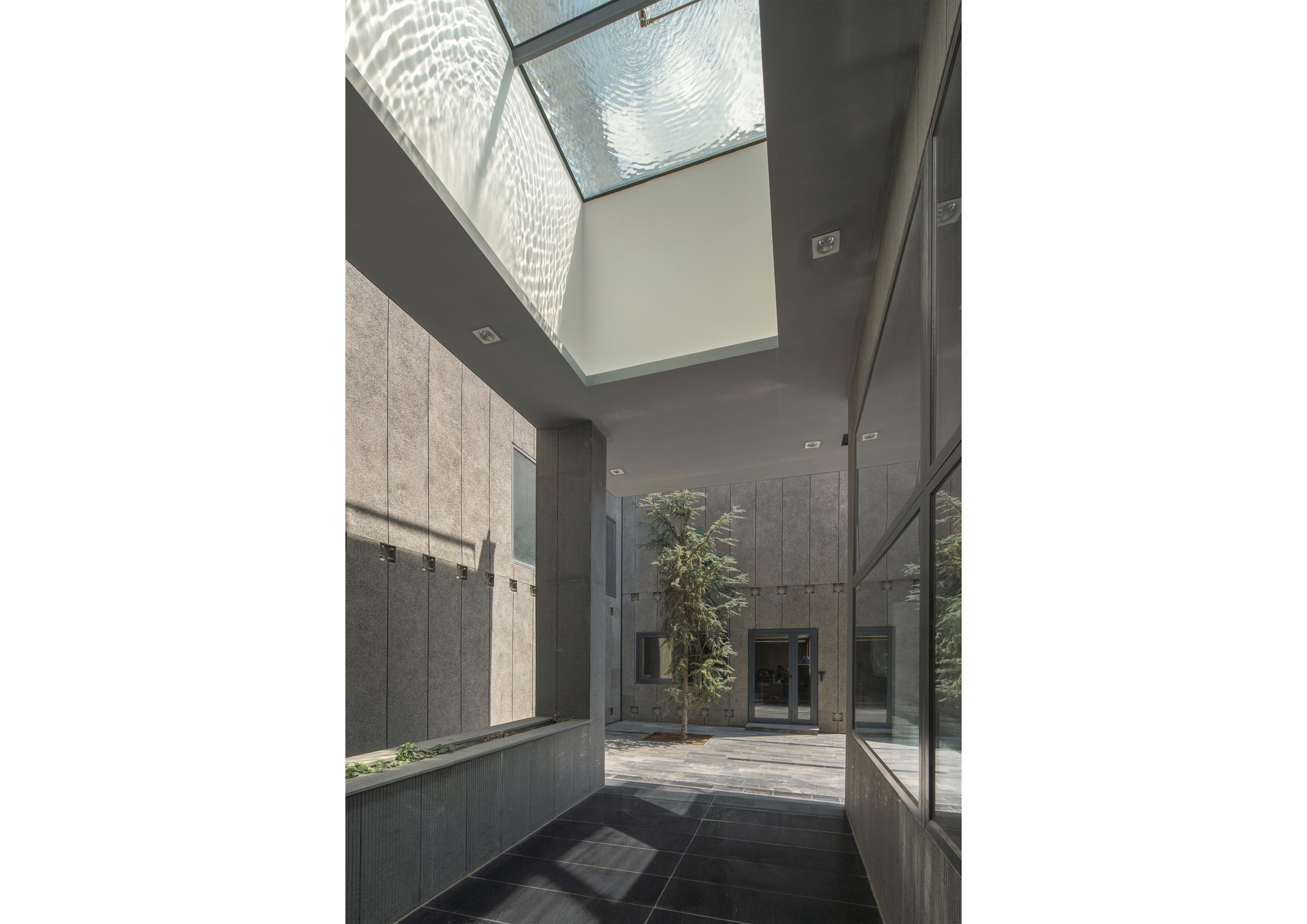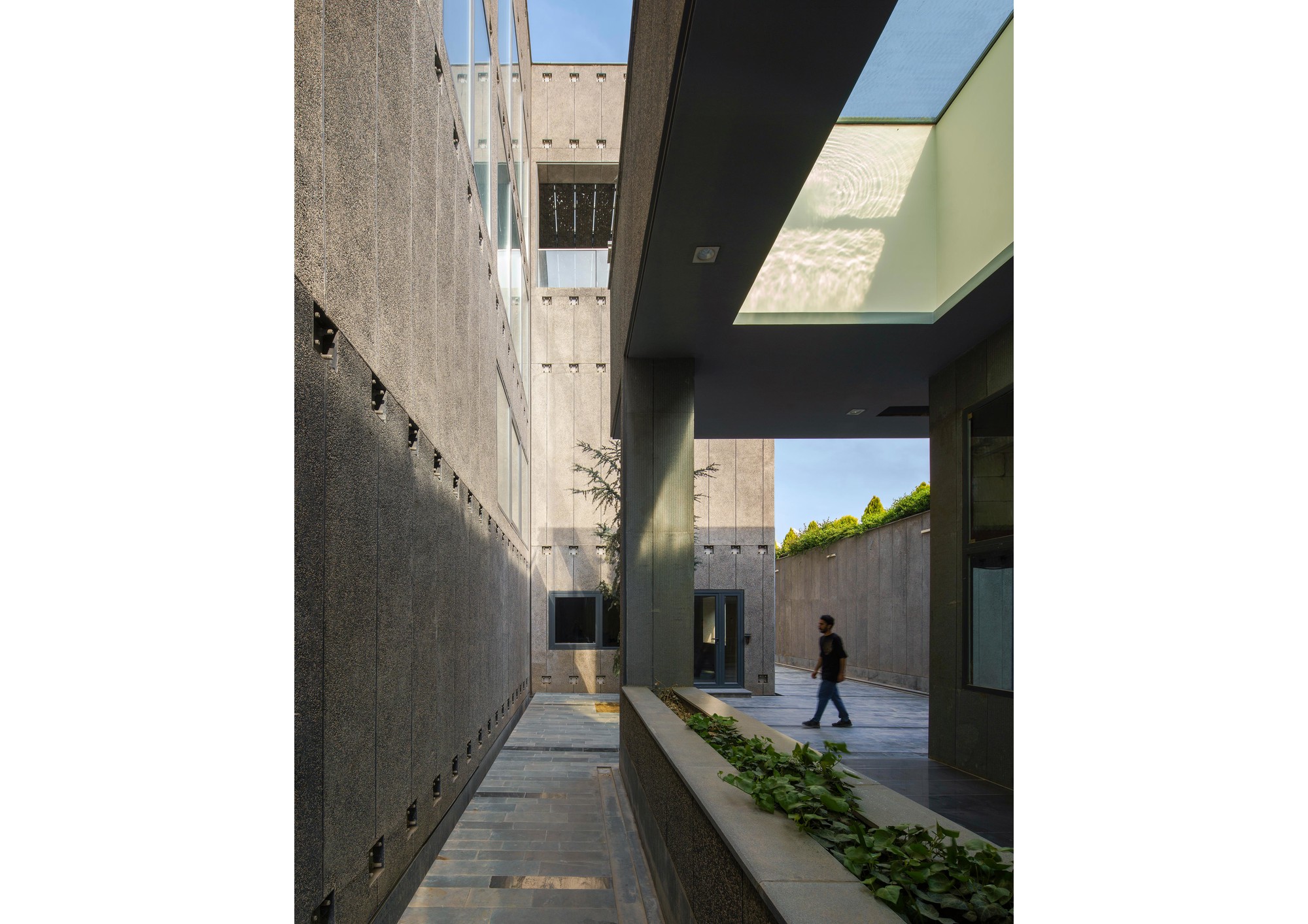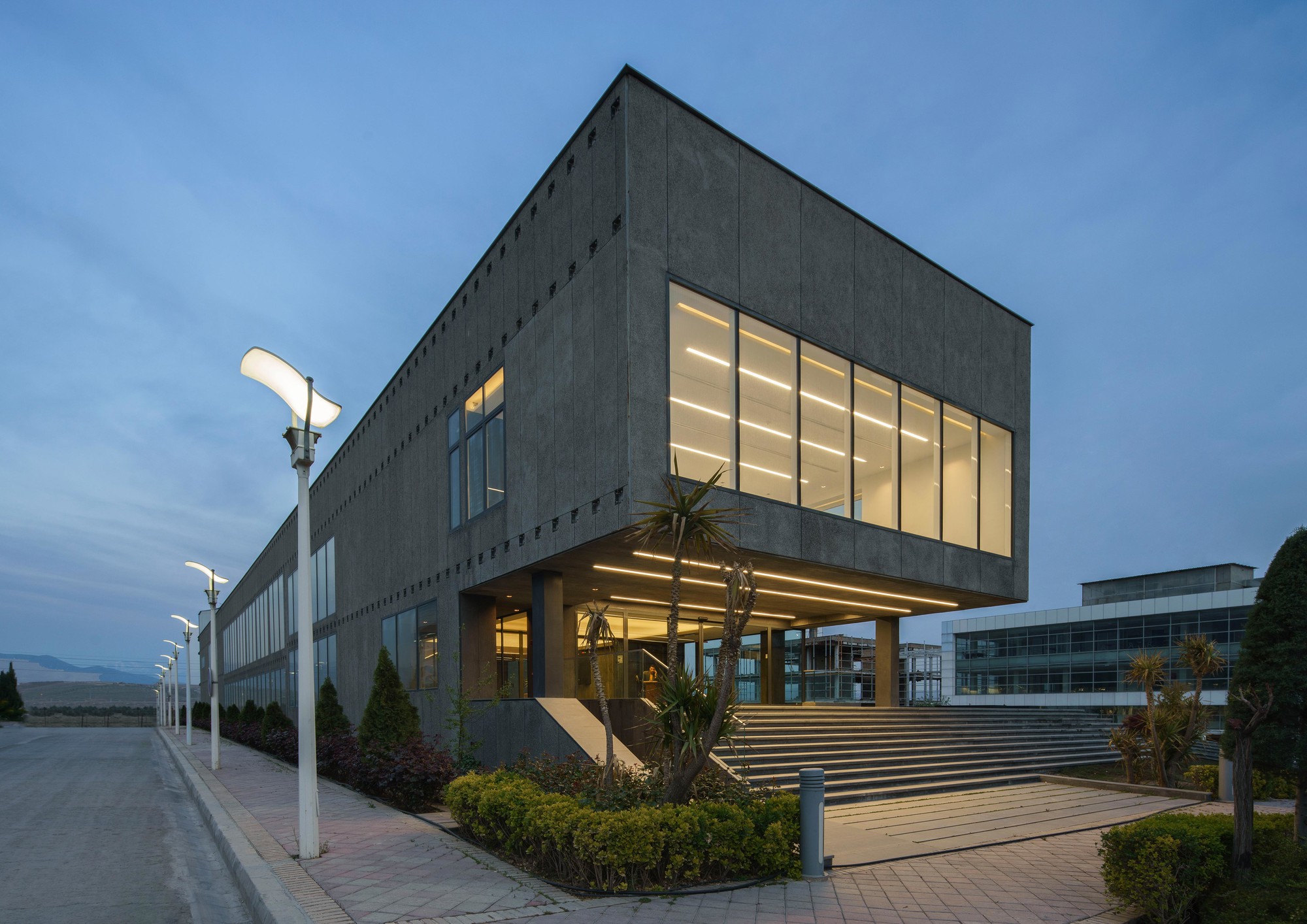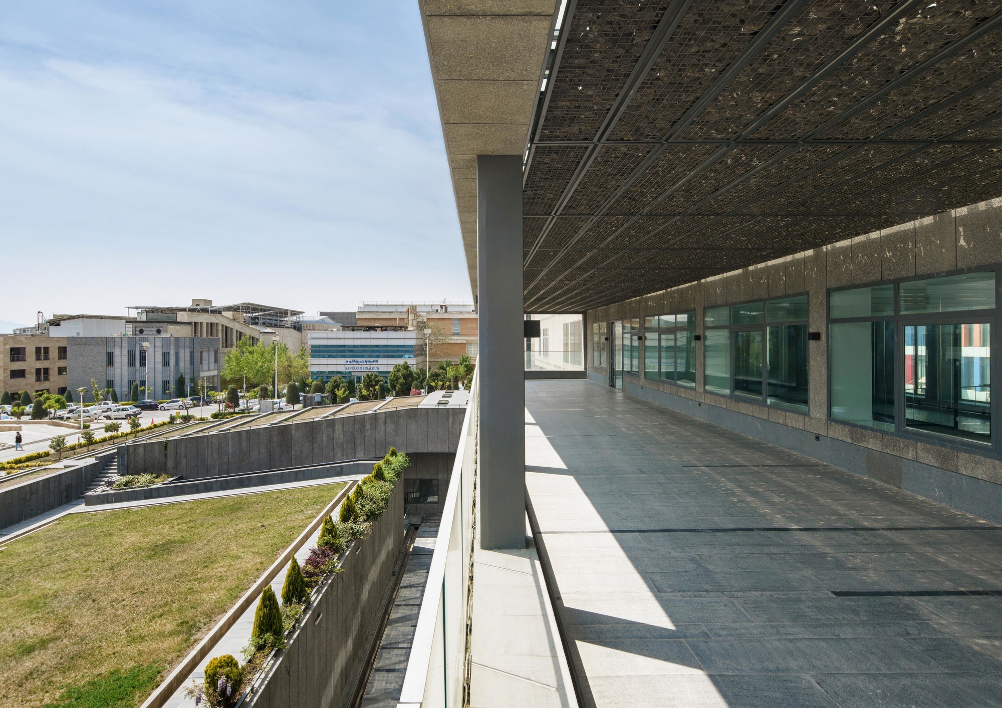 This project was initiated by the EBA[M] Office under the supervision of Mr. Arash Mozafari. Due to some technical issues EBA[M] was unable to continue the supervision of the construction process. Consequently, the built form departed significantly from the original design. HOOBA Team took on the project at this critical stage of the construction process. Considering factors such as: the non-consistent position of the windows, the need for controlling the amount of sunlight exposure, and the desire to form a volumetric consistency, it was decided to create a double layer enclosure for this building. Volcanic crushed stones were used in the form of Gabion panels to form the outer shell of the enclosure. Due to their porous texture, the volcanic stones of the Damavand region are significantly lighter than other stone types, making them an ideal choice for this project. The panels were implemented in different angles depending on weather there is a solid wall or an opening on the main facade. The sunlight penetration through the voids between the stones creates a pleasant atmosphere in the interior spaces. Same type of stone was used in the interior spaces to create harmony between the interior and the exterior of the project and a singular material was used to form the walls and the flooring. The main interior ramp is accompanied by a colored glass wall representing the organizational color of the company. The rest of the interior partitions are also made of opaque and transparent glasses to allow sunlight penetration inside the spaces. An adjoining volume was decided to be added to the building. This volume was formed underground providing the entire roof area available for satellite implementation. The surrounding landscape was integrated with the building to form a continuous whole and to maximize the viewing angles around the site. The assembly hall, the parking, and the storage are all parts of the underground space which is accessible using the lowered platforms called “Garden-Pit” in the Persian Architecture. These platforms also provide the required light and ventilation for the underground spaces.