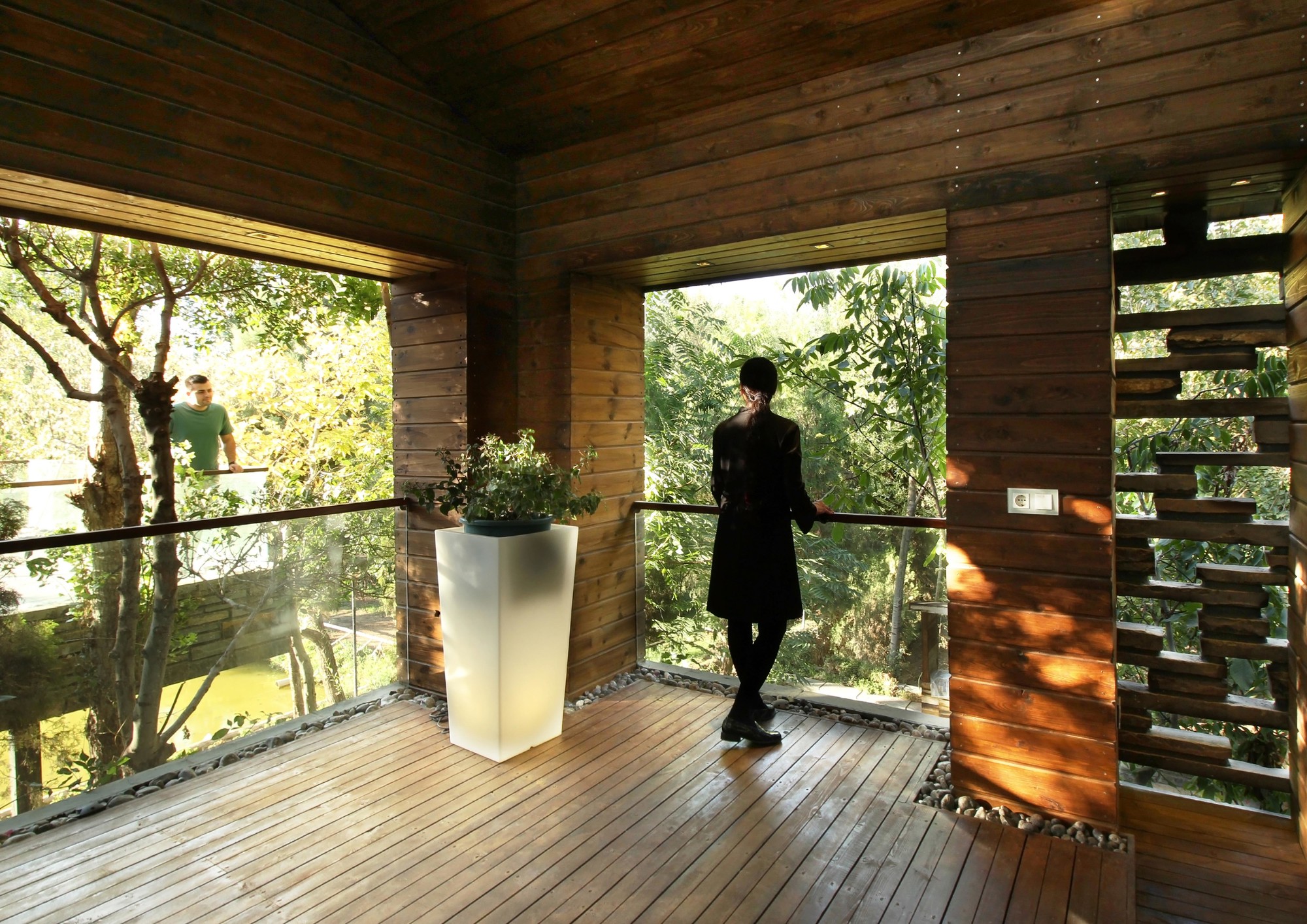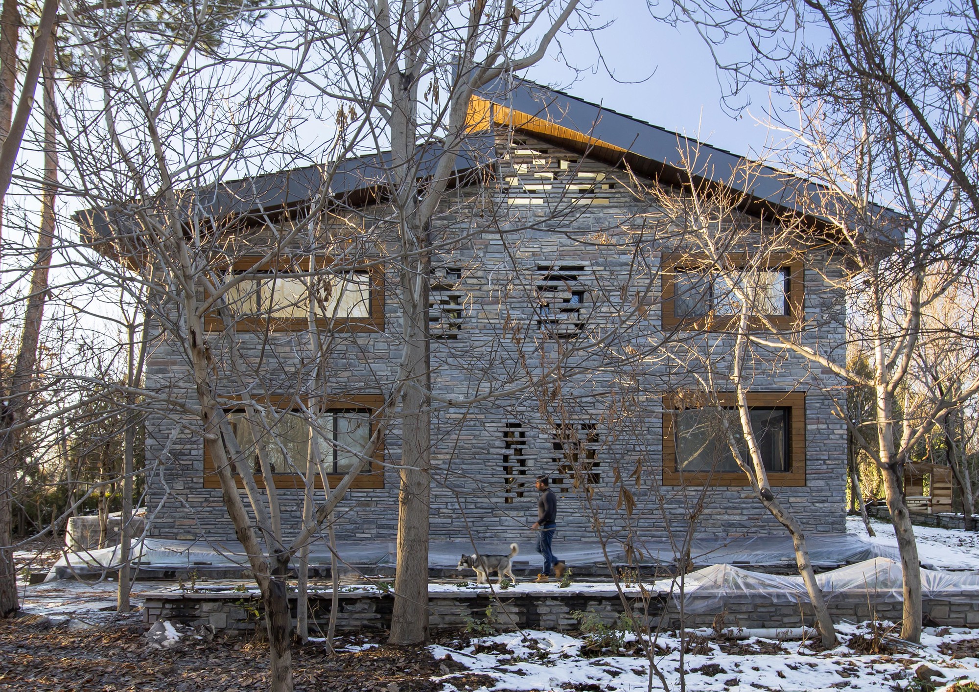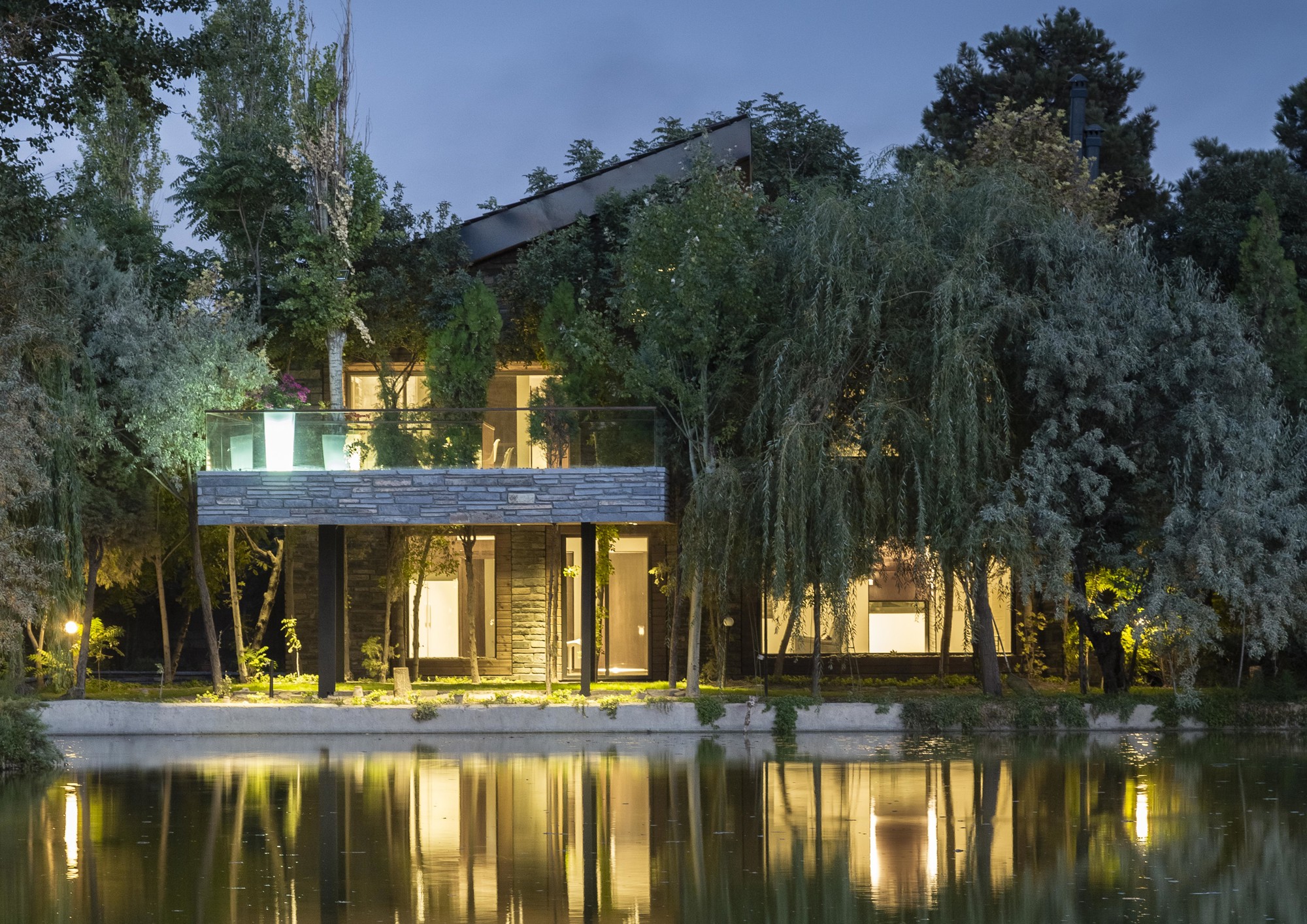 The Initial idea of this project was to design a 330 m2 villa in a 3 hectares private yard facing a lake. One of the main criteria was to create spaces that are closely engaged with the surrounding landscape, an uninterrupted connection between the interior and the exterior to form a structure which becomes a part of the site itself:A. A systematic organization of open and semi-open spaces was used to enhance the presence of nature in the interior spaces. The main semi-open space is a void on the first floor of the main cubical form. The strategic position of this void provides both physical connection to the private lounge and the master bedroom as well as visual connection to the lake. The semi-open space is also connected to the terrace on the lake side by the means of a bridge. This terrace is a perfect view point of the lake.B. The stones used on the façade are in harmony with the existing stones in the garden. These stones are used in their natural form but in a controlled horizontal pattern. The voids in the stone pattern provide a controlled overlook and a limited sunlight penetration to spaces such as washrooms and corridors which require less exterior exposure. Integration of the voids and solids not only creates a consistent exterior façade, but also provides the interior spaces with a view to the greenery. At nights these voids provide a lighter feeling of the solid exterior façade. These voids are also used to naturally ventilate the building as well as to implement the mechanical equipment.C. The existing trees between the open and semi open spaces were kept so that both spaces are surrounded by vegetation. The variation of sunlight penetration through the leafs during the day significantly enhances the quality of the atmosphere.One of the main criteria in the design process was to maximize the amount of sunlight exposure. Two sets of skylights were implemented, one over the main staircase and the other at the vertical gap between the two roofs. Moreover, transparent dividers implemented parallel to the vertical skylight increase sunlight penetration to spaces not directly connected to the skylight. The main function of the horizontal skylight over the main staircase was to provide natural winter heating. This skylight could be shaded in summer to prevent excess sunlight exposure. In section, these systems enable sunlight penetration in three directions: vertical, horizontal, as well as diagonal.