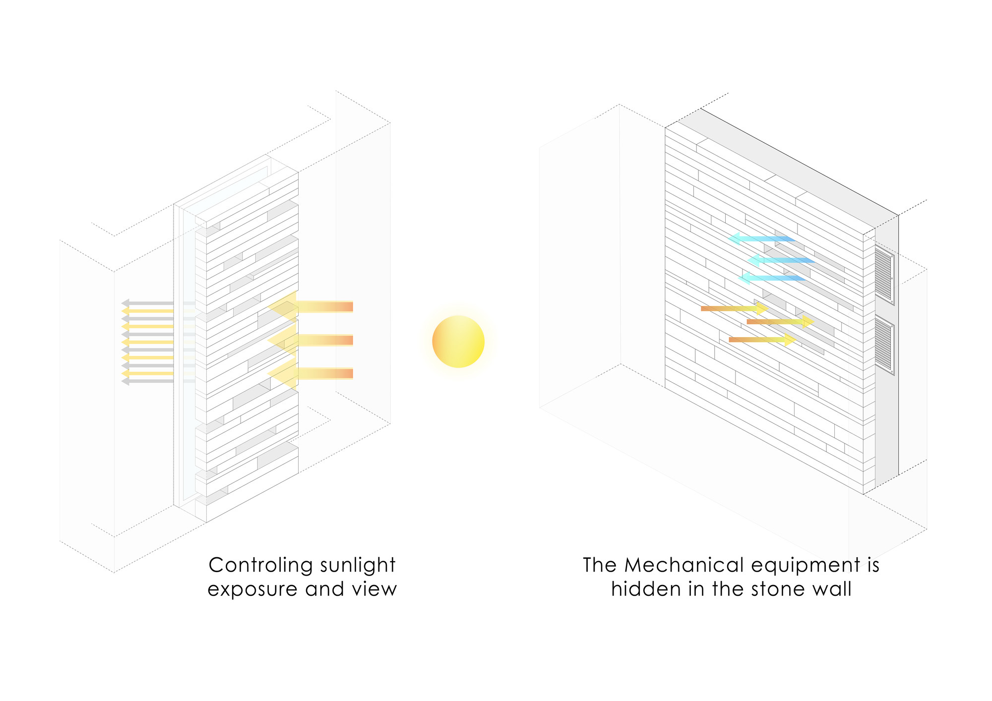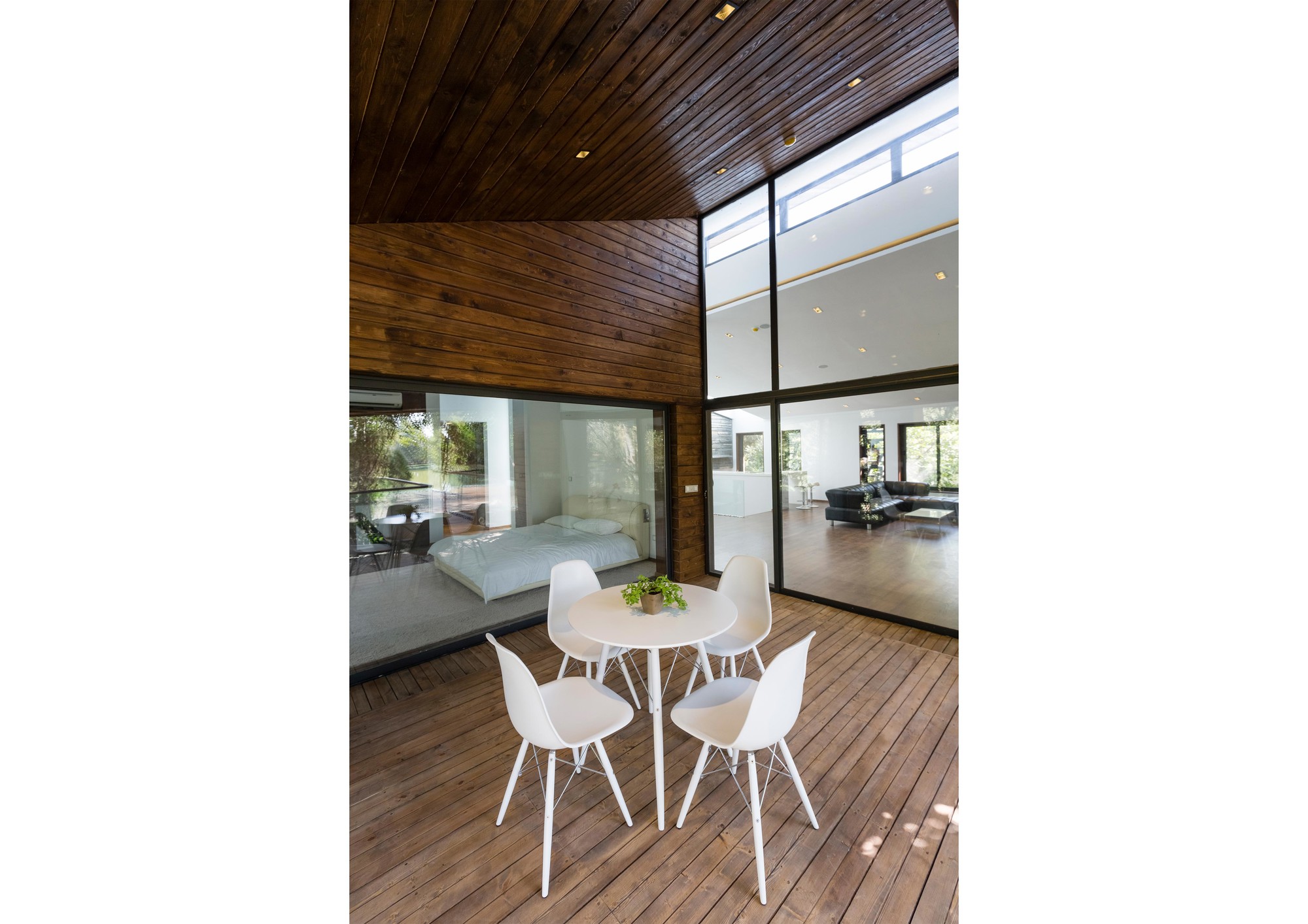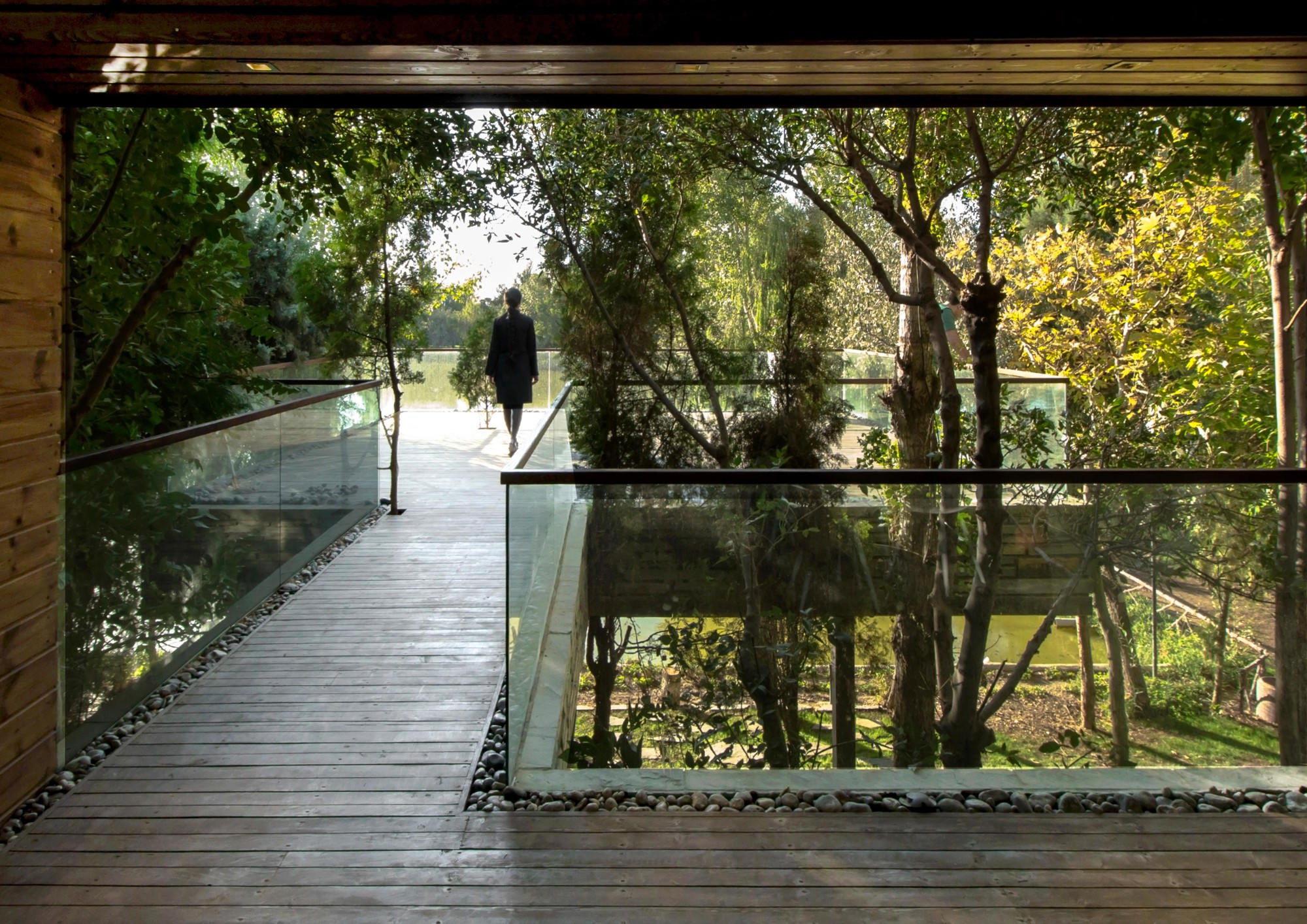 The Initial idea of this project was to design a 330 m2 villa in a 3 hectares private yard facing a lake. One of the main criteria was to create spaces that are closely engaged with the surrounding landscape, an uninterrupted connection between the interior and the exterior to form a structure which becomes a part of the site itself:A. A systematic organization of open and semi-open spaces was used to enhance the presence of nature in the interior spaces. The main semi-open space is a void on the first floor of the main cubical form. The strategic position of this void provides both physical connection to the private lounge and the master bedroom as well as visual connection to the lake. The semi-open space is also connected to the terrace on the lake side by the means of a bridge. This terrace is a perfect view point of the lake.B. The stones used on the façade are in harmony with the existing stones in the garden. These stones are used in their natural form but in a controlled horizontal pattern. The voids in the stone pattern provide a controlled overlook and a limited sunlight penetration to spaces such as washrooms and corridors which require less exterior exposure. Integration of the voids and solids not only creates a consistent exterior façade, but also provides the interior spaces with a view to the greenery. At nights these voids provide a lighter feeling of the solid exterior façade. These voids are also used to naturally ventilate the building as well as to implement the mechanical equipment.C. The existing trees between the open and semi open spaces were kept so that both spaces are surrounded by vegetation. The variation of sunlight penetration through the leafs during the day significantly enhances the quality of the atmosphere.One of the main criteria in the design process was to maximize the amount of sunlight exposure. Two sets of skylights were implemented, one over the main staircase and the other at the vertical gap between the two roofs. Moreover, transparent dividers implemented parallel to the vertical skylight increase sunlight penetration to spaces not directly connected to the skylight. The main function of the horizontal skylight over the main staircase was to provide natural winter heating. This skylight could be shaded in summer to prevent excess sunlight exposure. In section, these systems enable sunlight penetration in three directions: vertical, horizontal, as well as diagonal.