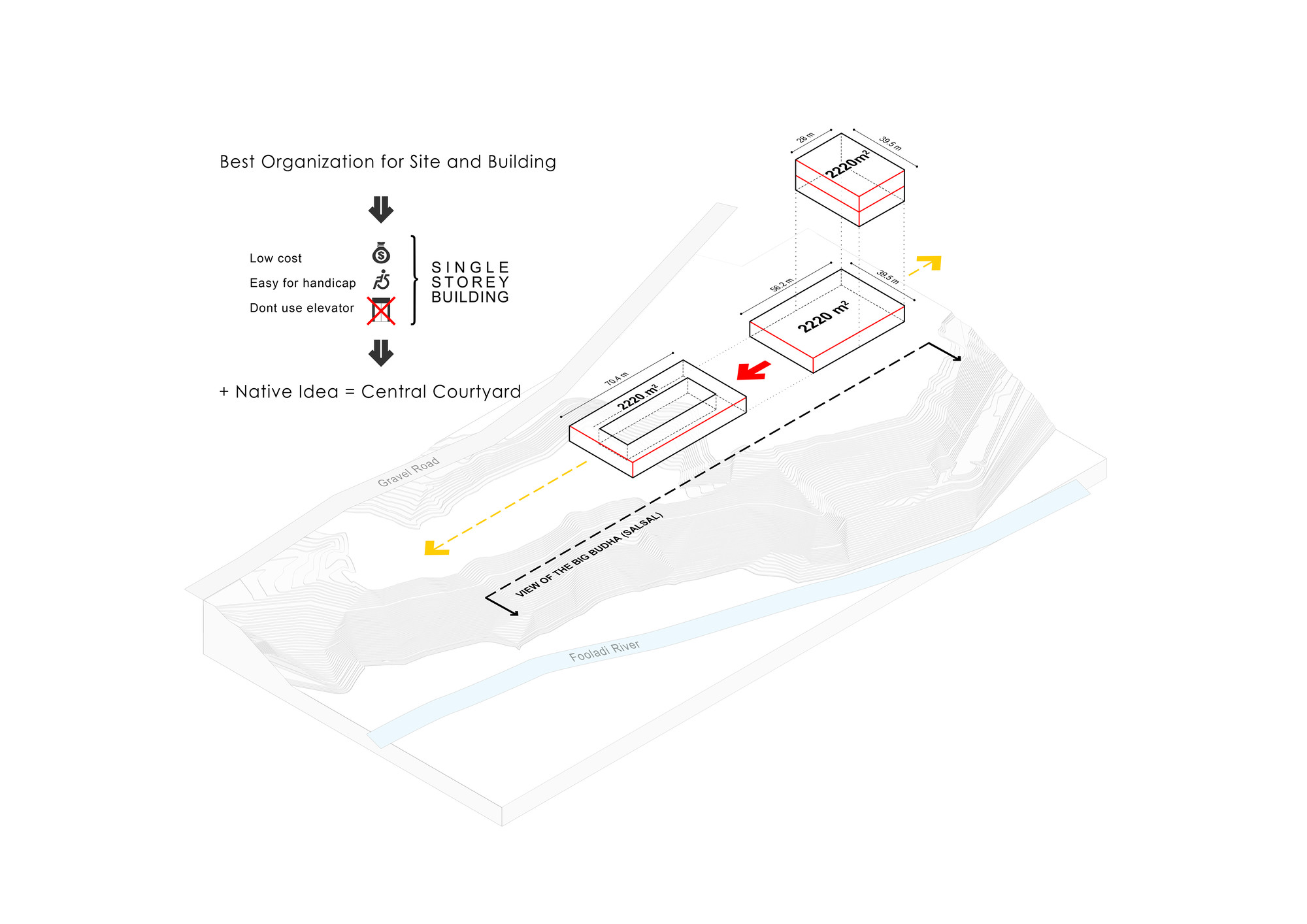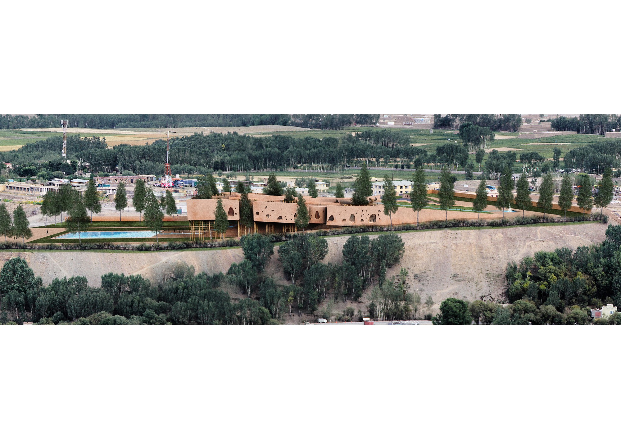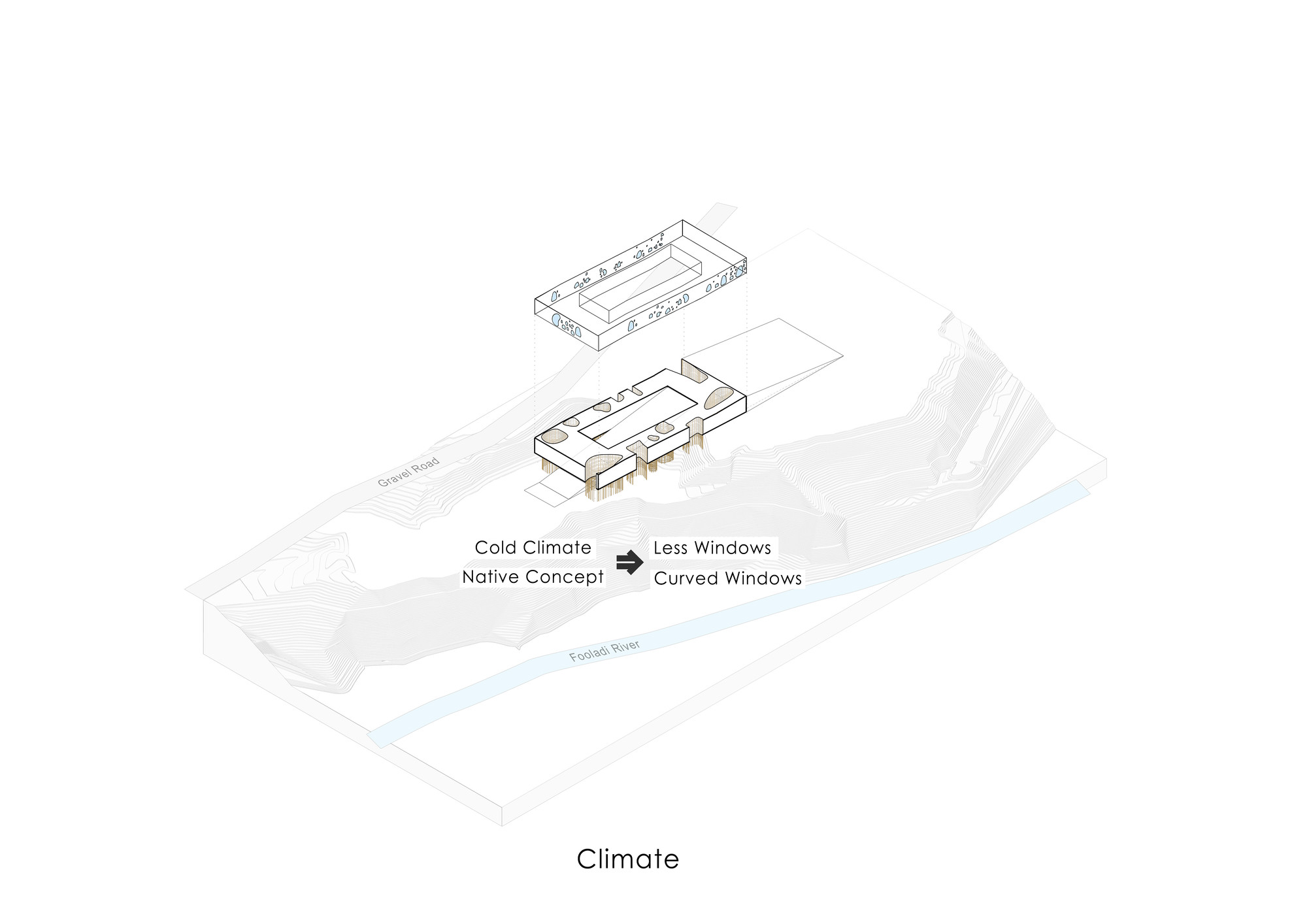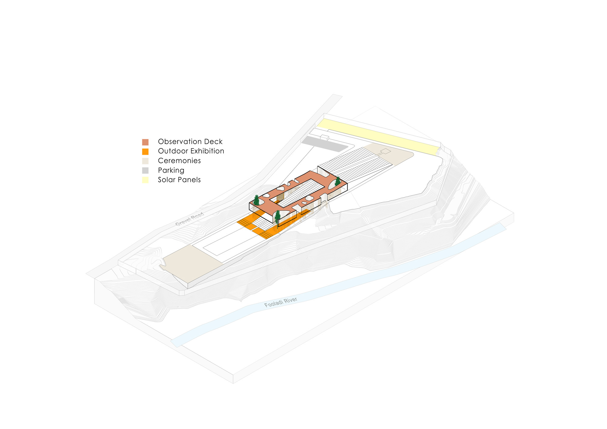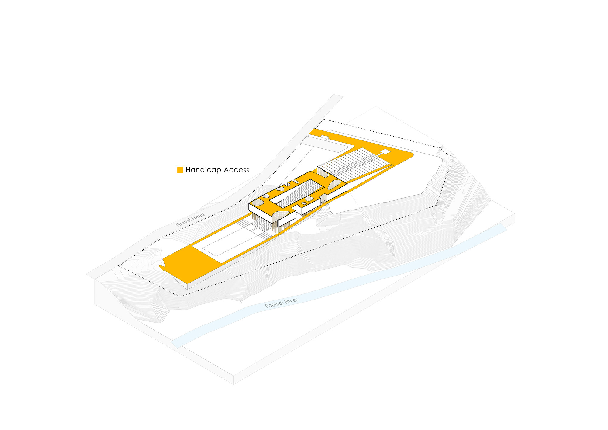 The aim of this project was to create a cultural-environmental platform to connect and unify people with the garden and the valley. In an attempt to bring hope to the people of Afghanistan, the main objective of this design was to create a Garden with a positive impact on the cultural context of the Bamiyan Valley. Project goals: 1. To respect the domestic cultural values and to introduce them at an international level 2. To respect the ecology of the Bamiyan Valley 3. To use local construction materials, technology and labour 4. To shape the design idea according to the functional and social requirements, considering local methods and climatic conditions 5. To promote cultural values and increase motivation and hope for Afghan people by creating a city garden Concept Idea Inspired by the form of the Babur Garden in Kabul, the project was formed along a linear diagram expanding from South-West to North-East (reminding of the ancient Silk Road), parallel to the Buddha Cliffs. This axis was integrated with a water path to form the interior and the exterior parts of the project. An introverted courtyard model was used to form the main building and to connect it to the ground. The amphitheatre at the centre of the complex rested on the existing topography to minimize the amount of required excavation. The roof of this section creates a platform for the outdoor amphitheatre. Another criterion was to integrate the building with the site. Inspired by the carvings of the Buddha Cliffs, the negative and positive spaces of this project were formed to: • Integrate the building with the green spaces • Create event spaces which organize interior and exterior spaces at the same time • Provide natural ventilation and lighting • Form the building structure The structural columns were designed to be flexible against earthquakes. These columns also play an important role in the formation of varying light and shadow patterns during the day. At night, this effect is reversed by the solid baked mud walls and the porous wooden frames. Functional Idea Interior spaces: There are 5 main zones creating the interior spaces of the project. These zones are connected through a central circulation path, providing a low cost barrier free access to the entire interior spaces of the project. One zone includes the lobby, the coffee room, and the office spaces, while another one contains the gallery spaces. This zone also acts as the divider of the two adjacent spaces. The third zone created the teaching spaces and the conference room, while the fourth zone included the research spaces, the studios, as well as the practice room. Last but not least, zone five forms the central amphitheatre with a main entrance, a barrier free access on the ground level, as well as an emergency exit at the below ground level. Site: The circulation diagram was established based on the garden axis, defining social activities in three sections: 1. The platform on the roof of the main building, providing 360o panoramic view of the site and the Bamiyan Valley. 2. The staircase on the roof of the interior amphitheatre creating an outdoor amphitheatre on top. This platform is also used as the vertical circulation path connecting the ground level to the underground. 3. The exterior gallery spaces enabling outdoor exhibitions and activities. Materials and Construction Techniques The structure of the building includes a combination of mud walls and double layers of woven wood bars to reduce heat convection to the exterior. These layers rest on top of a network of imported timbers connected to a core composed of local lumber and imported timbers which transfer the loads to the brick foundation of the building. An area on site was dedicated to the implementation of solar panels in order to provide the required electricity. Moreover, a row of high density local trees were planted on the main axis to reduce the amount of wind exposure. In conclusion, the idea of this project was to combine sustainable architecture with vernacular techniques considering the existing economical and climatic limitation.