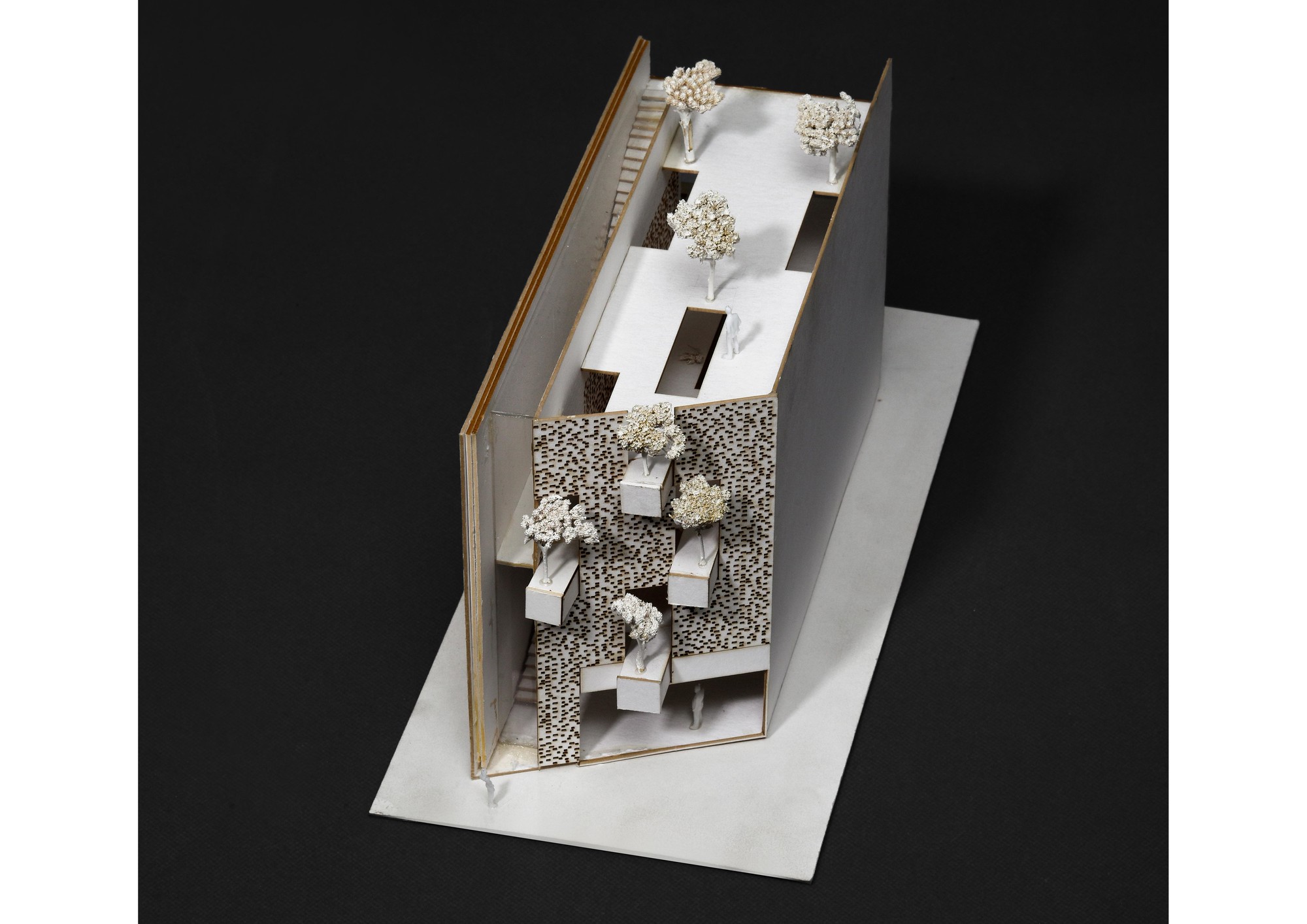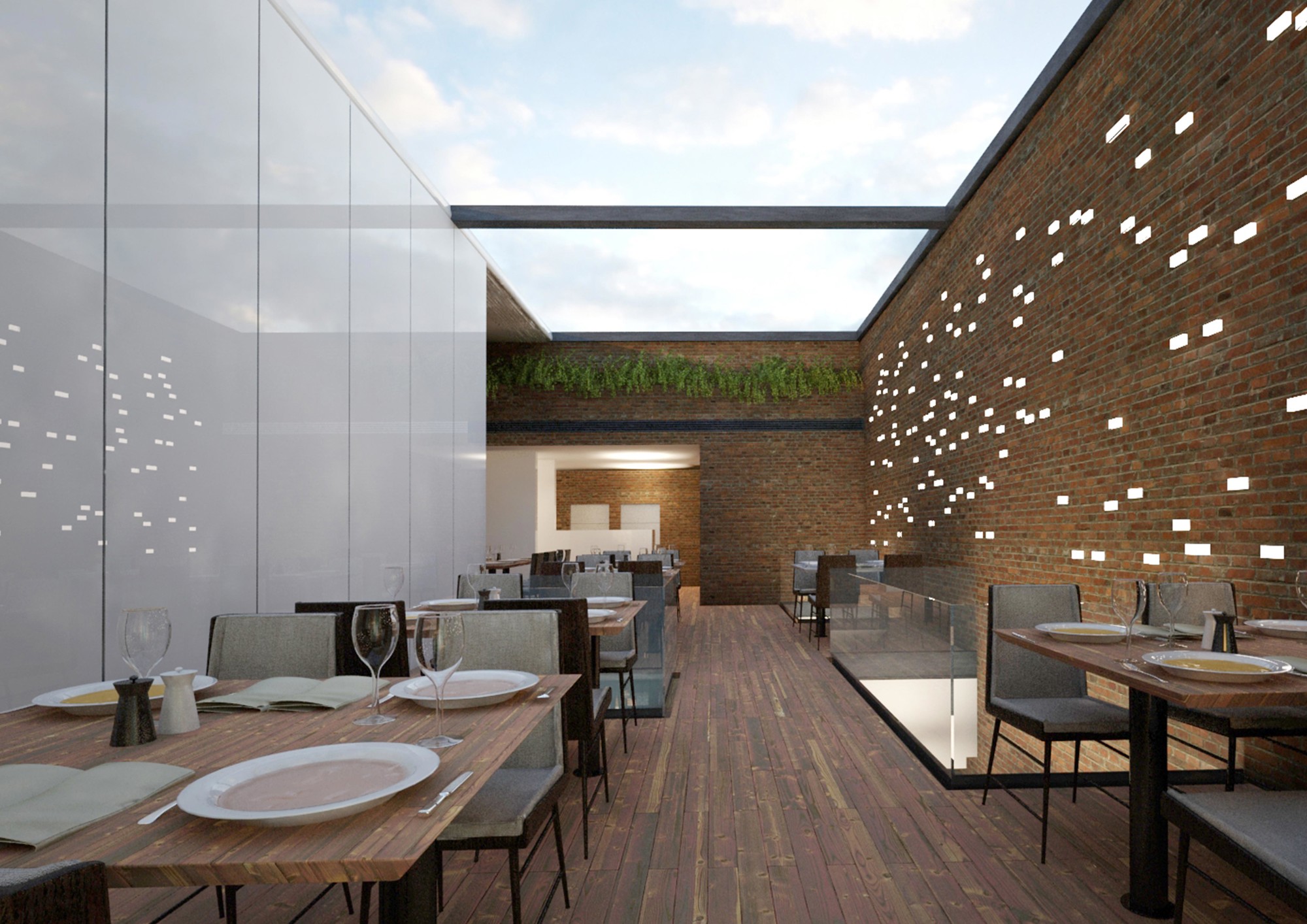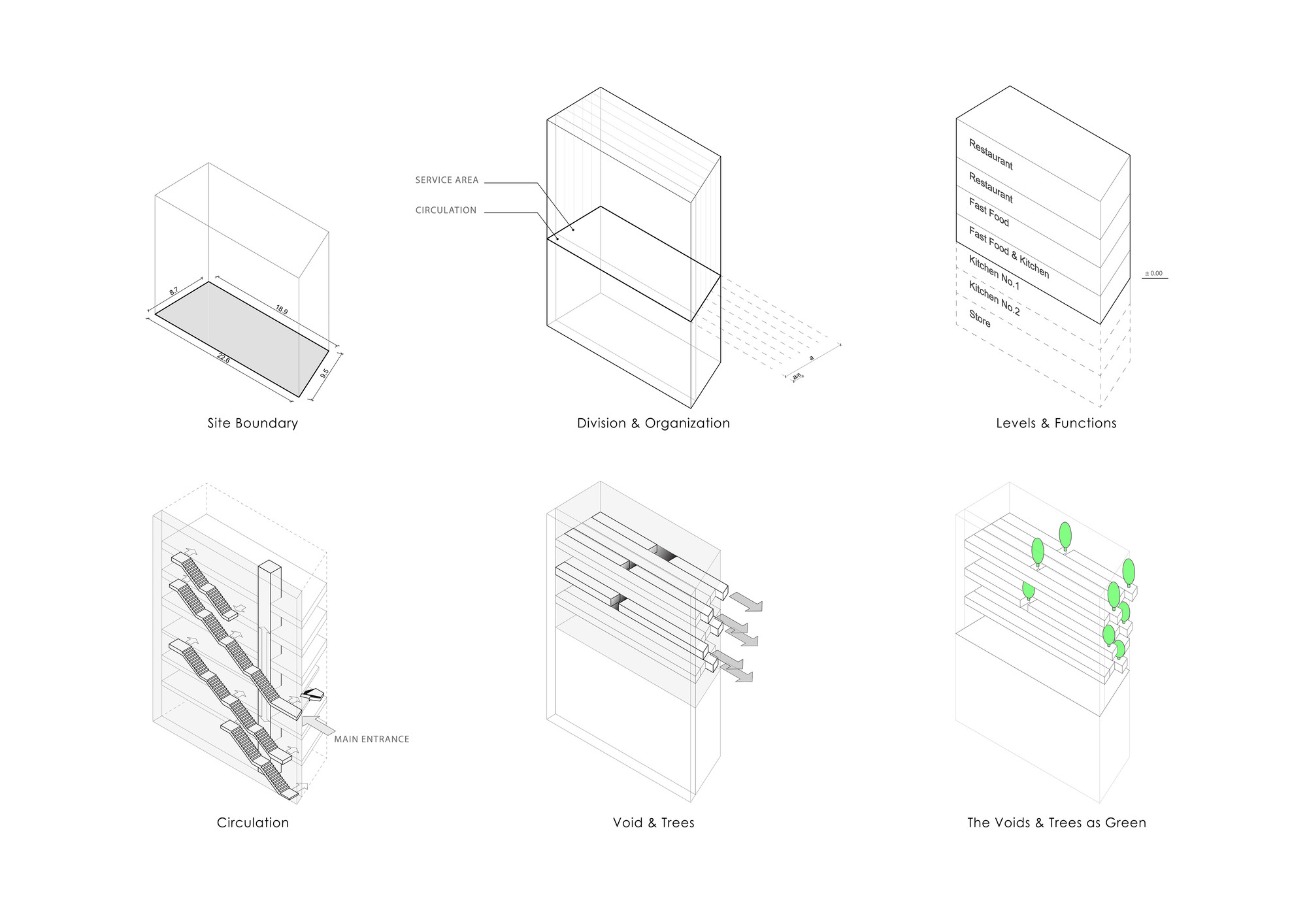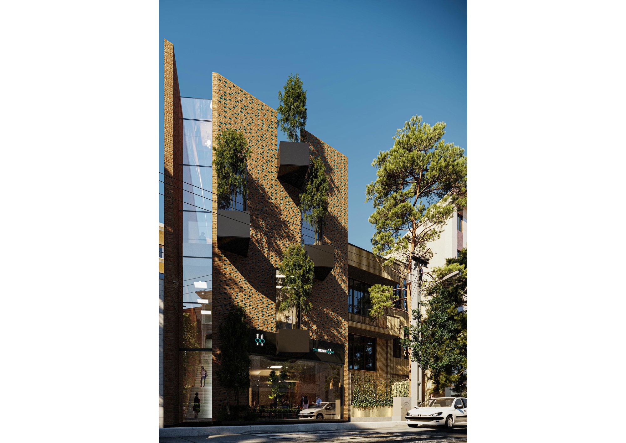 Situated in one of the social hubs of Qom city, this project serves as a restaurant complex with two stories dedicated to fast food and two stories dedicated to a fine dining. Taking into account the function of the building and the narrow width of the site, the idea was to create a spatial division which forms both the interior and the exterior of the project while provides access, seating area, as well as green spaces. The main criteria was to design spaces for people to dine surrounded by greenery and to create a joyful atmosphere full of green space and a pleasant presence of natural light. Working in sections and plans simultaneously, a series of voids were implemented to allow sunlight penetration in different interior spaces and to create dining areas in between green zones. Regular modules define different functions throughout the building, such as the main staircase which occupies one module. These modules define not only the seating areas but also the green spaces which contain trees at the exterior section. This project attempts to create identity in the social culture of the city by using the garden productions in the recipe used in the restaurants. These trees create a vertical garden on the façade, providing a pleasant view for the customers in the restaurants. A combination of brick and glass was used to form both the exterior and the interior enclosures. Bricks were organized in patterns with small gaps in some sections to allow sunlight penetration into the building. The artificial lighting of the project was also designed based on this pattern. In section, the created voids enable view from the sidewalk to different floors of the building. The roof top of the building is also a semi open space which could be closed by a folding fabric roof during the hot hours of the day.