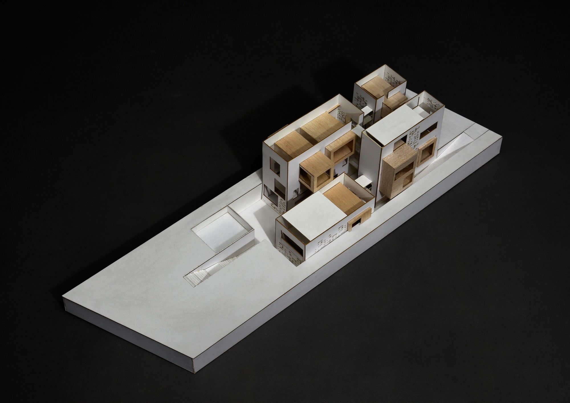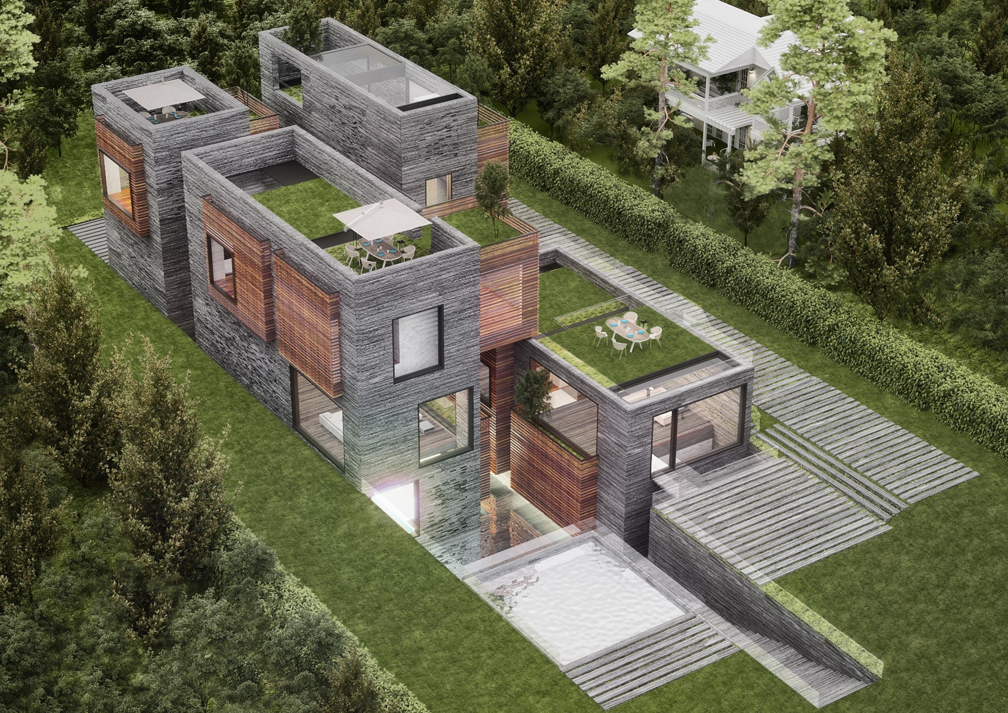 Designing a villa is a great opportunity for each architect to explore personal ideologies in architecture. In this project the investigations included combination of dual qualities such as: structure and the façade, private and public spaces, as well as open and closed spaces. This villa was part of a bigger project consisting of four villas in Lavasan, Iran. Therefore, it was decided to follow a singular strategy for all four villas, which was to use the “Three squares and four spaces” geometry. Four volumetric spaces were defined as the main structure and space organizer. These four volumes were shifted over each other to maximize view and integration with greenspaces. These volumes form the public spaces of the villa. In addition to the main volumes, there are some cubical boxes floating inside the spaces, defining the private spaces of the house. The main volumes include openings on the surface to create connection to the exterior greenspaces. This villa was designed on three levels, basement, ground floor, as well as first floor. Different levels of the building were organized to have maximum connection to each other. On the basement level, there is an in-ground garden with a water pool with visual connection to the interior space of the house. Moreover, at the ground and first floors, there is a volumetric connection between the public, the private, and the landscape of the project. Here the organization of the interior and the exterior was established by the surface openings and the created spaces in between the volumes.