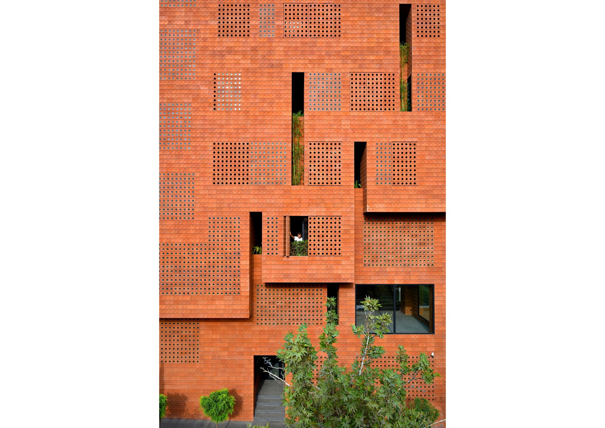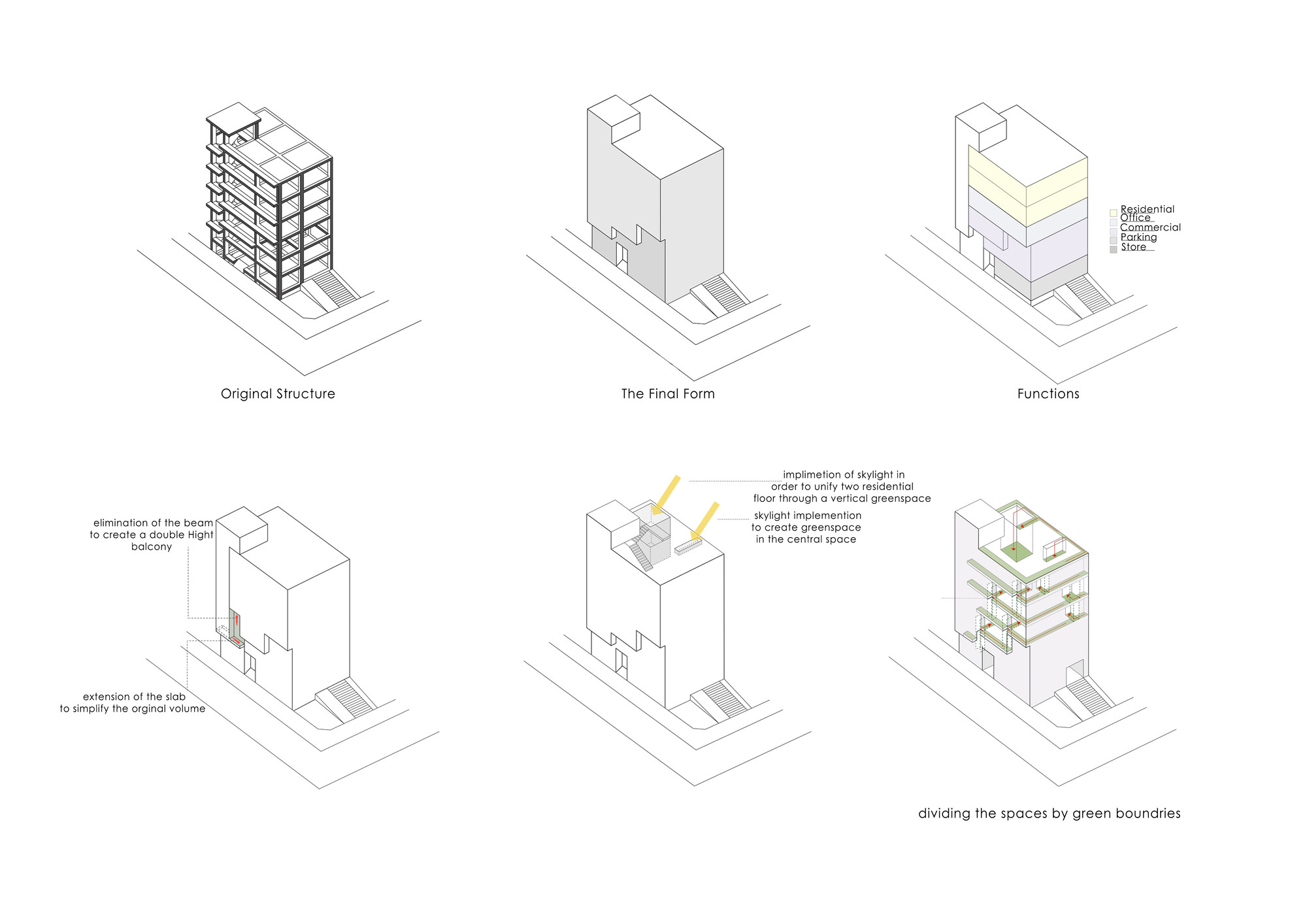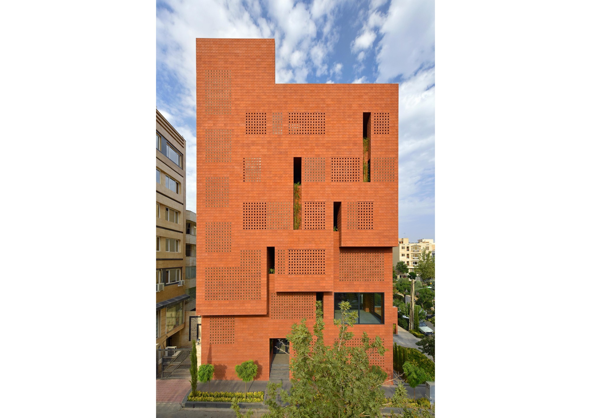 Is it possible to unify the urban scenery by minimizing the formic expression of buildings as singular objects and emphasizing on the city as a whole? Unitizing different elements of the building including walls, windows, doors, etc., as well as reducing the variety of building materials could somehow address the so called issues. The project was designed as the headquarters for Kohan Ceram Brick Manufacturing Company. Preserving the existing concrete structure, it was decided to Design a special brick (by architect) to represent the factory. Now the question is, could this well-known building material move beyond its simple role and help changing the perceptions towards a complicated building and to combine different building elements to reach a new phenomenon? How could we reduce the visual disturbance in the urban scenery by introducing weak forms as building objects? The story of Kohan Ceram building was started when a new modular creature was formed called the “Spectacled Brick”. This little guy had transparency and solidity in one piece and could see the city from within. It worked as the masonry, the finishing, and the insulation at the same time but still wanted to be more than that. The Spectacled Brick not only formed the exterior façade, but also transformed from a surface into a volume which extended into the building in the form of modular greenspaces. Replacing ordinary walls and windows, these modules defined different spaces in the building. Therefore, the interior walls were formed by the extension of the exterior walls, following the main design criteria which was to merge dual qualities. Bringing the natural lighting inside spaces in a mysterious way, the Spectacled Brick delayed the perceptions towards the building. It made the building both introverted and extroverted during day and night. It strictly banned other materials to take part in the making of the building and always kept loyal to its geometry. Penetration was the favorite notion for the Spectacled Brick. Making use of its semi-transparent nature, it merged the exterior with the interior to fade the boundary between the two. The spectacled brick was aware of the ventilation and light exposure benefits caused by the penetration of exterior to interior and used this technique to organize spaces inside the building. The spectacled brick integrated building qualities such as interior and exterior, introversion and extroversion, façade and space, transparency and solidity, natural and artificial lighting, to create a new phenomenon which not only carries features form both components, but also introduces new values to the system. Therefore, design challenges were resolved by merging these dual components into unique elements. It also used this homogeneity to address the programmatic requirement of the project which included both commercial and residential spaces. It tried to expand the commercial aspect of the brick showroom to the exterior and eventually to the city. Therefore, the transitional role of the building as a complex of spaces in the building scale and a commercial object in the urban scale was formed. Net Zero Operation CarbonRadiation and solar heat gain is controlled by a passive system, using operable brick louvers. Users can control daylighting and temperature by adjusting the shades. With a 60cm gap from the first layer, the second layer of the façade contains the main window openings for natural ventilation. This system significantly reduces building energy demand. The lighting system in this building is equipped with motion sensors. Moreover, the cooling/ heating system consists of ceiling fan coils with separate operational systems in each zone, equipped with sensors detecting the human presence to turn on or off. All of these systems have a great impact on reducing energy consumption in the building. Good Health and WellbeingIn some parts of the building the façade has been extended to the interior spaces, forming deep voids (up to 5m) inside the spaces to bring in natural light and ventilation. The air entering these voids gets filtered by the vegetation in the flower boxes along the void length to become fresh and less polluted. Approximately 70 m2 of total floor area of the building has been dedicated to greenspaces. These greenspaces significantly affect the quality of life by filtering and moistening the air in the dry and polluted climate of Tehran. On the south and west facades where sunlight exposure is higher than normal, the brick-glass modules capture the excess sun energy and allows an optimized amount of light and heat to enter the building. Statistics show that 67% of the total building area is within the Useful Daylight illuminance (UDI) range. The brick used in this project is recyclable, has minimum effect on the ecosystem, and is cheaper to maintain in the climatic condition of Tehran. Some of the interior spaces have been separated by glass partitions to create visual connection and to allow better sunlight penetration.