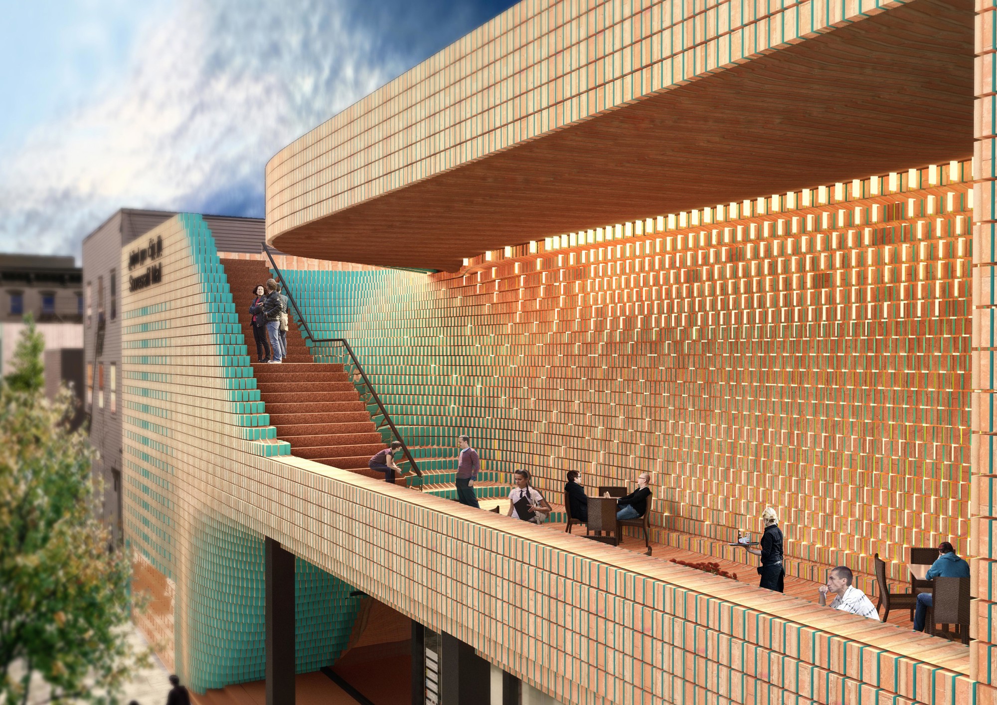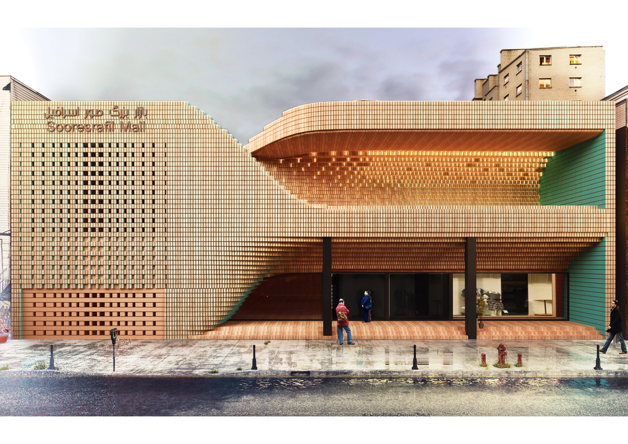 This project consisted of the façade retrofit of Sour Esrafil Shopping Centre in Tehran with the aim of revitalizing the performance of the center. The design idea was to move beyond creating a two dimensional façade and to create connection between the internal activities of the Shopping center and Sour Esrafill Road. Following this idea, a social platform was created in the form of a balcony on the façade. This balcony is a place for people to stay and hang out, and is accessible from inside the shopping center to boost the popularity of the commercial units. As part of the overall concept, the rooftop of the building was connected to the balcony as the continuation of the social platform. The brick and torques ceramics used in this project were selected based on the common materials used in the traditional fabric of the surrounding context.