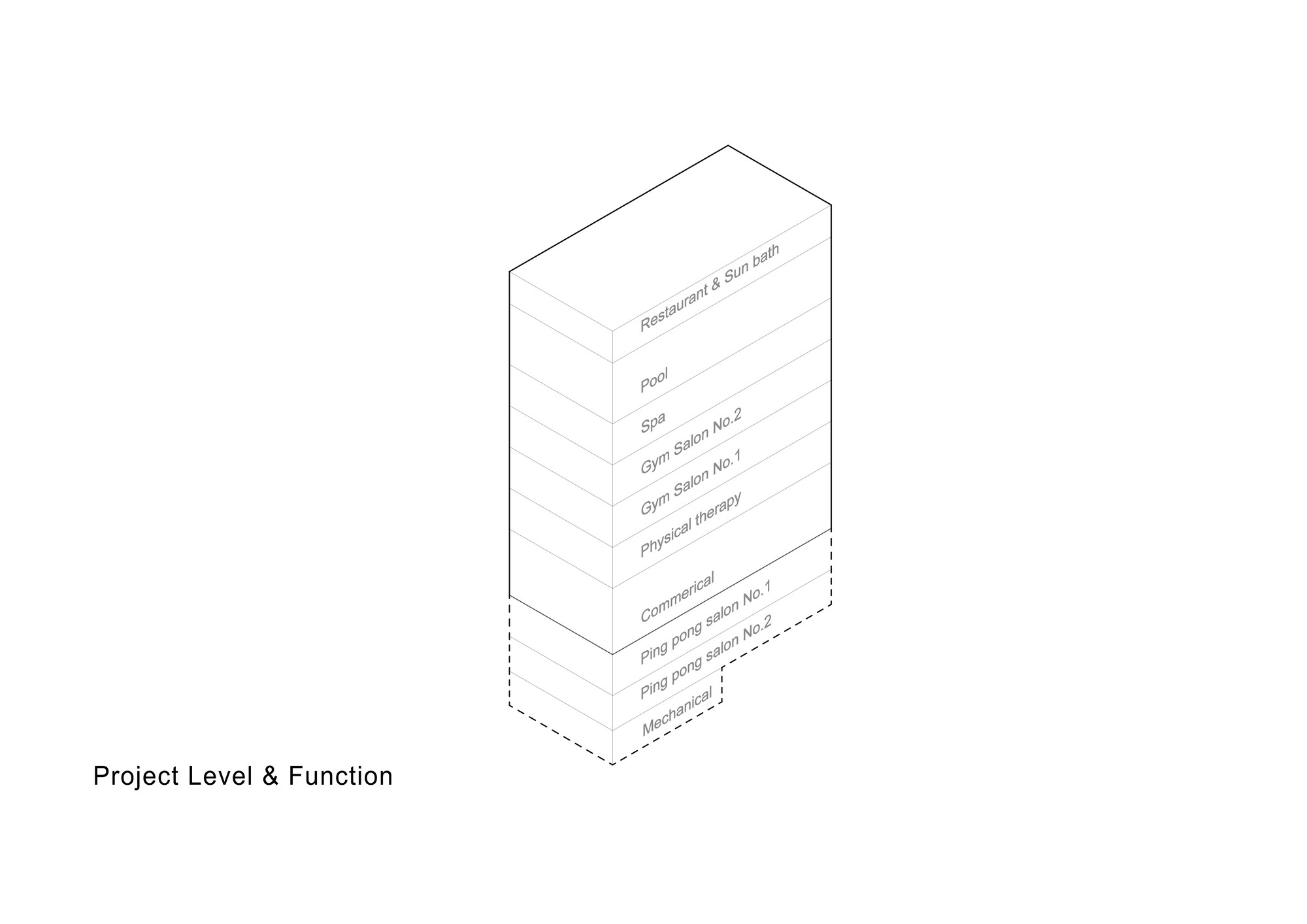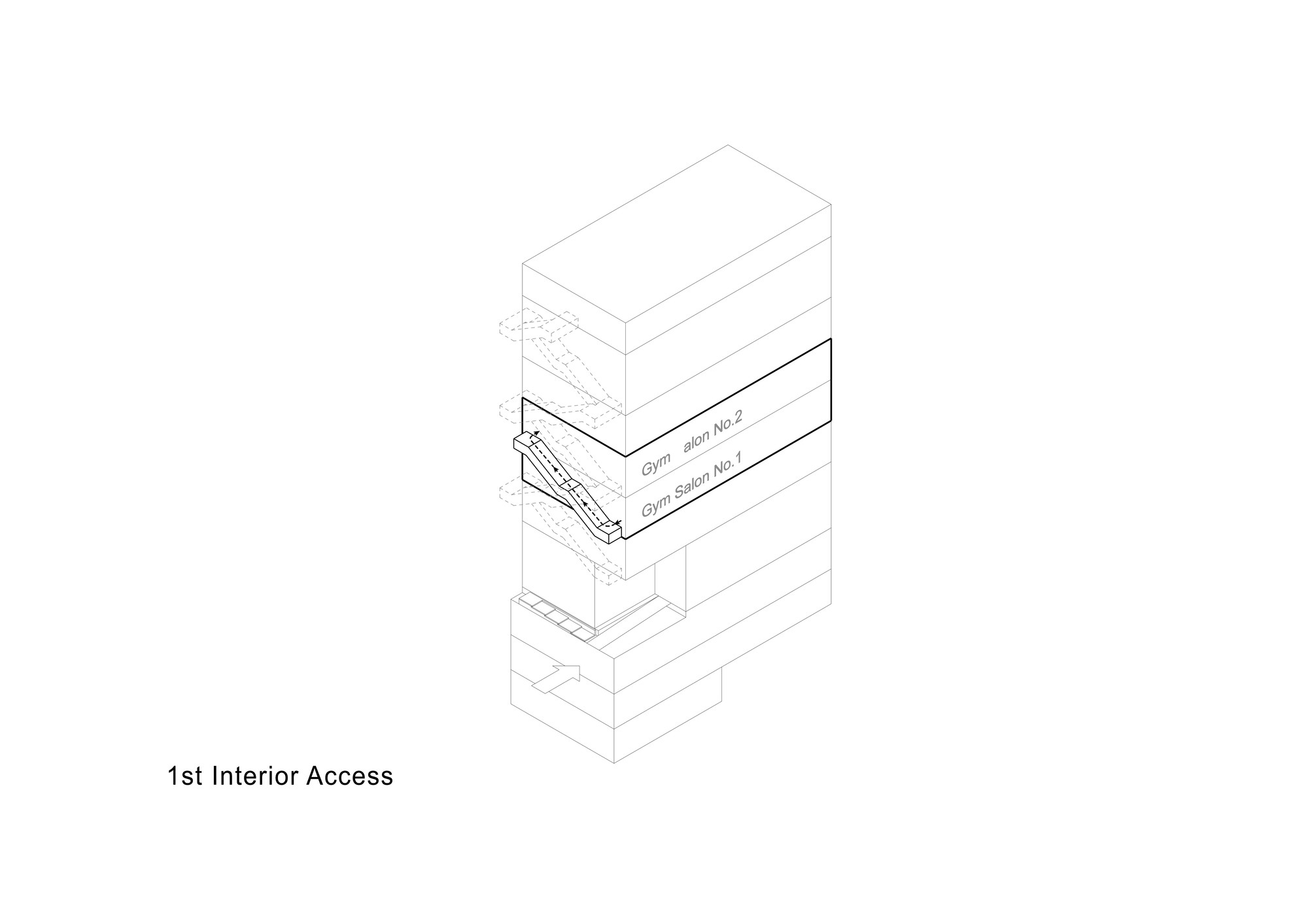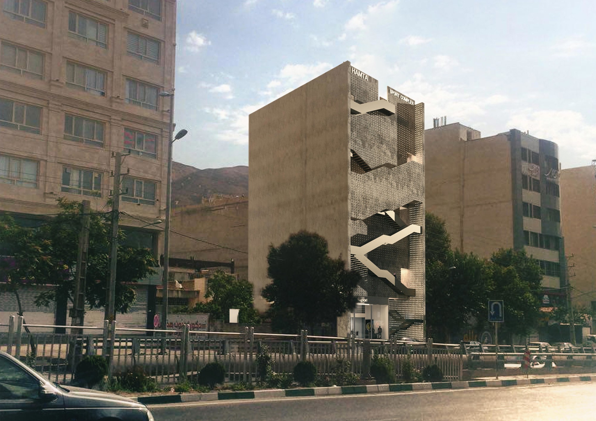 Hamta Sport Complex is located in Kaaj Boulevard in one of the commercial-office zones of Karaj. This complex includes a commercial unit as well as various sport fields. Taking into account the function of the building, it was important to provide natural lighting without creating overlook to the interior. The entire width of the site had to be used in order to meet the standard requirements of sport fields.Two sets of staircases had to be implemented throughout the building, one as the main vertical circulation between the sport fields and the other as the emergency exit which connects the roof top to the ground floor. During the design process, it was decided to combine these two staircases to form two interwoven rings on the façade, leaving the entire width of the building available for the sport fields. These two rings function separately without interference. Movement of people and south sunlight on the three flat layers created by this system was inspired by the traditional Persian miniature painting. The façade layers are formed using traditional handmade glasses implemented in the concrete shear walls of the structure. The semi-transparent surface of these layers improves the quality of the atmosphere by providing natural light and by reflecting the movements of people in other layers, without causing overlook to the sport fields. Skylights on the roof brings sunlight to the swimming pool area on the top floor. This light is then transferred to the lower floors through transparent layers at the bottom of the pool, connecting the water sport zone to the spa.