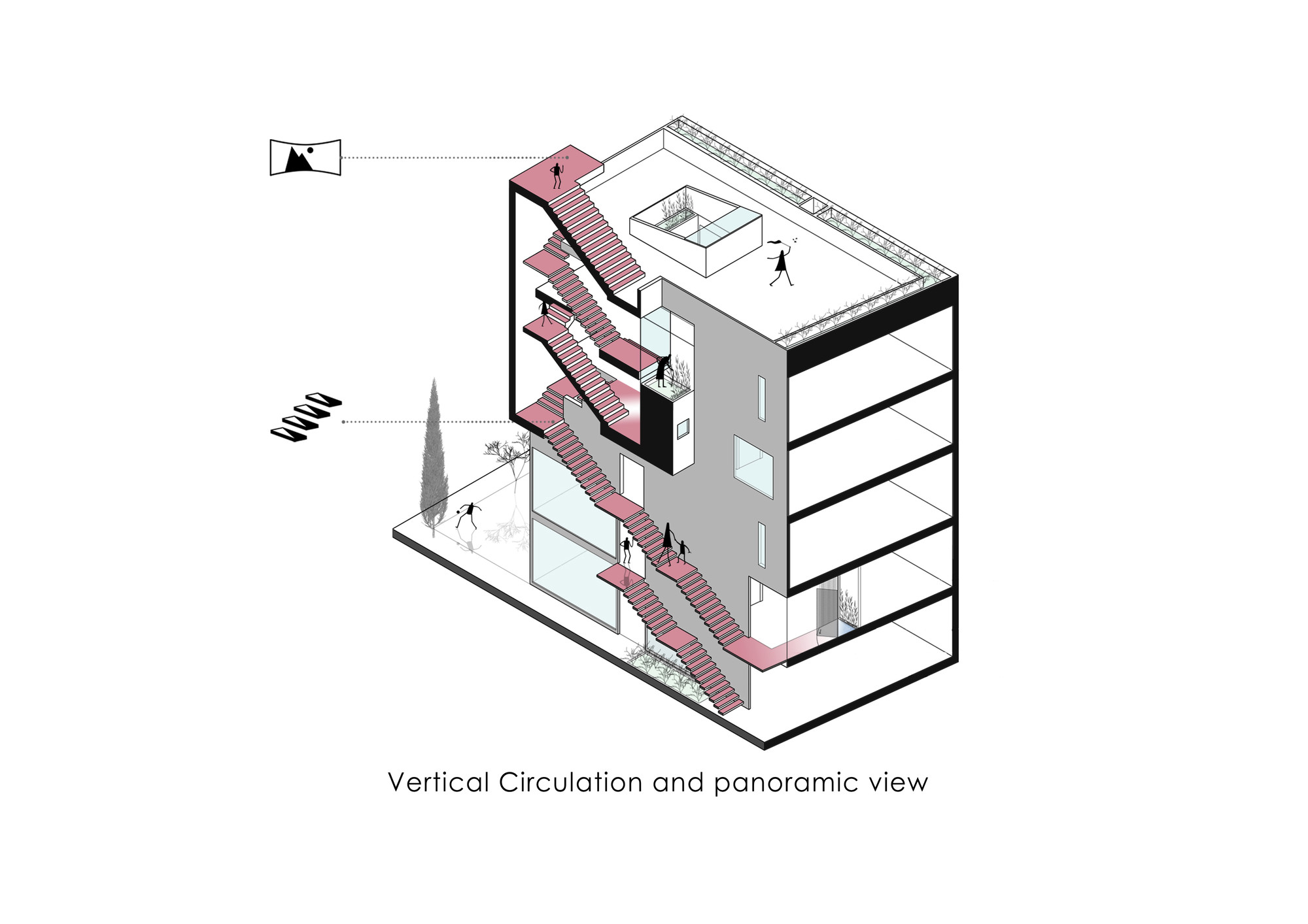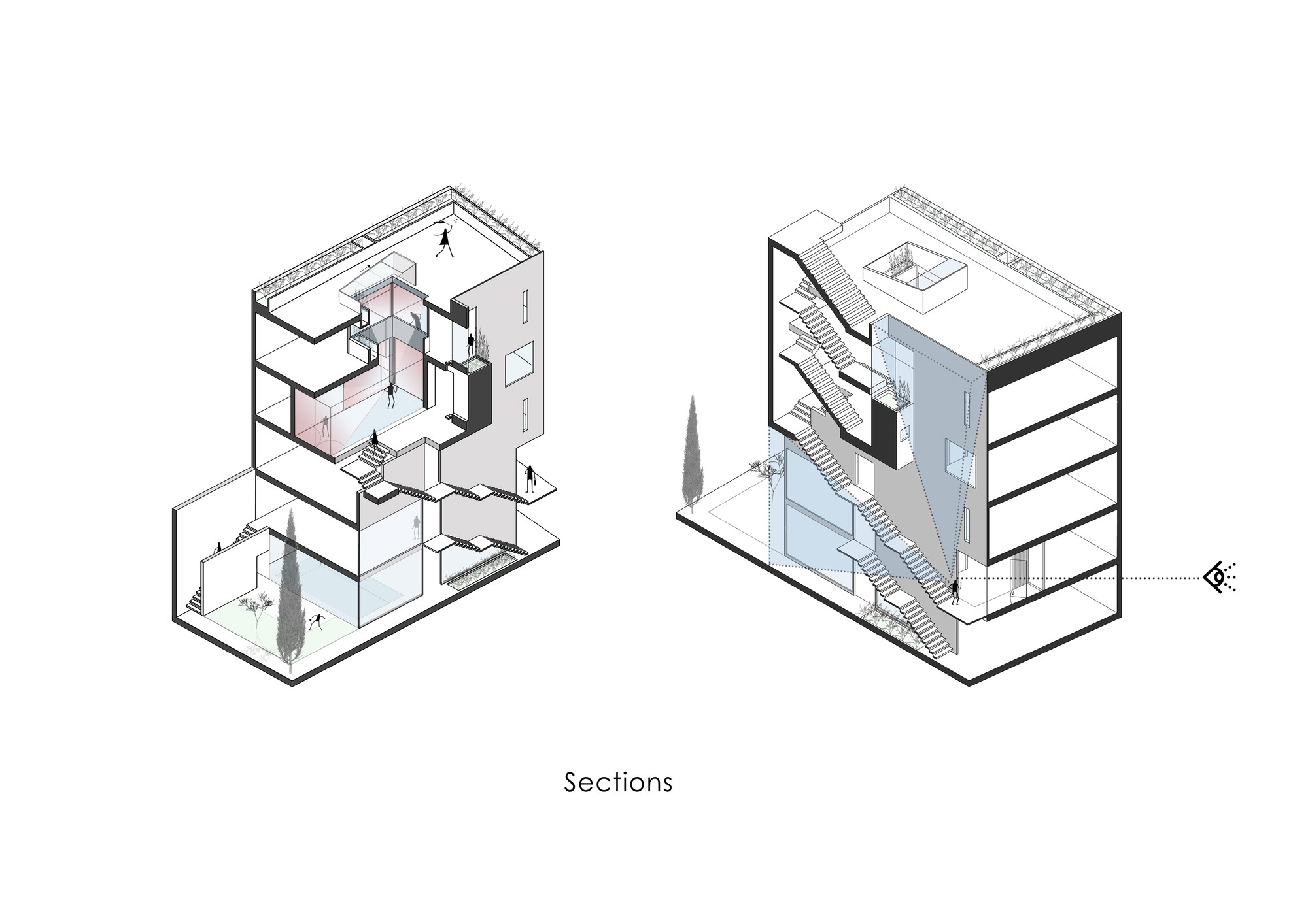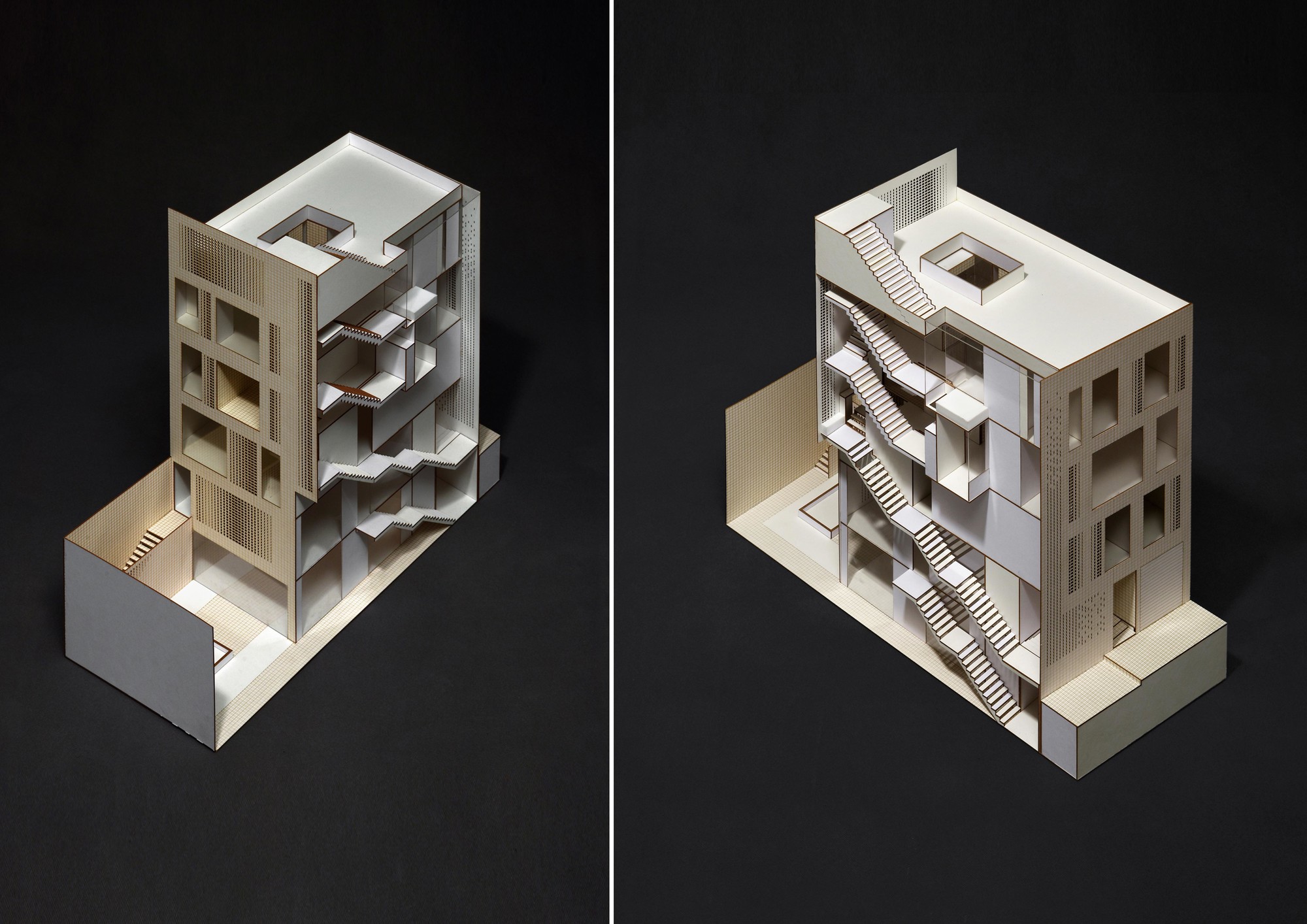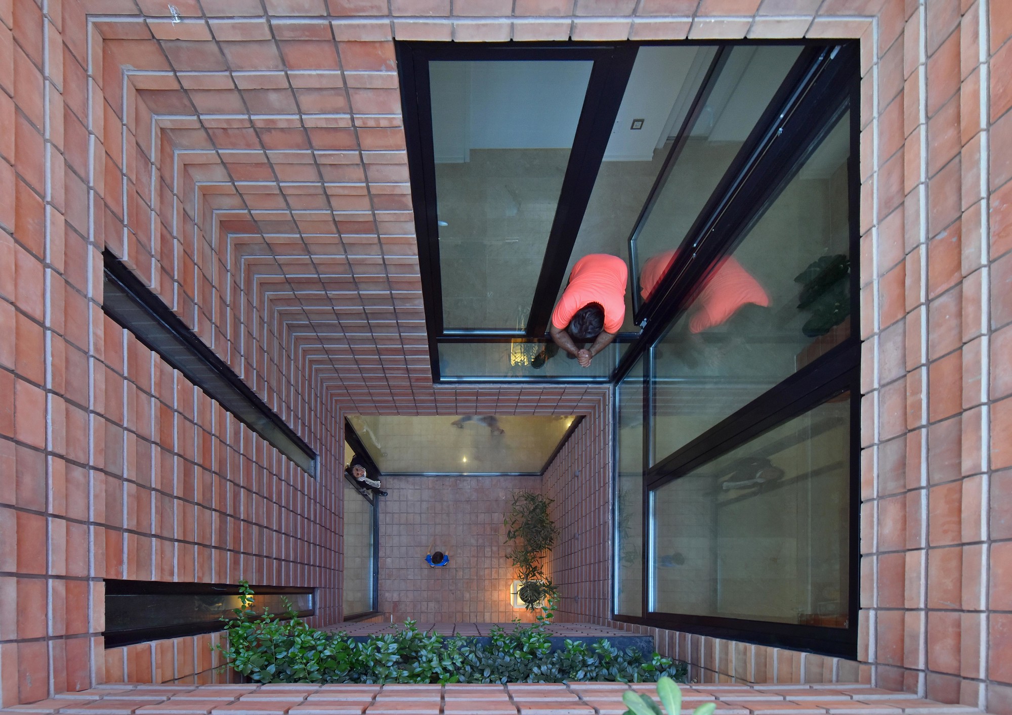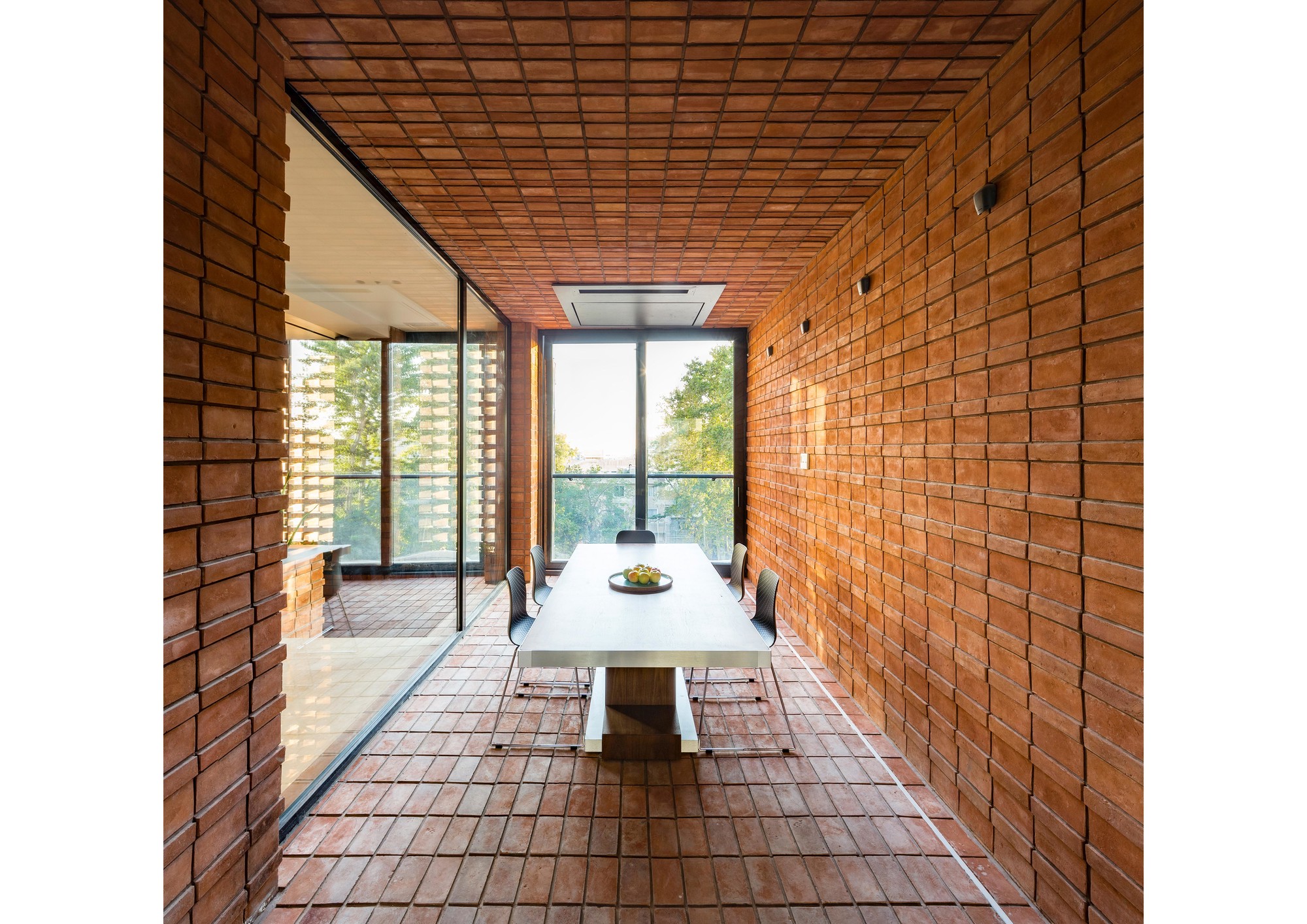 Ozgol Residential BuildingThe new urban development of Tehran in the recent decades has imposed alterations to the ratio of open and semi-open spaces to the closed spaces in residential units. These changes has enormously affected the lifestyle of Tehranians in the recent years to such and extend that smaller apartment units have minimum access to open or semi-open spaces. The research focus of this project was to explore the urgent need for new residential models in Tehran.Located in the Ozgol neighborhood of Tehran, the site of the project was a 10*22m plot, next to an unbuildable piece of land. Therefore, the building could have facades on three sides (North, South, and East). Consisting of a duplex (2nd and 3rd floors) and a guest unit (1st floor), the three storey residential building was designed for a single family.The aim of the project was to transform the common “Infill” residential typology by extending open and semi-open spaces into the building. Providing natural ventilation and lighting as well as maximizing the engagement of green spaces with different functions of the house were all considered during the design process.The narrow width of the site imposed restrictions on the interior planning. These restrictions motivated the design team to rethink the typology of the vertical circulation through the building and to rearrange it into a longitudinal semi-open staircase along one side of the building. This staircase connects the backyard to the open-to-sky void on the front side of the building, providing fresh air circulation in every floor. This space acts as a corridor, providing visual connection between the backyard, the sky, and the city.Another important design element was to provide functional flexibility to the main balcony in relation to the exterior and the interior. This was achieved by creating a space that could be transformed to open, semi open, and closed spaces in different weather conditions.During the winter, this space becomes a part of the enclosed interior. During the summer, on the other hand, it could become a semi open balcony. This space is covered by an automated operable roof on top and is separated from the exterior and the interior of the building through operable glass openings.Spatial Organization:The width of the building was divided into 3 sections, organizing the interior spaces. The semi open balcony is located in the middle division in both plan and section, and all the vertical circulations are placed in one division to optimize space utilization throughout the building.Material Palette:Traditional Brick was used both as the base and as the finishing of the exterior facades, the circulation corridors, as well as the voids throughout the building. Rotated brick blocks were implemented on some parts of the façade to allow sunlight penetration and view to the exterior, while minimizing overlook to the building. Sunlight variations during the day creates a variety of light and shadow patterns. The intention here was to emphasize on the importance of sunlight variations during different seasons of the year.