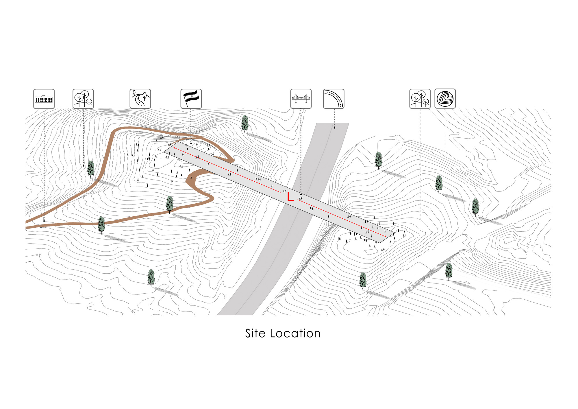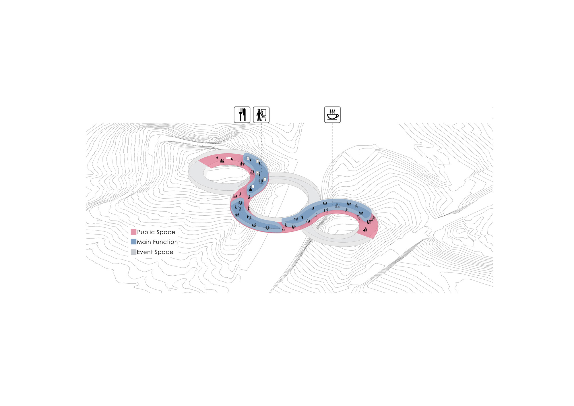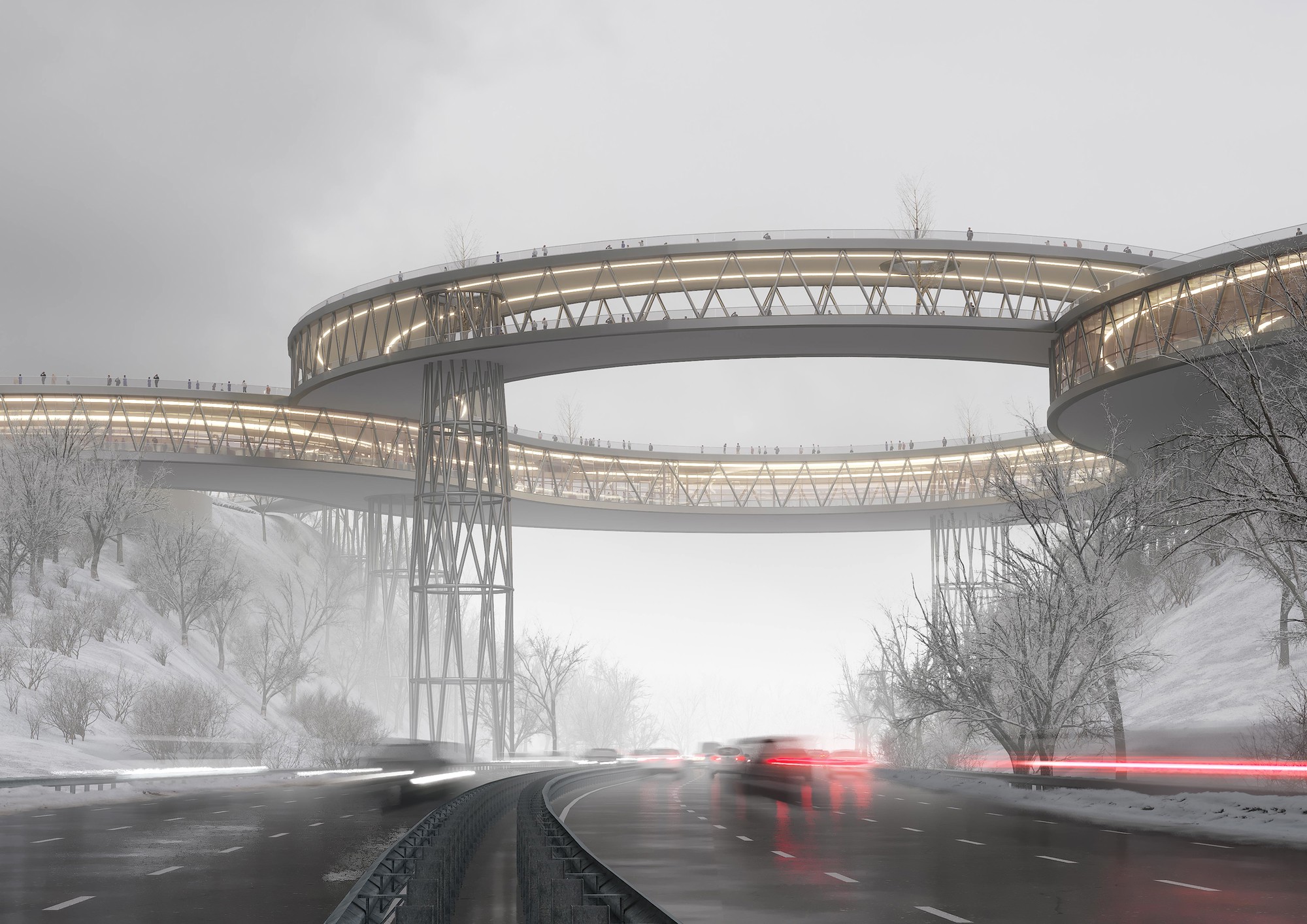 The El Goli Bridge addresses the challenge of creating an urban space in Tabriz that accommodates diverse activities across all seasons and weather conditions. The design integrates urban behaviors, functioning independently while fostering social and environmental interactions. The bridge serves as a multi-functional urban platform connecting two major tourist attractions in Tabriz. It is designed to support various activities, including: • Rest and relaxation • Movement and sports • Social interactions • Engagement with nature The design creates three interconnected layers, geometrically defined as interwoven loops that provide optimal views of the surrounding environment. The bridge offers three distinct spatial qualities: open, semi-enclosed, and enclosed—across its levels, supporting a variety of activities: 1. Open Levels: • Dedicated to activities like cycling, running, and outdoor sports. 2. Semi-Enclosed Levels: • Designed for social activities, walking, and sitting in open-air spaces, integrated with green areas at each segment. 3. Enclosed Levels: • Accommodates restaurants, cafés, and galleries with semi-open spaces, offering seating areas and social engagement zones. These spaces function independently yet remain interconnected, ensuring the project remains lively and active during different times and weather conditions. Structural Design: The bridge employs tubular columns, connected to horizontal truss systems. These tubular elements also house escape stairs and elevators, optimizing space usage and functionality. The tubular columns are strategically positioned to minimize the number of supports, ensuring structural efficiency while maintaining visual and spatial openness. The El Goli Bridge is not just a connection but a vibrant urban destination, enabling continuous activity, interaction, and engagement with the environment, while adapting to the unique climate and urban context of Tabriz.